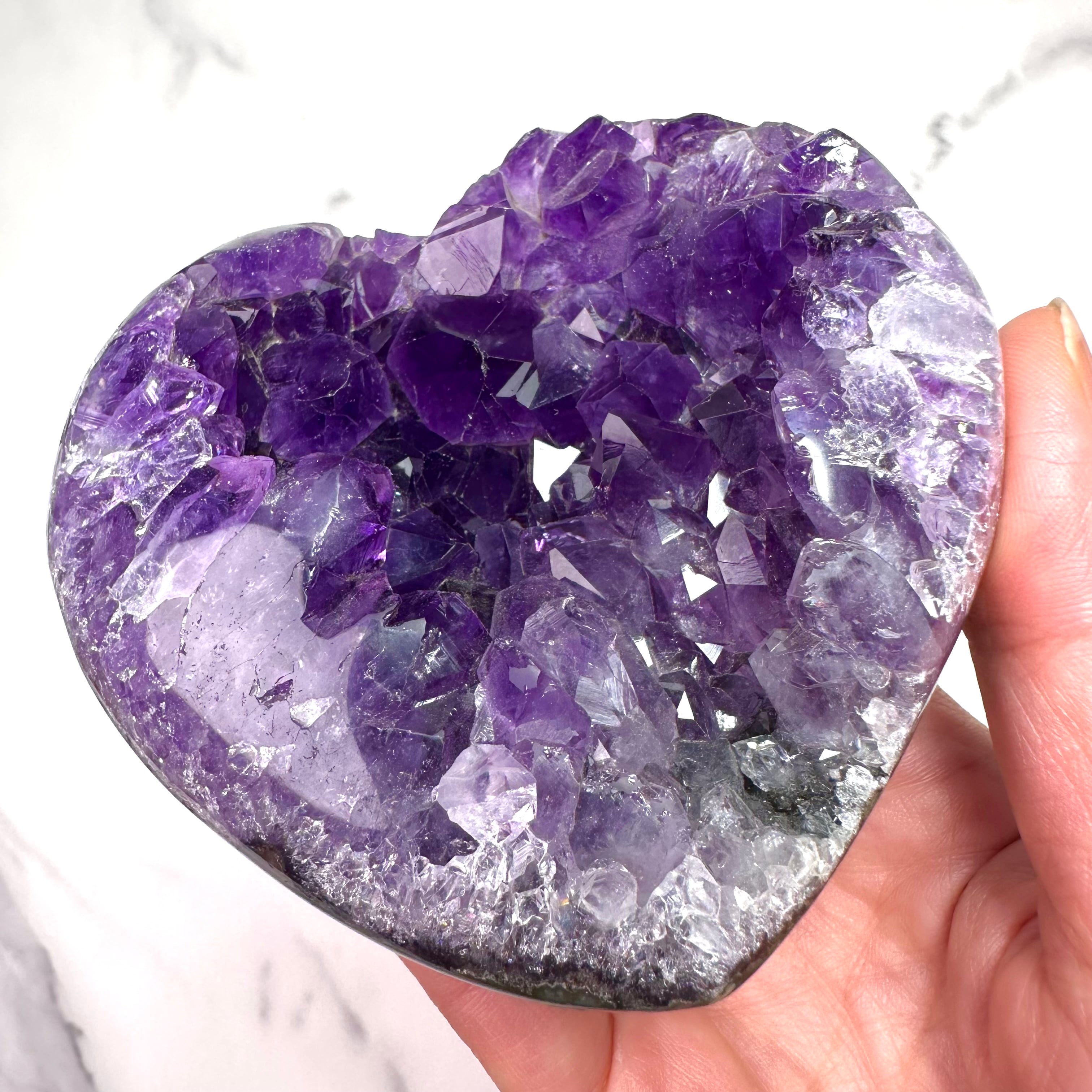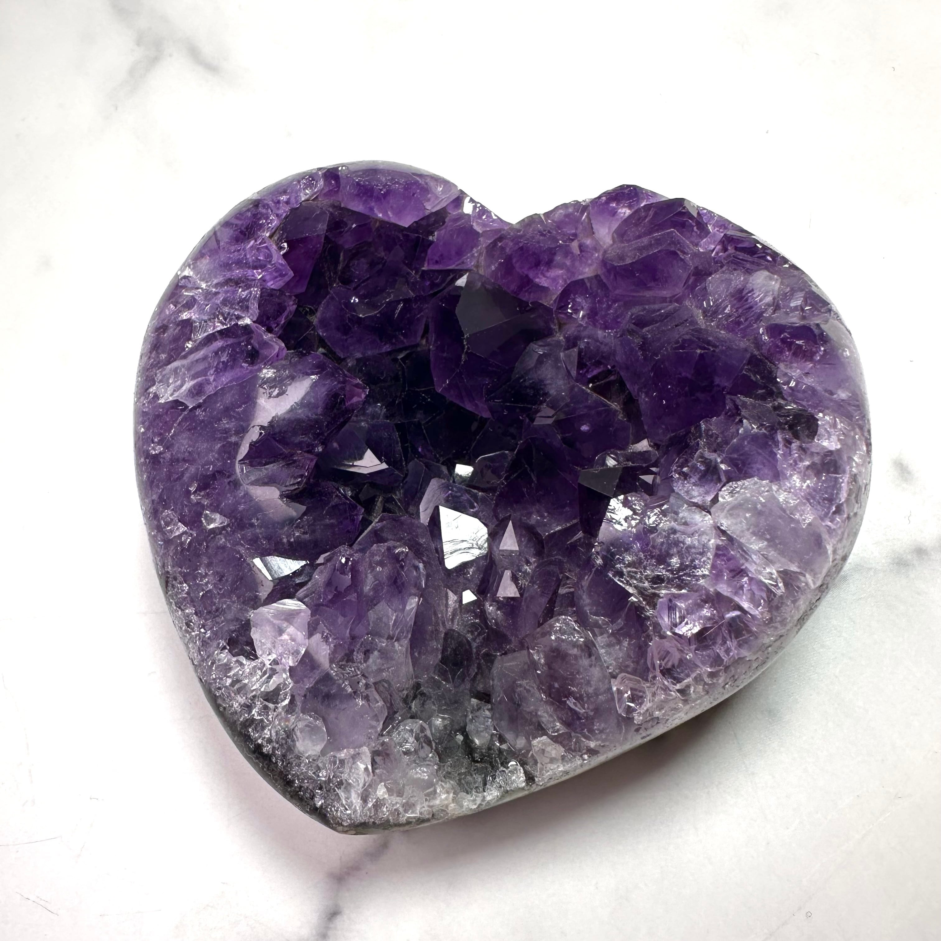 深い紫色が光を受けてキラキラと美しく輝くウルグアイ産のアメジストハート。しっかりとしたボリュームがあり、大きな結晶の粒と深い紫色が特徴です。