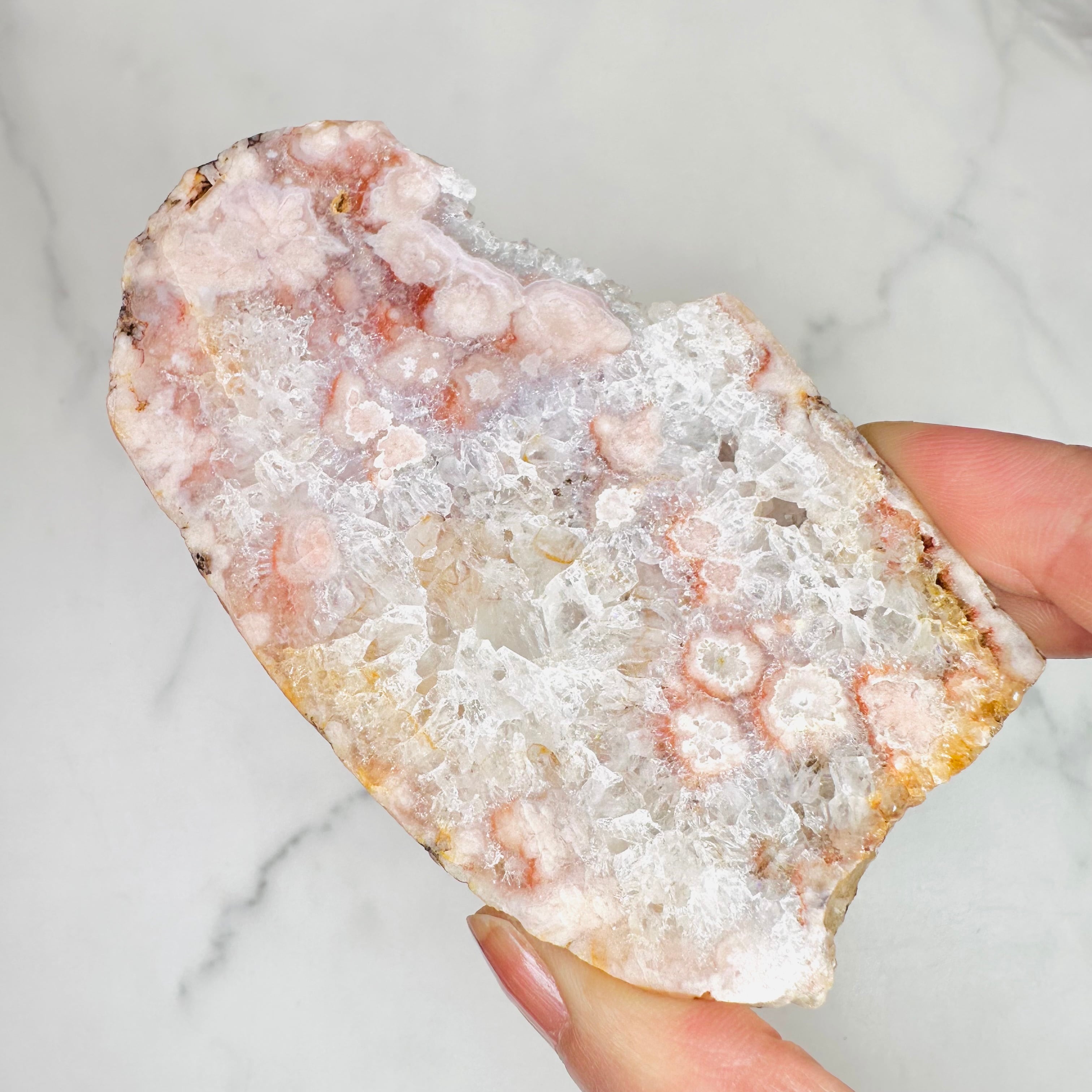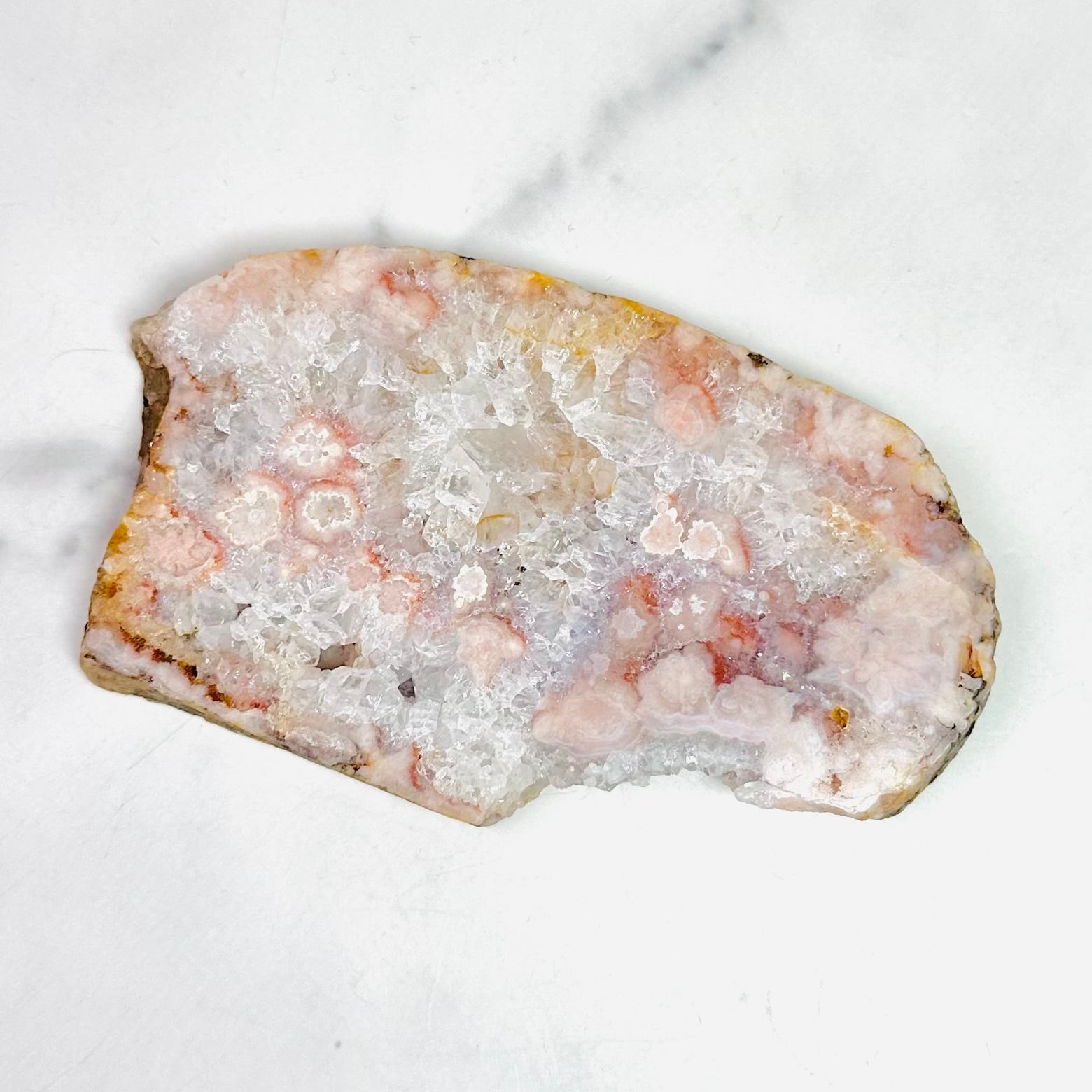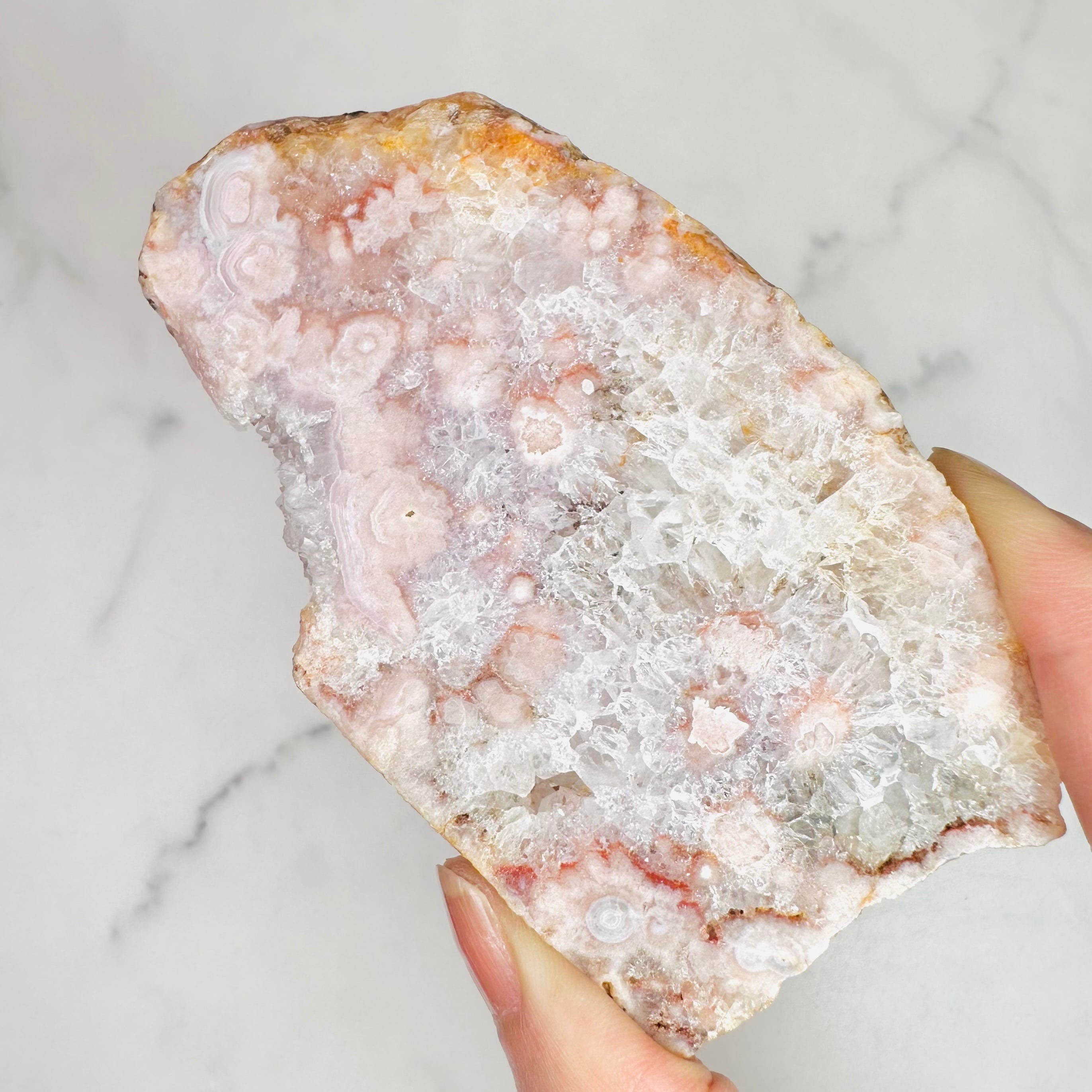 優しいピンクのお花が咲き乱れるピンクアメジスト&フラワーアゲートスラブ。可愛らしいお花がたっぷり詰まってまるで春の花束のようです。自然が描き出したロマンティックな雰囲気をお楽しみください。