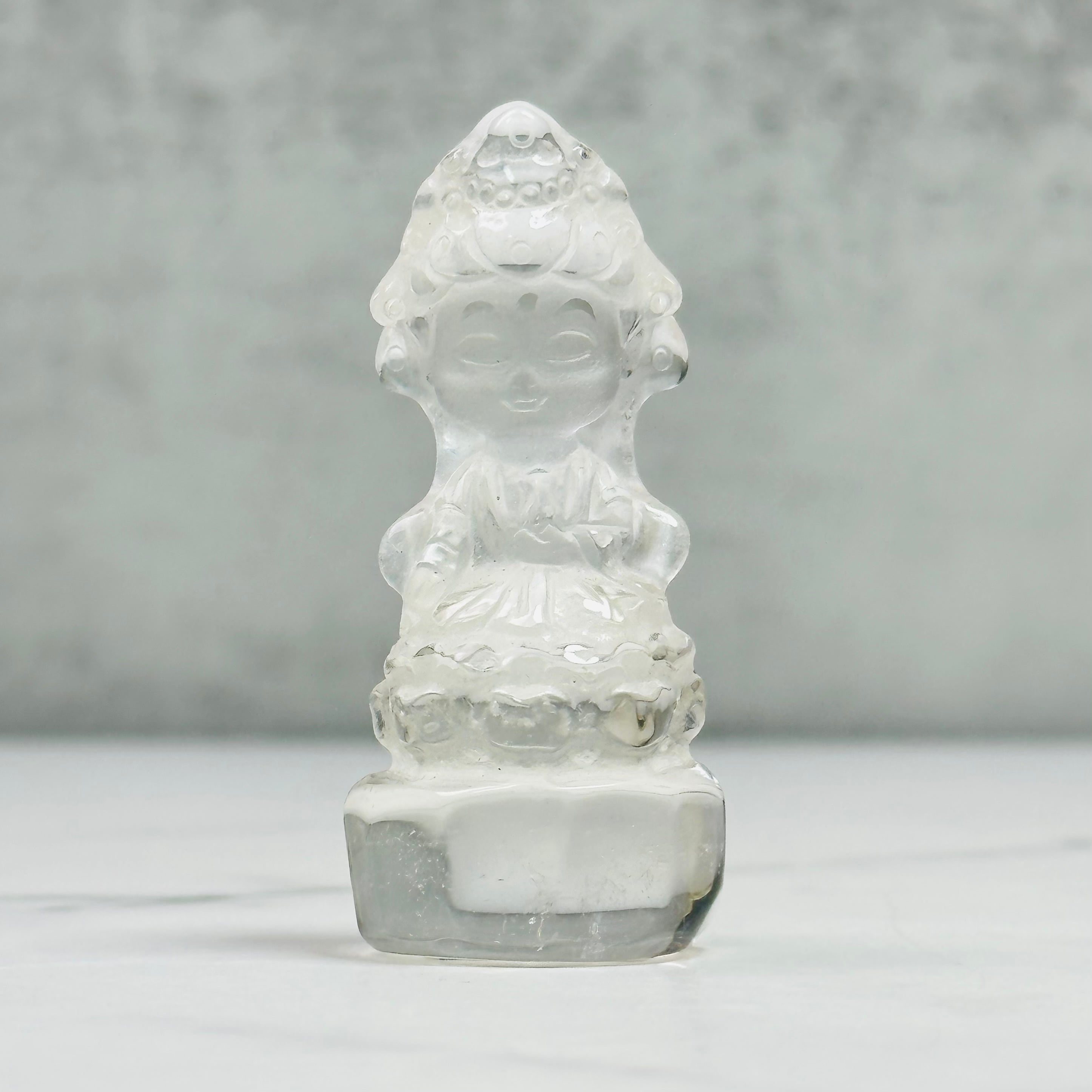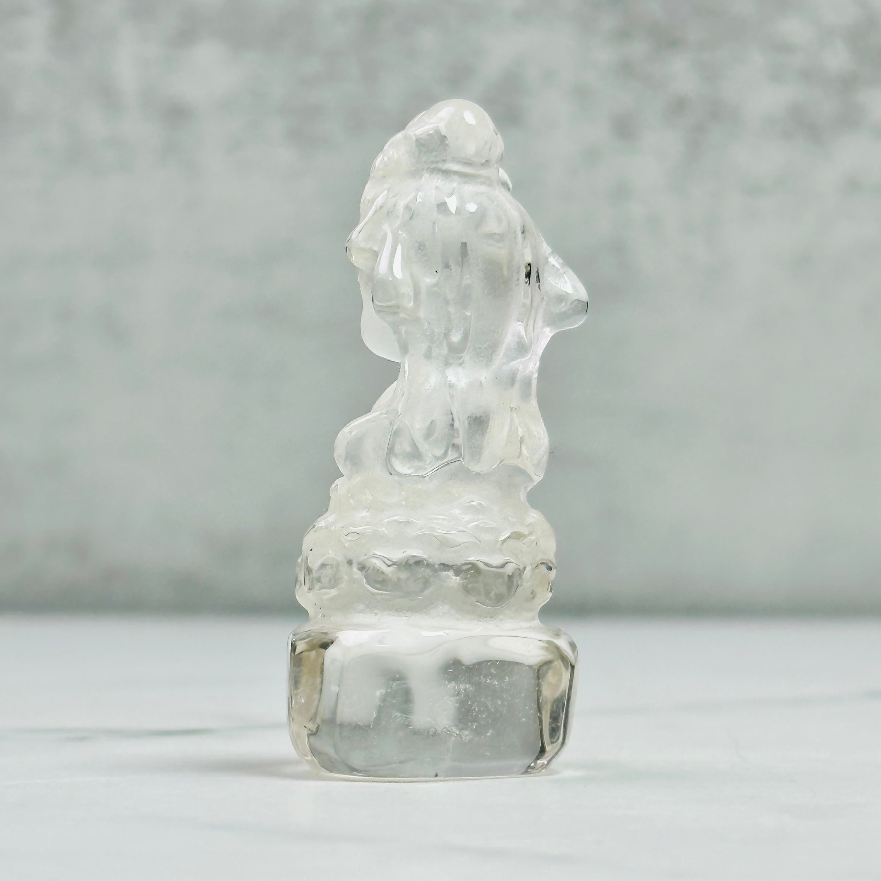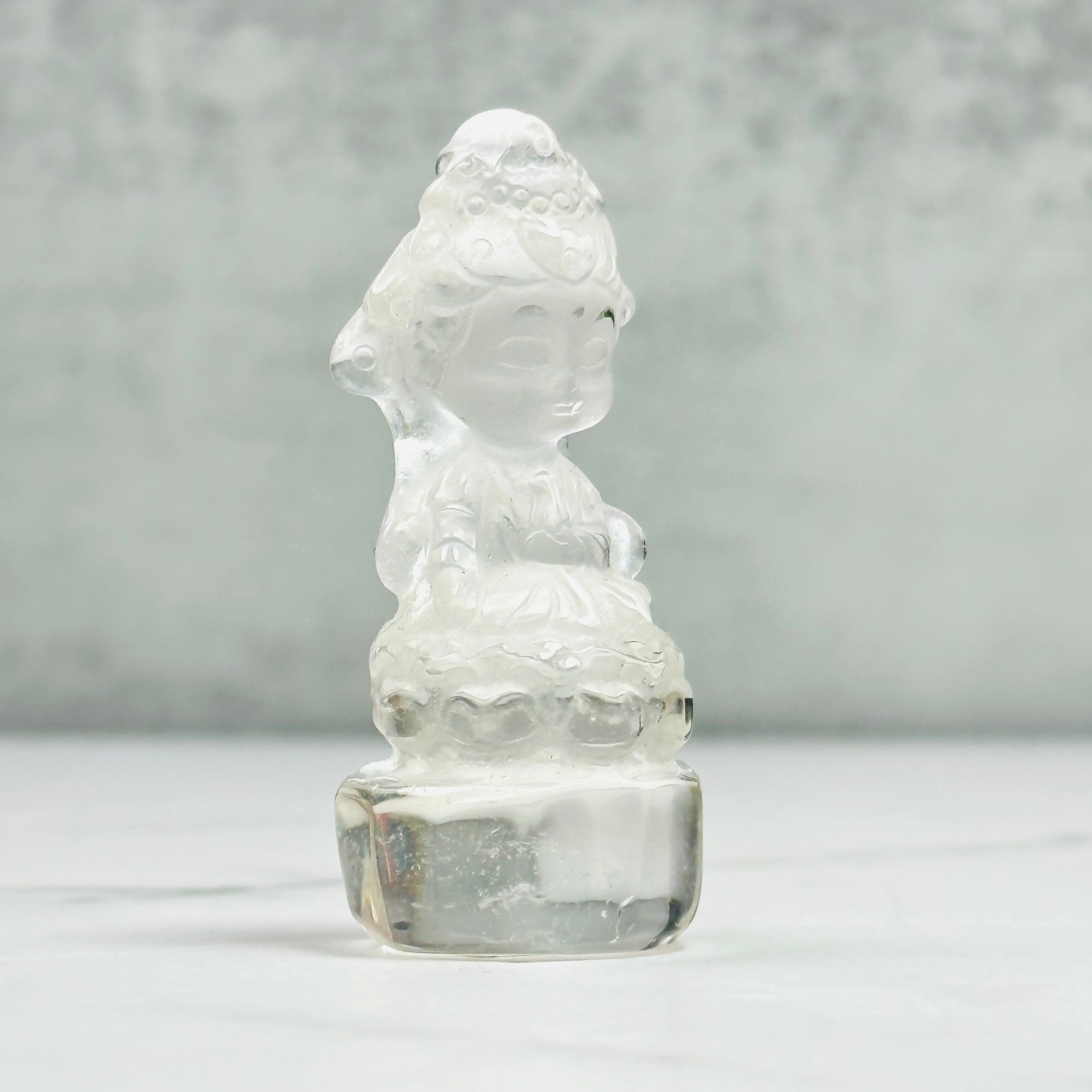 高品質で美しい水晶を丁寧に彫刻した、観音菩薩のミニ像。やわらかな微笑みと繊細な衣の彫りが、静かで穏やかな存在感を放ちます。自然の光をやさしく受け止め、凛とした佇まいの中に慈悲深さを感じさせます。空間に清らかな癒しをお届けします。