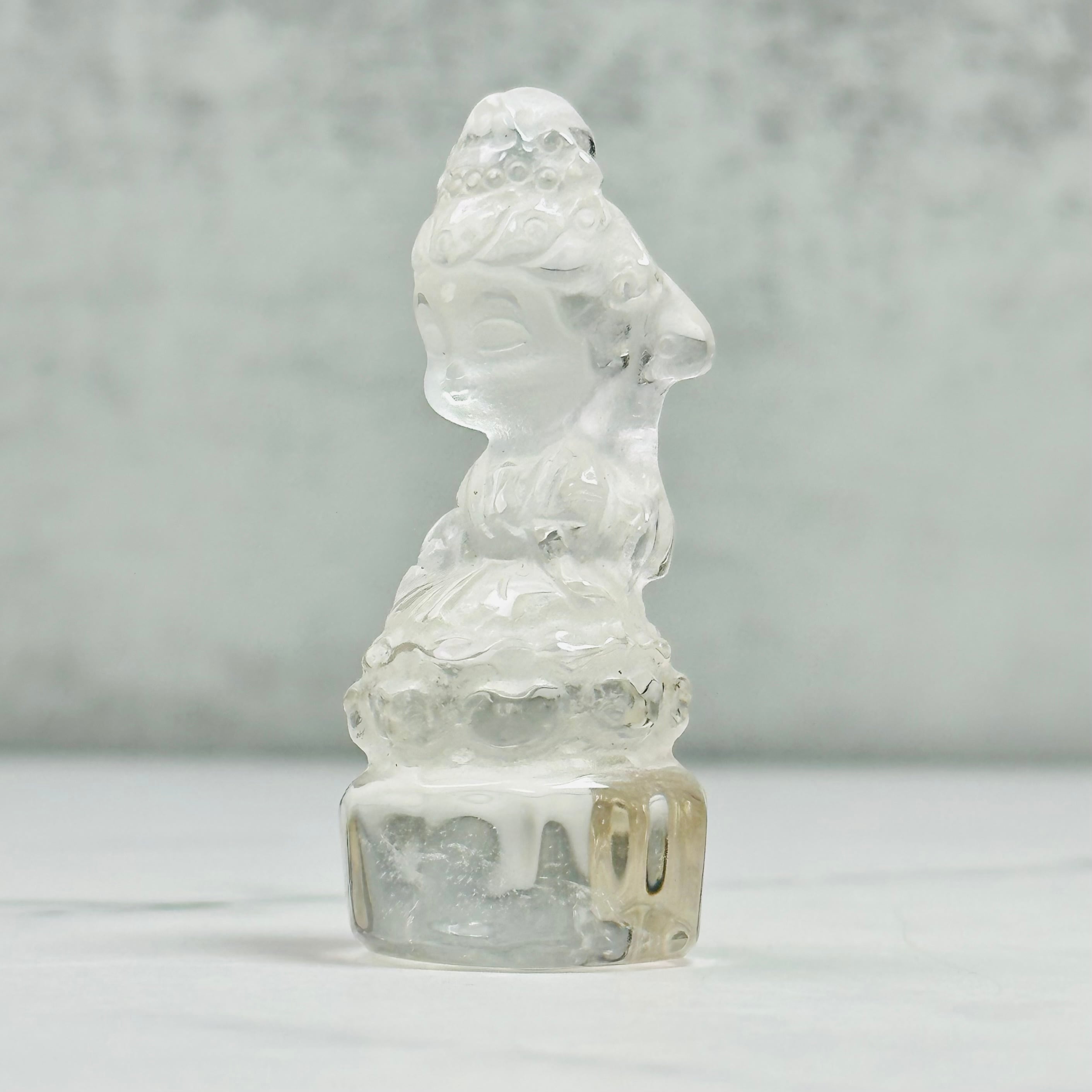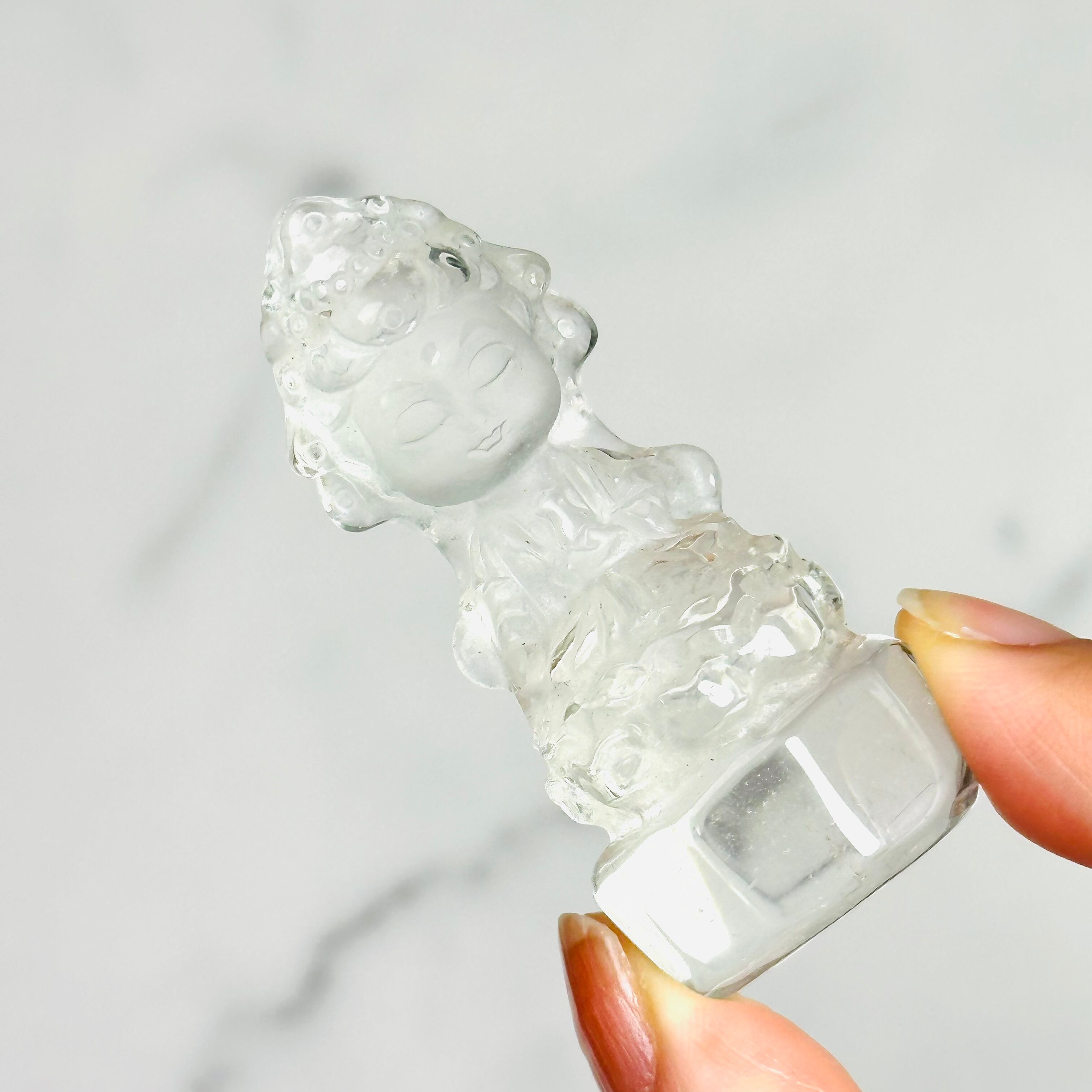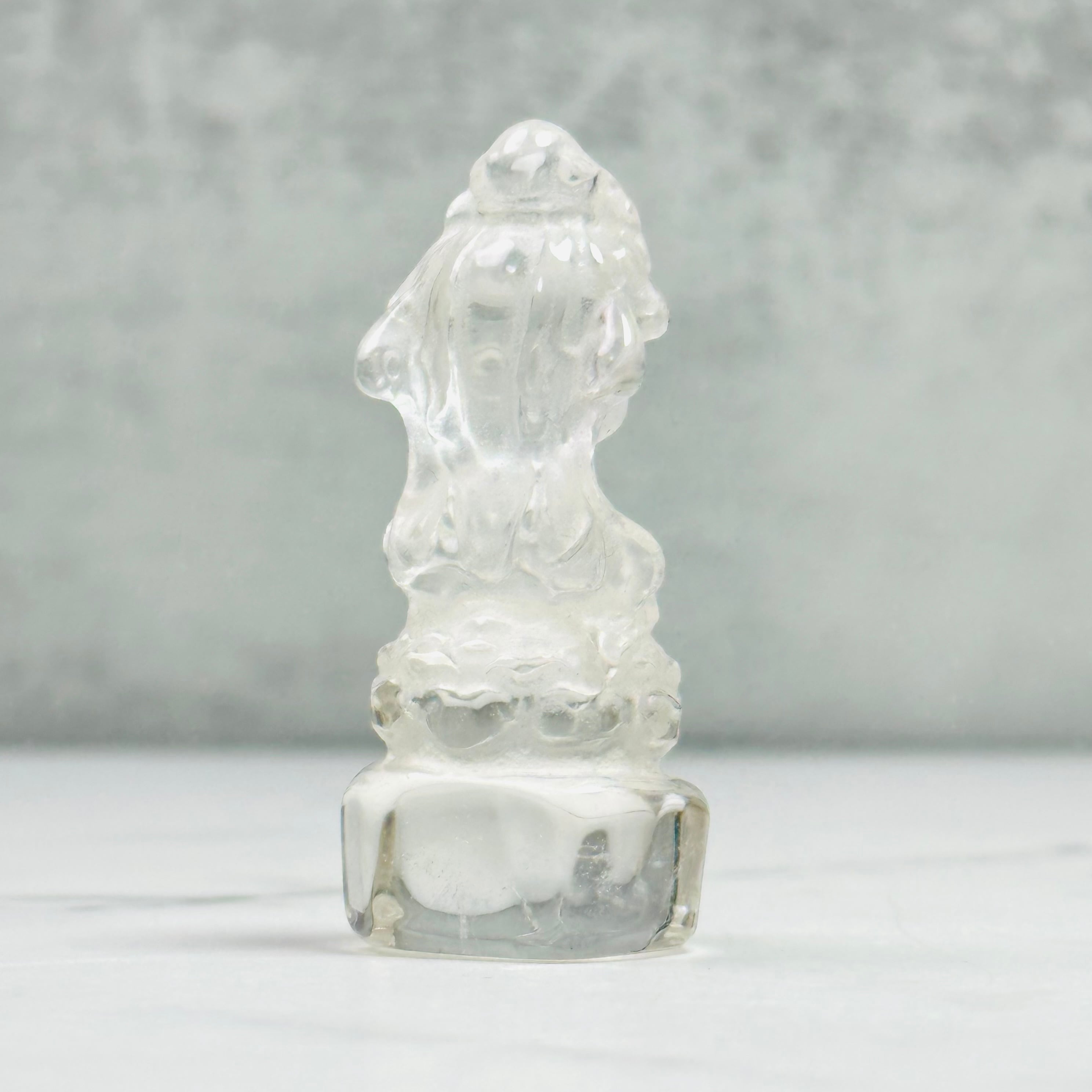 高品質で美しい水晶を丁寧に彫刻した、観音菩薩のミニ像。やわらかな微笑みと繊細な衣の彫りが、静かで穏やかな存在感を放ちます。自然の光をやさしく受け止め、凛とした佇まいの中に慈悲深さを感じさせます。空間に清らかな癒しをお届けします。