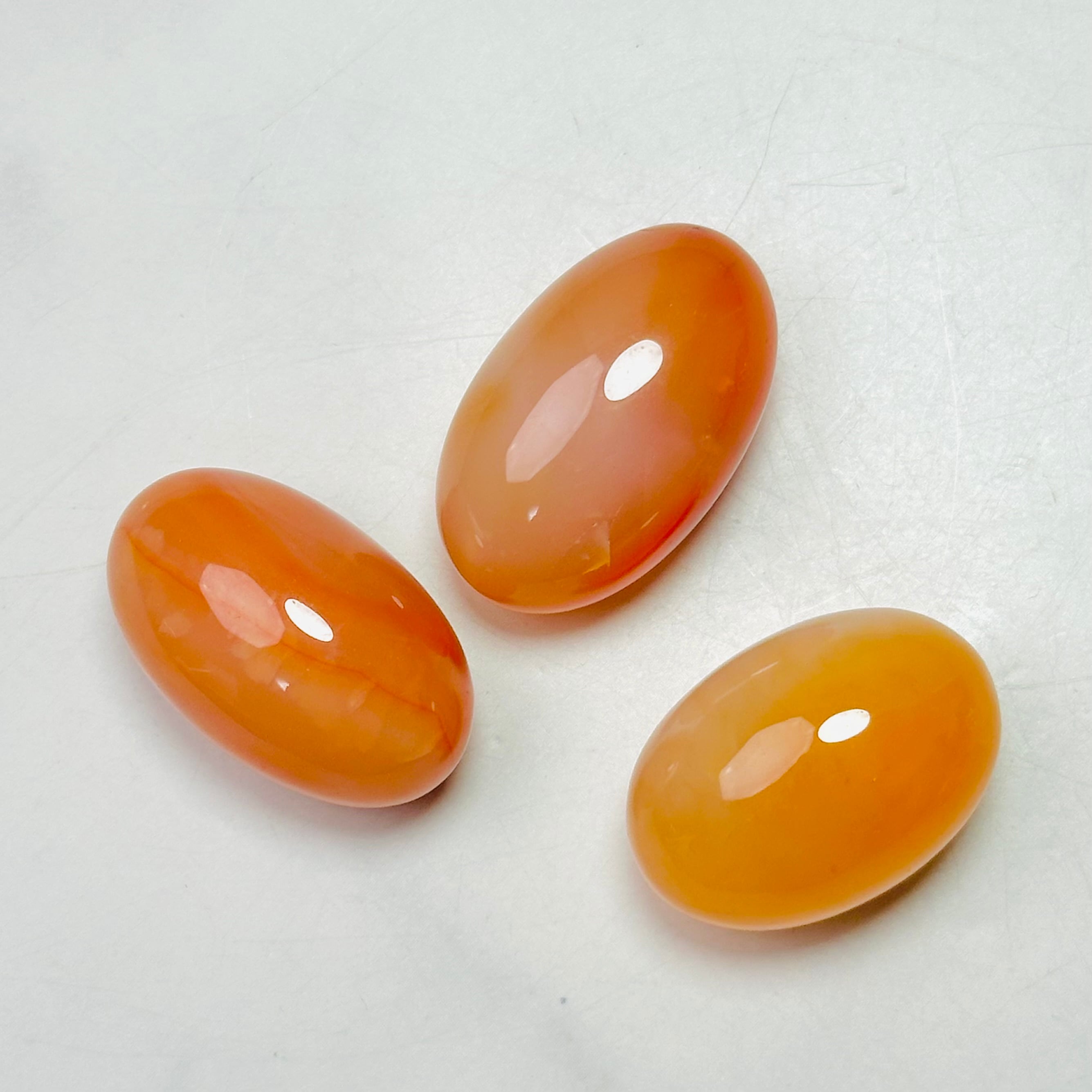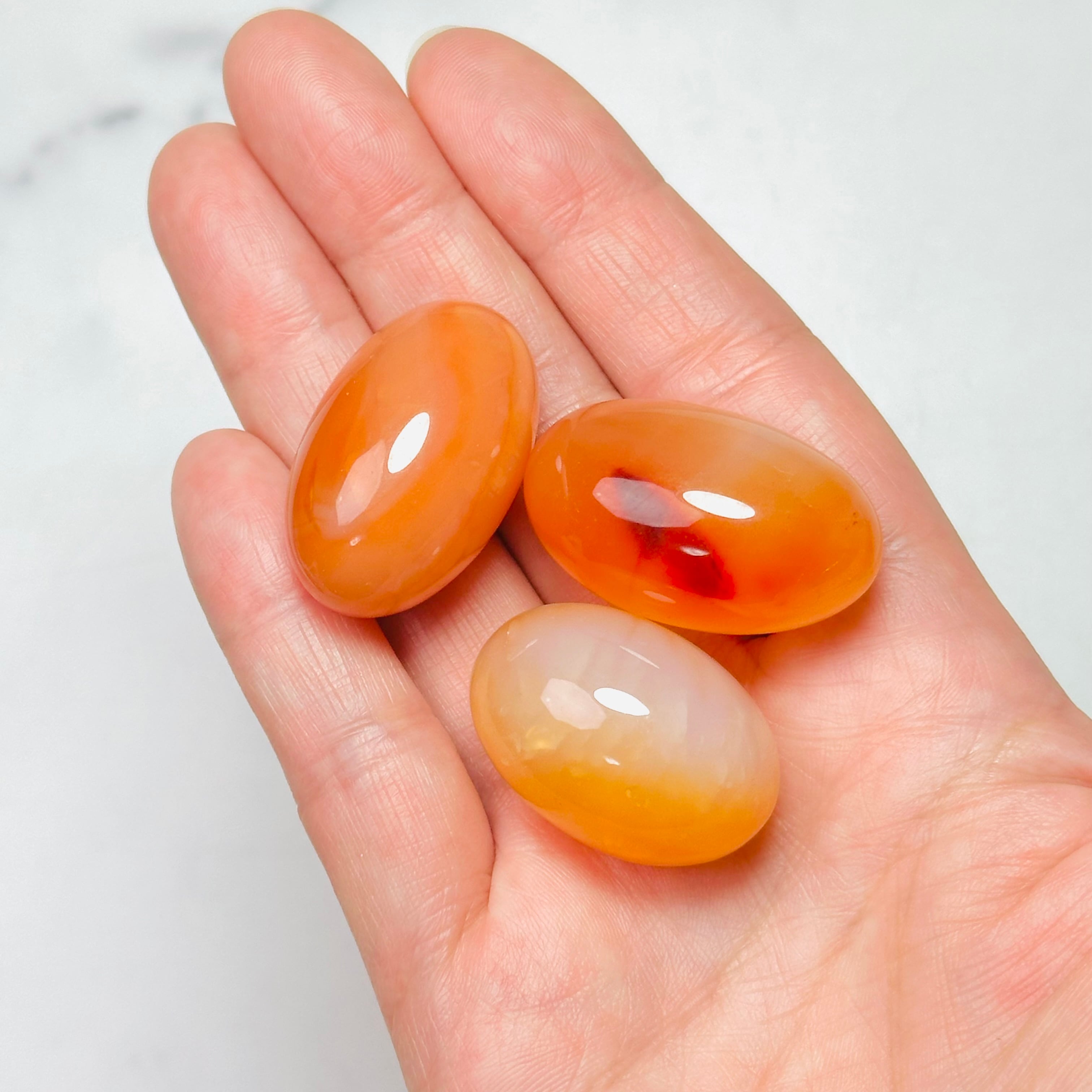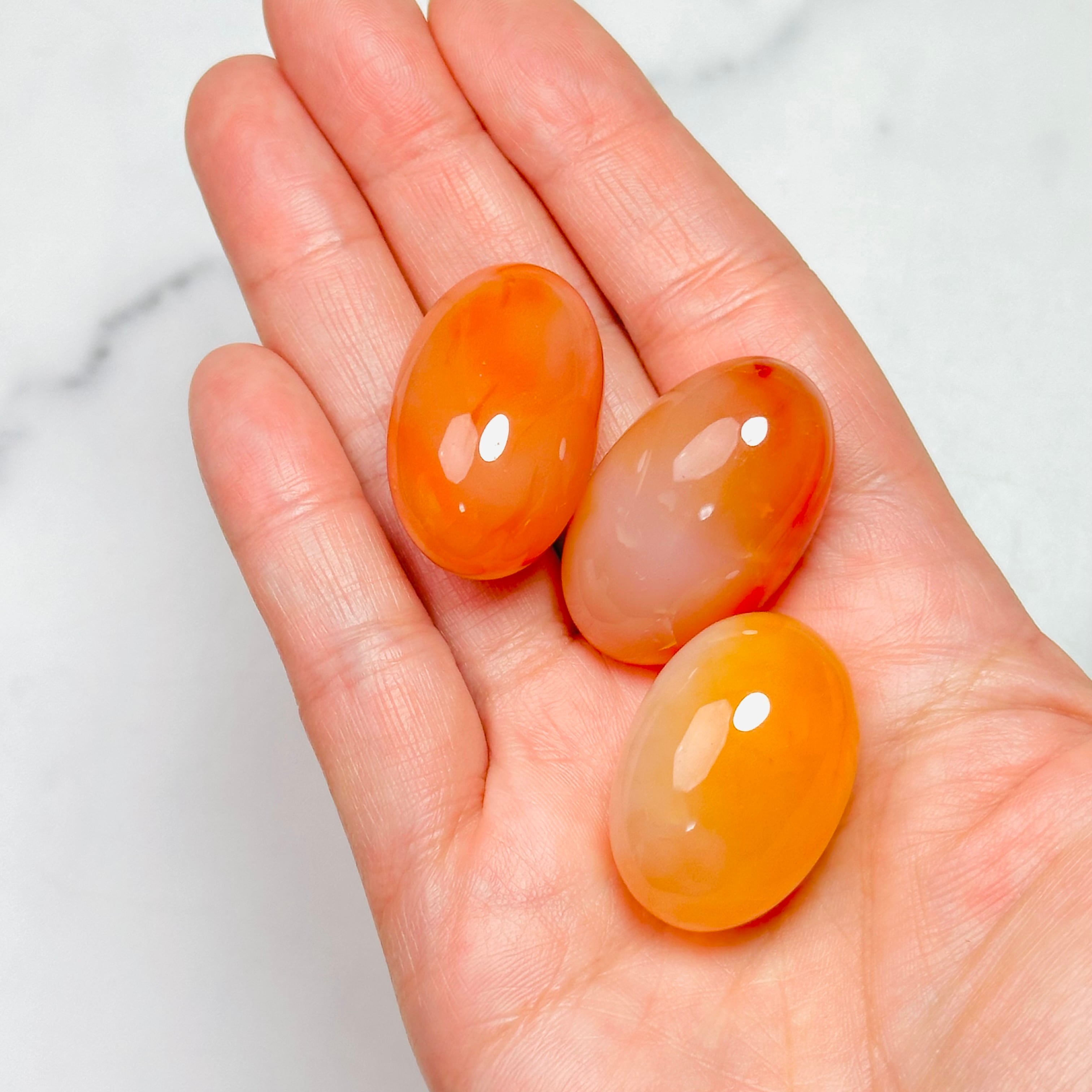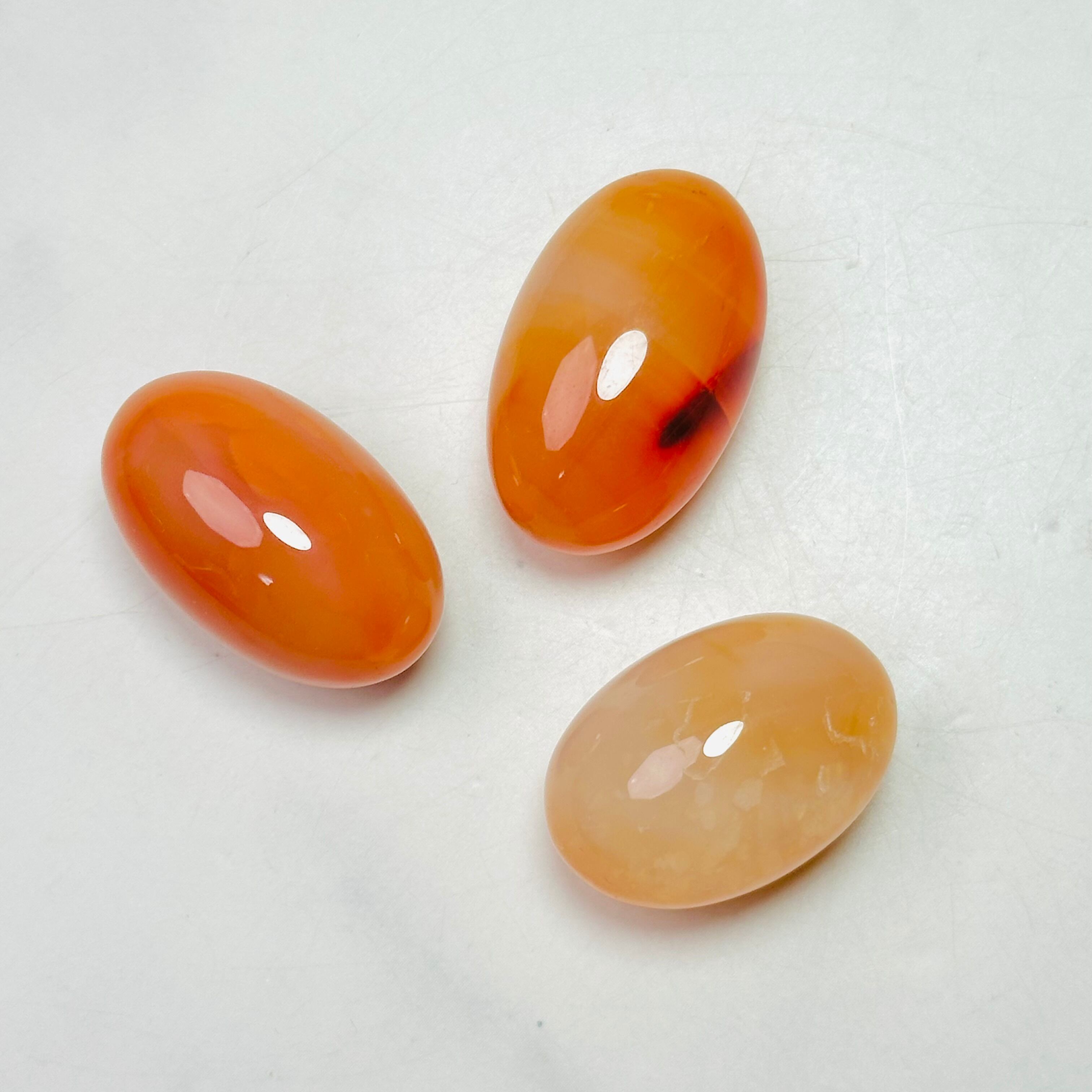 鮮やかなオレンジから赤のグラデーションが美しいカーネリアンのタンブル。持ち歩きやすいサイズ感なので、お守りストーンとしてバッグやポーチに入れて持ち運ぶのもおすすめです。