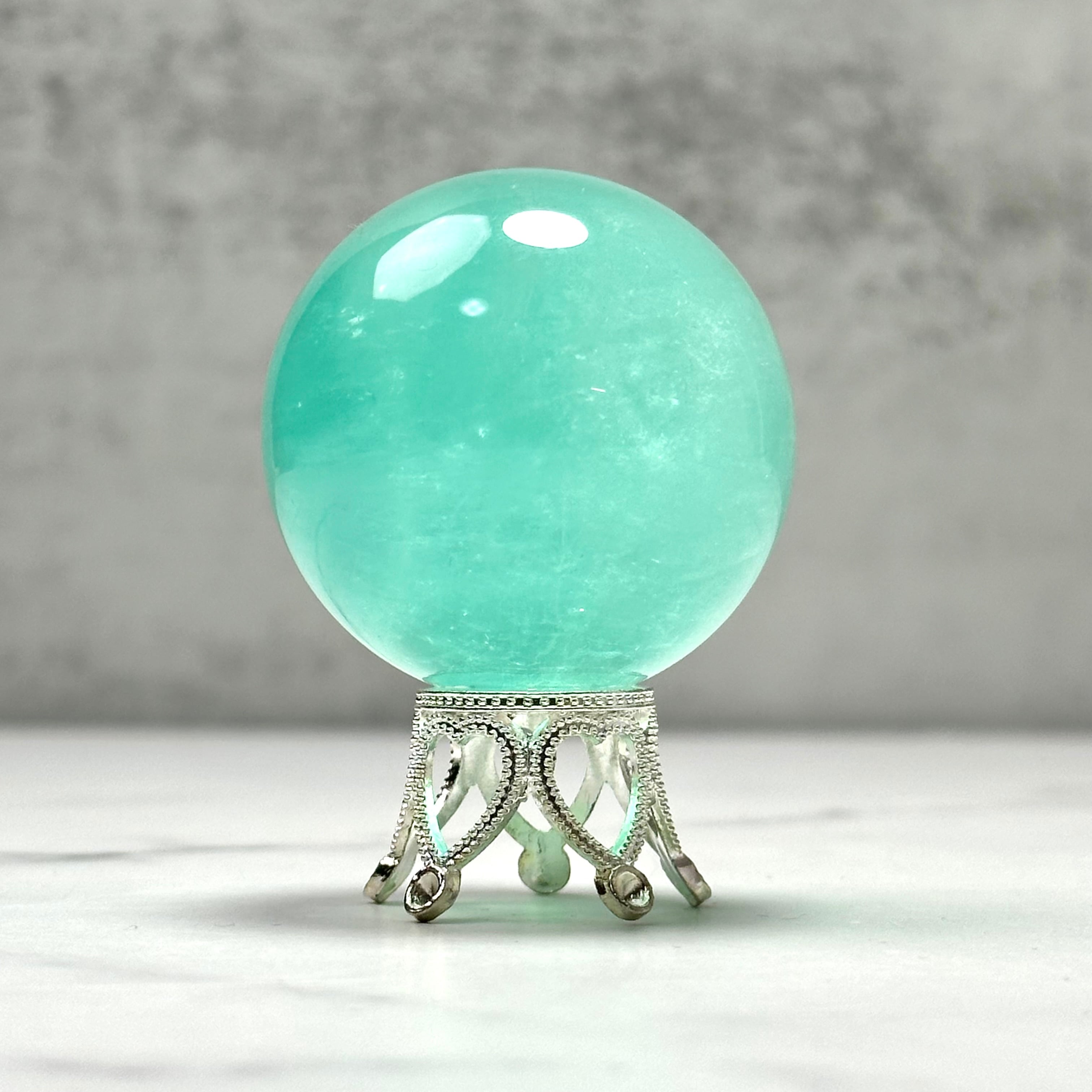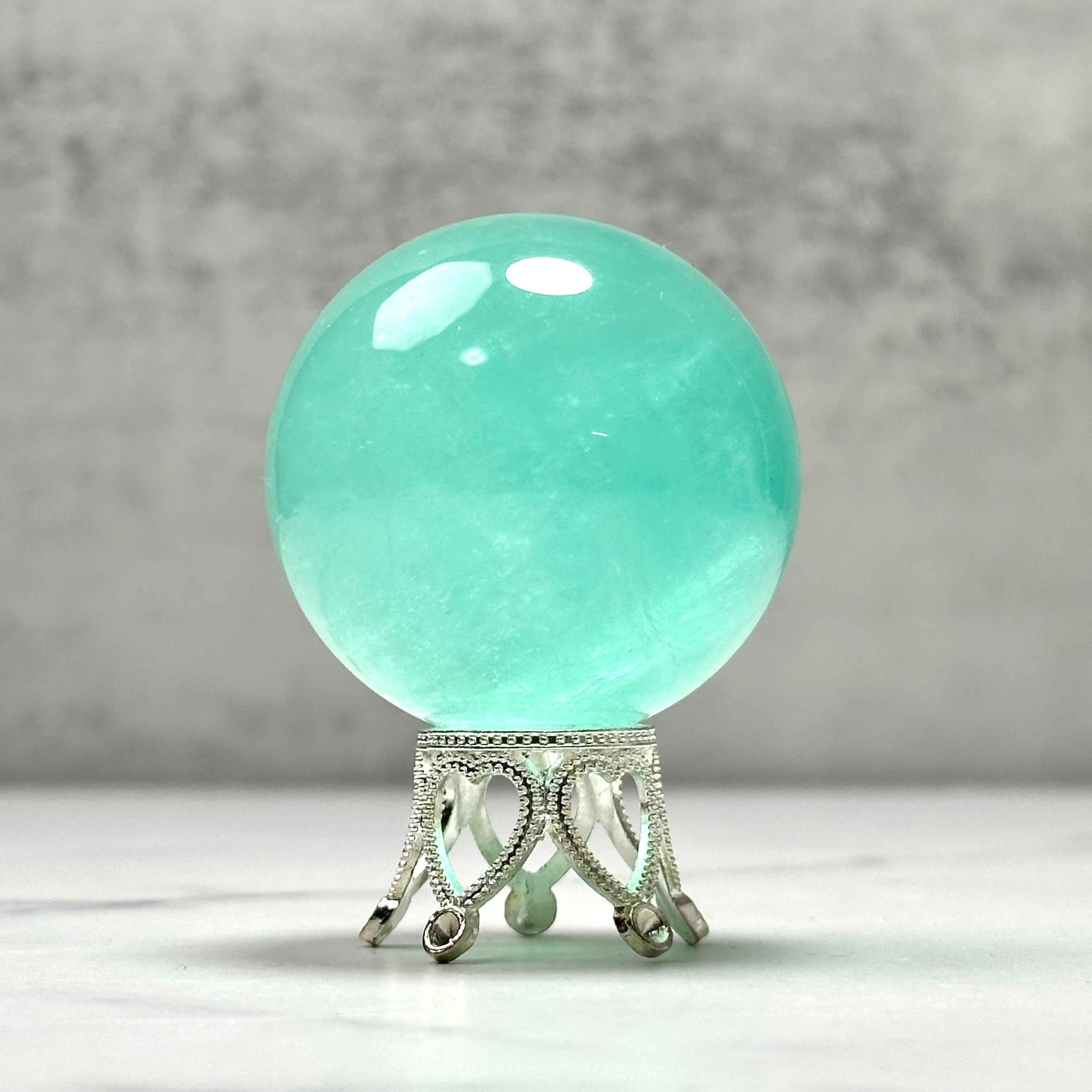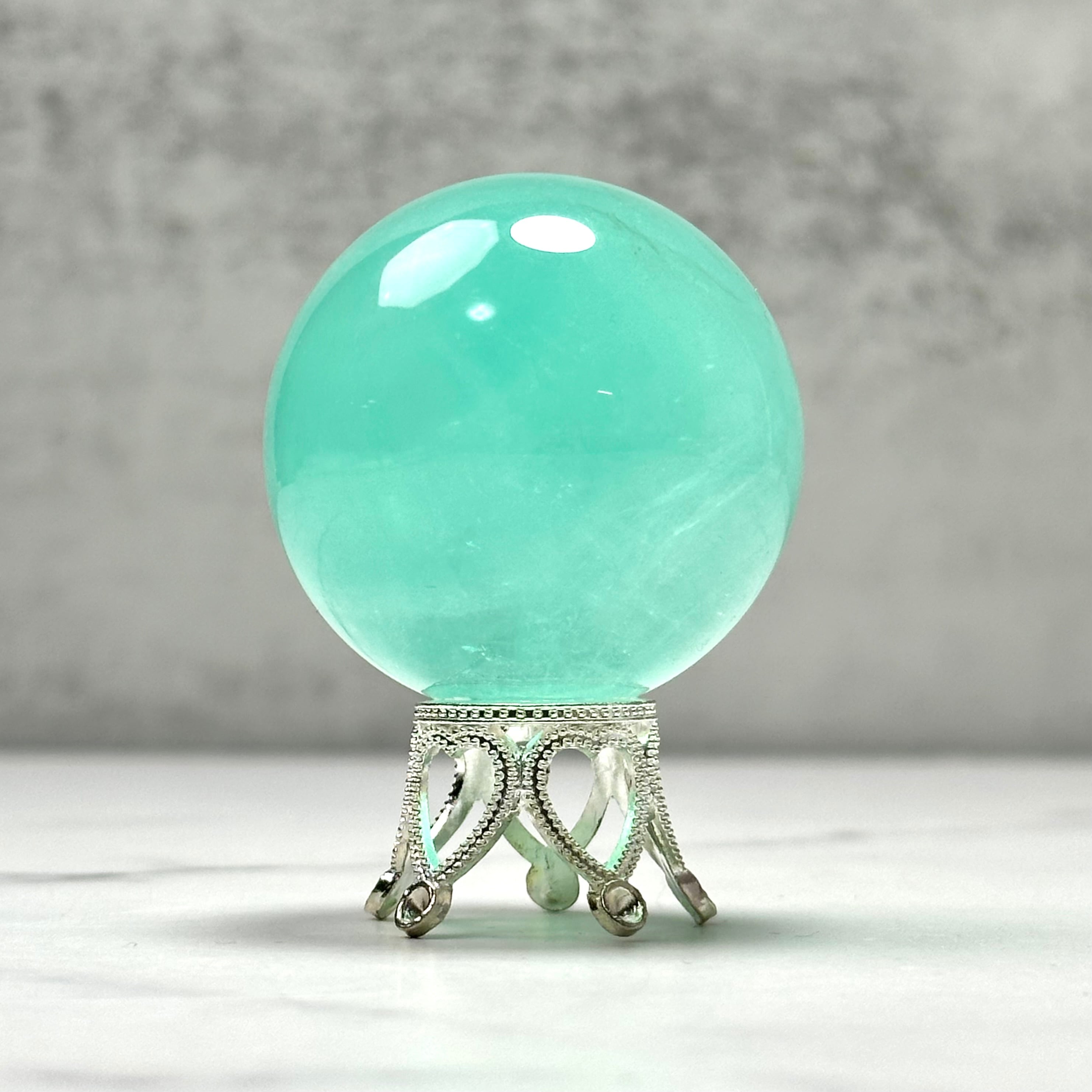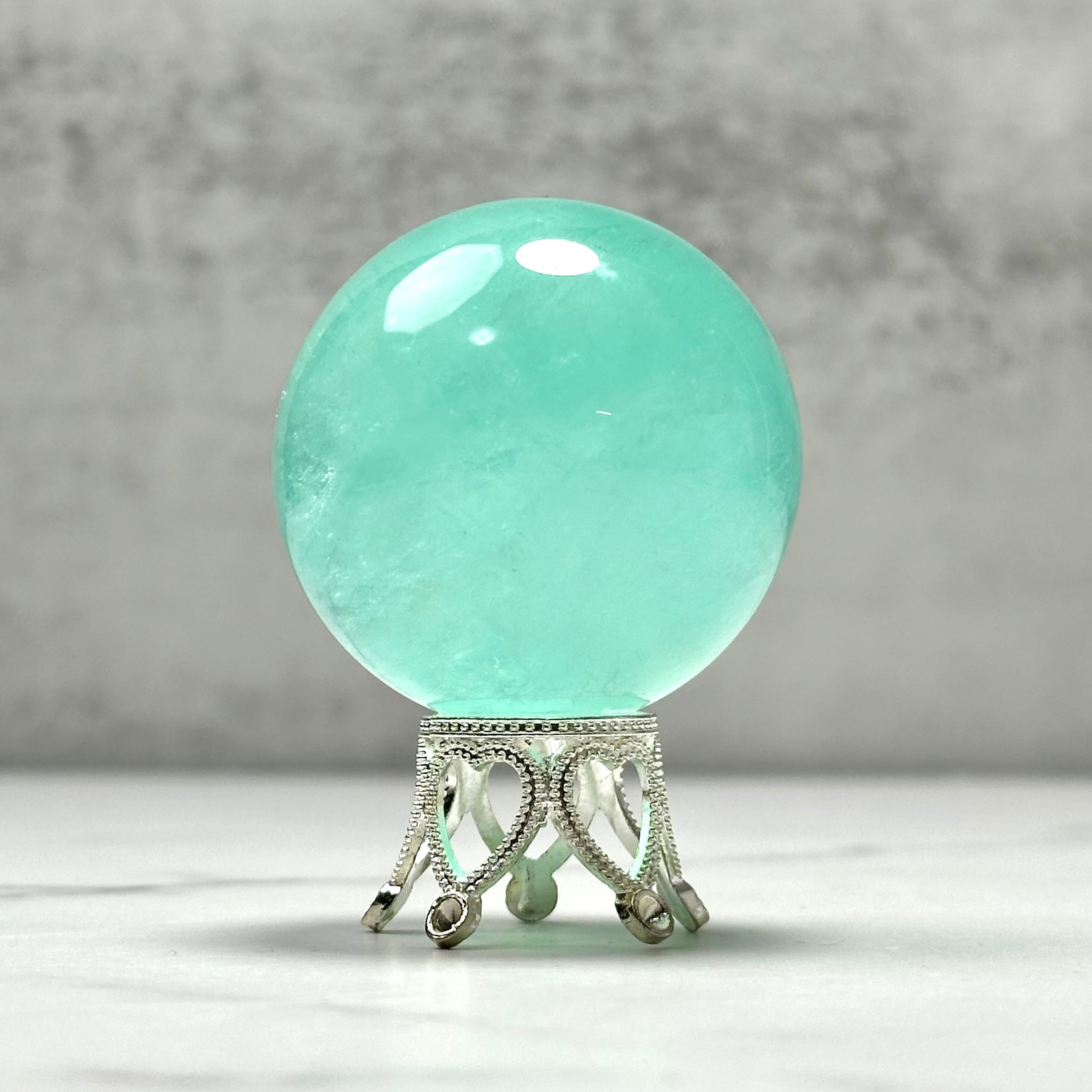 透け感のあるエメラルドグリーンが美しい癒し系のフローライトのスフィア。透明感と清涼感のある美しい色合いは、早朝の森を歩いているような、少し呼吸が深くなるような気持ちにさせてくれます。まるで森林浴をしているような穏やかな癒しを届けてくれるアイテムです。
