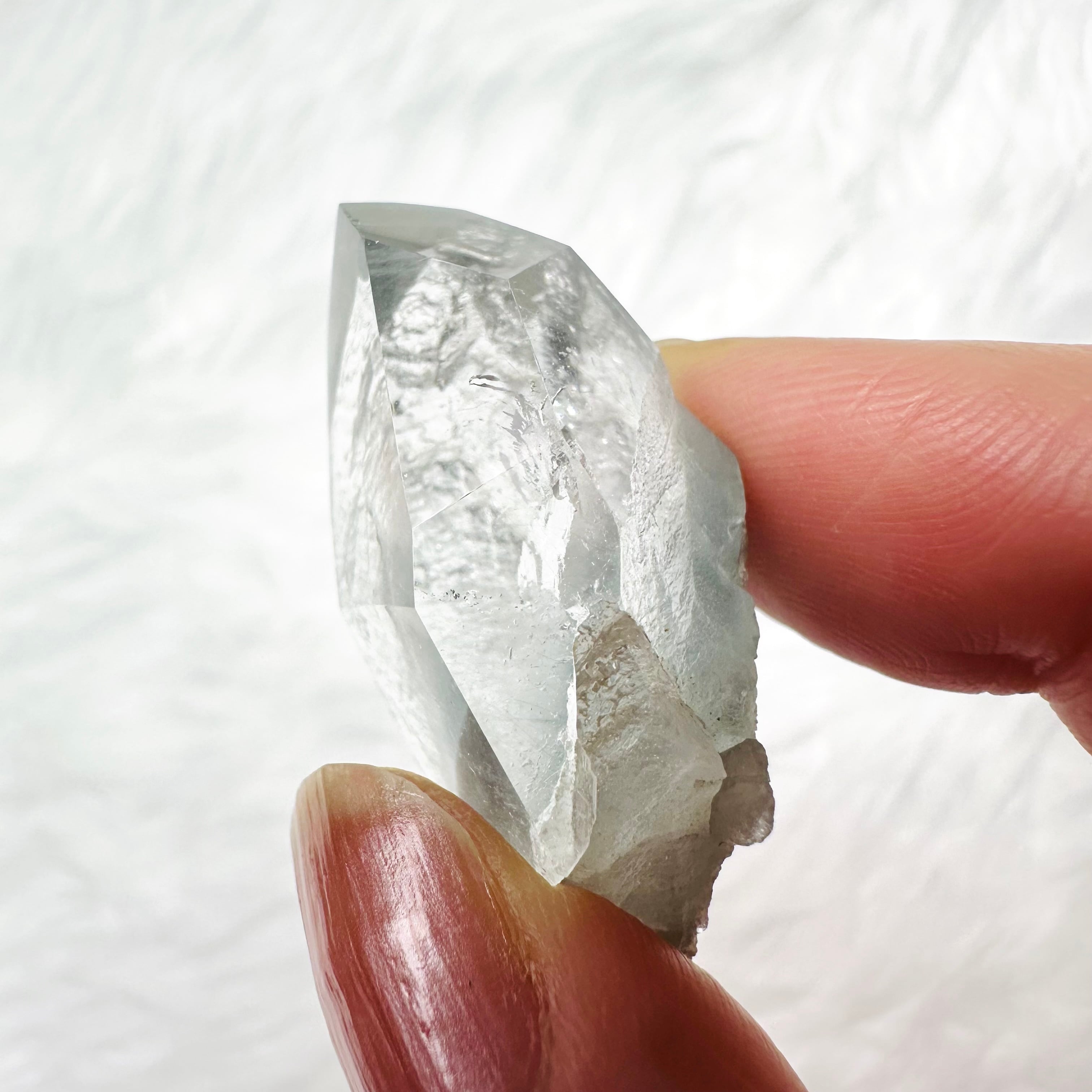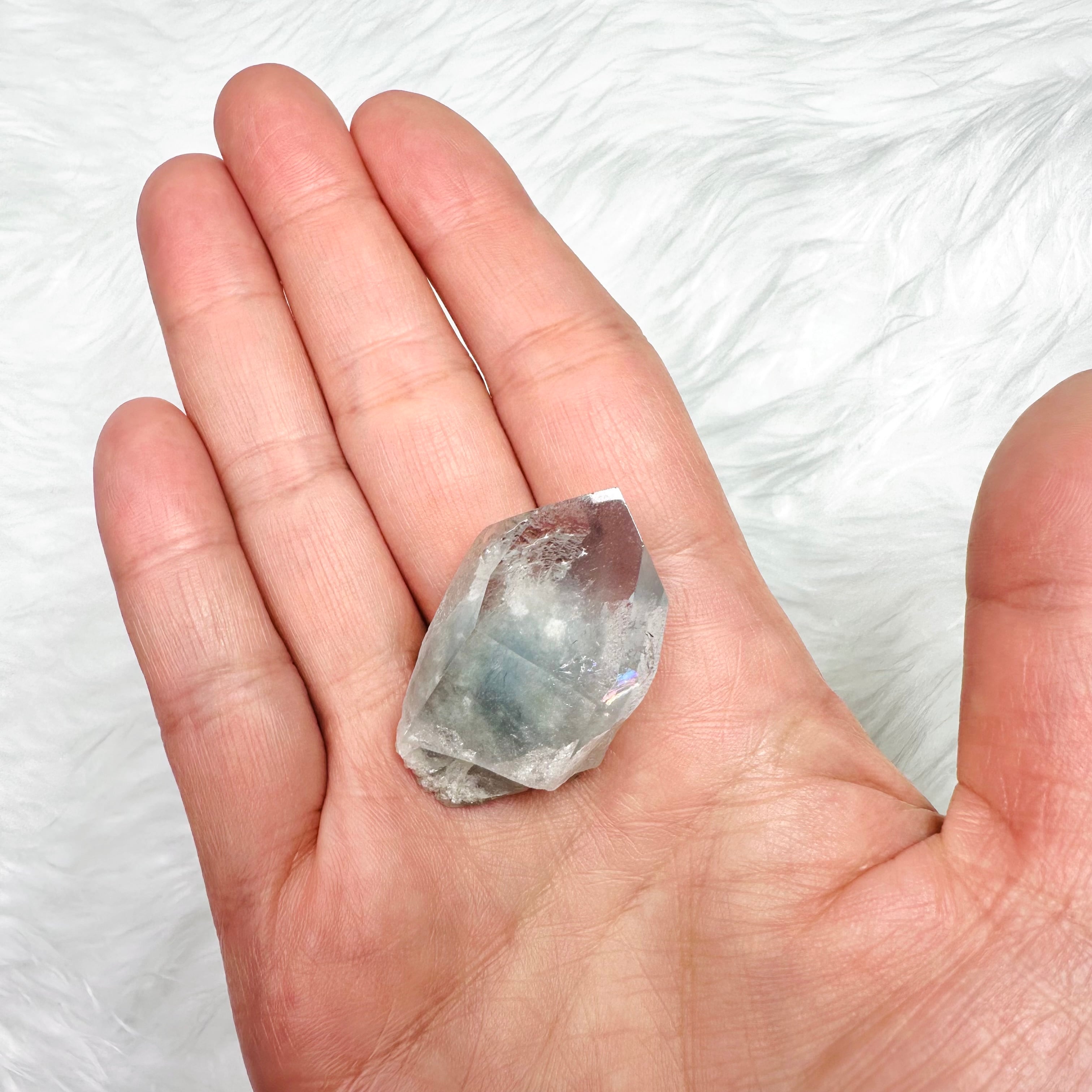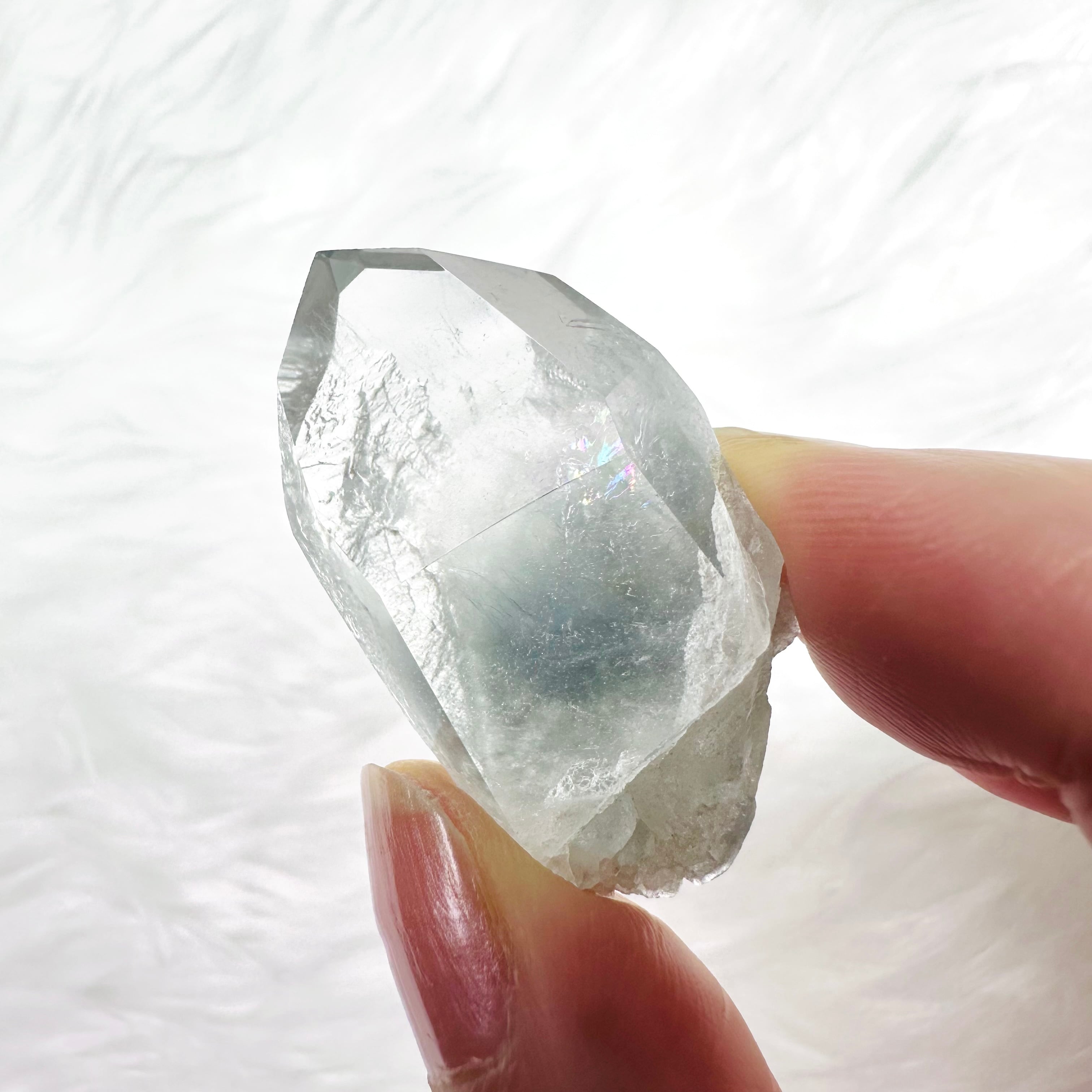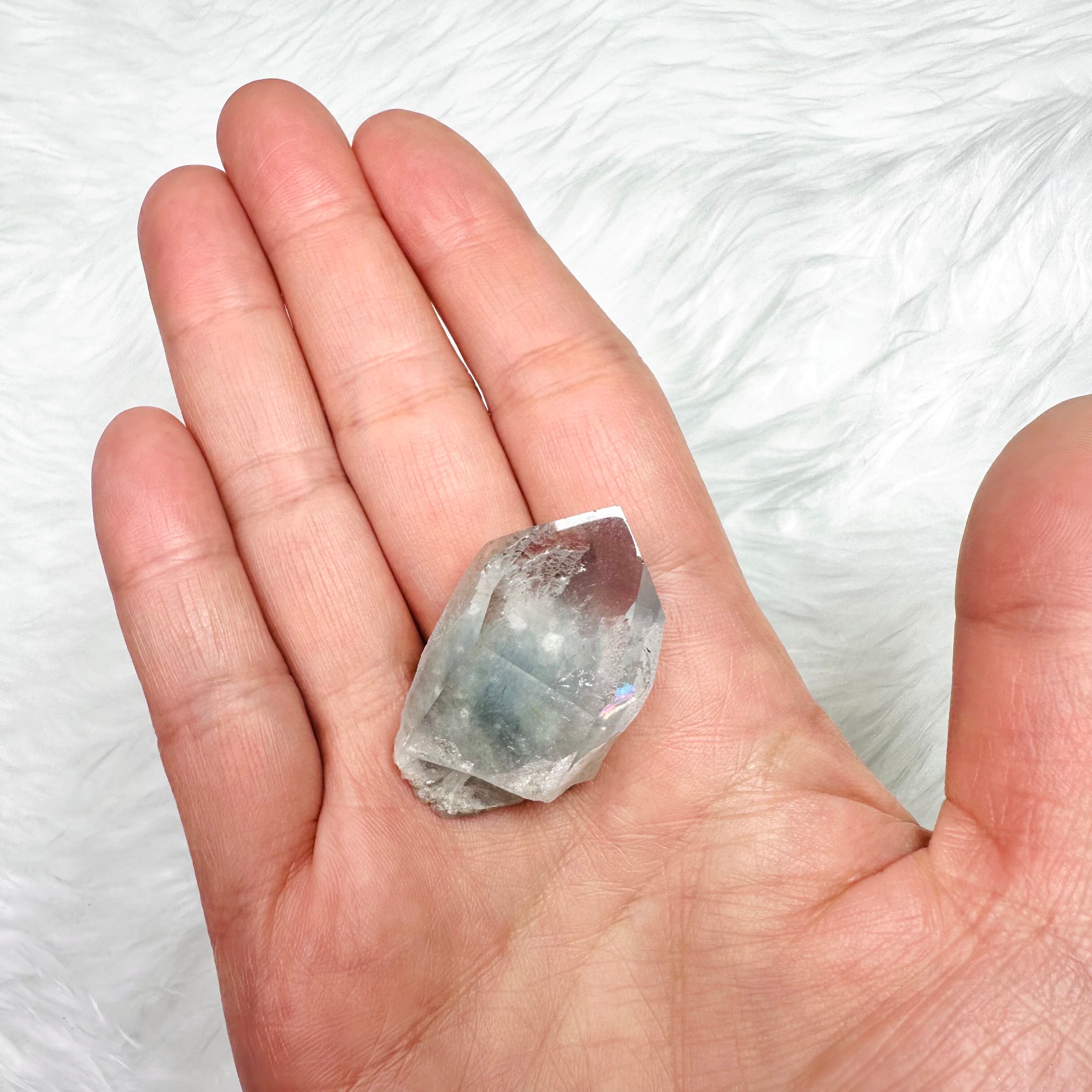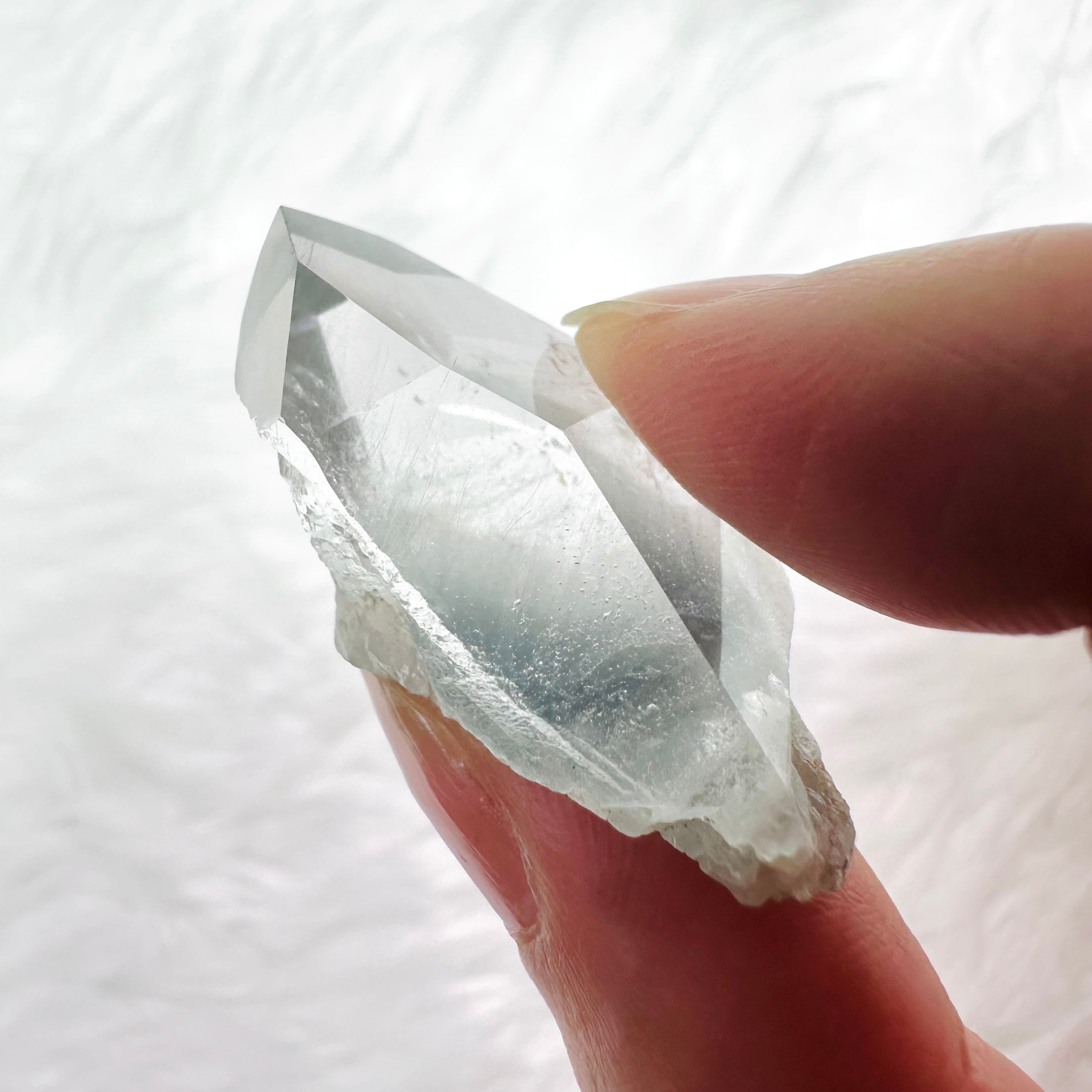 透明度が高いクォーツの内部に、グレーがかったブルーの内包物が細かい羽毛のように入り、神秘的で美しい青い光を放ちます。