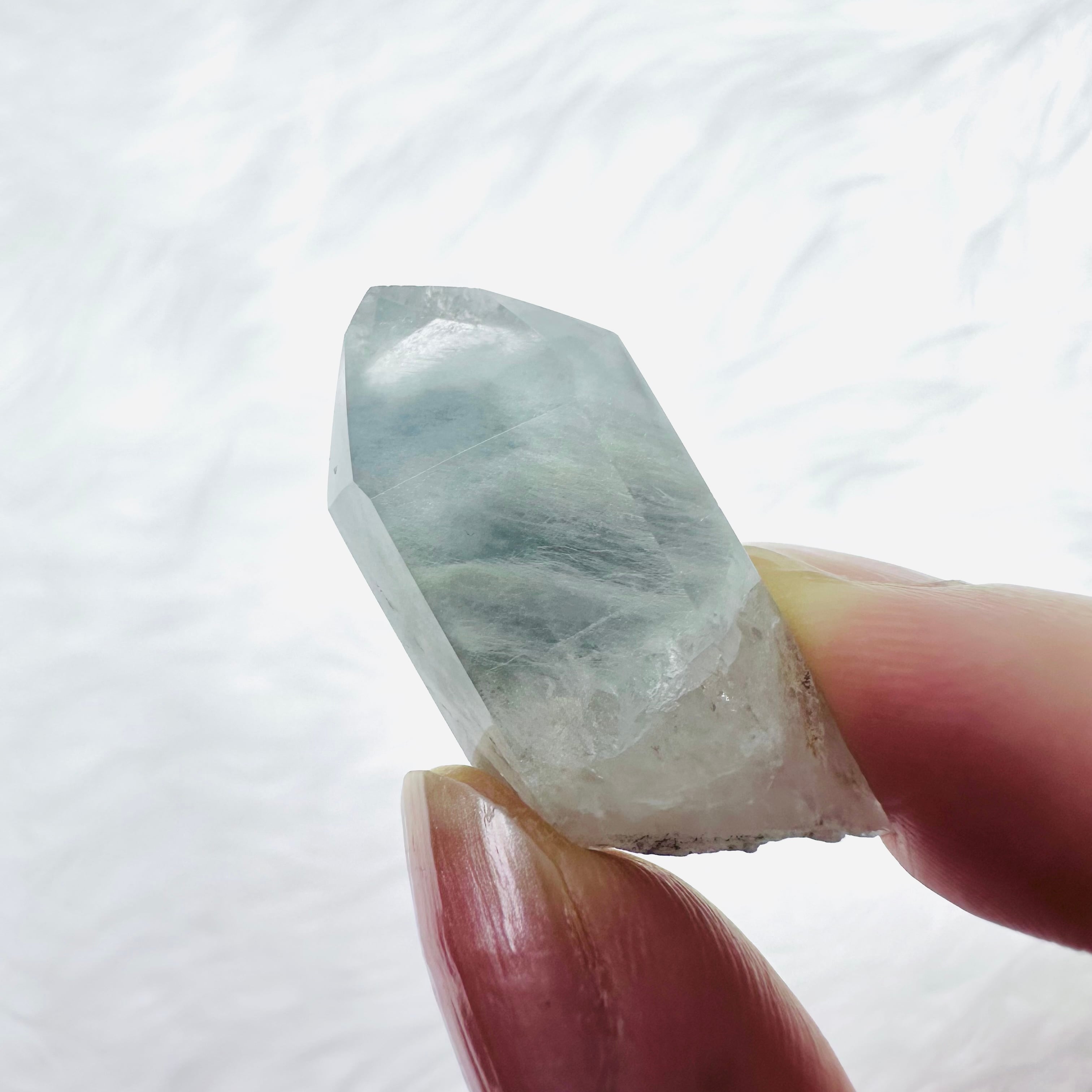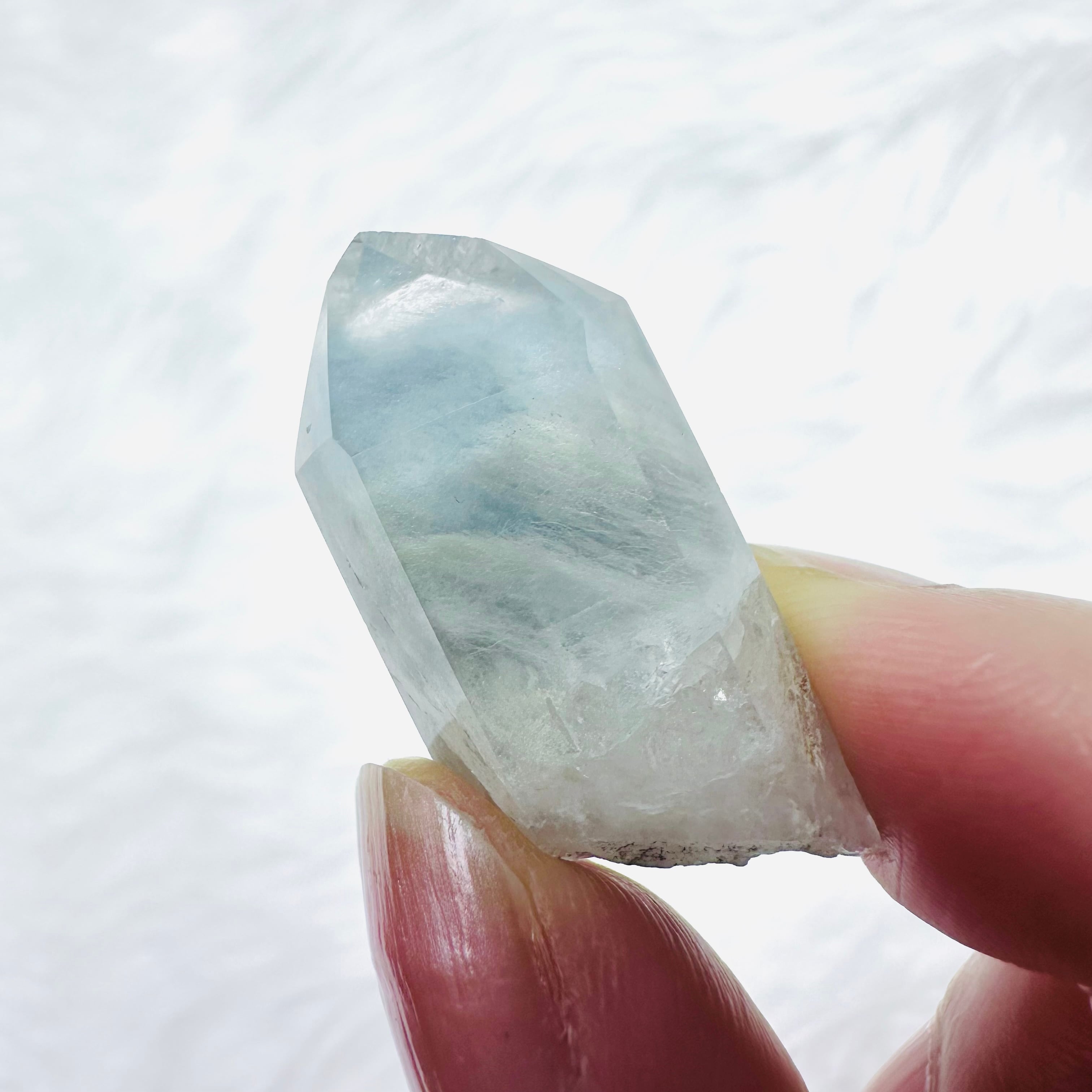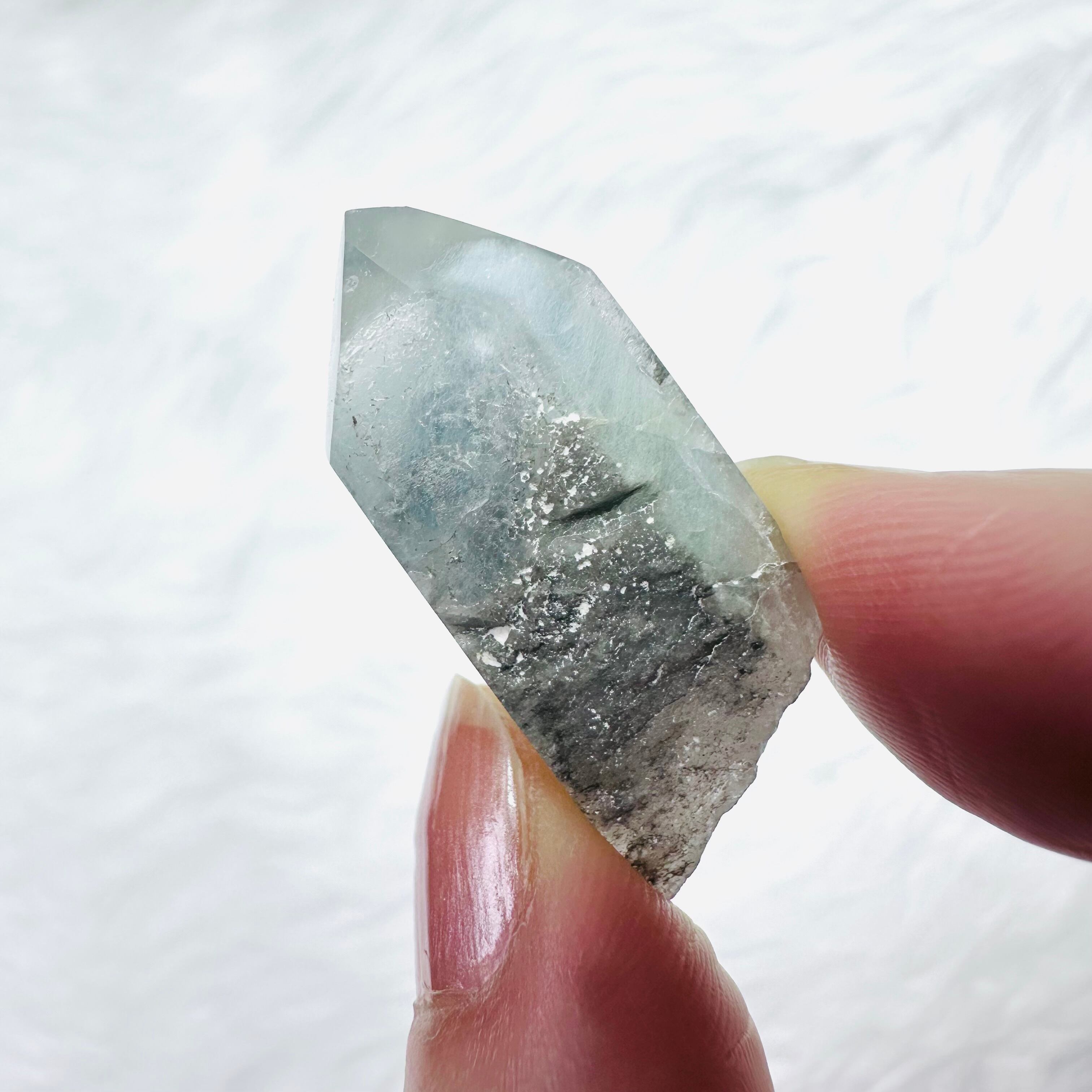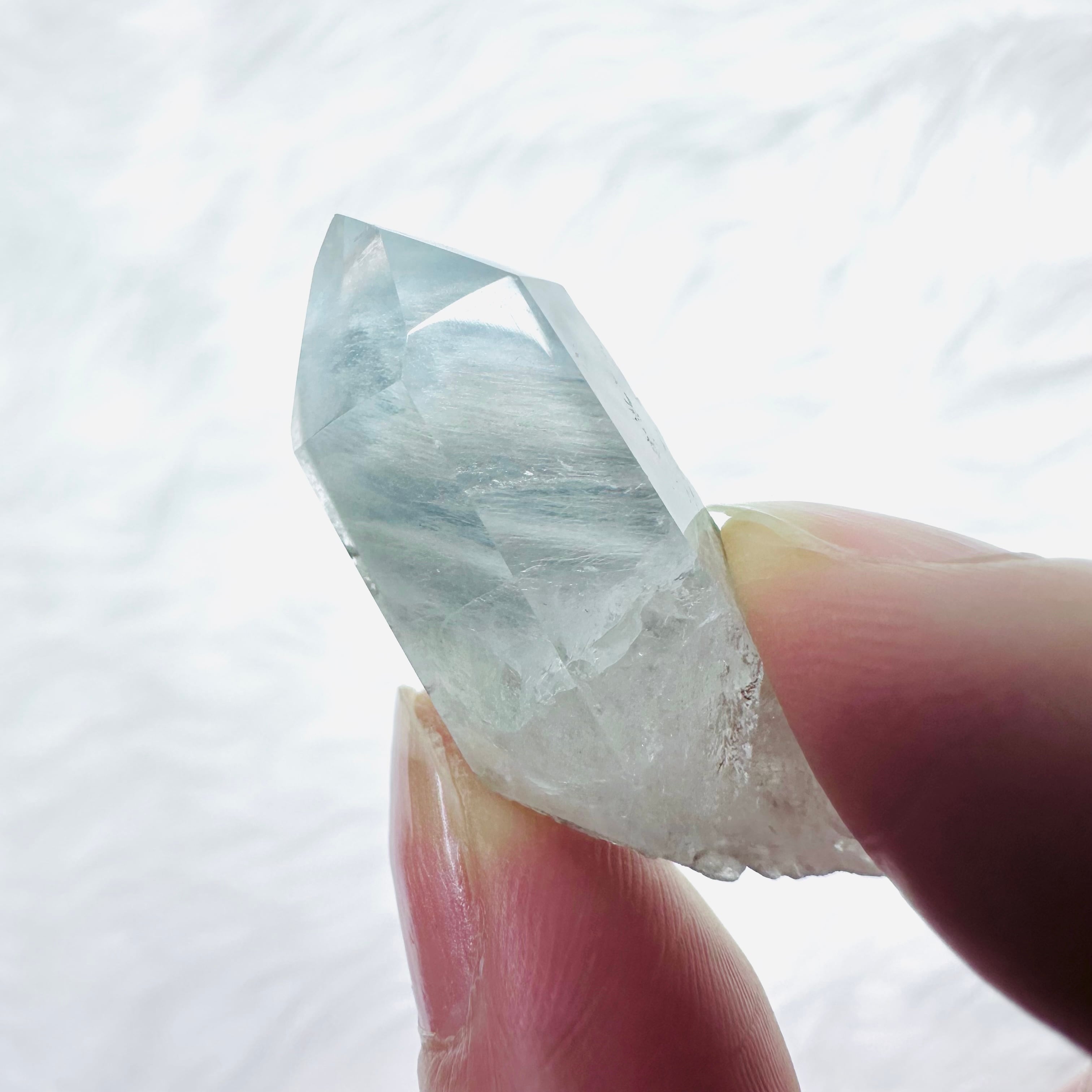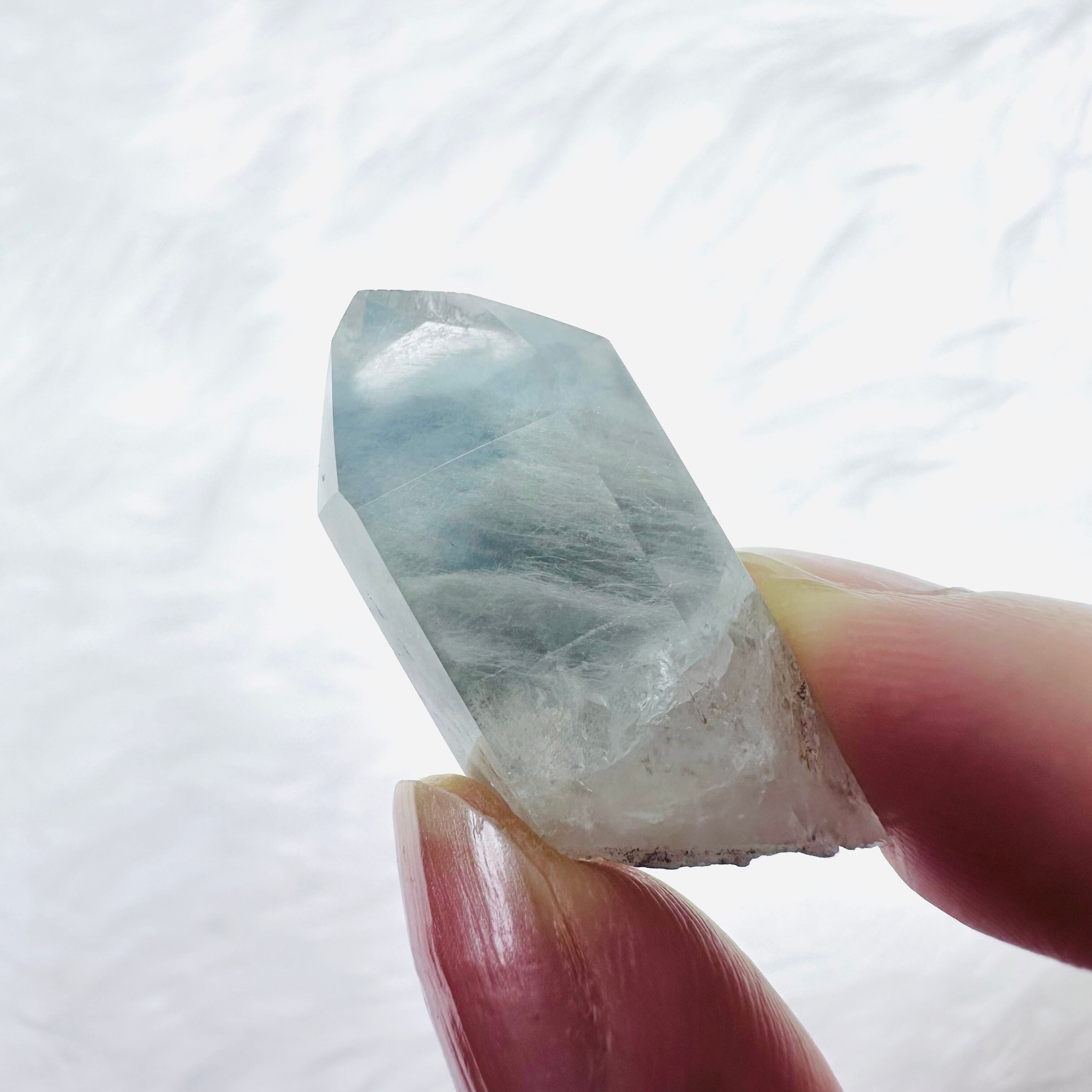 透明度が高いクォーツの内部に、グレーがかったブルーの内包物が細かい羽毛のように入り、神秘的で美しい青い光を放ちます。