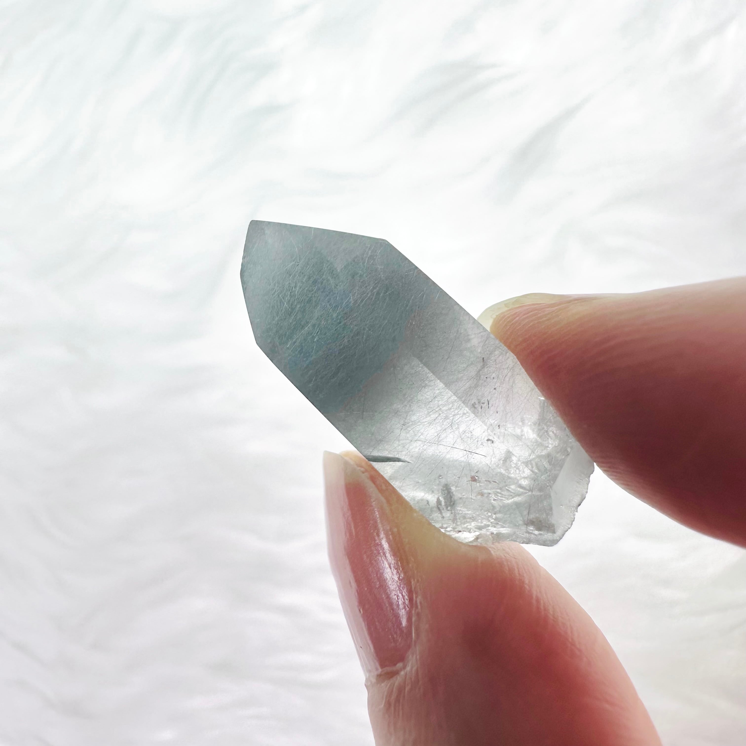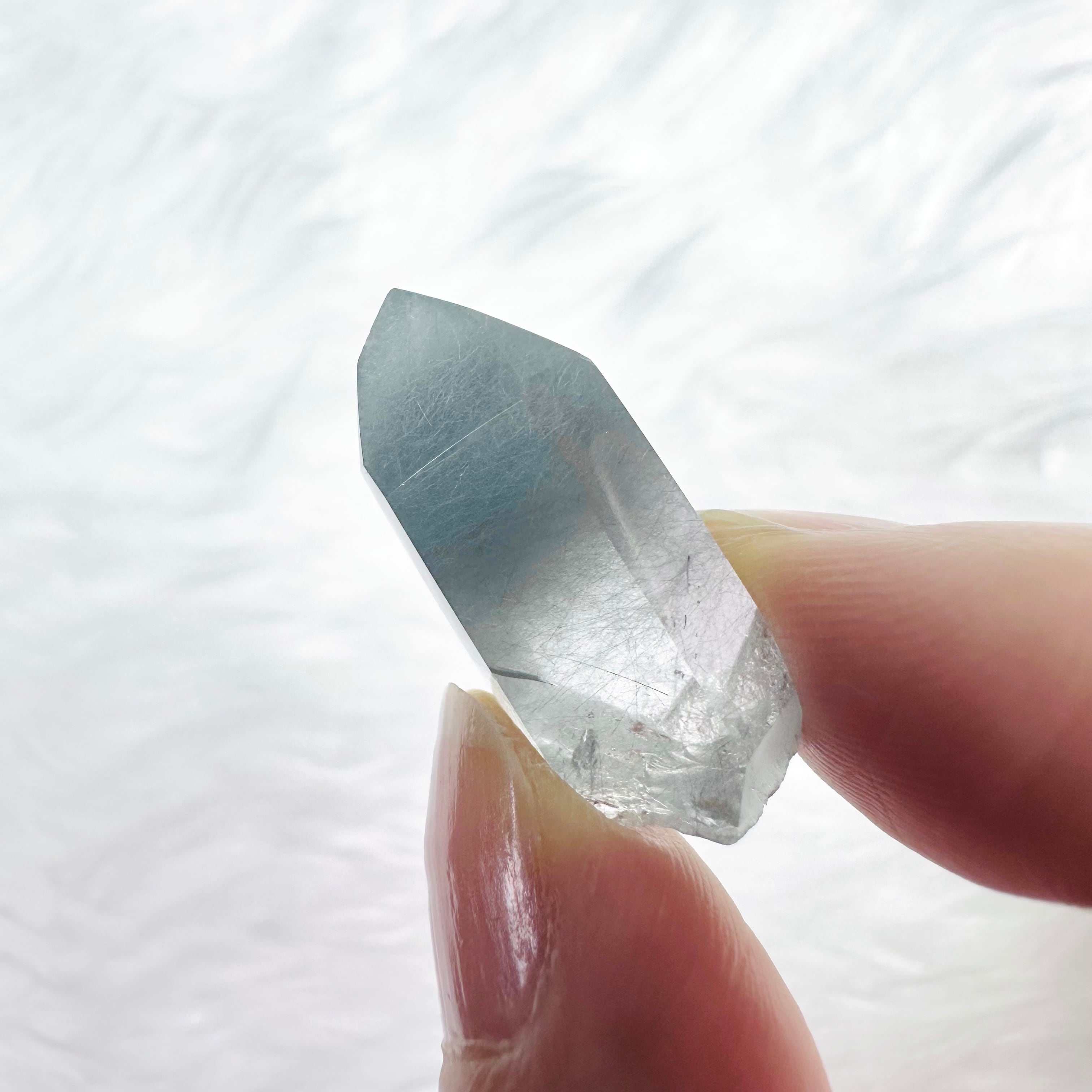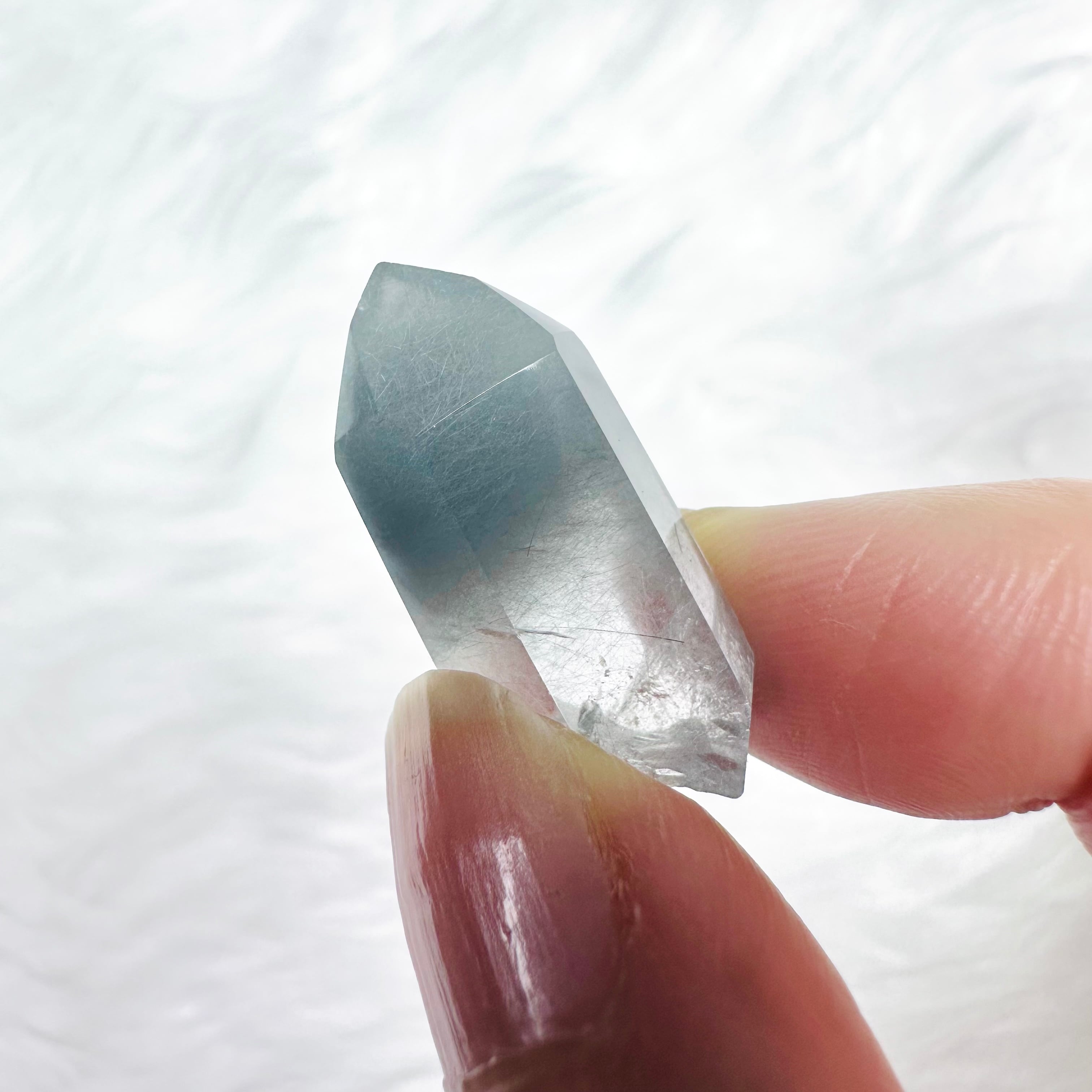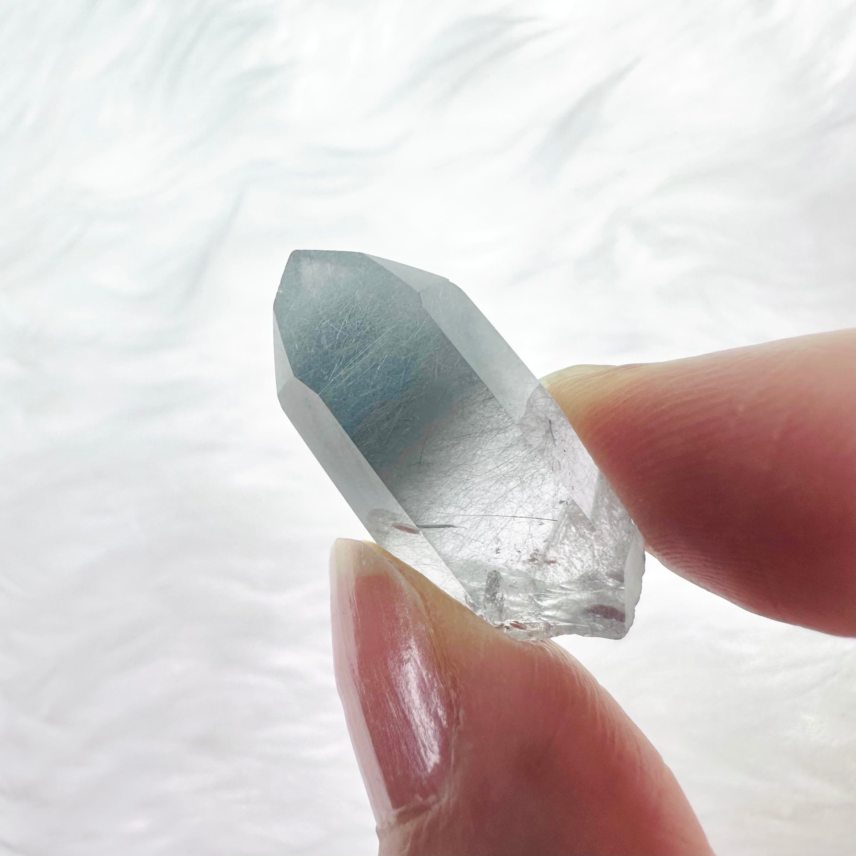 透明度が高いクォーツの内部に、グレーがかったブルーの内包物が細かい羽毛のように入り、神秘的で美しい青い光を放ちます。