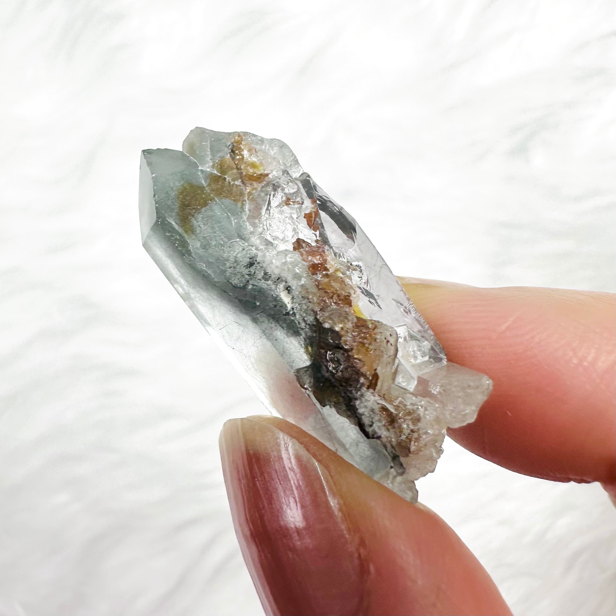 透明度が高いクォーツの内部に、グレーがかったブルーの内包物が細かい羽毛のように入り、神秘的で美しい青い光を放ちます。