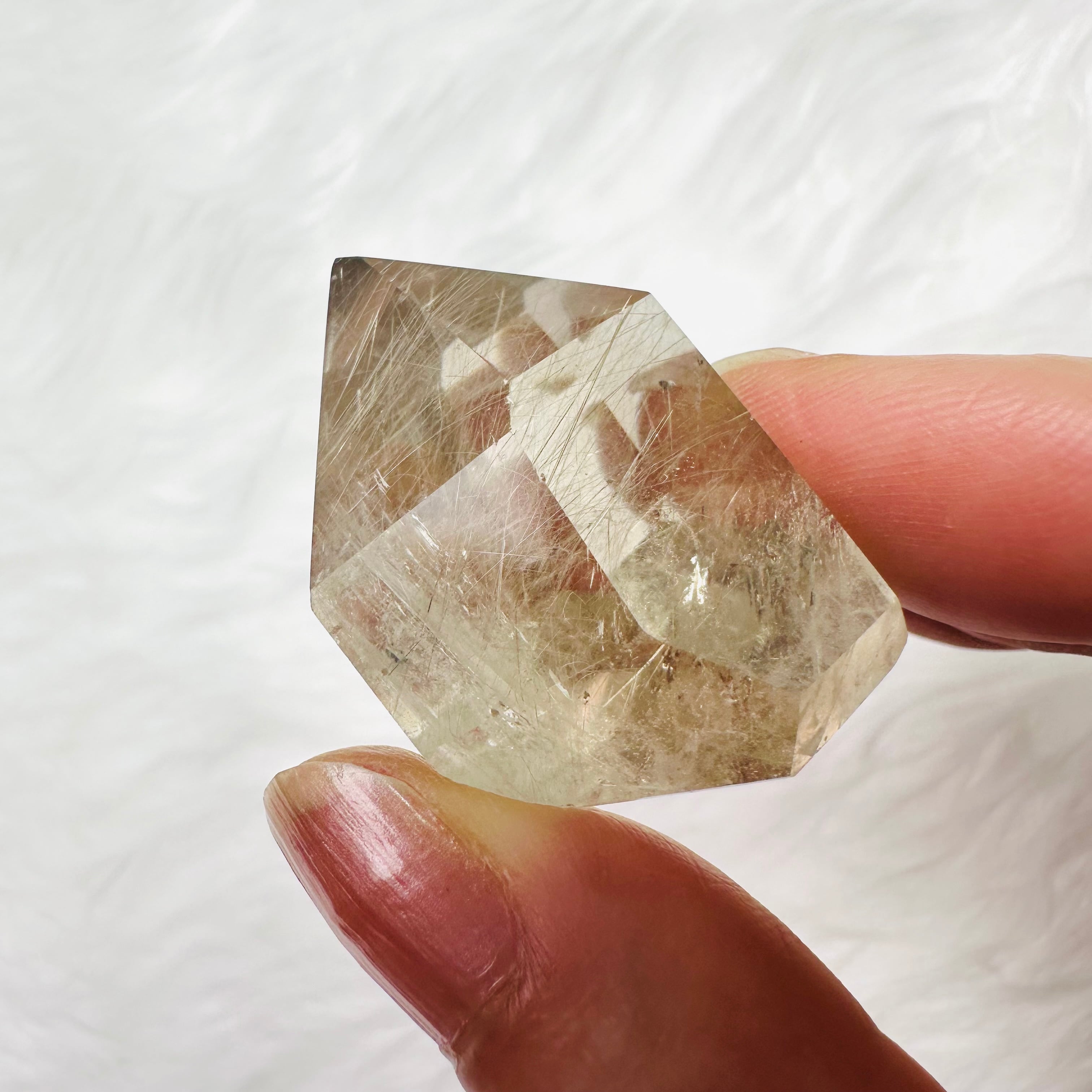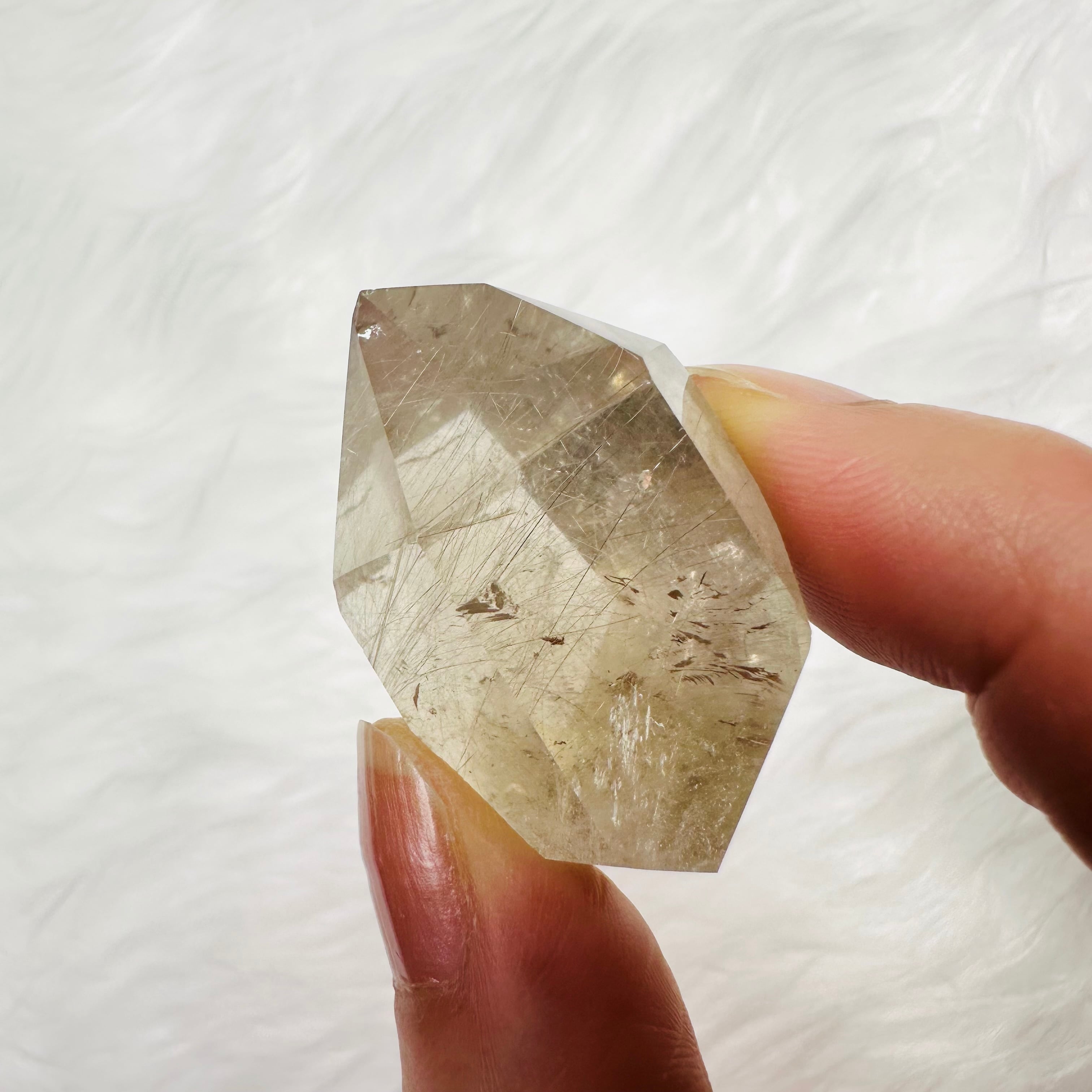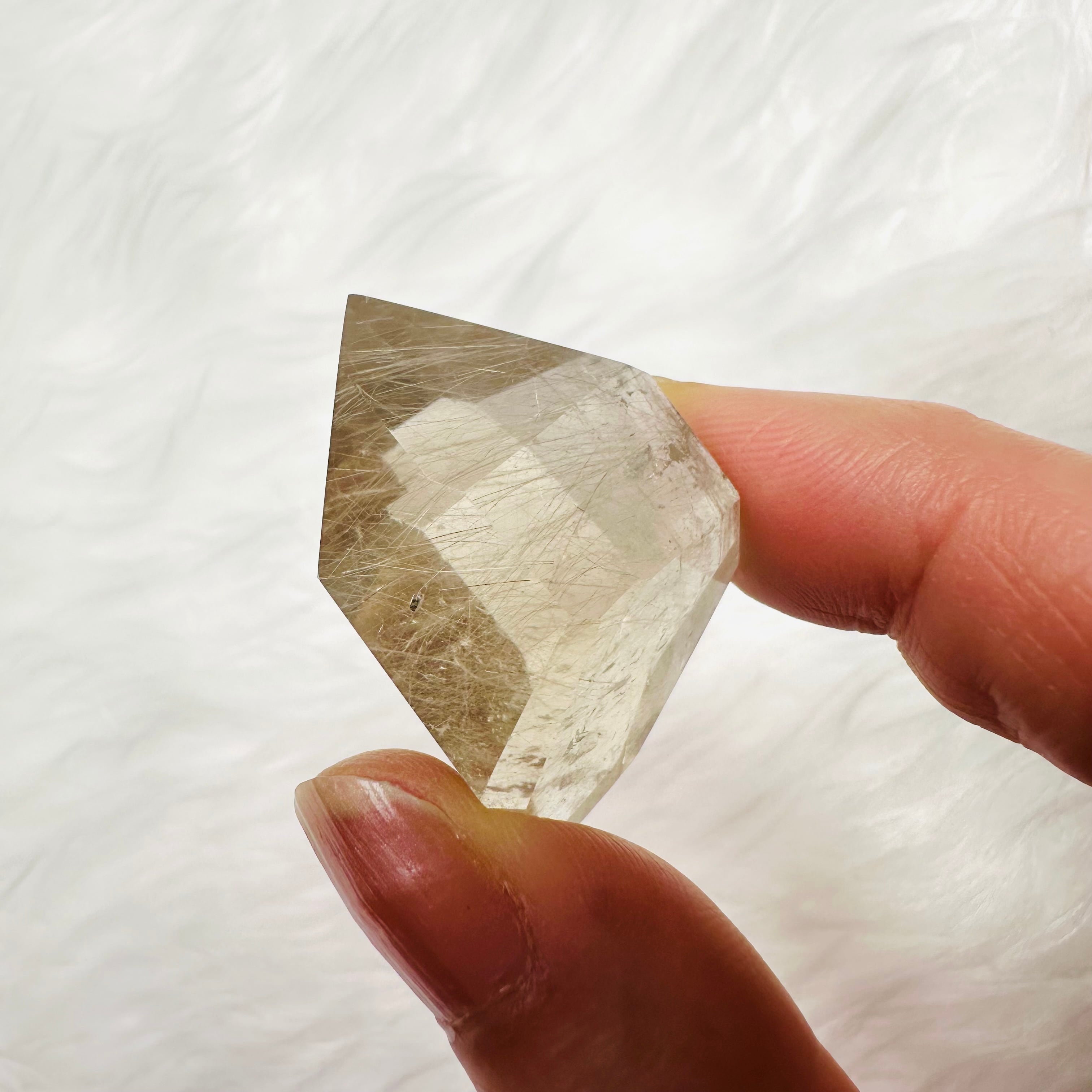 ブラジル産サゲニティッククォーツ。水晶の内部に、繊細な針状インクルージョンが広がり、まるで天然のアートのような個性豊かな美しさを楽しめます。光を受けるたびに表情が変わり、見る角度によって奥行きある景色を映し出します。