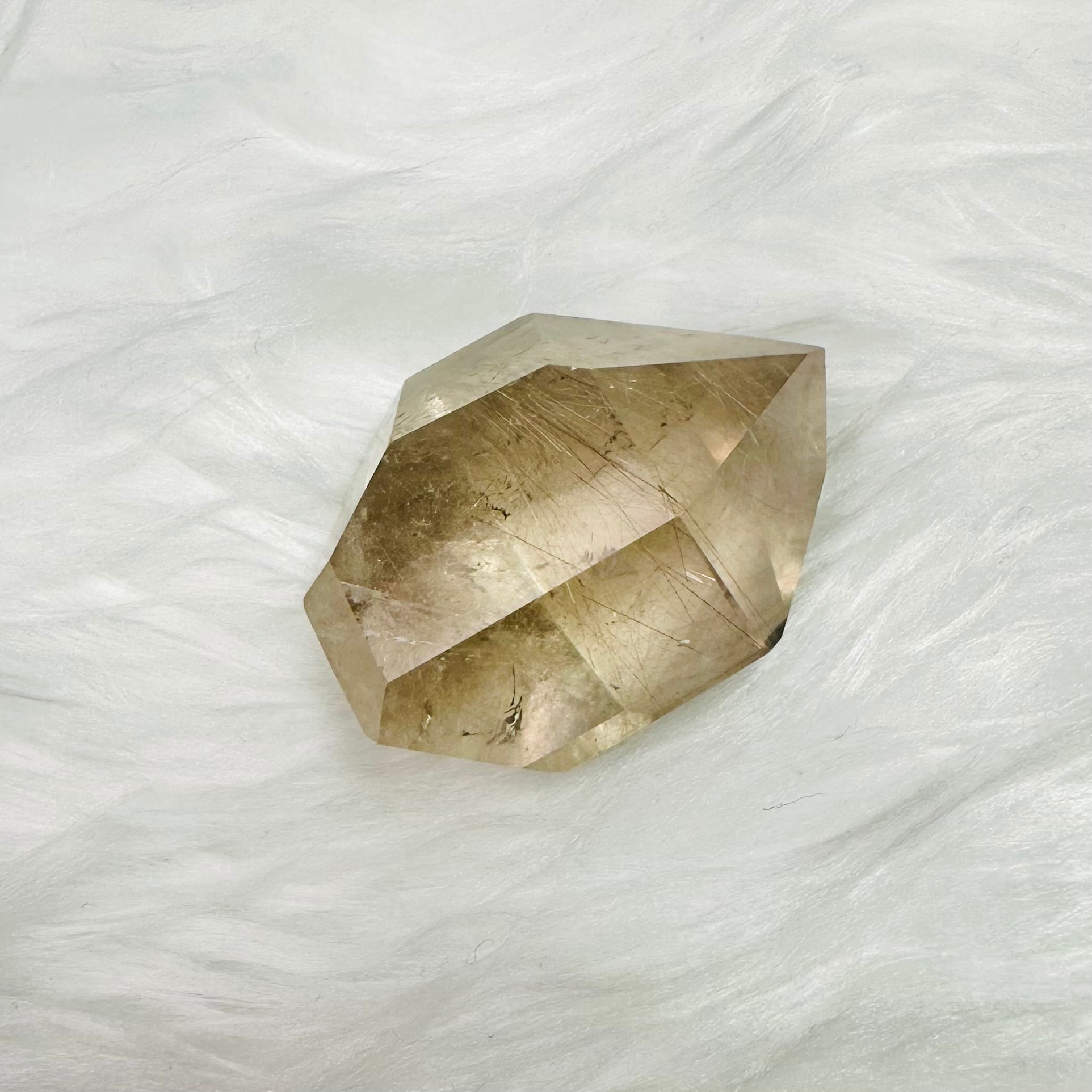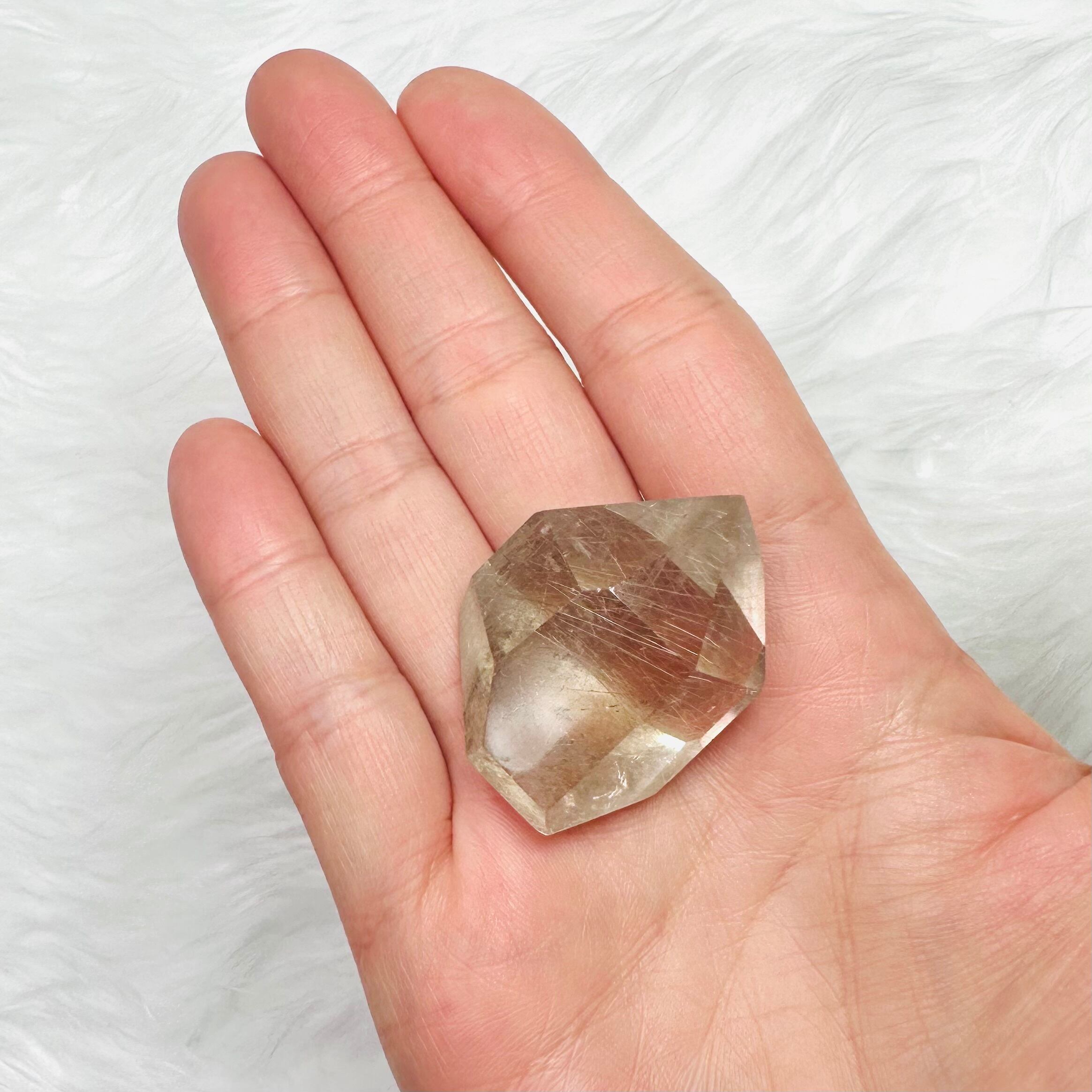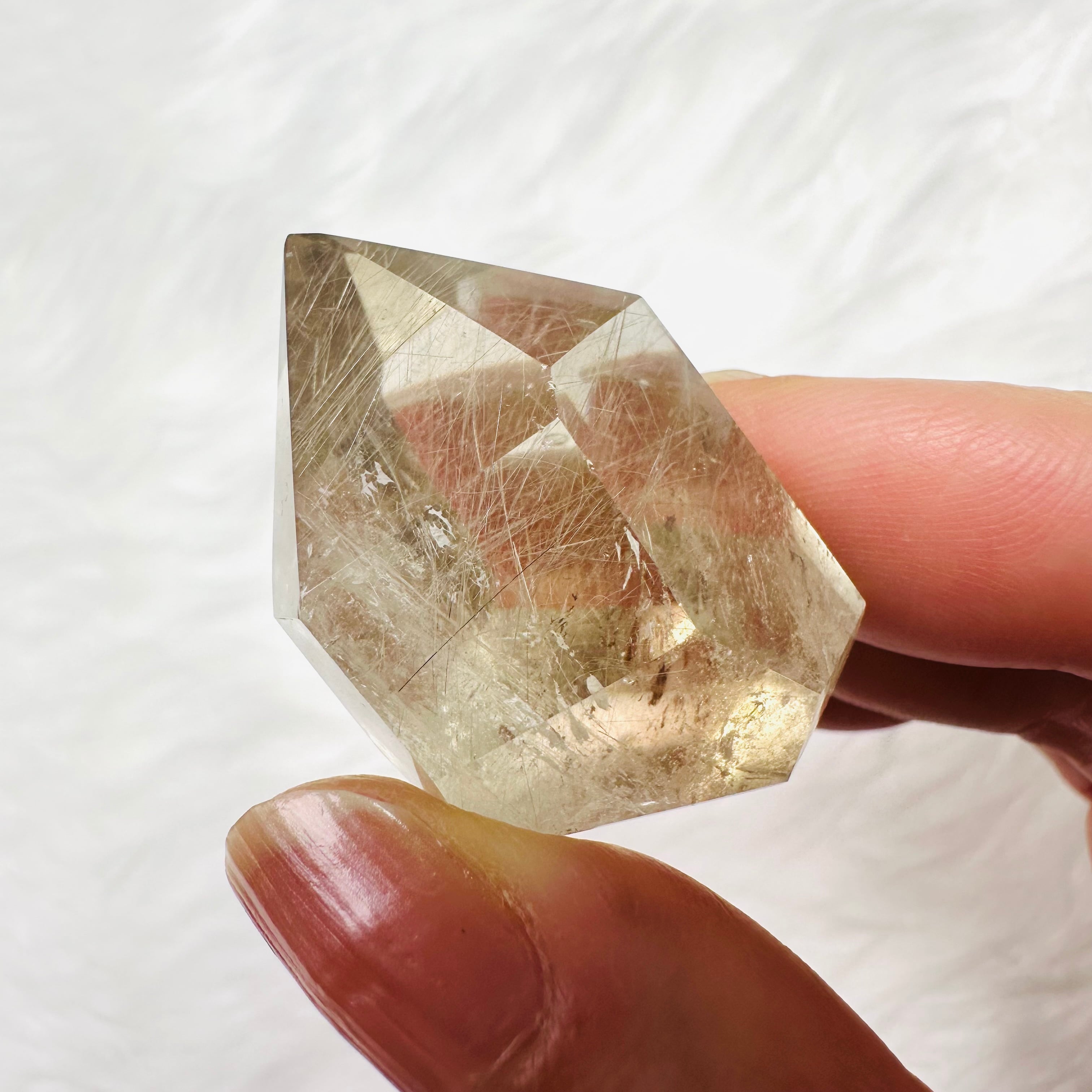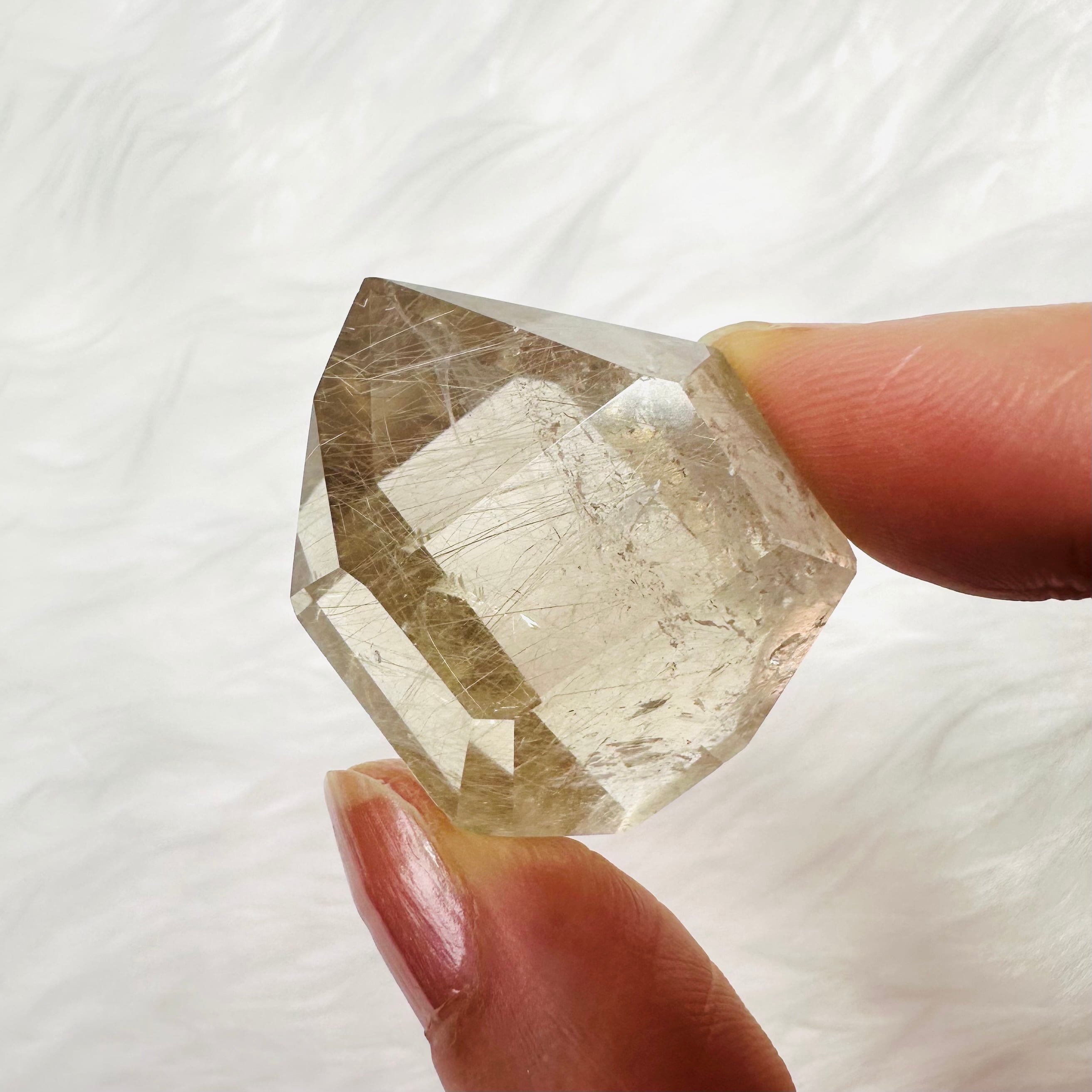 ブラジル産サゲニティッククォーツ。水晶の内部に、繊細な針状インクルージョンが広がり、まるで天然のアートのような個性豊かな美しさを楽しめます。光を受けるたびに表情が変わり、見る角度によって奥行きある景色を映し出します。