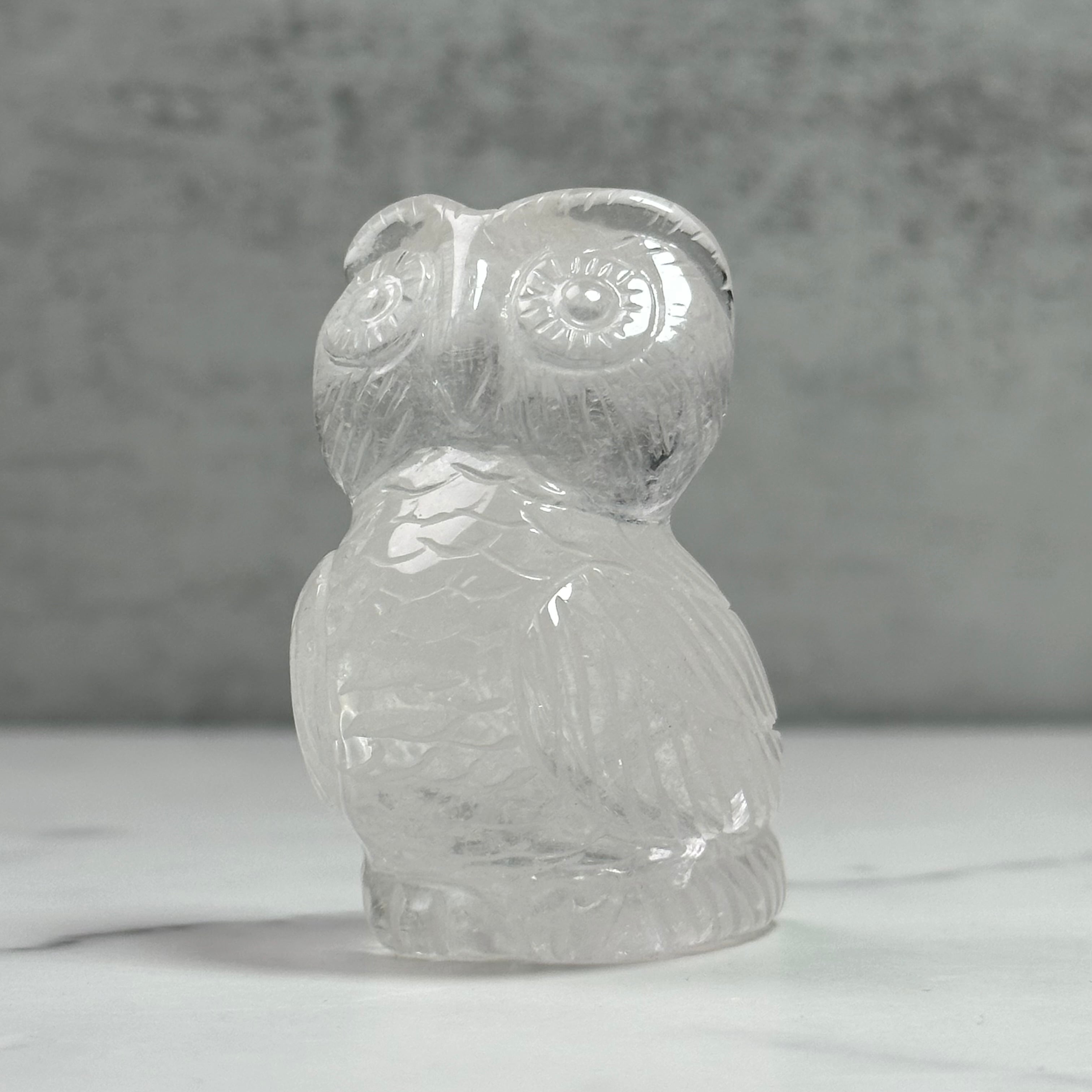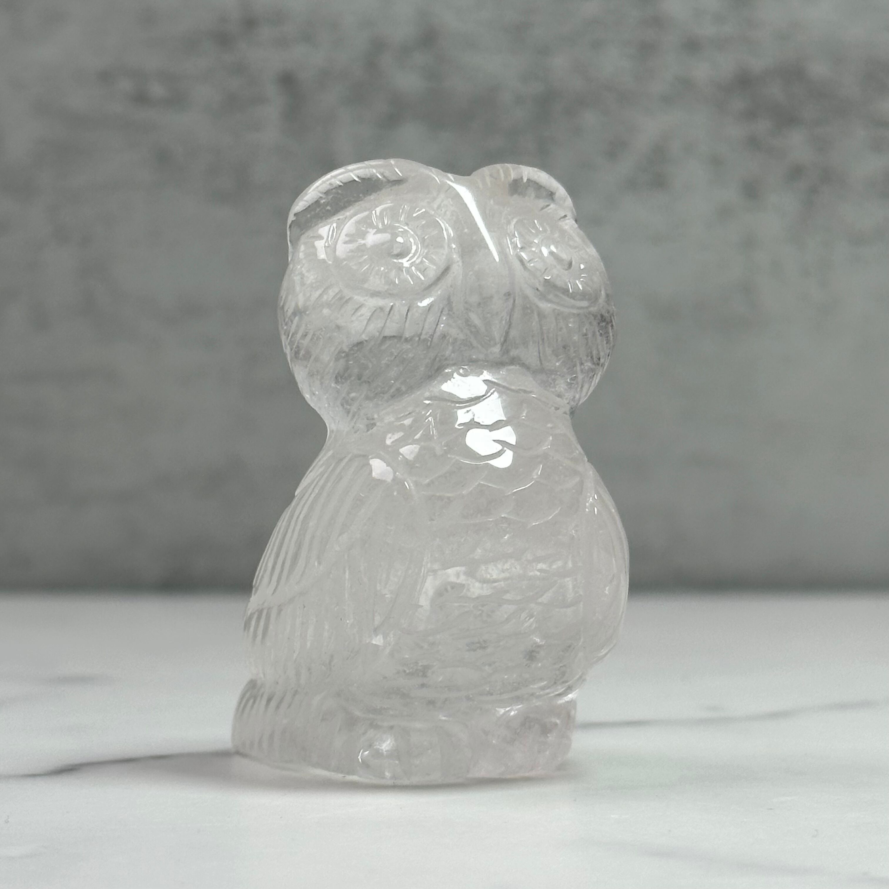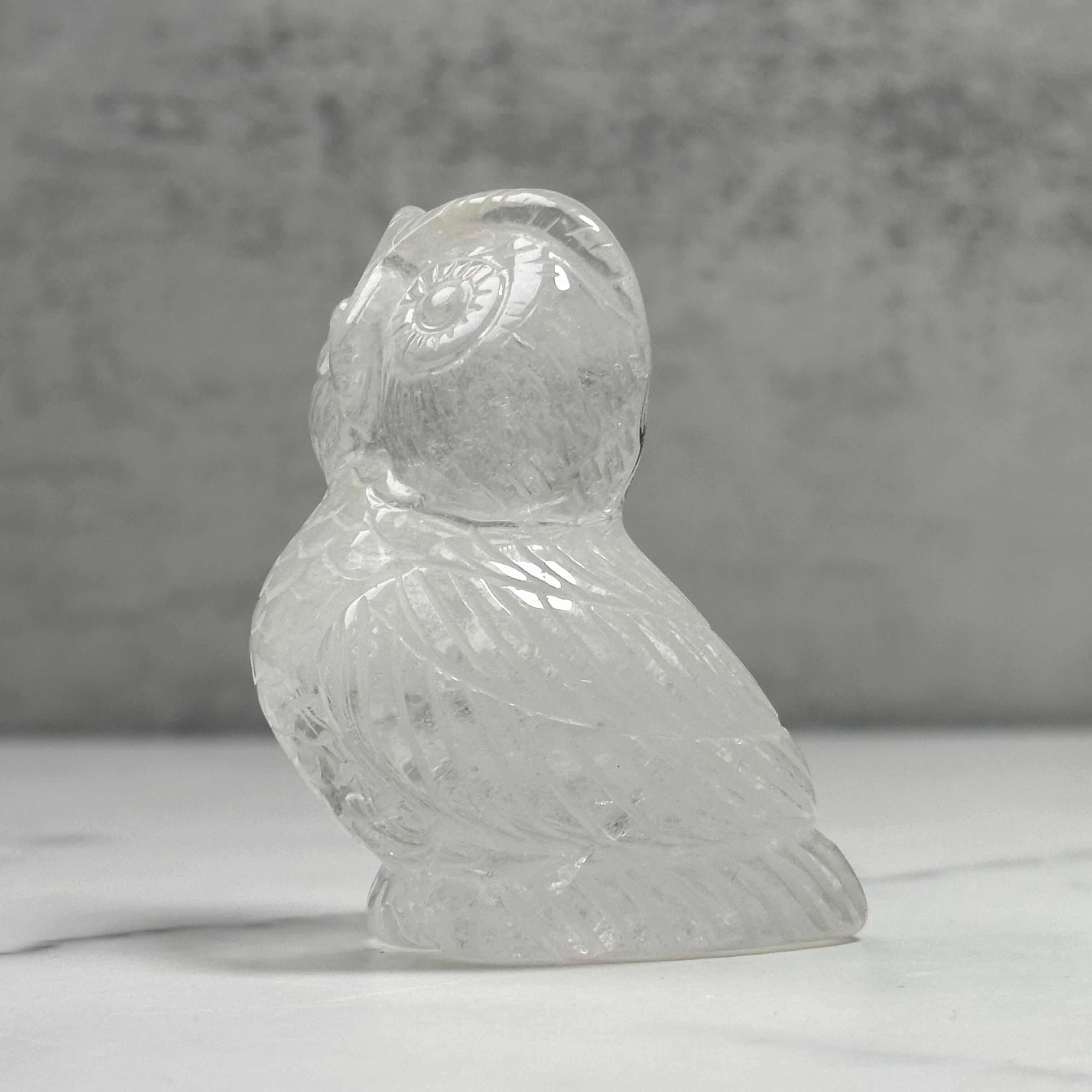 水晶を手彫りで丁寧に彫刻したフクロウのオブジェ。人の手によって刻まれた表情や羽は味わい深く飽きが来ません。優しい佇まいは人にも空間にも、時間と共にしっくり馴染んできます。