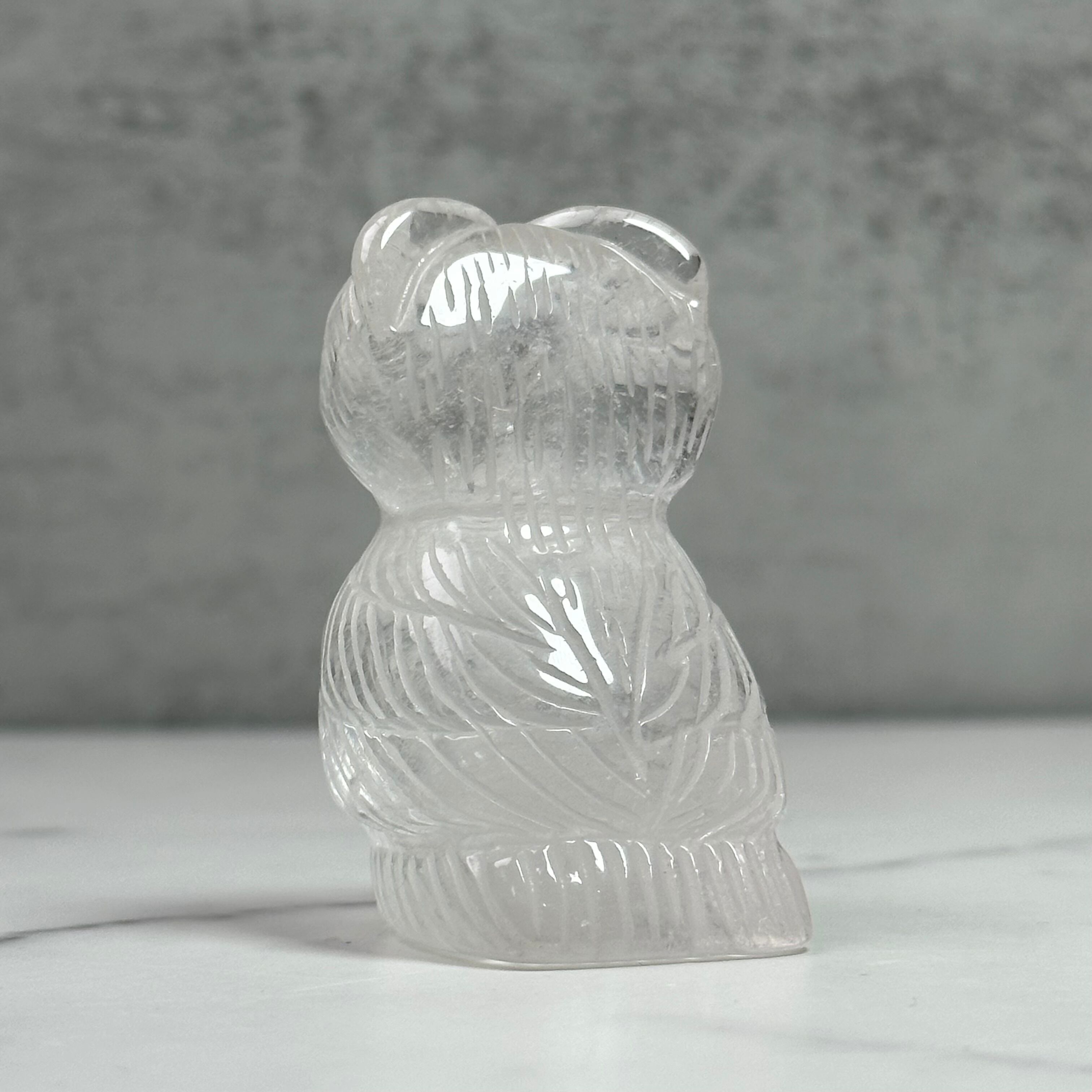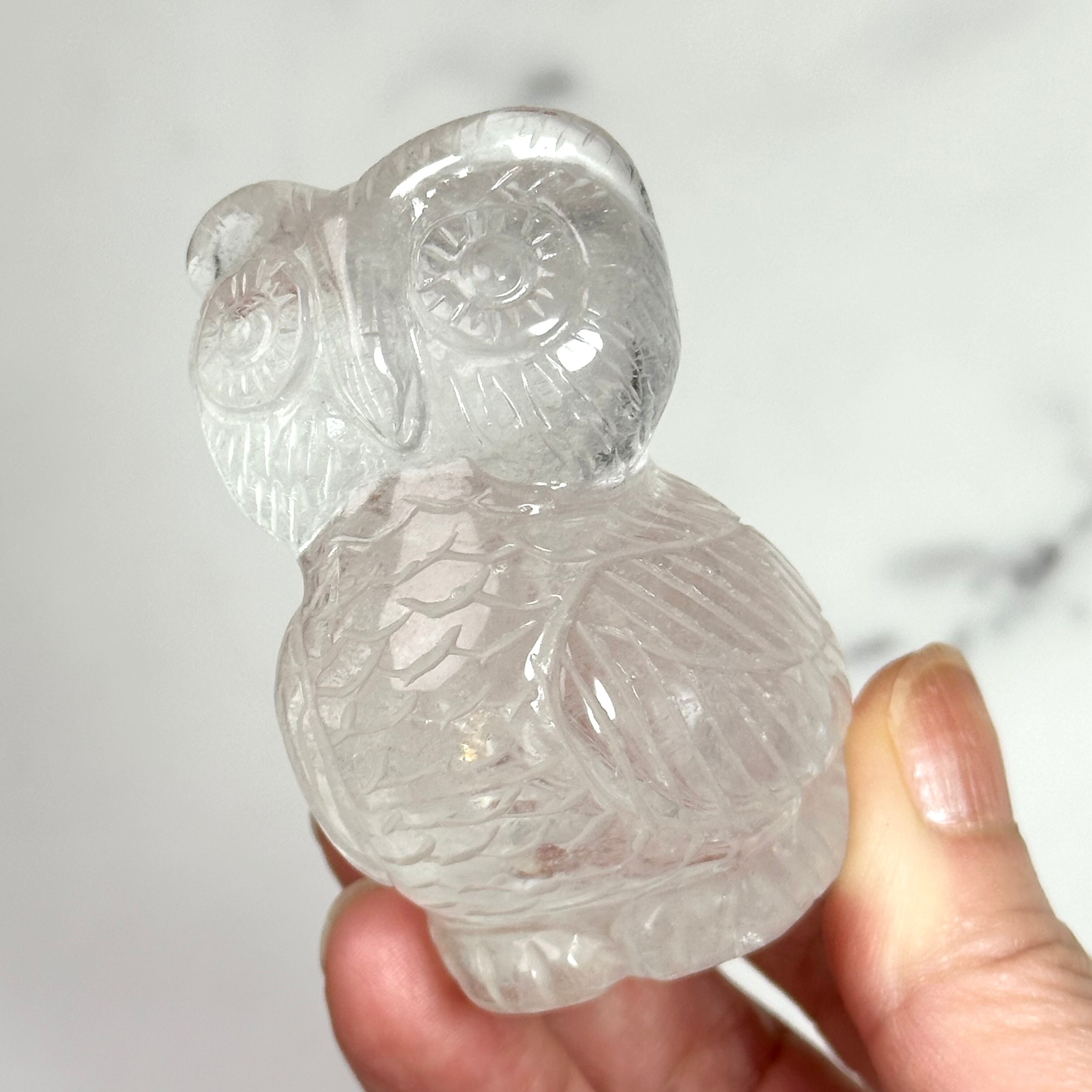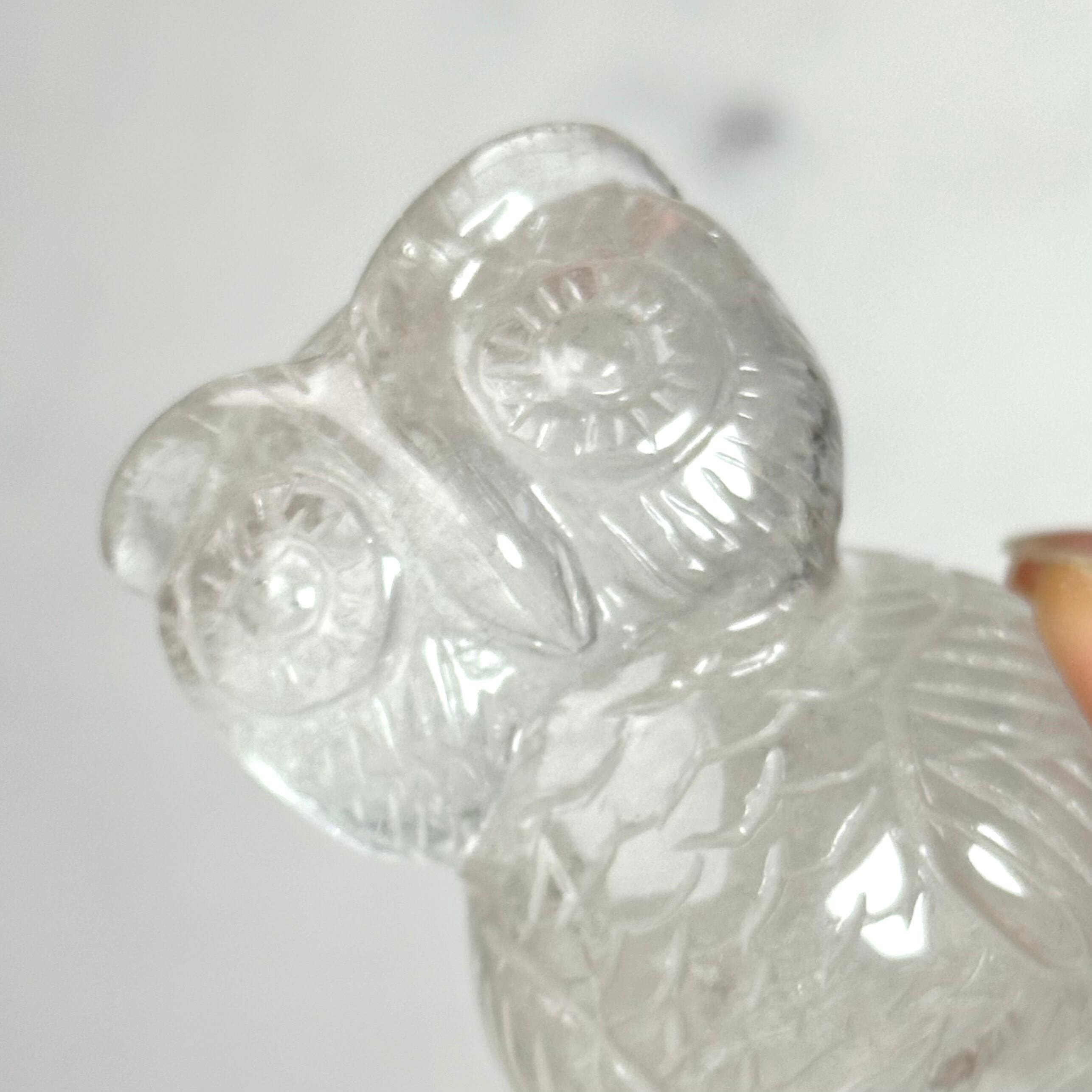水晶を手彫りで丁寧に彫刻したフクロウのオブジェ。人の手によって刻まれた表情や羽は味わい深く飽きが来ません。優しい佇まいは人にも空間にも、時間と共にしっくり馴染んできます。