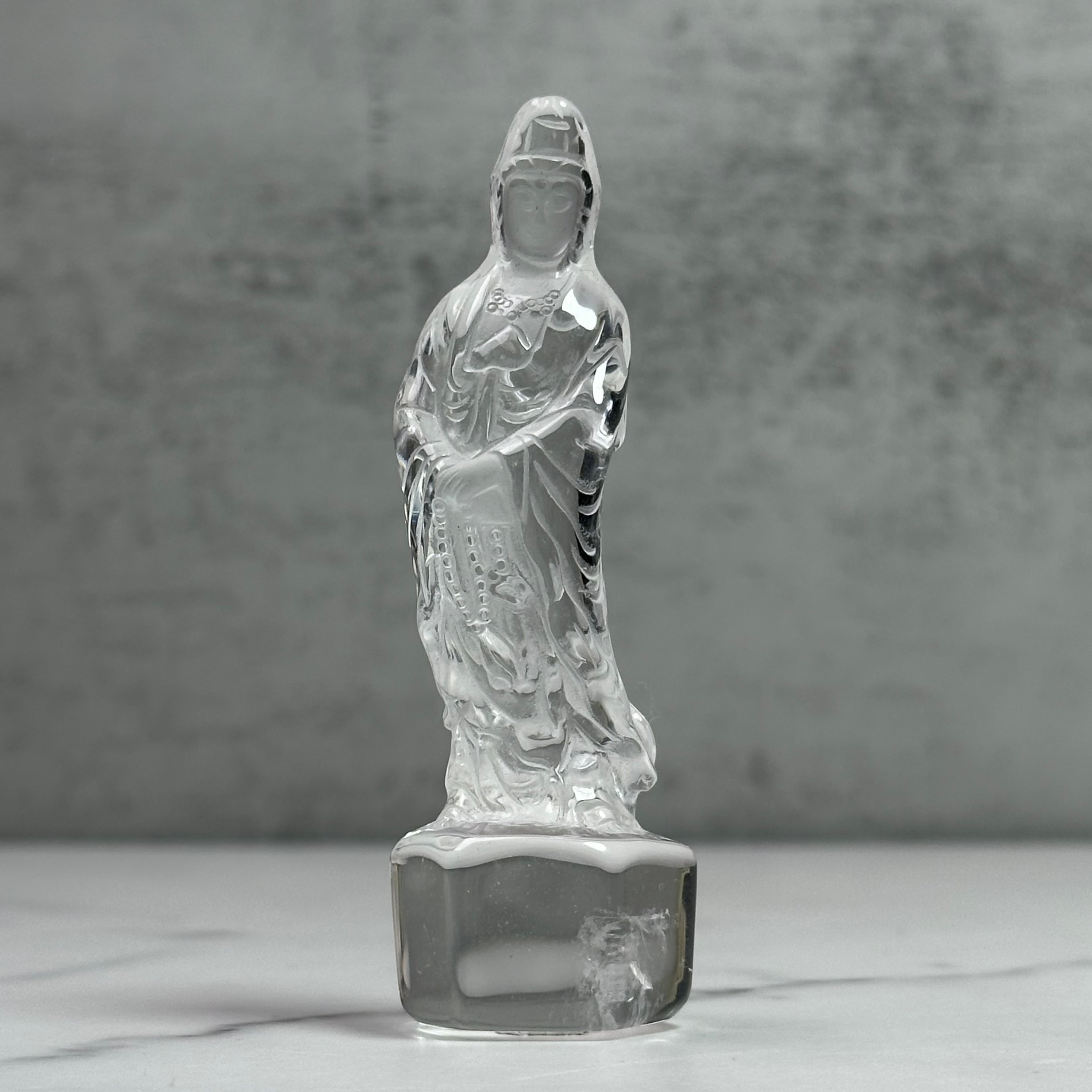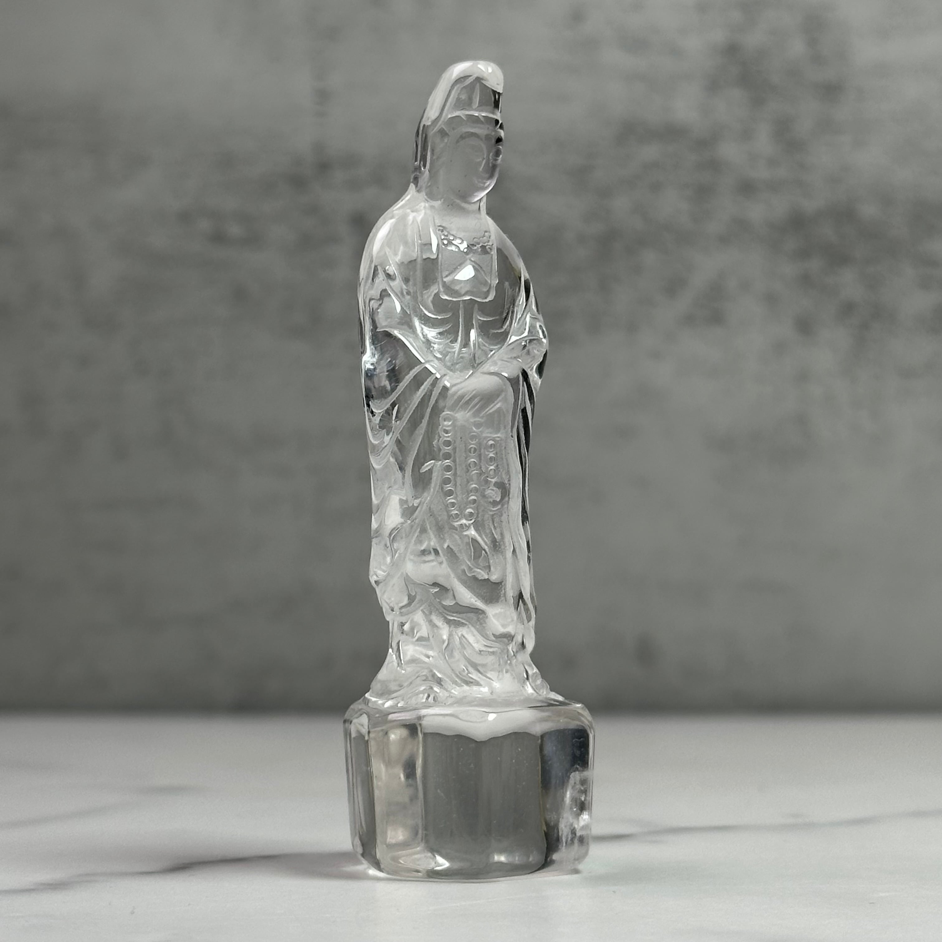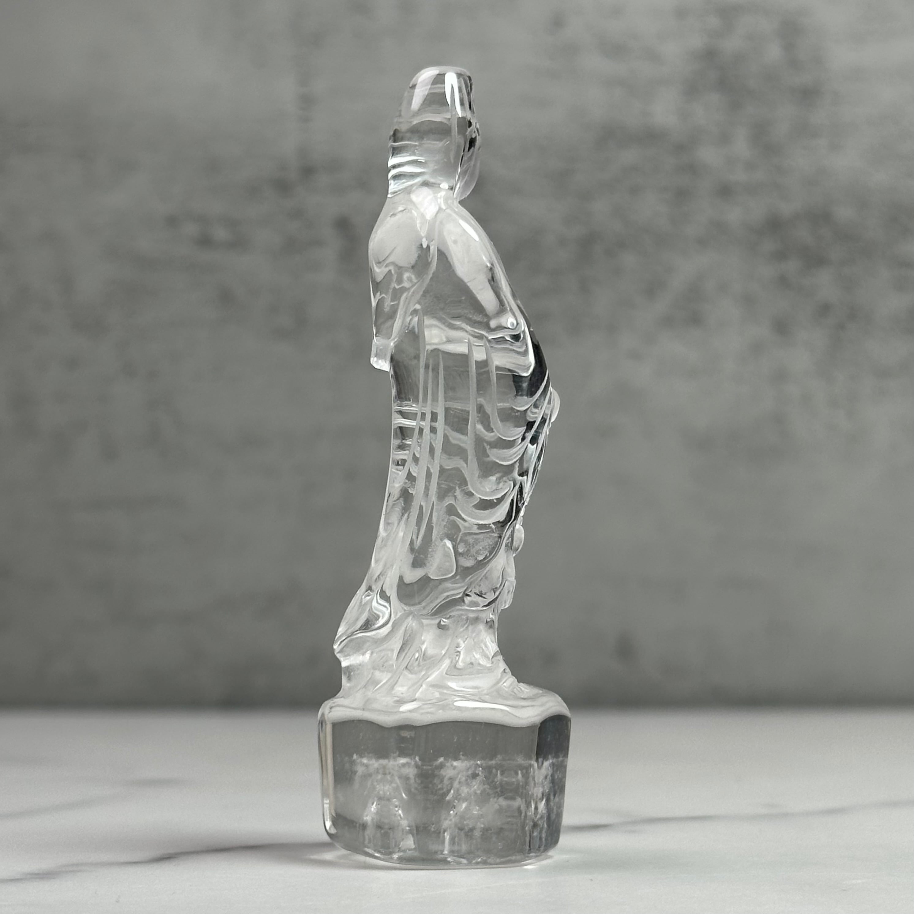 高品質で美しい水晶を丁寧に彫刻した観音様。やわらかな表情と繊細な彫りが、静かで穏やかな存在感を放ちます。自然の光をやさしく受け止め、凛とした佇まいの中に慈悲深さを感じさせます。空間に清らかな癒しをお届けします。