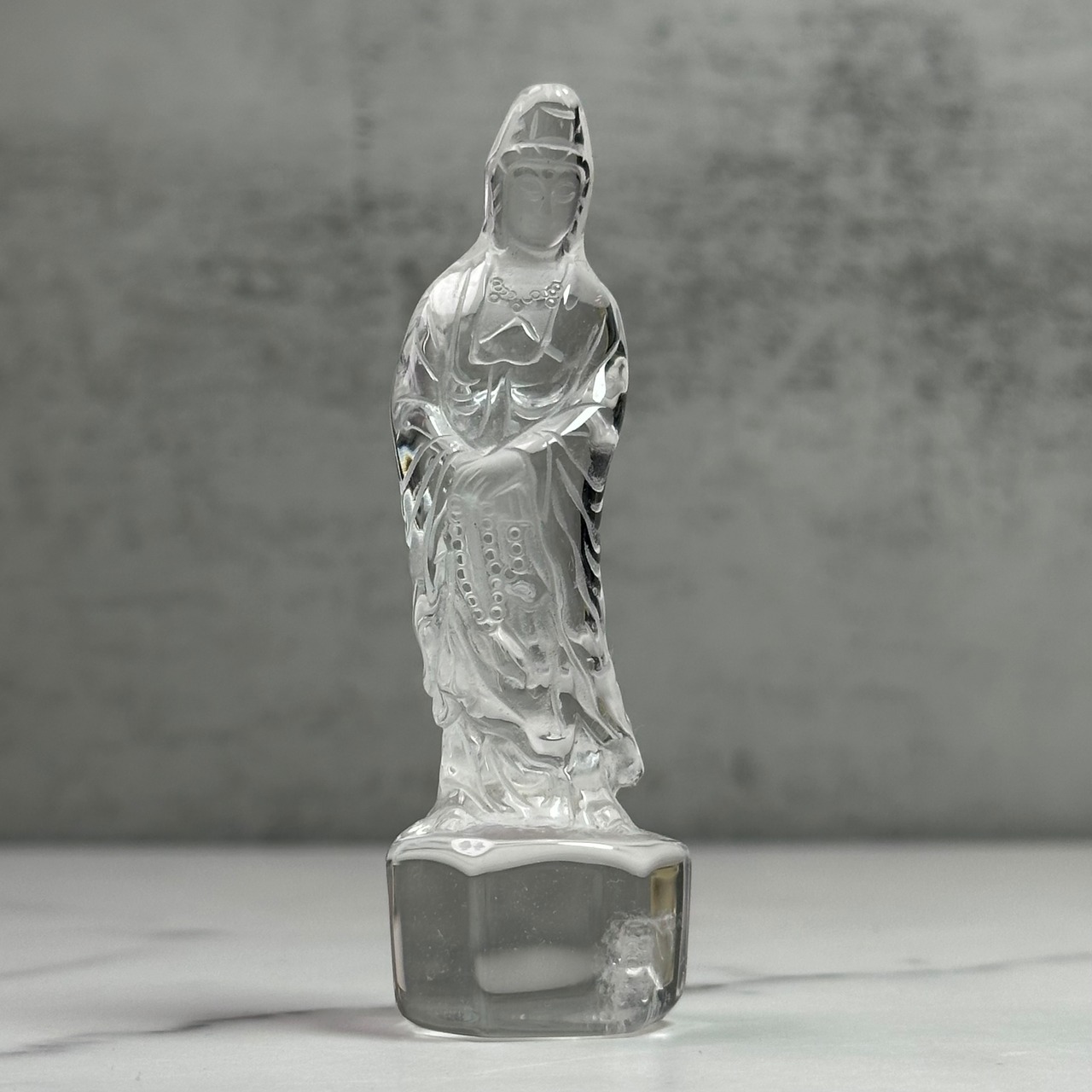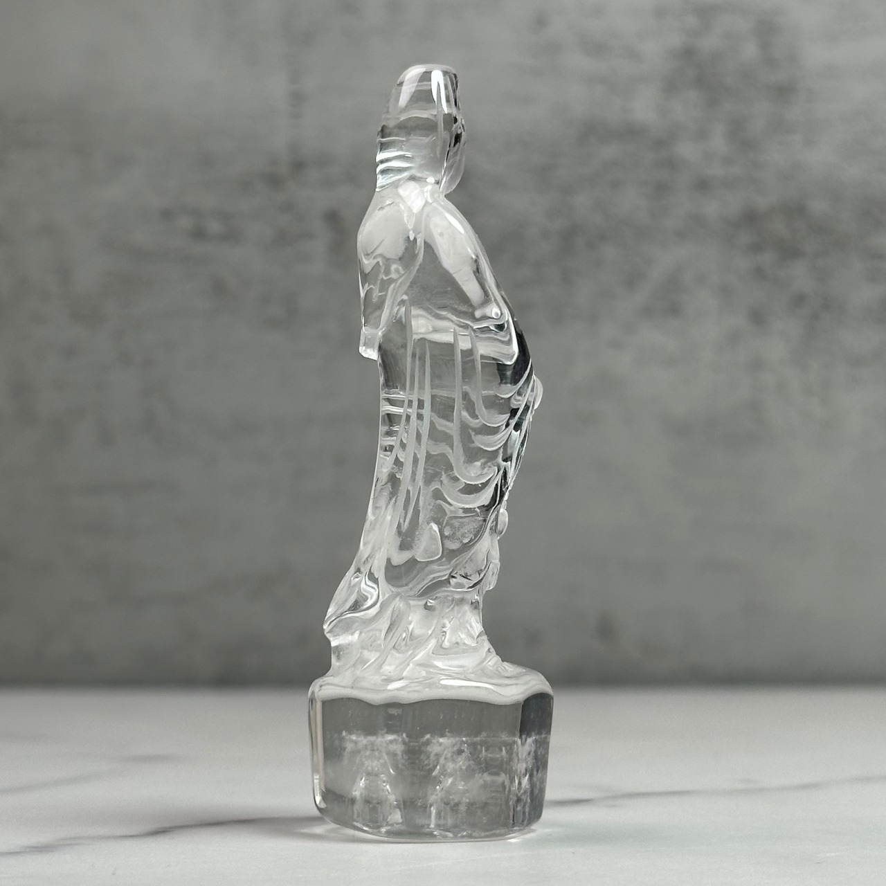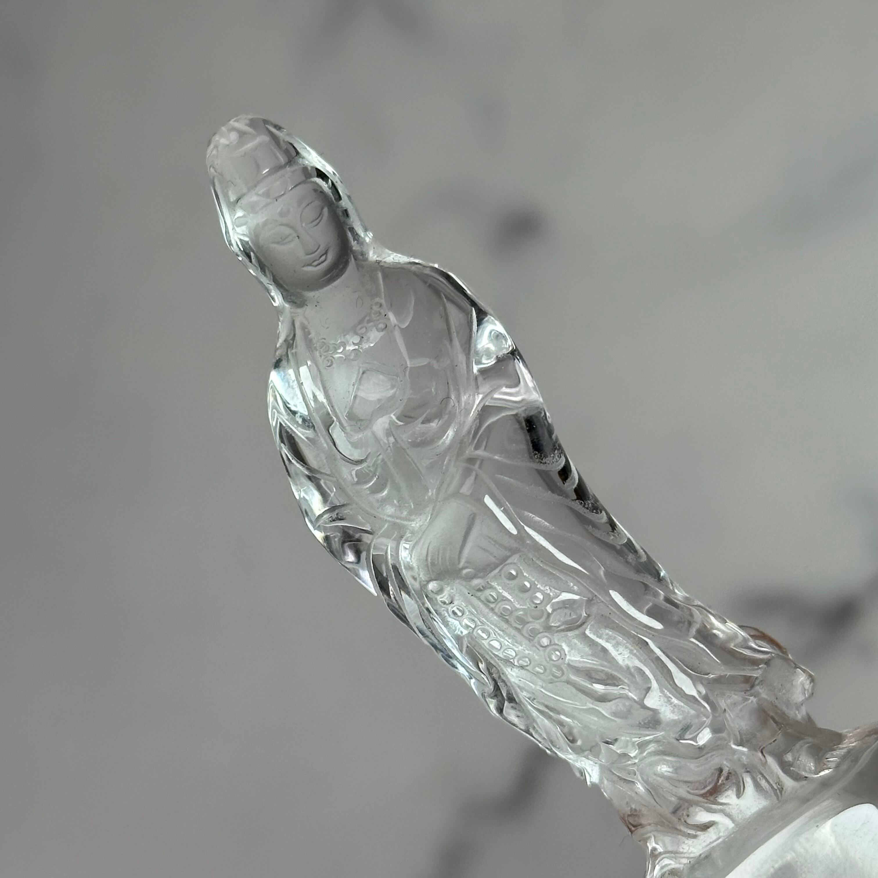 高品質で美しい水晶を丁寧に彫刻した観音様。やわらかな表情と繊細な彫りが、静かで穏やかな存在感を放ちます。自然の光をやさしく受け止め、凛とした佇まいの中に慈悲深さを感じさせます。空間に清らかな癒しをお届けします。