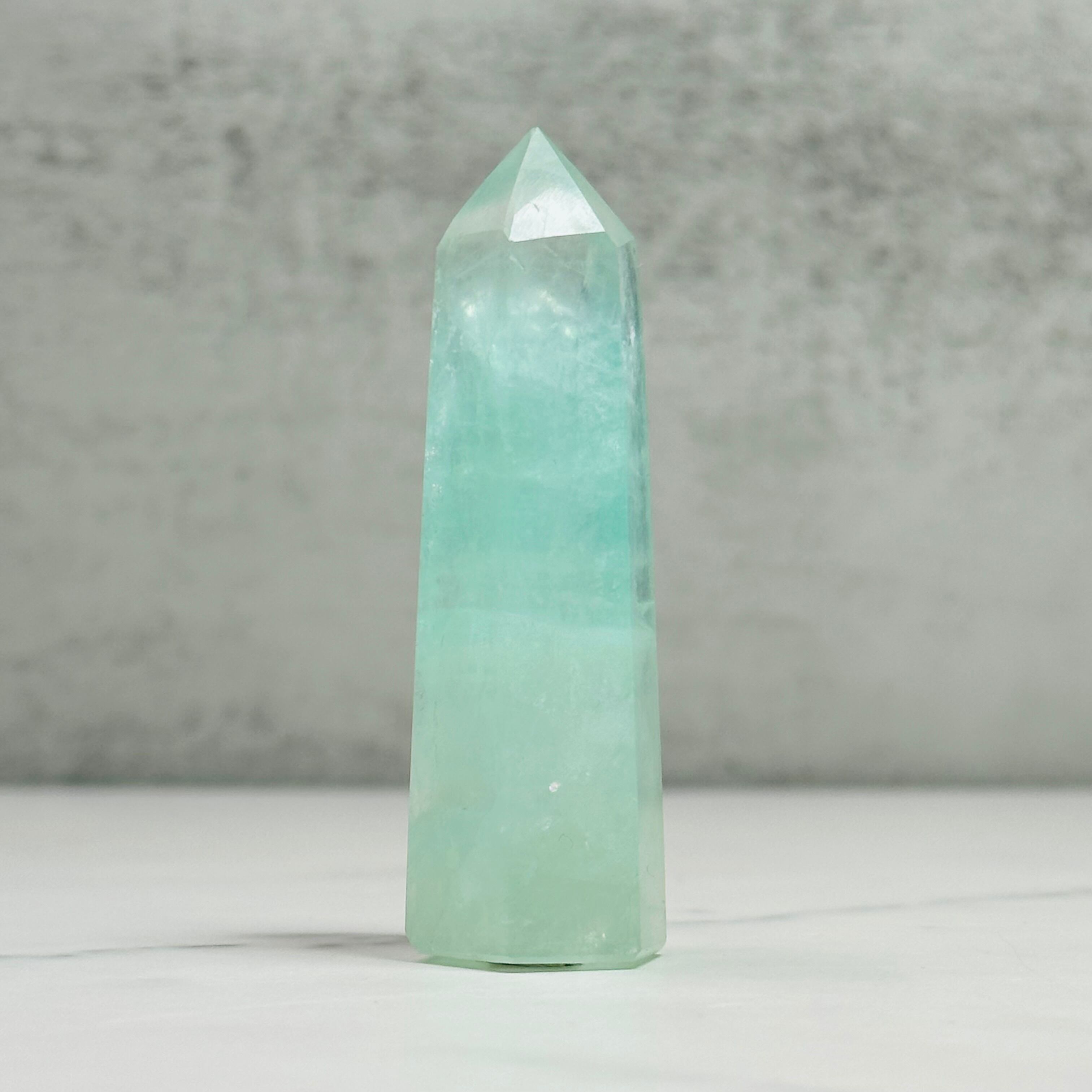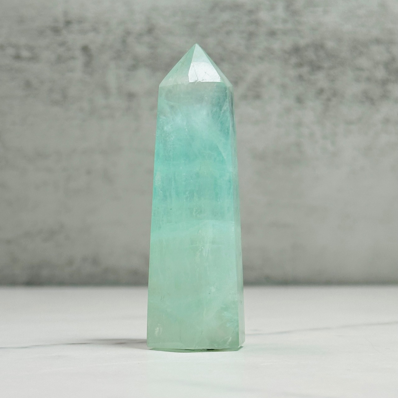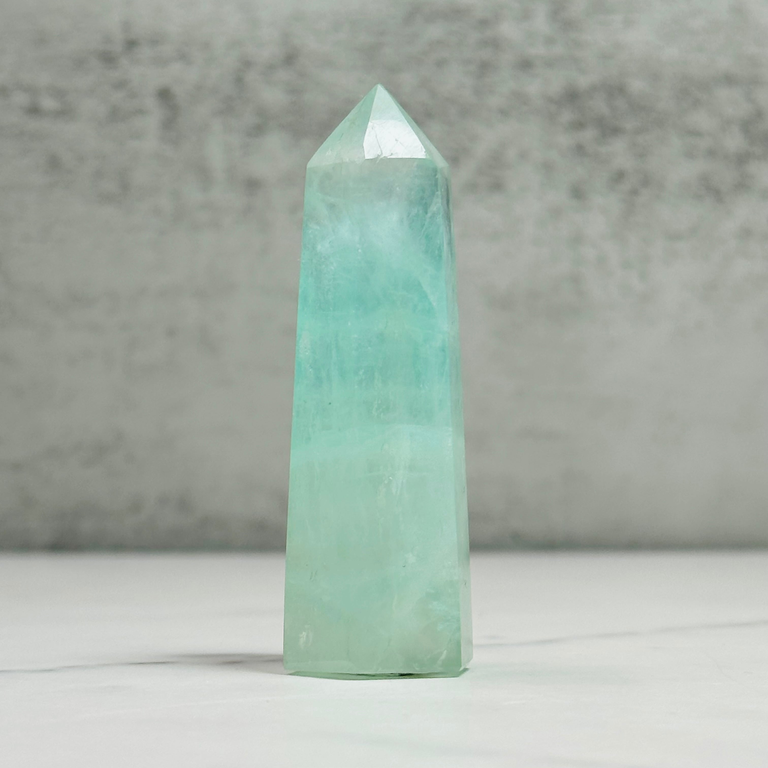 爽やかなミントグリーンが美しいフローライトタワー。透明感のある輝きと優しい色合いでお部屋に清らかな癒しの空間を演出します。思考をクリアにしてくれる石で、特にお仕事スペース、デスク周りにおすすめです。