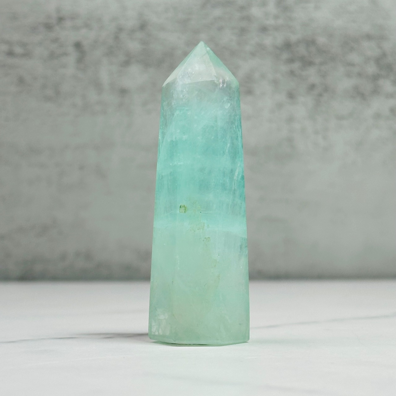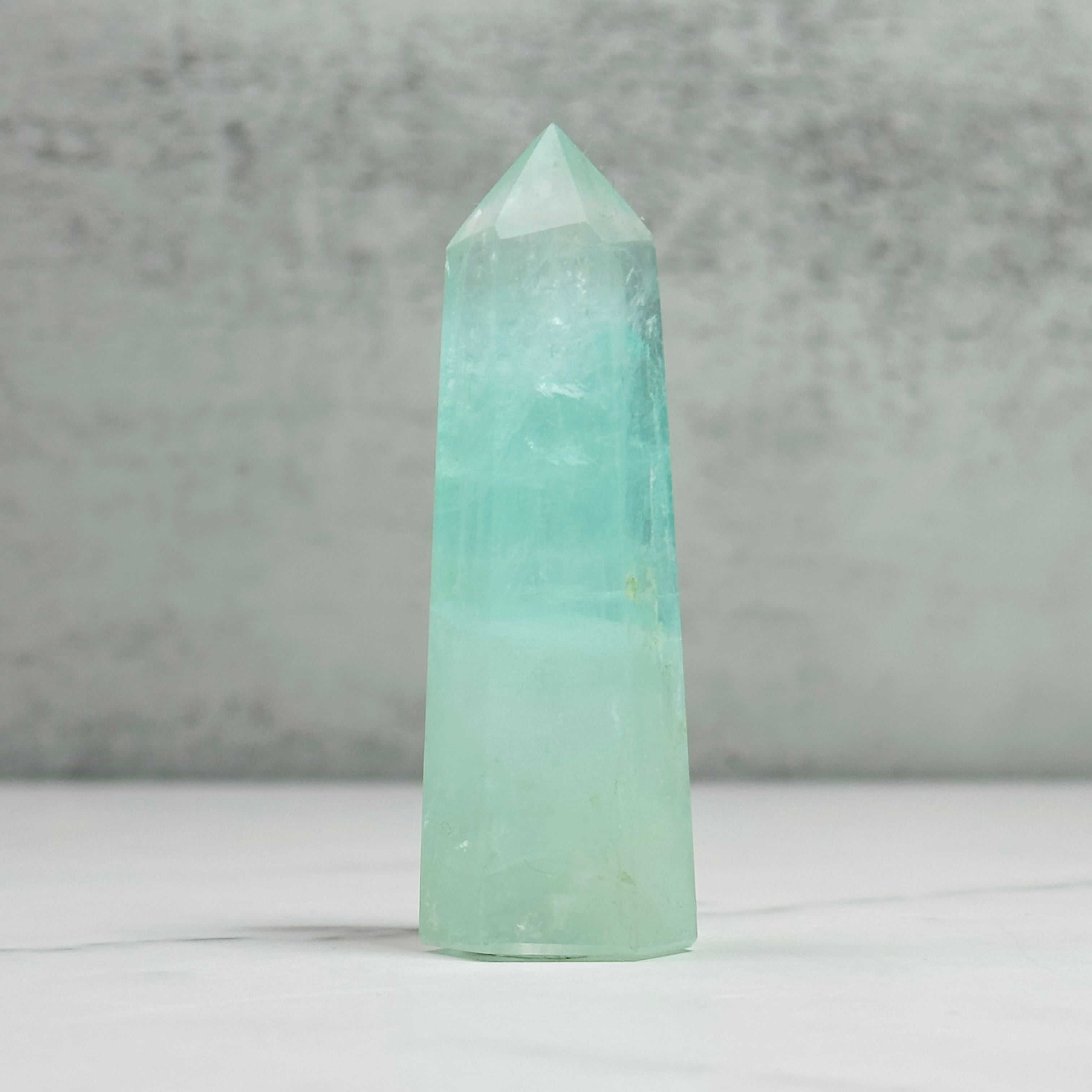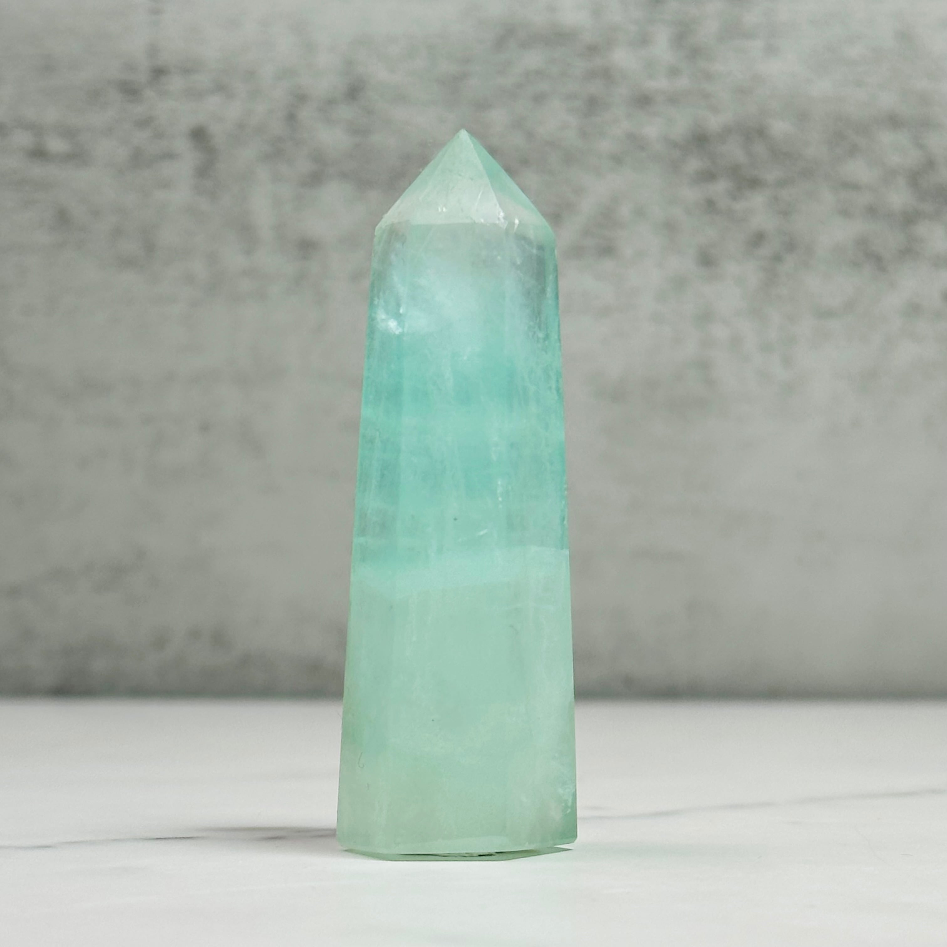 爽やかなミントグリーンが美しいフローライトタワー。透明感のある輝きと優しい色合いでお部屋に清らかな癒しの空間を演出します。思考をクリアにしてくれる石で、特にお仕事スペース、デスク周りにおすすめです。