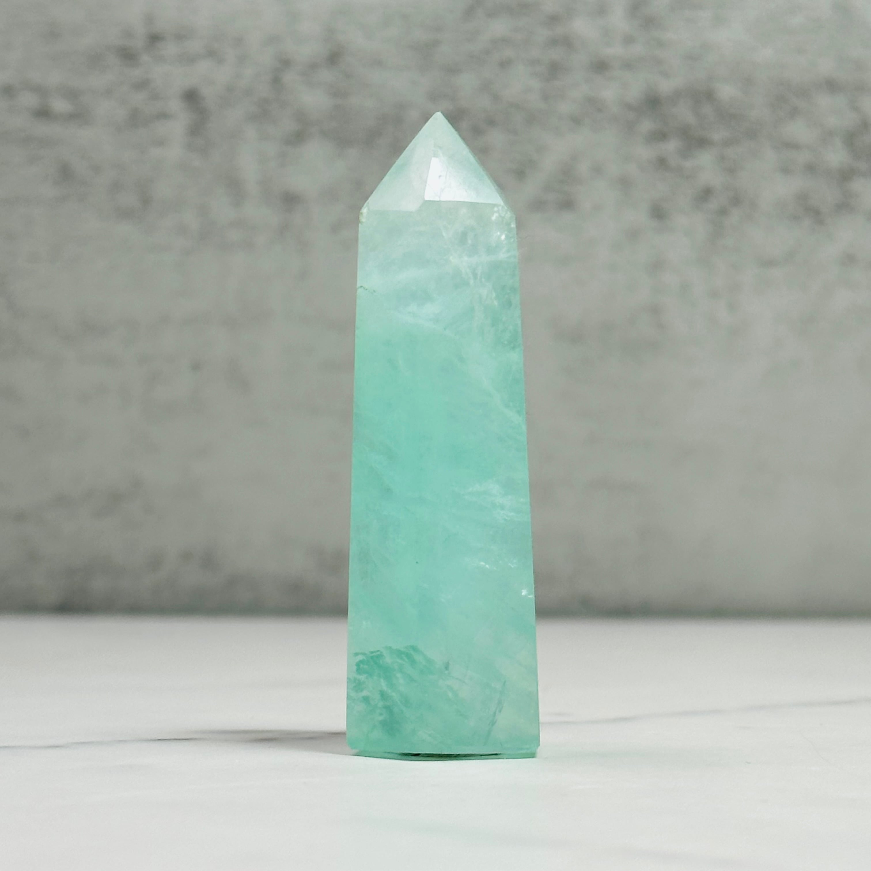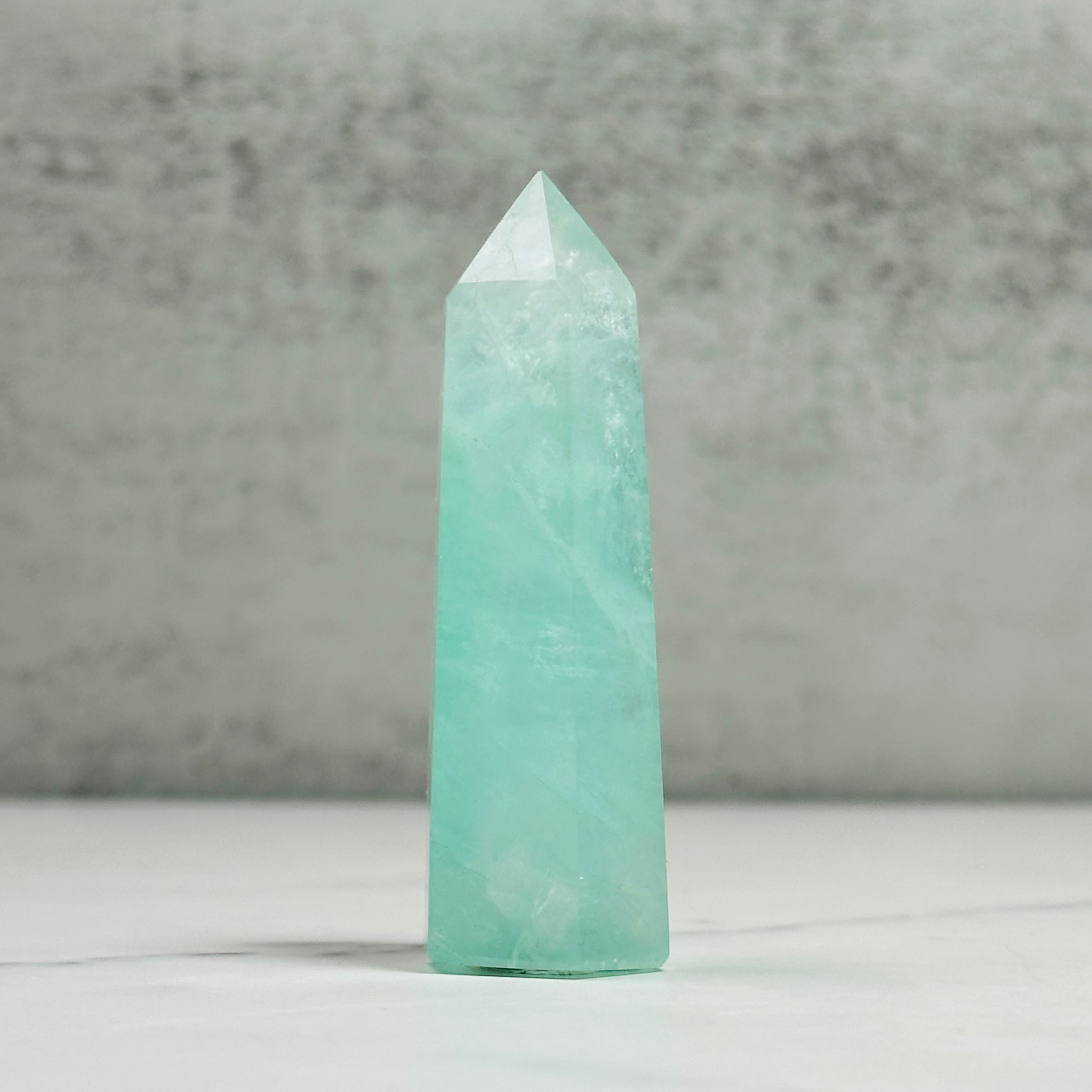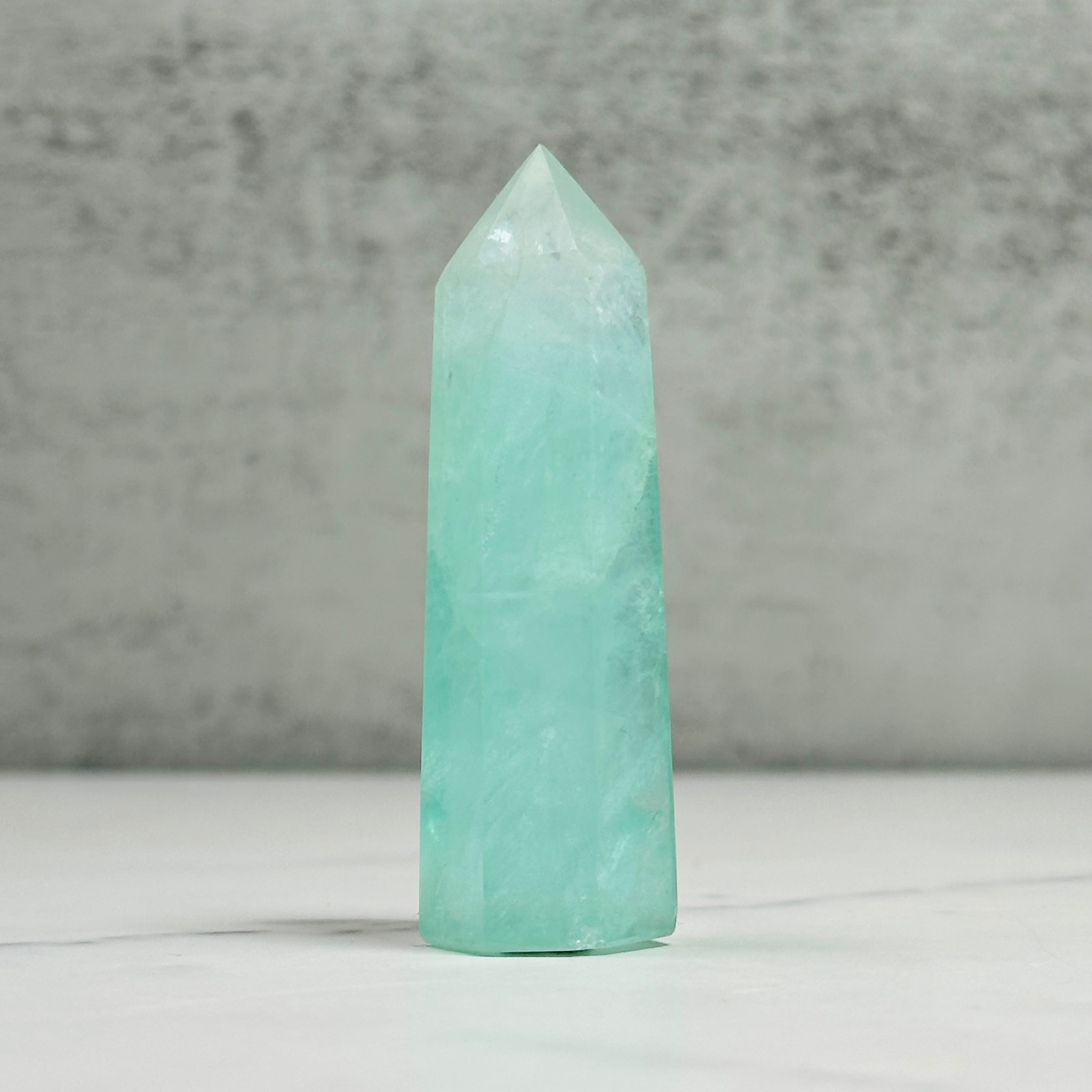爽やかなミントグリーンが美しいフローライトタワー。透明感のある輝きと優しい色合いでお部屋に清らかな癒しの空間を演出します。思考をクリアにしてくれる石で、特にお仕事スペース、デスク周りにおすすめです。
