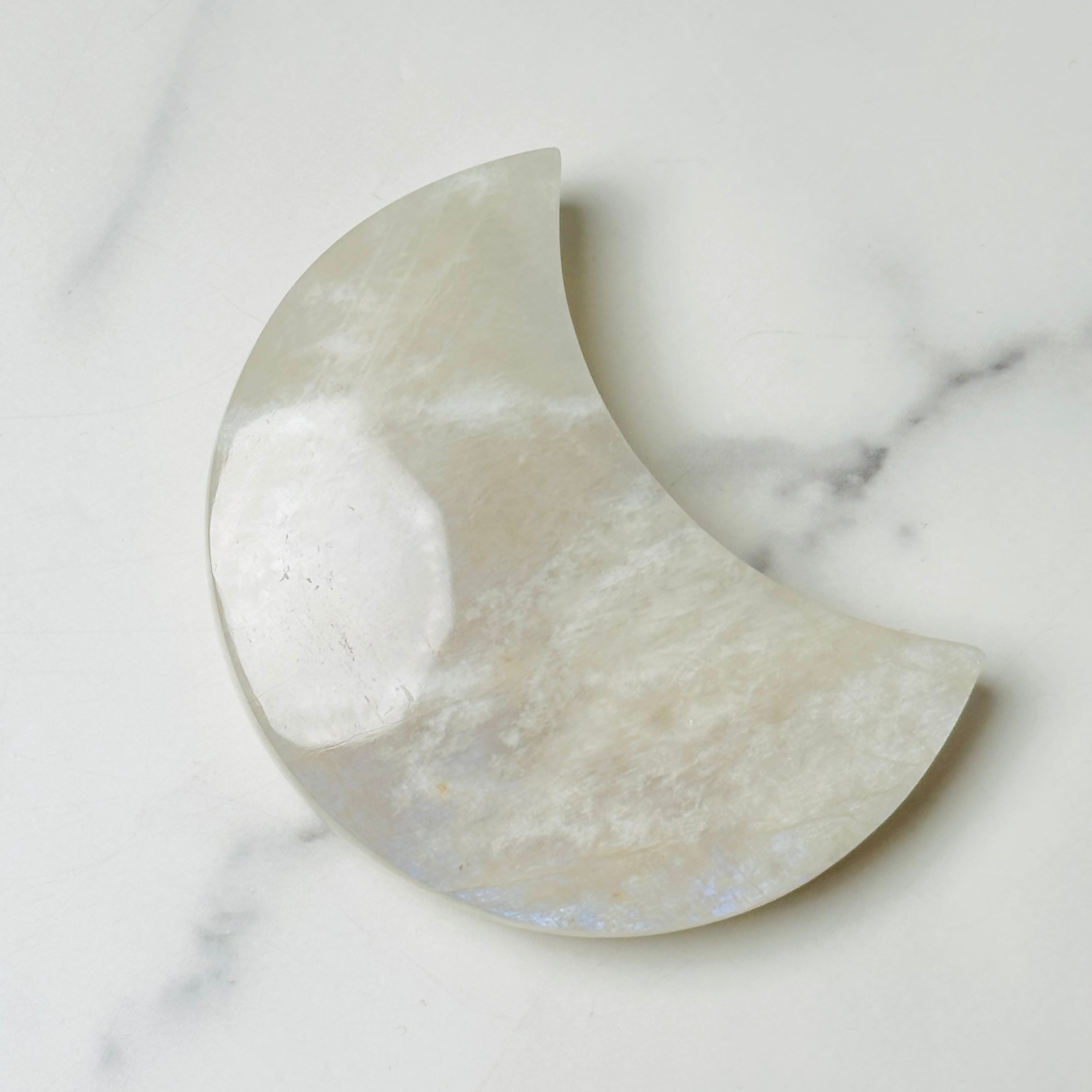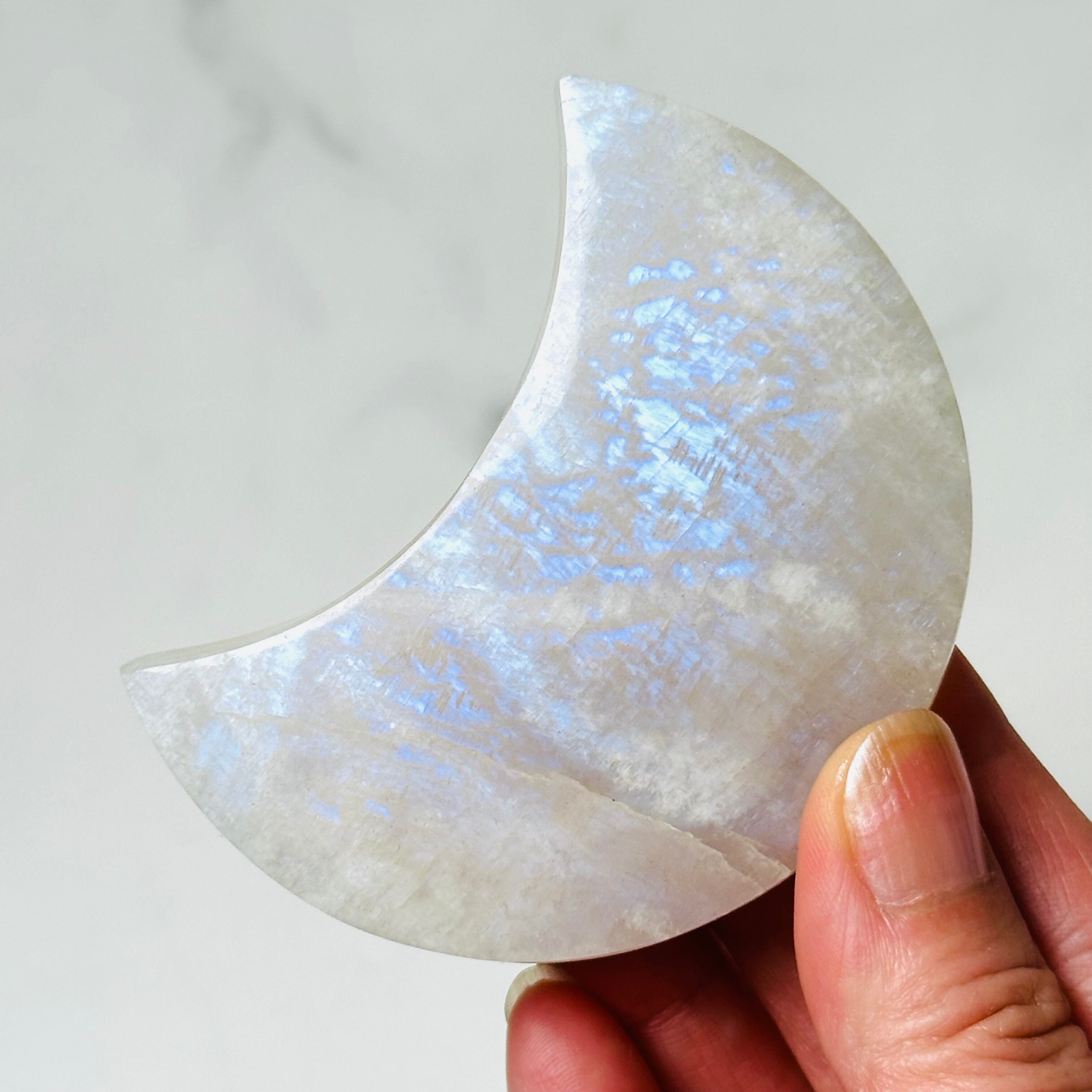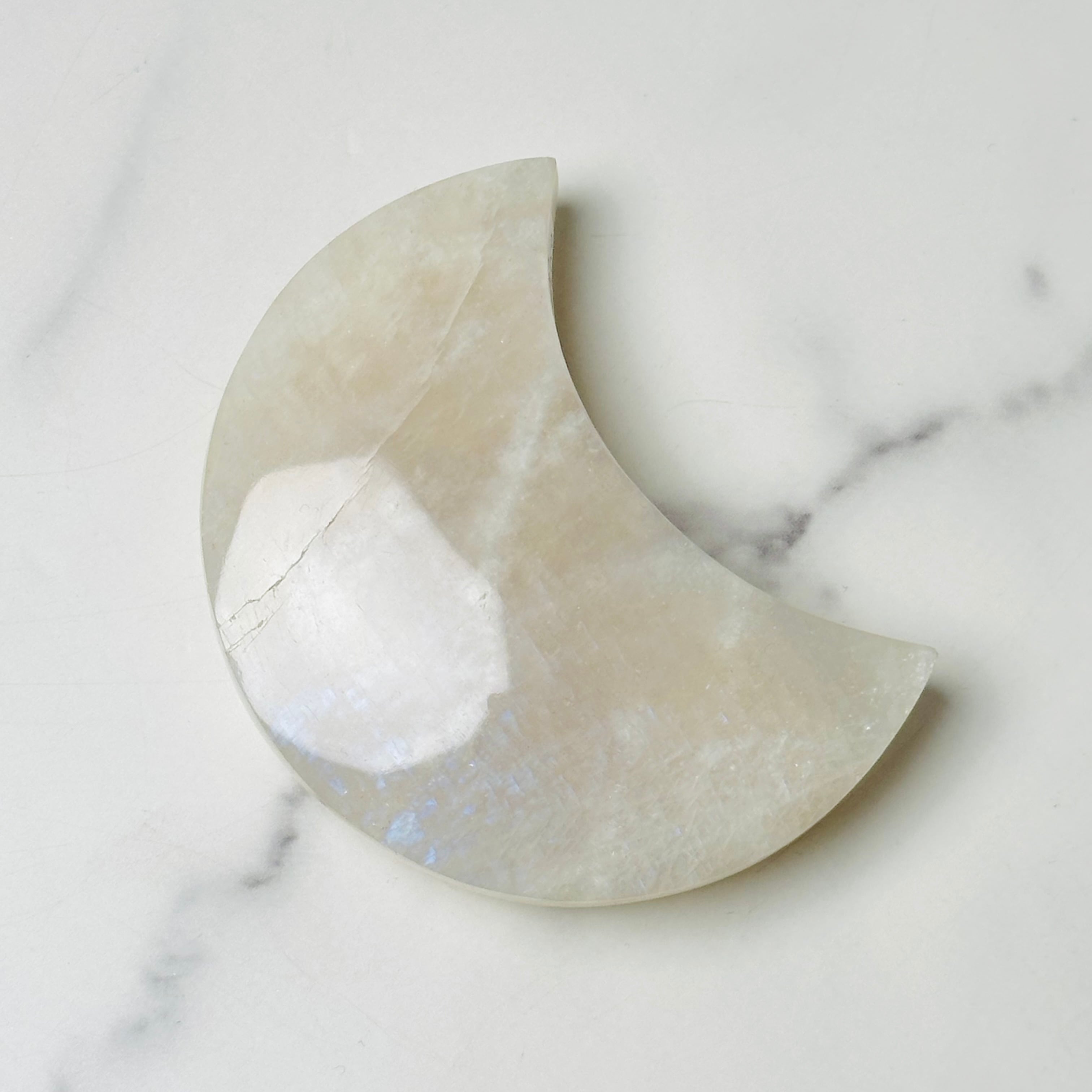 柔らかな乳白色の優しい輝きと、光の角度によって現れるシラーが美しいムーンストーンの月形ストーン。お昼は優しく空間を照らし、夜は神秘的な雰囲気でお部屋を包み込みます。月の光のような美しい輝きが優しい波動で癒しのひとときを与えてくれます。