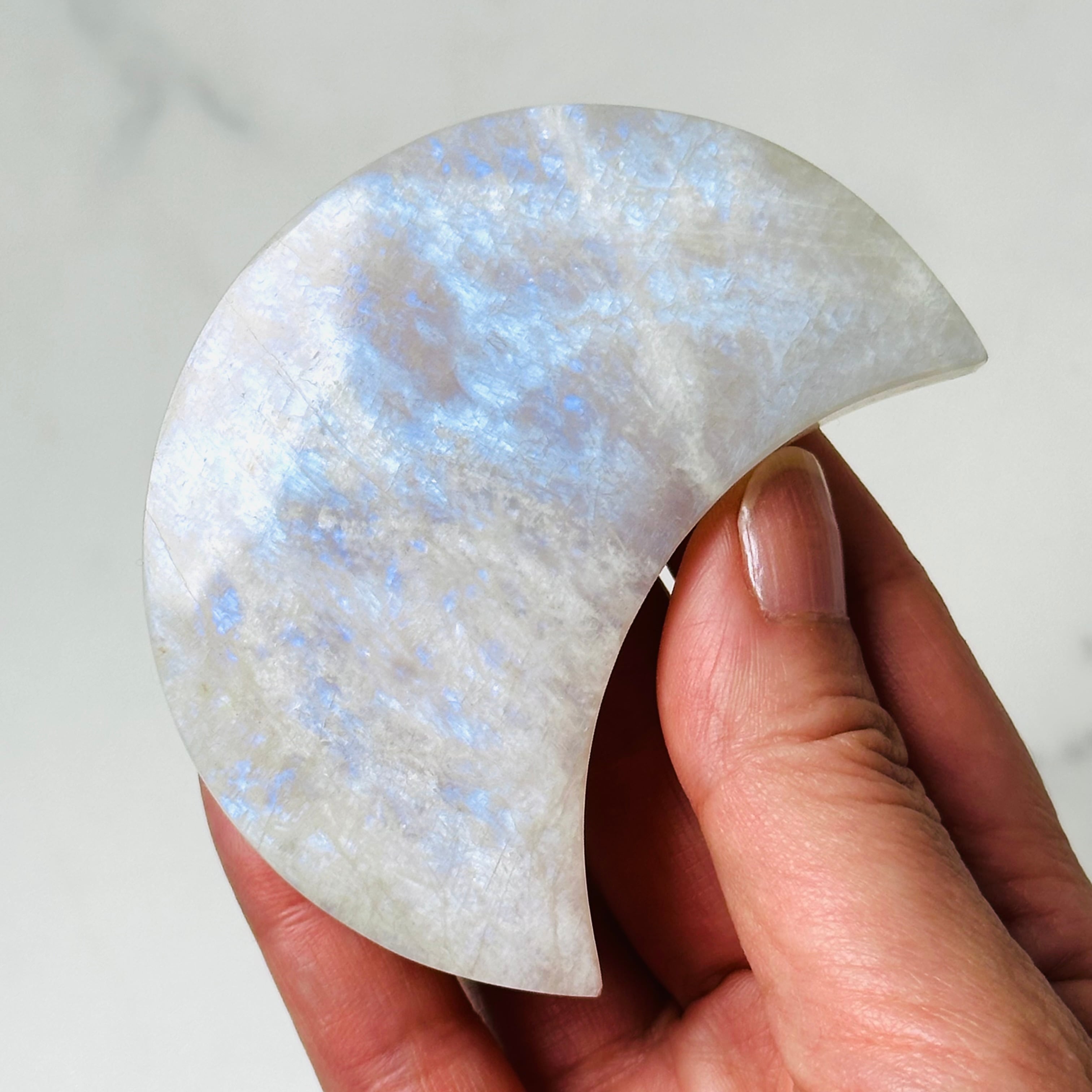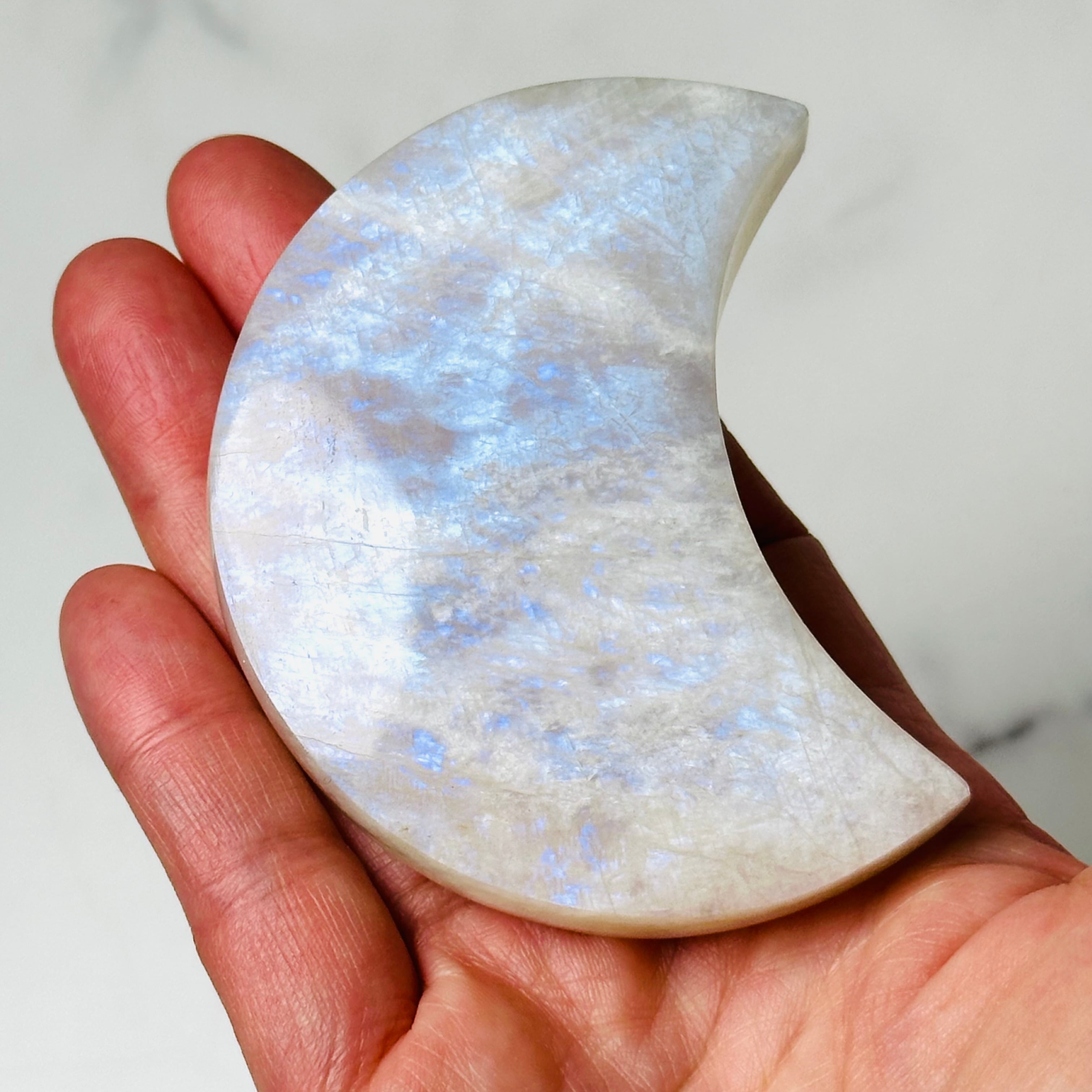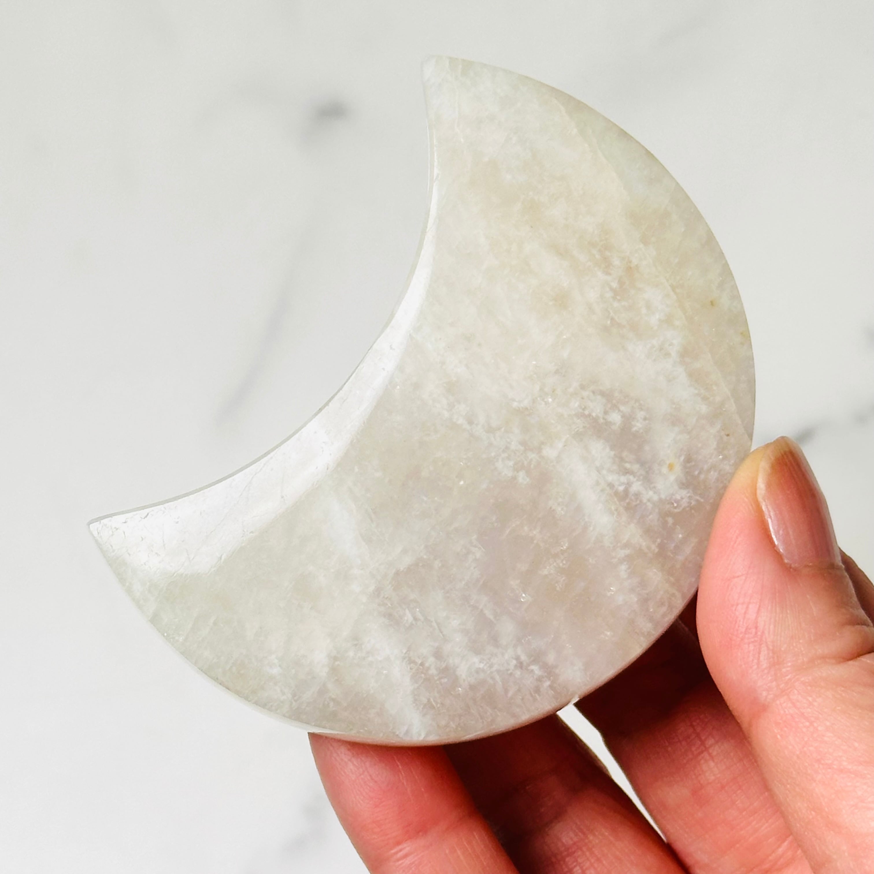 柔らかな乳白色の優しい輝きと、光の角度によって現れるシラーが美しいムーンストーンの月形ストーン。お昼は優しく空間を照らし、夜は神秘的な雰囲気でお部屋を包み込みます。月の光のような美しい輝きが優しい波動で癒しのひとときを与えてくれます。