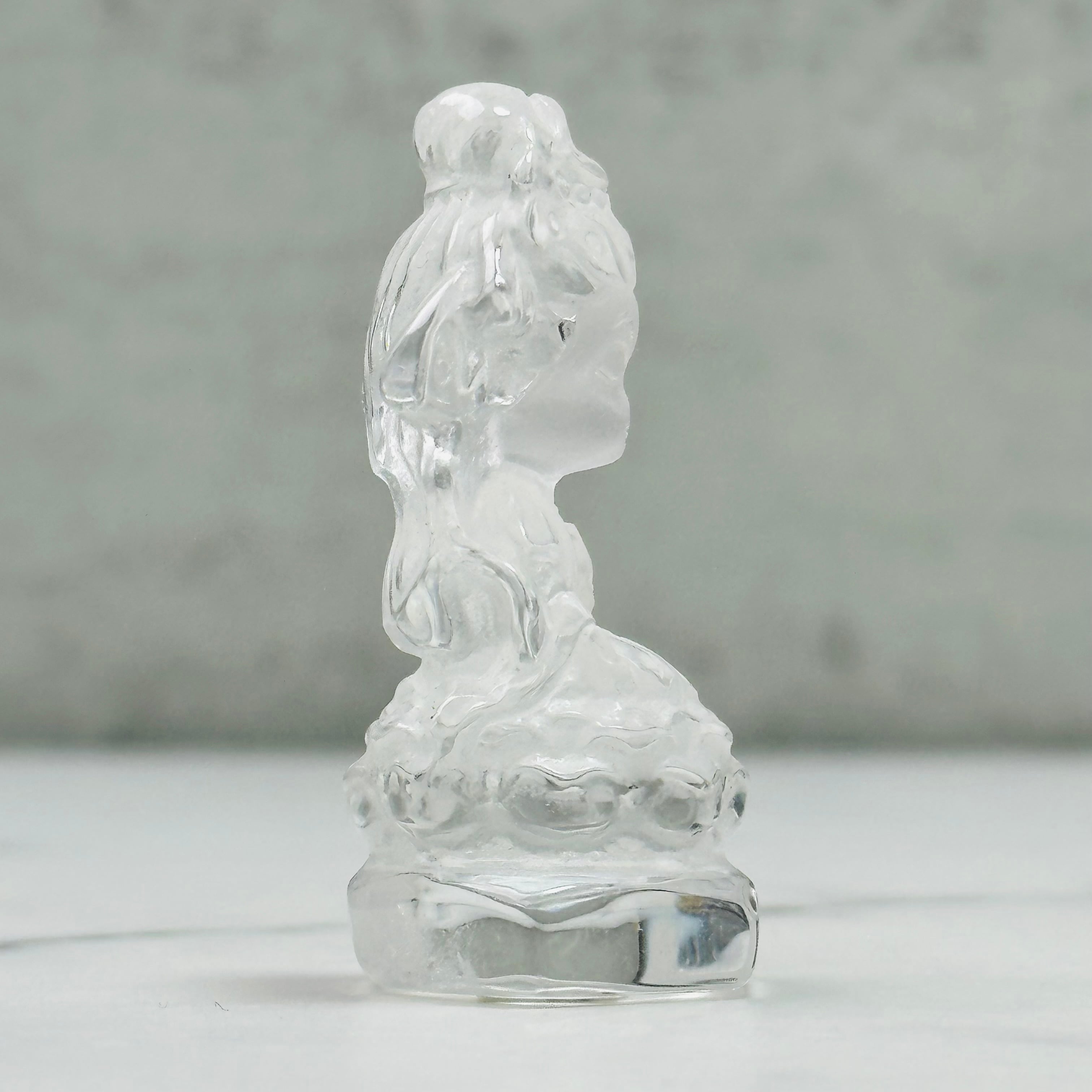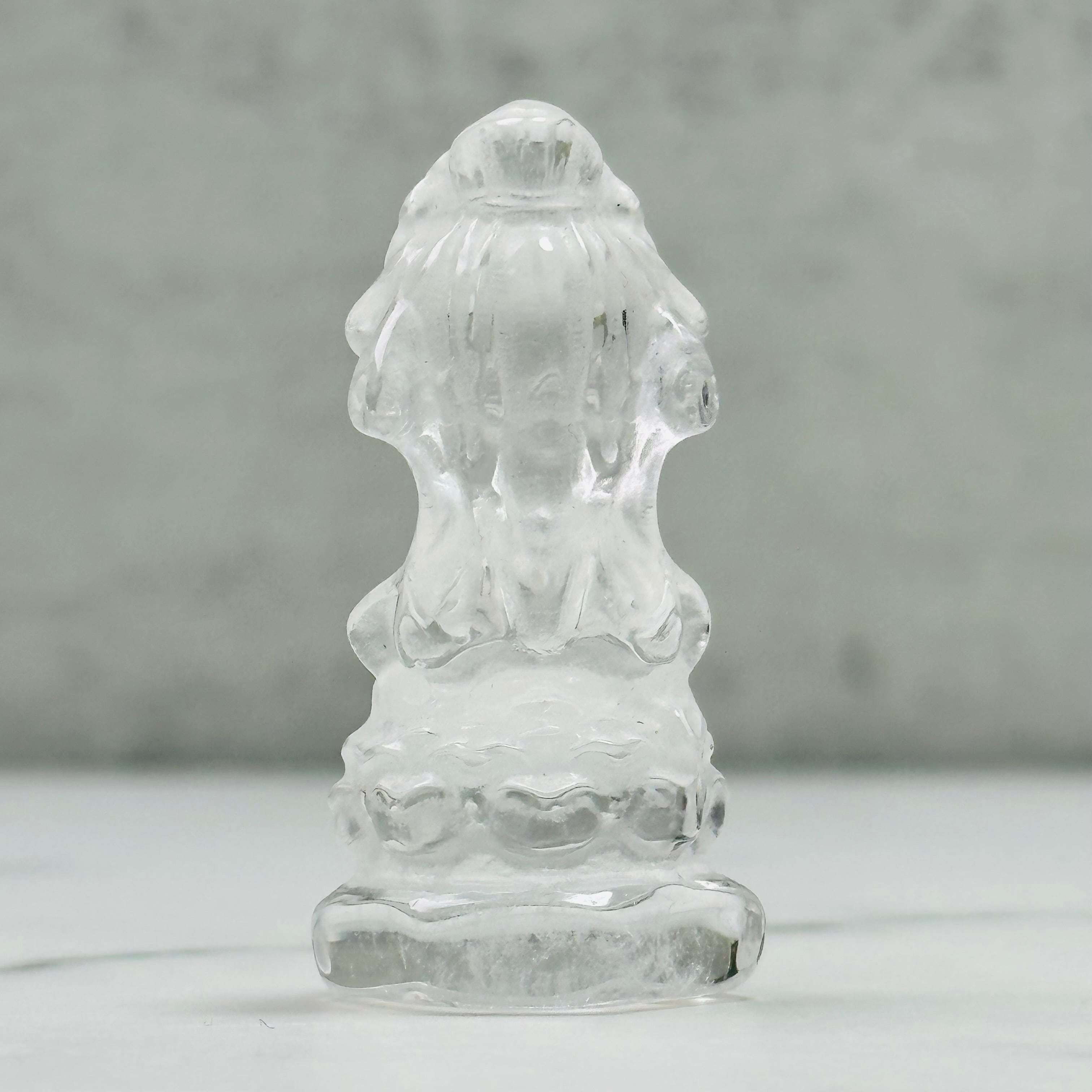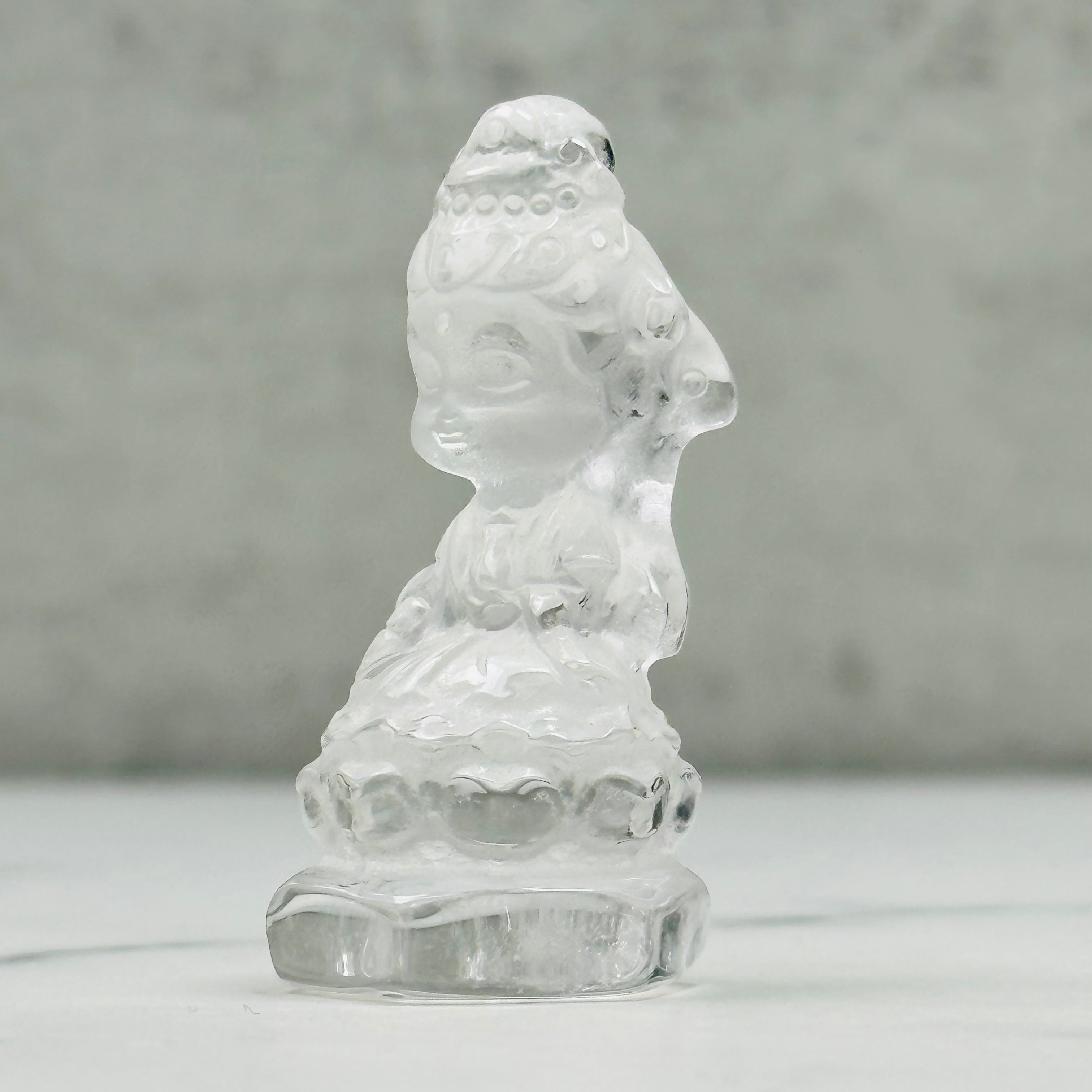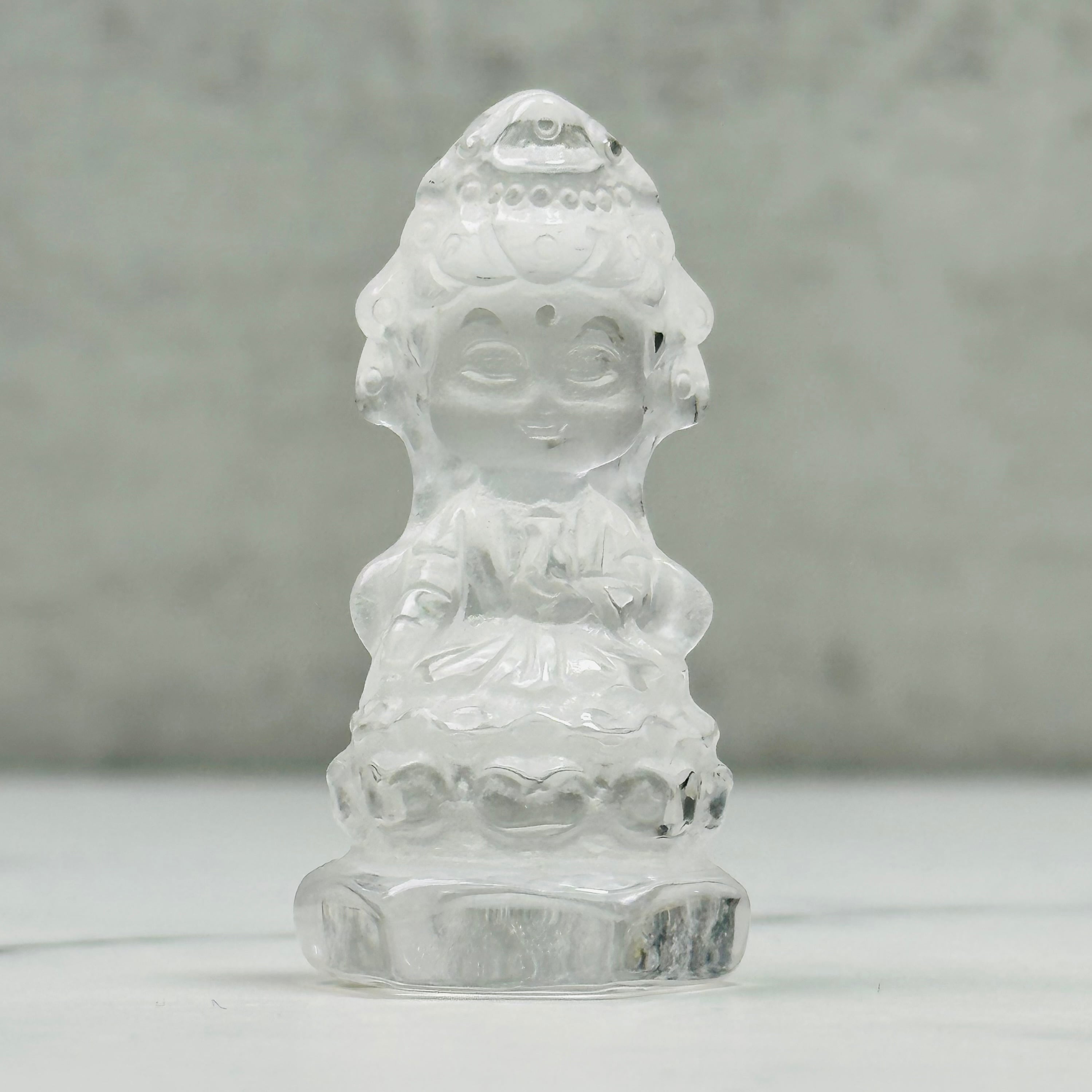 高品質で美しい水晶を丁寧に彫刻した、観音菩薩のミニ像。やわらかな微笑みと繊細な衣の彫りが、静かで穏やかな存在感を放ちます。自然の光をやさしく受け止め、凛とした佇まいの中に慈悲深さを感じさせます。空間に清らかな癒しをお届けします。