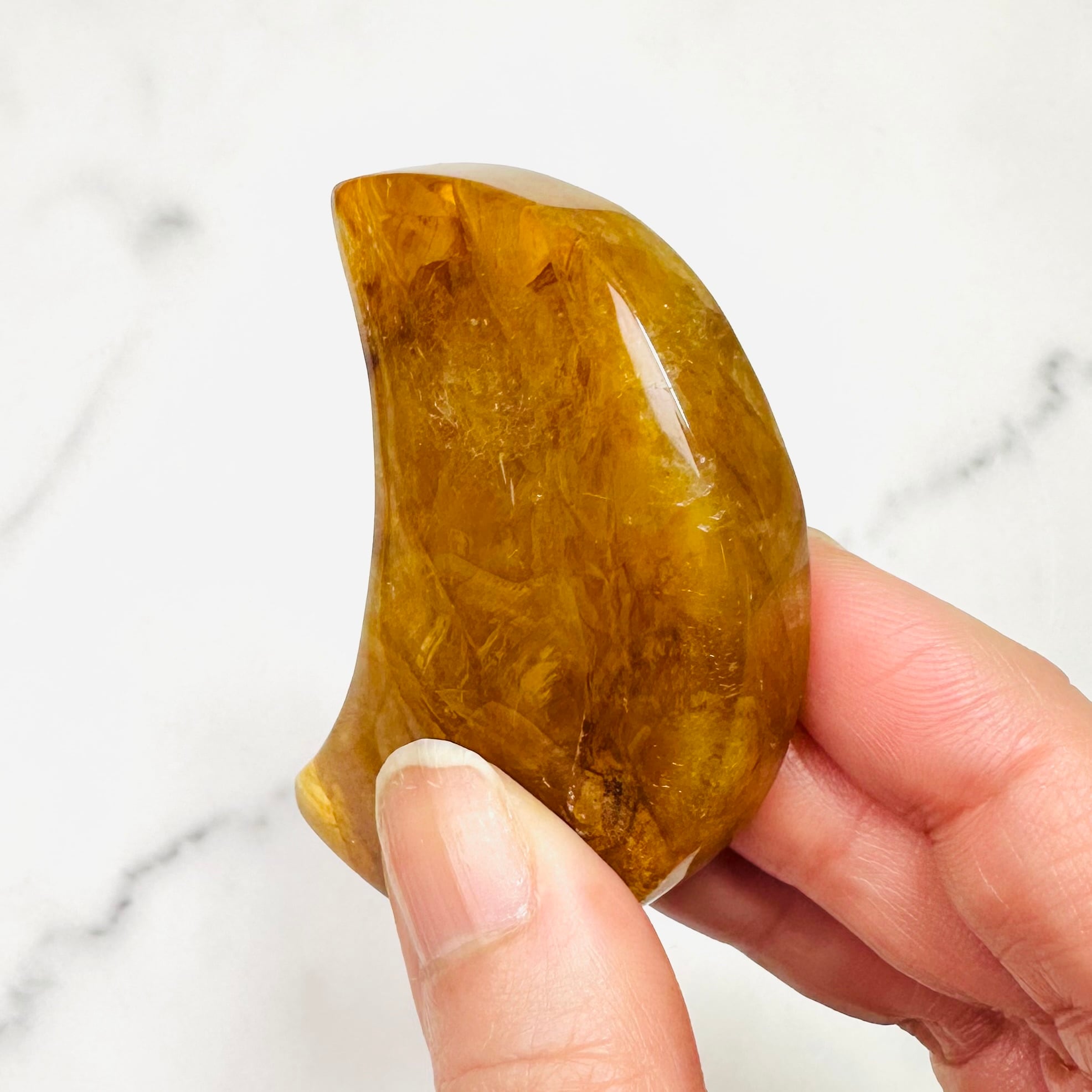 ゴールデンヒーラーは、透明な水晶の中に酸化鉄(リモナイト)が内包されることで、金色やオレンジ色を帯びた天然石です。光に透かすと内側から優しい黄金色の輝きを放ち、「癒しと再生を象徴する石」として親しまれています。
