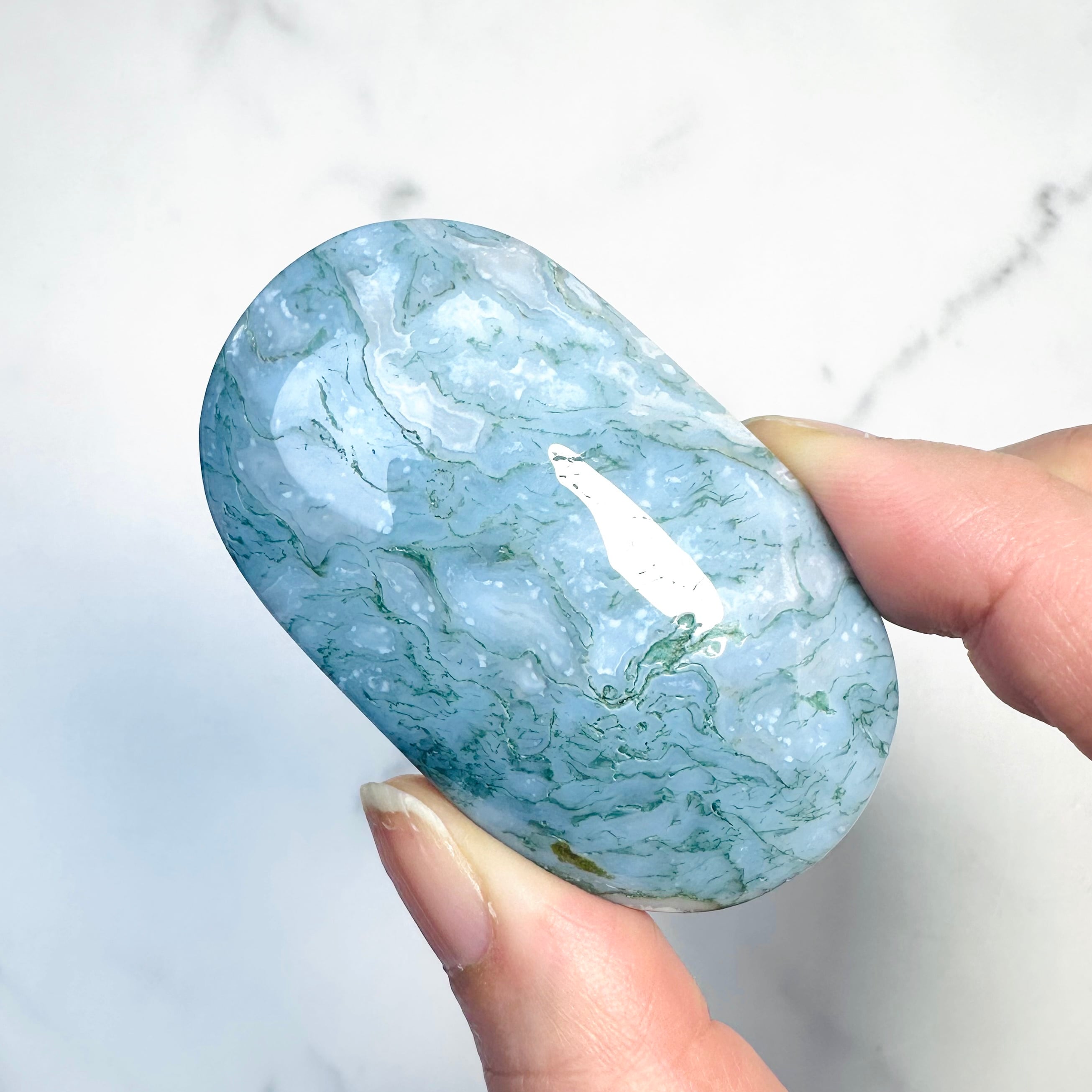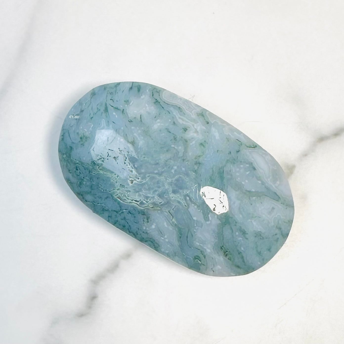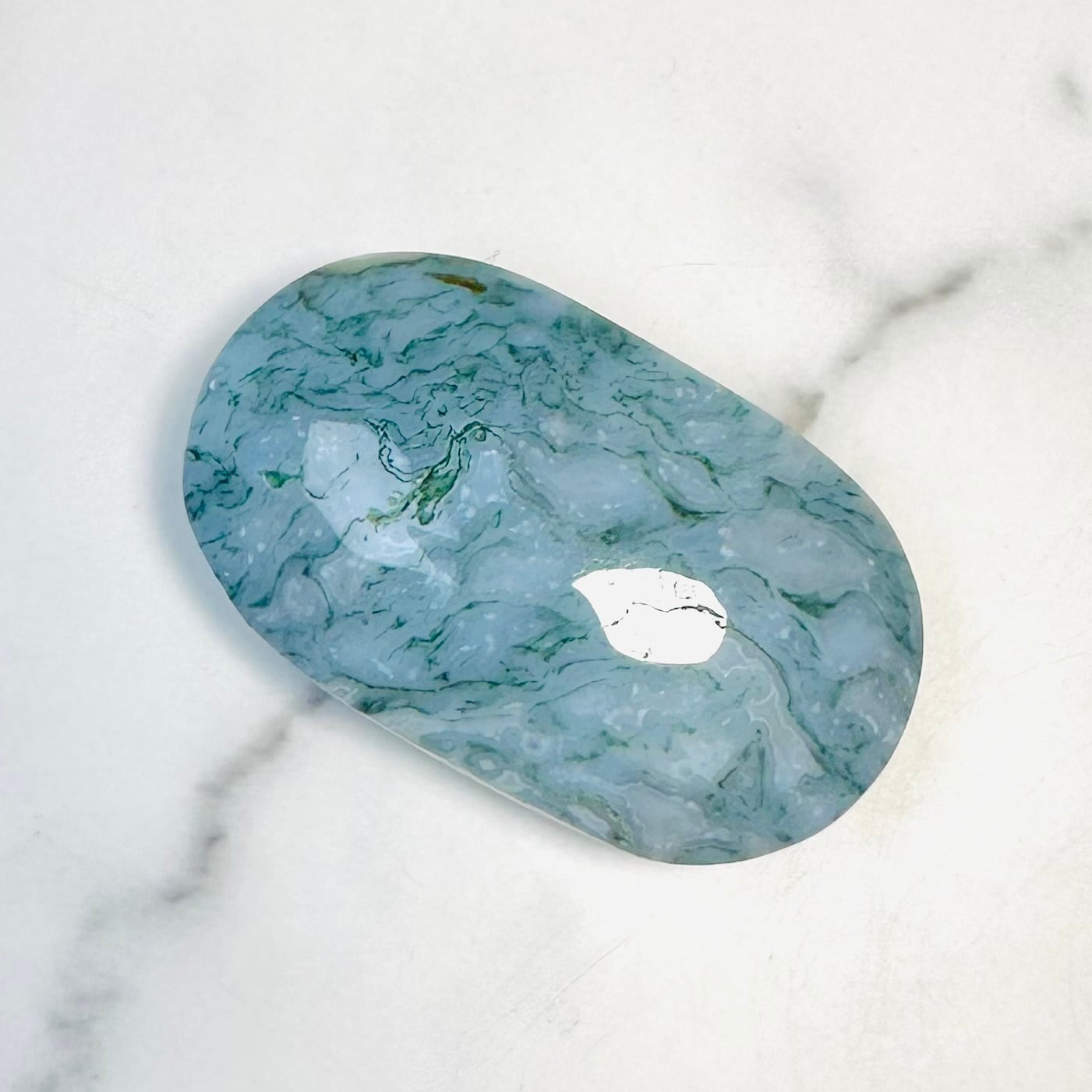乳白色とモスグリーンが混ざり合ったマーブル模様が優しい癒しを与えてくれます。お部屋に置けば森のマイナスイオンを浴びるような癒しのエネルギーを受け取り、心の回復が感じられます。