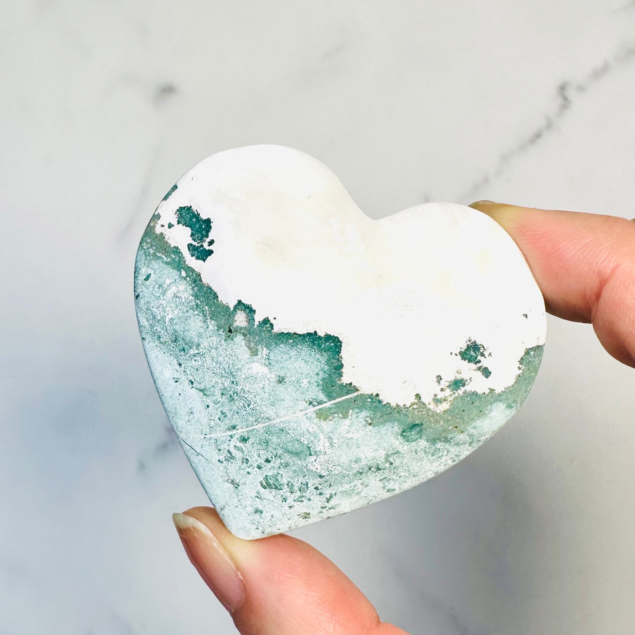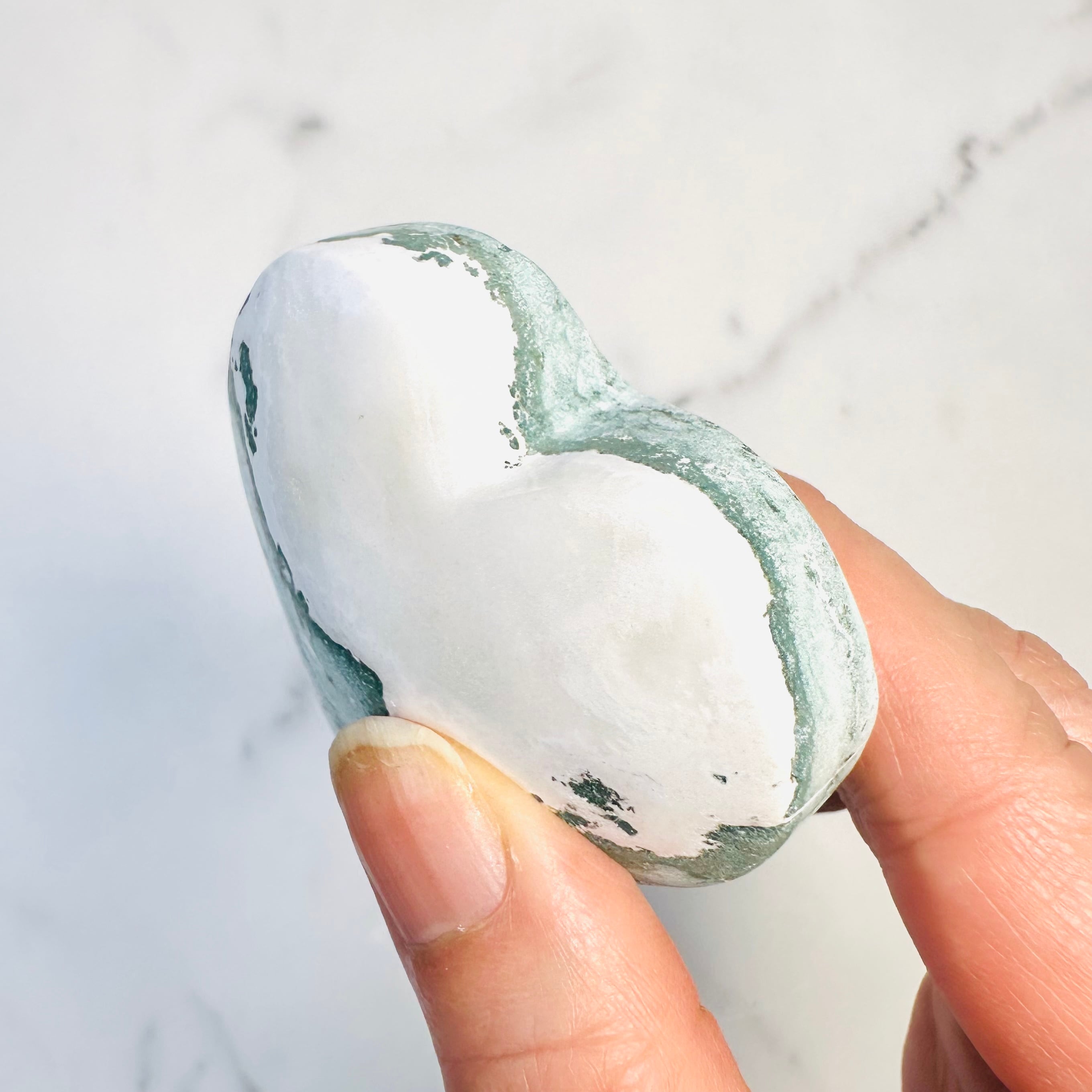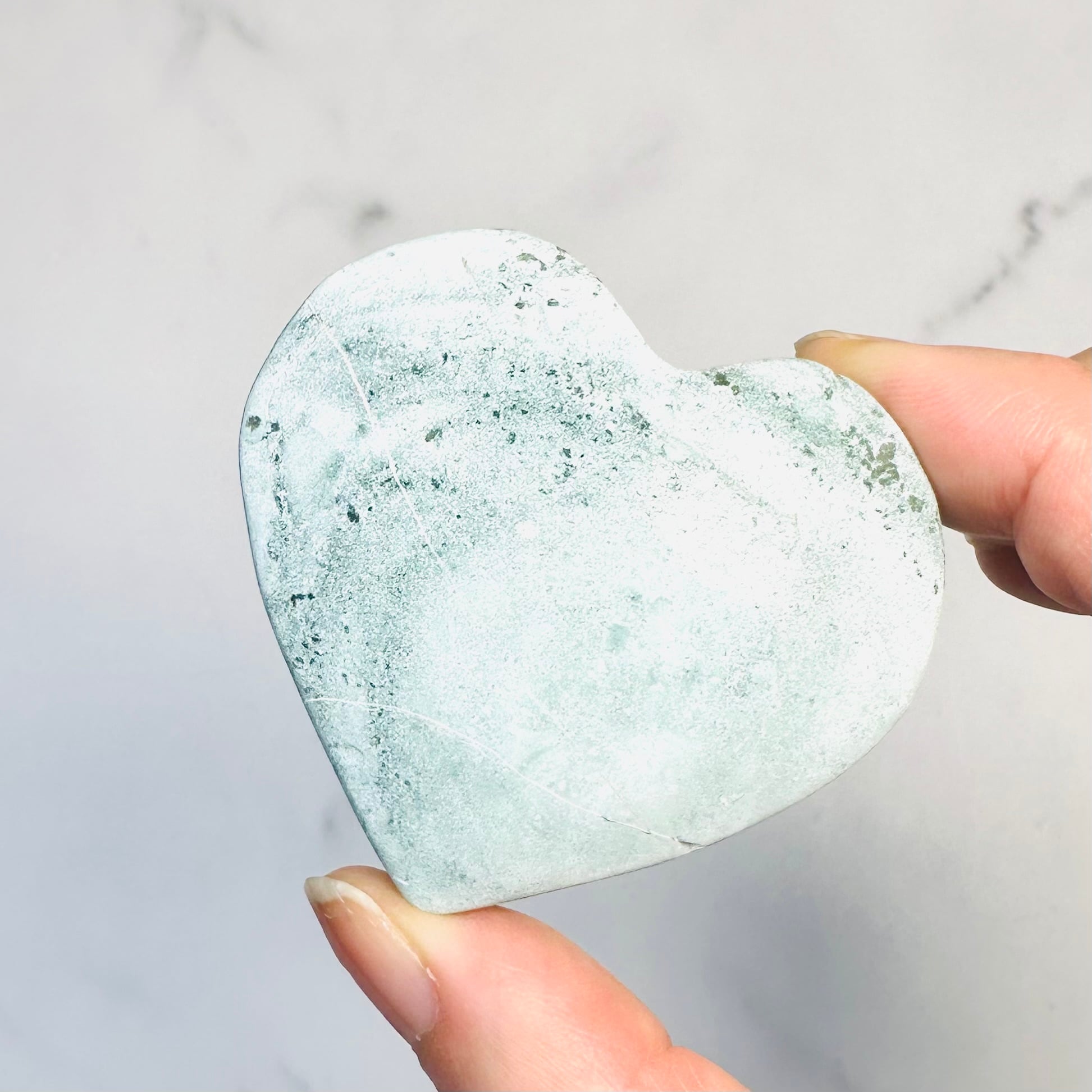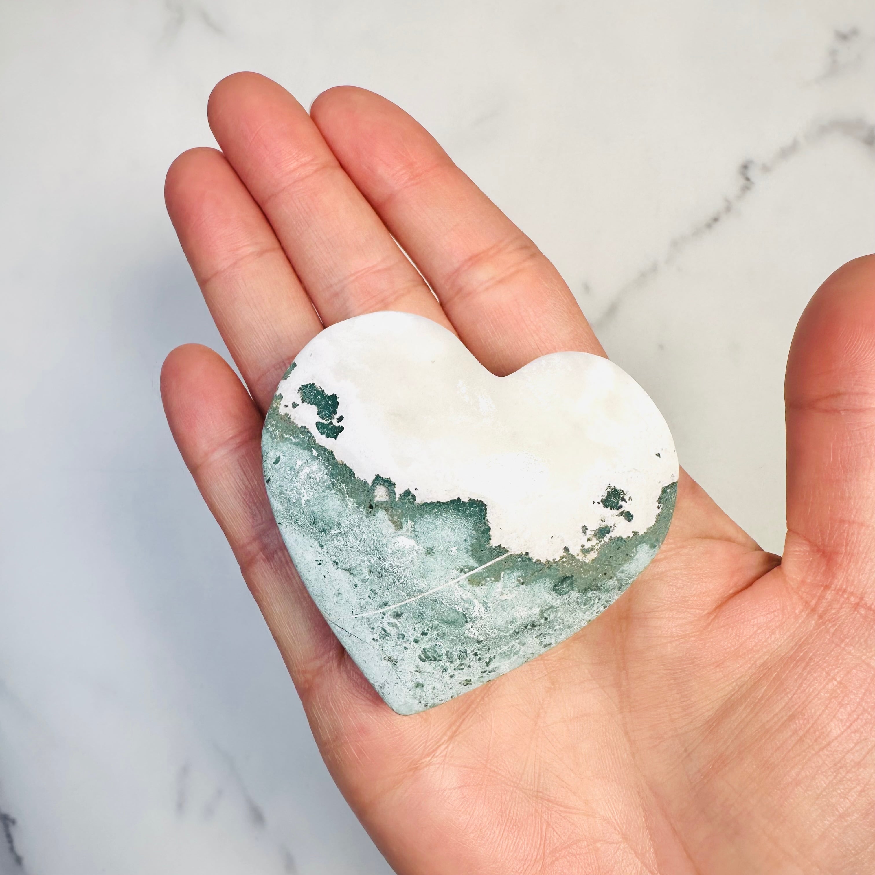 柔らかなグリーンとホワイトの模様が溶け合うように広がる、ユニコーンジャスパー。自然が描いたマーブル模様が個性豊かな表情を持つ天然石です。優しい色合いとぷっくり厚みのあるハート型がナチュラルで上品な印象を与えてくれます。