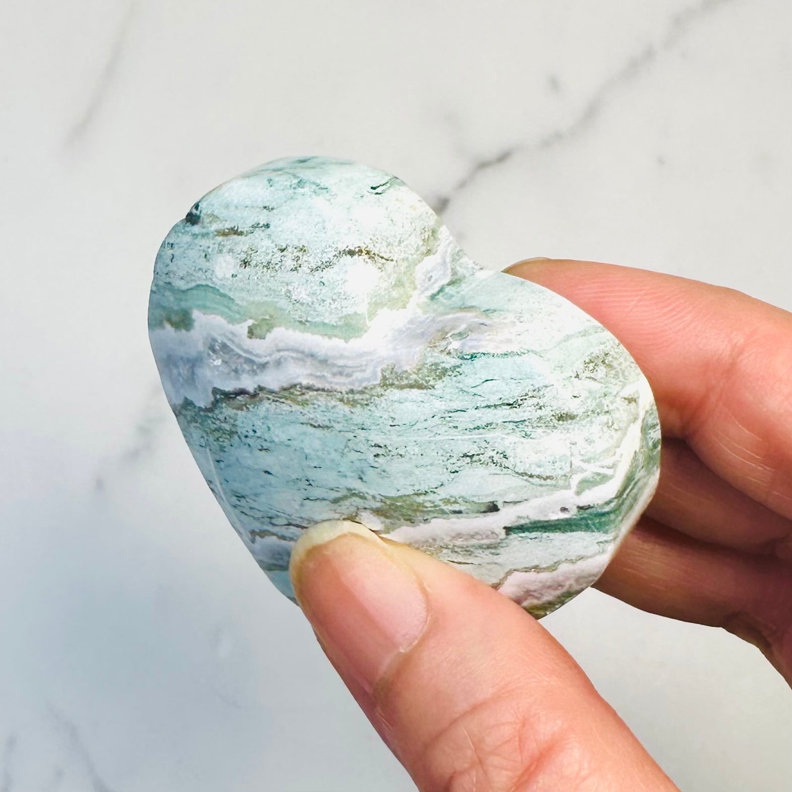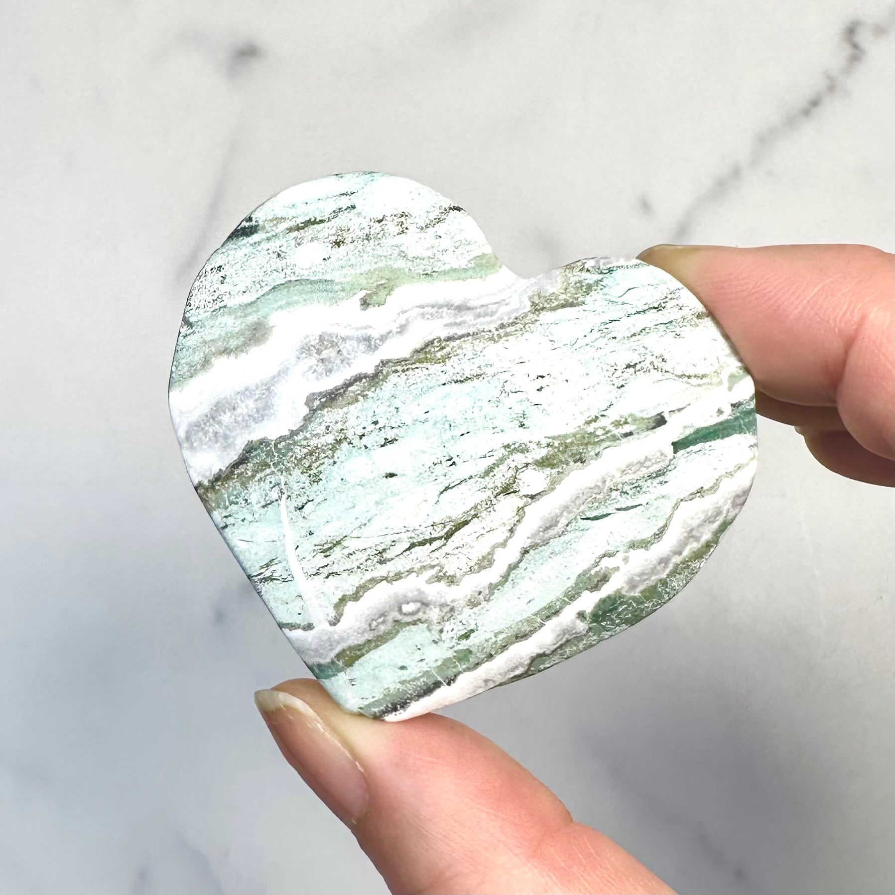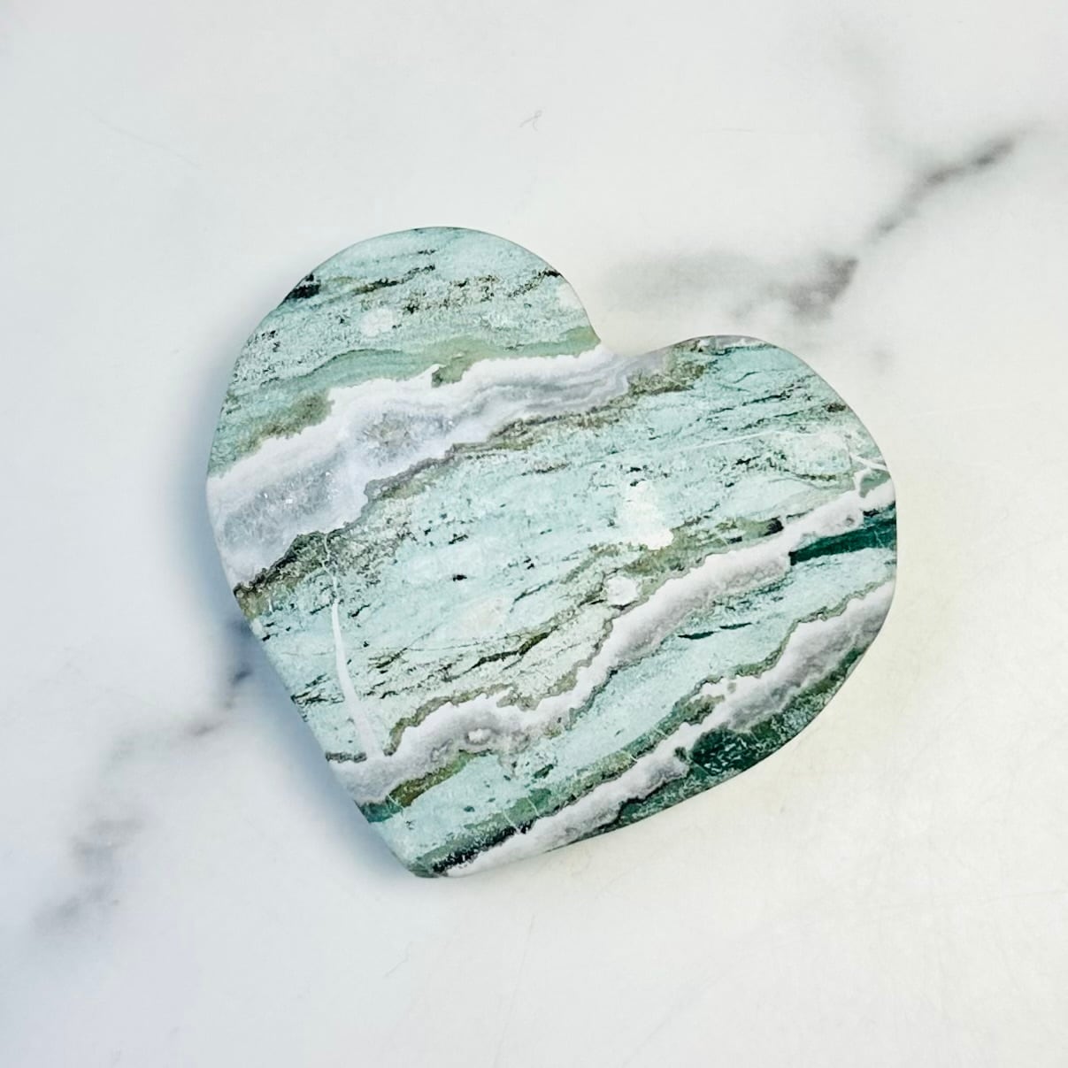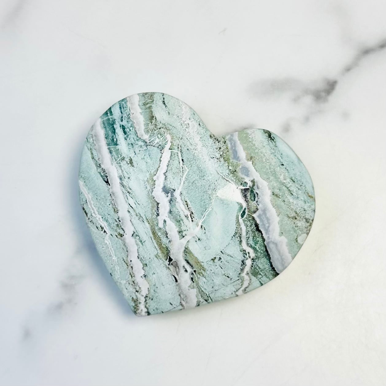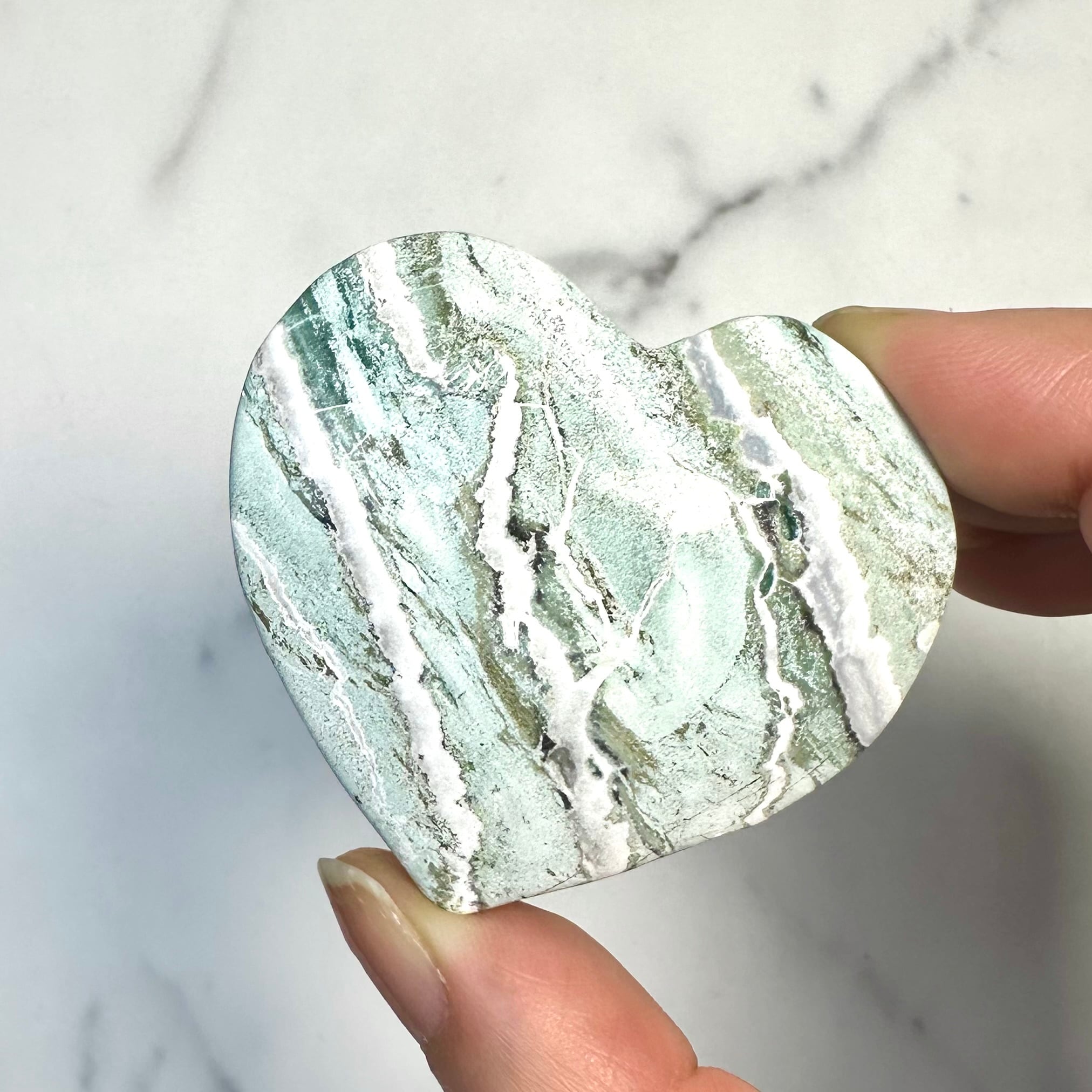 柔らかなグリーンとホワイトの模様が溶け合うように広がる、ユニコーンジャスパー。自然が描いたマーブル模様が個性豊かな表情を持つ天然石です。優しい色合いとぷっくり厚みのあるハート型がナチュラルで上品な印象を与えてくれます。