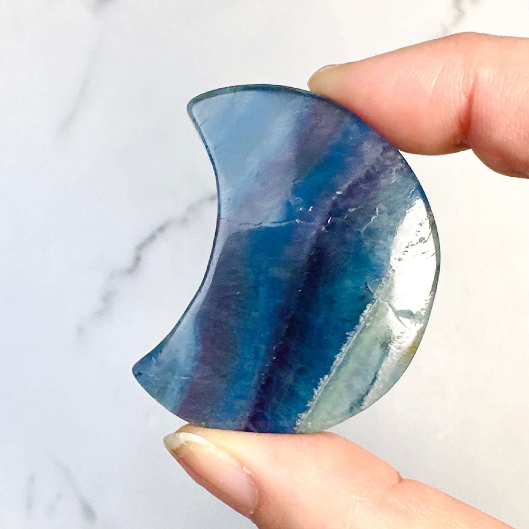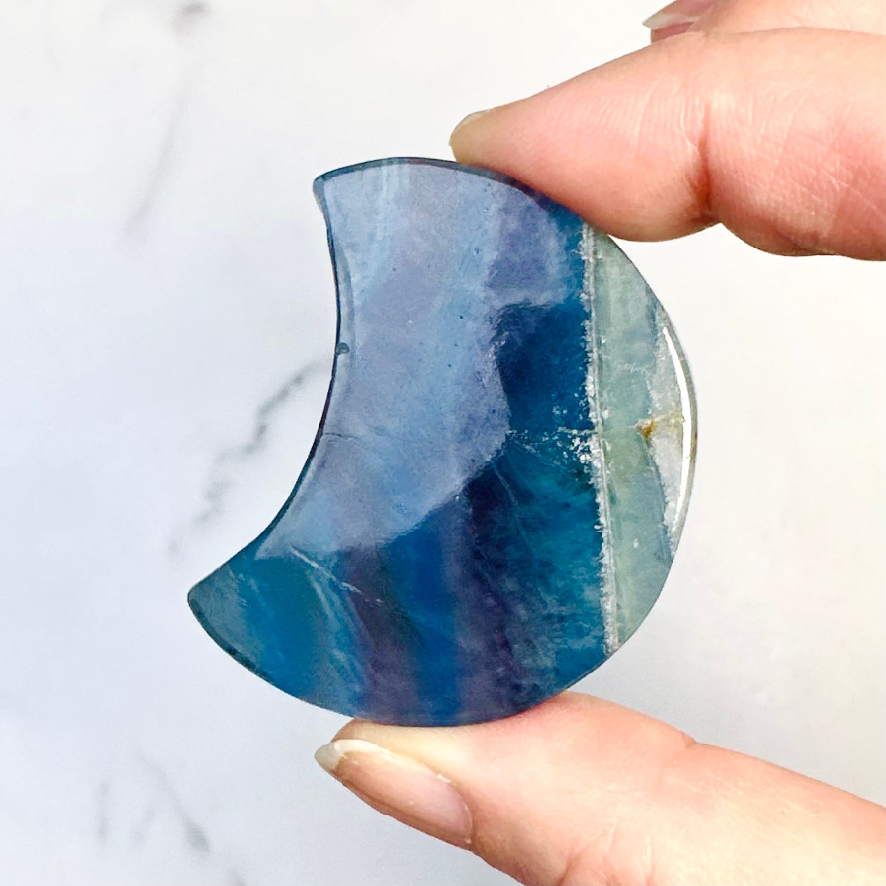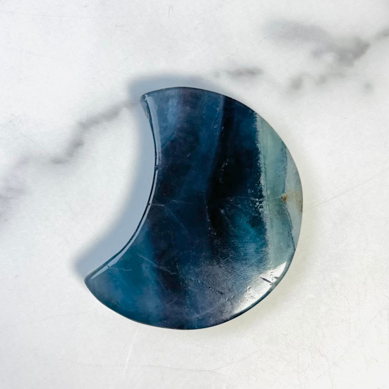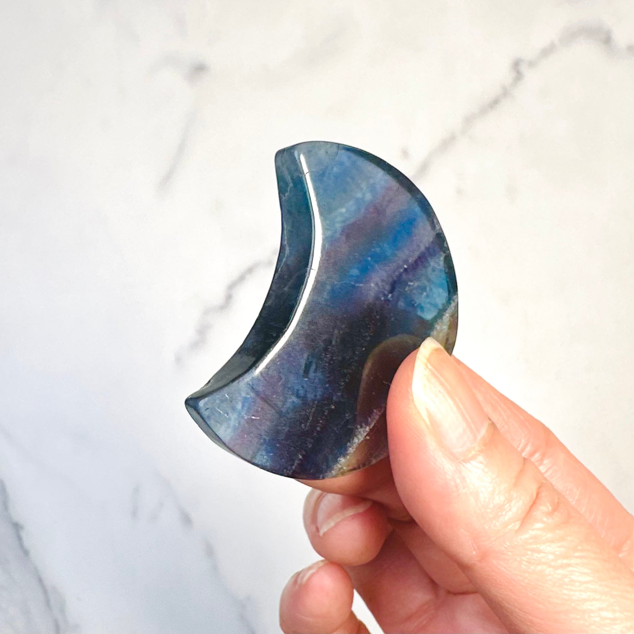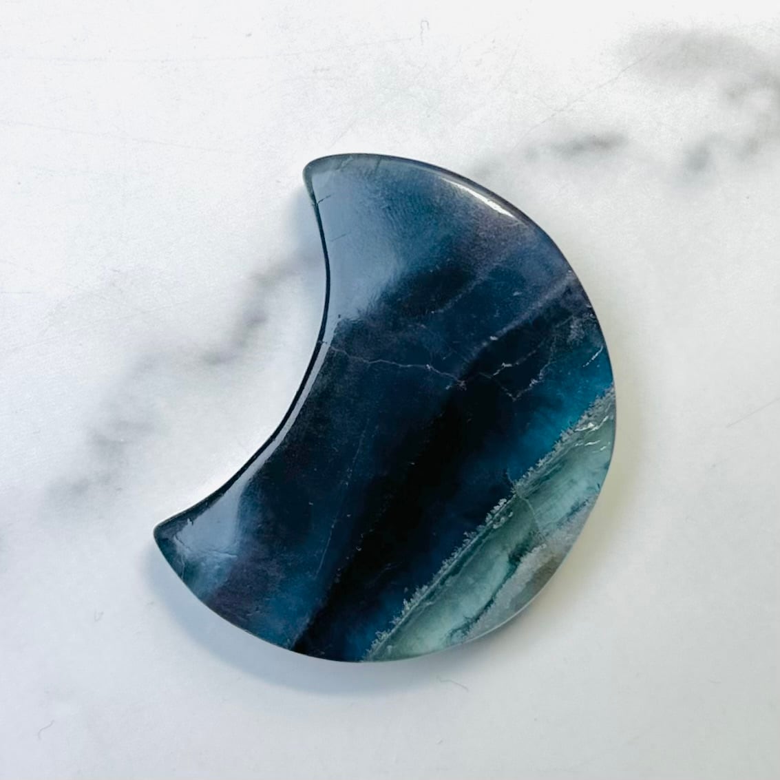 神秘的な色合いが美しいブルーフローライトの月形ストーン。光の角度や背景によって色の濃淡や輝きが変わり、手に取るたびに違った表情を見せてくれます。飽きずにずっと眺めていられるアイテムです。