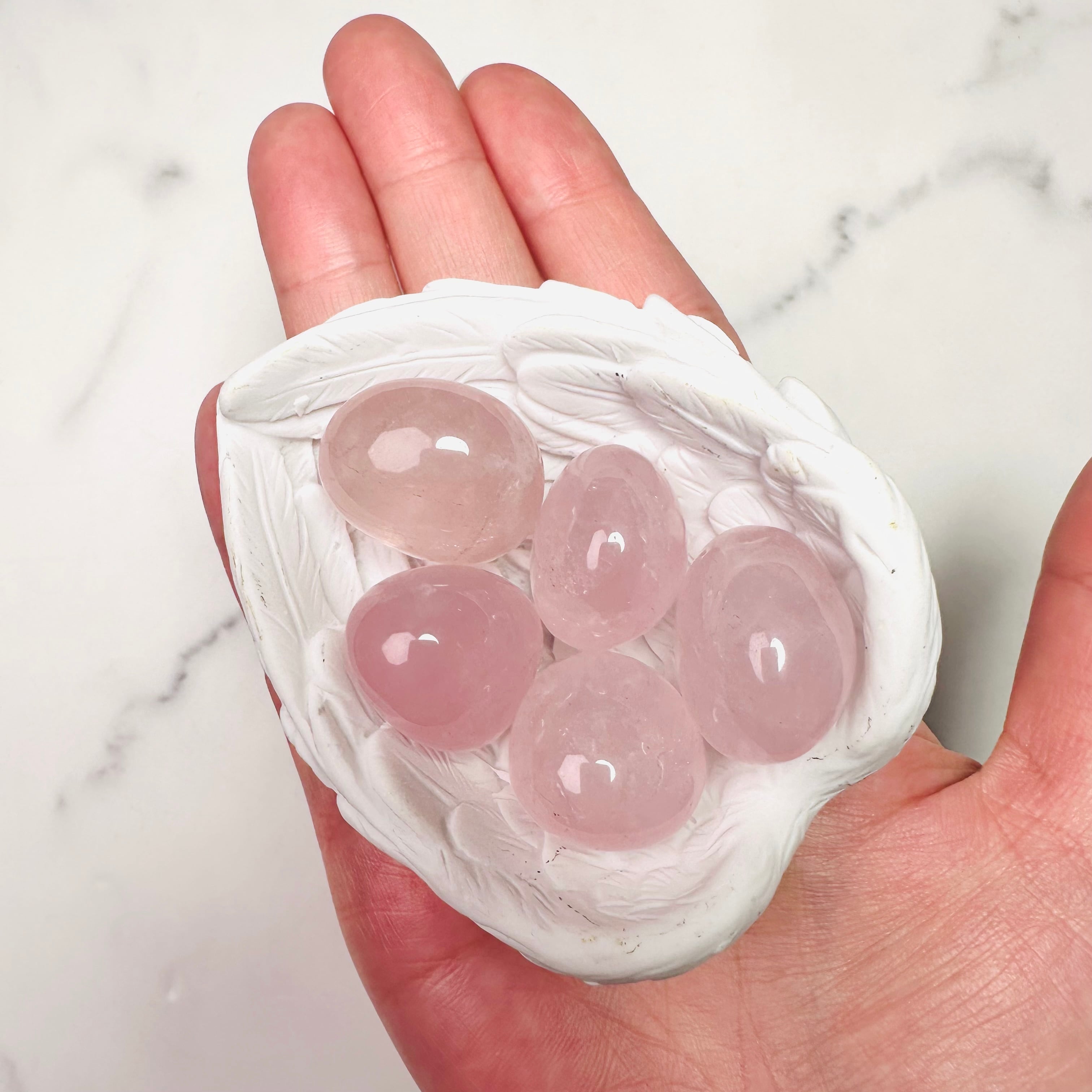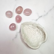 透明感たっぷりのマダガスカル産ローズクォーツタンブル5個と、当店で大人気の天使の羽ボウルのセットです。疲れた心をほっと癒してくれる天然石のサプリメントで、いつもの自分を取り戻してくださいね。