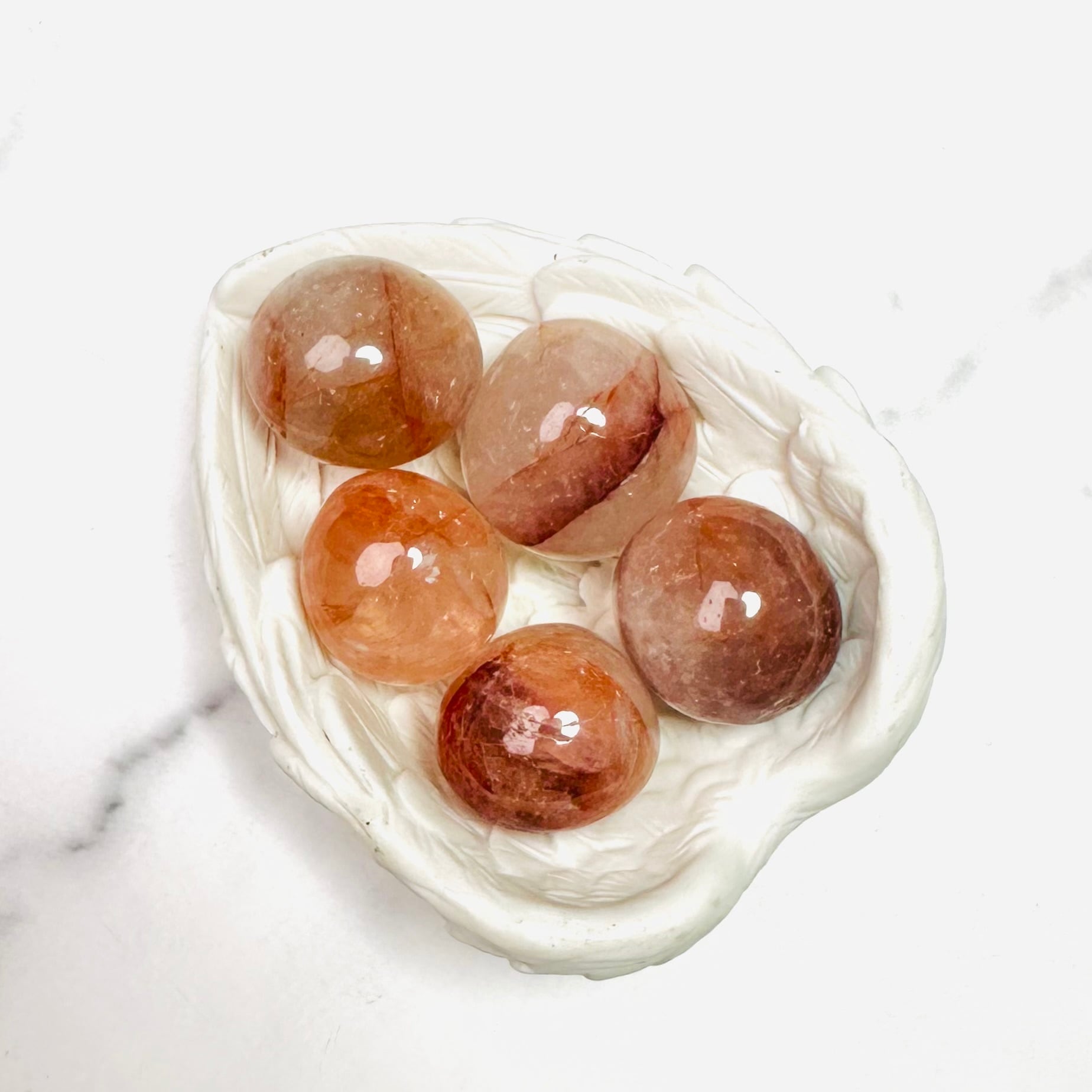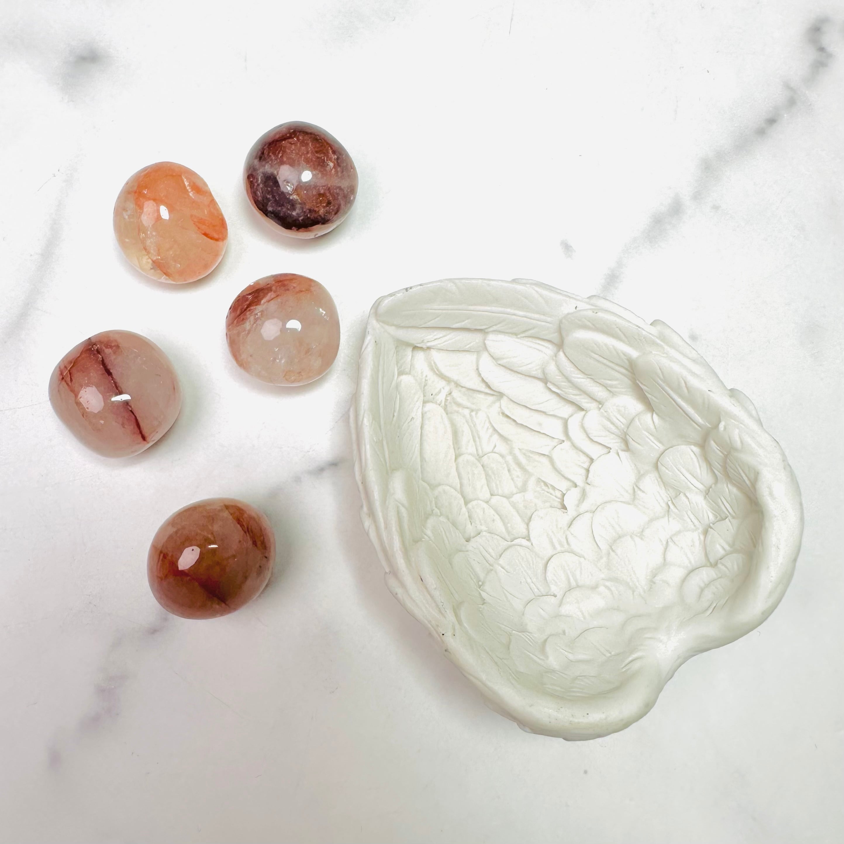 透明感たっぷりのブラジル産ファイヤークォーツタンブル5個と、当店で大人気の天使の羽ボウルのセットです。疲れた心をほっと癒してくれる天然石のサプリメントで、いつもの自分を取り戻してくださいね。