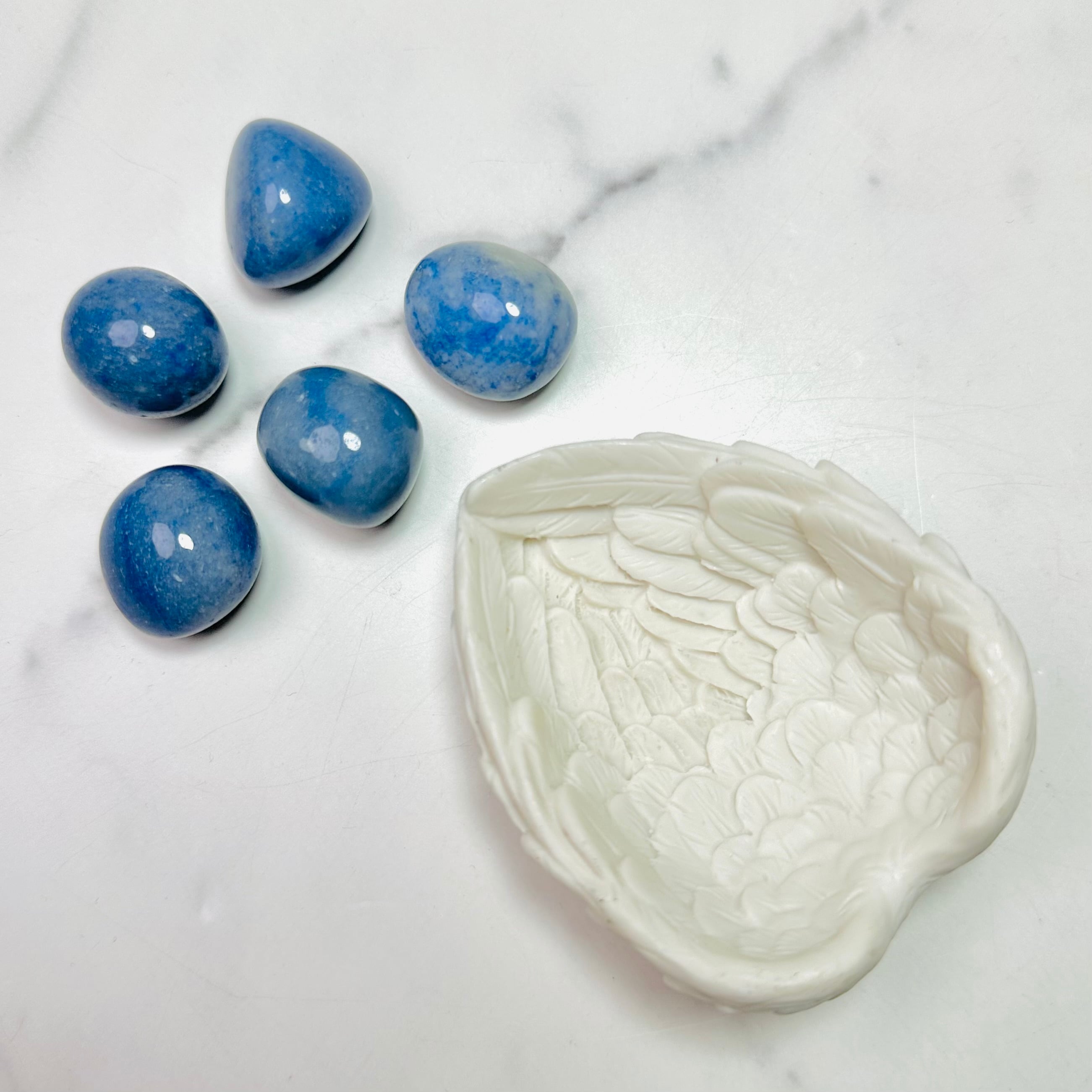 透明感たっぷりのブラジル産ブルーアベンチュリンタンブル5個と、当店で大人気の天使の羽ボウルのセットです。疲れた心をほっと癒してくれる天然石のサプリメントで、いつもの自分を取り戻してくださいね。
