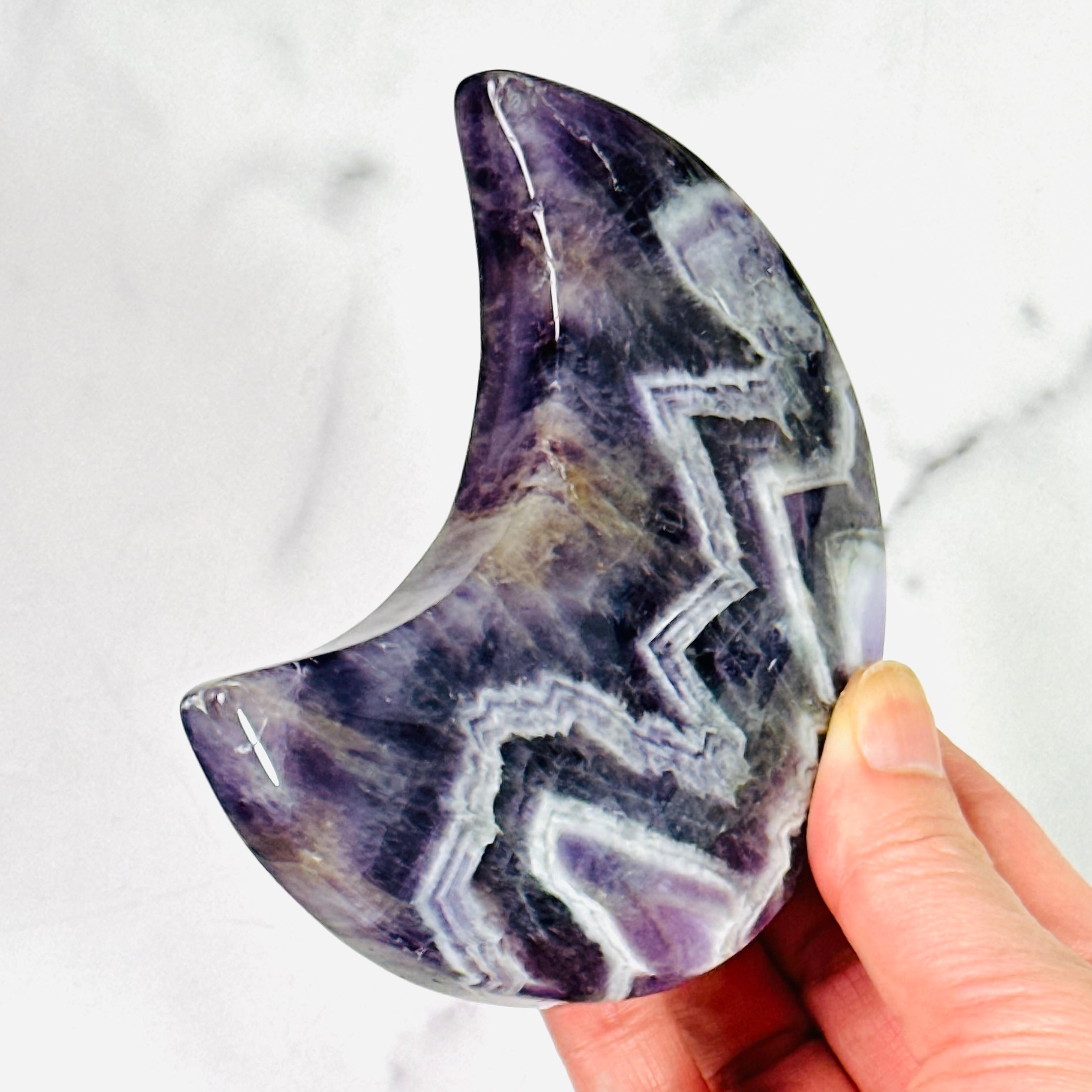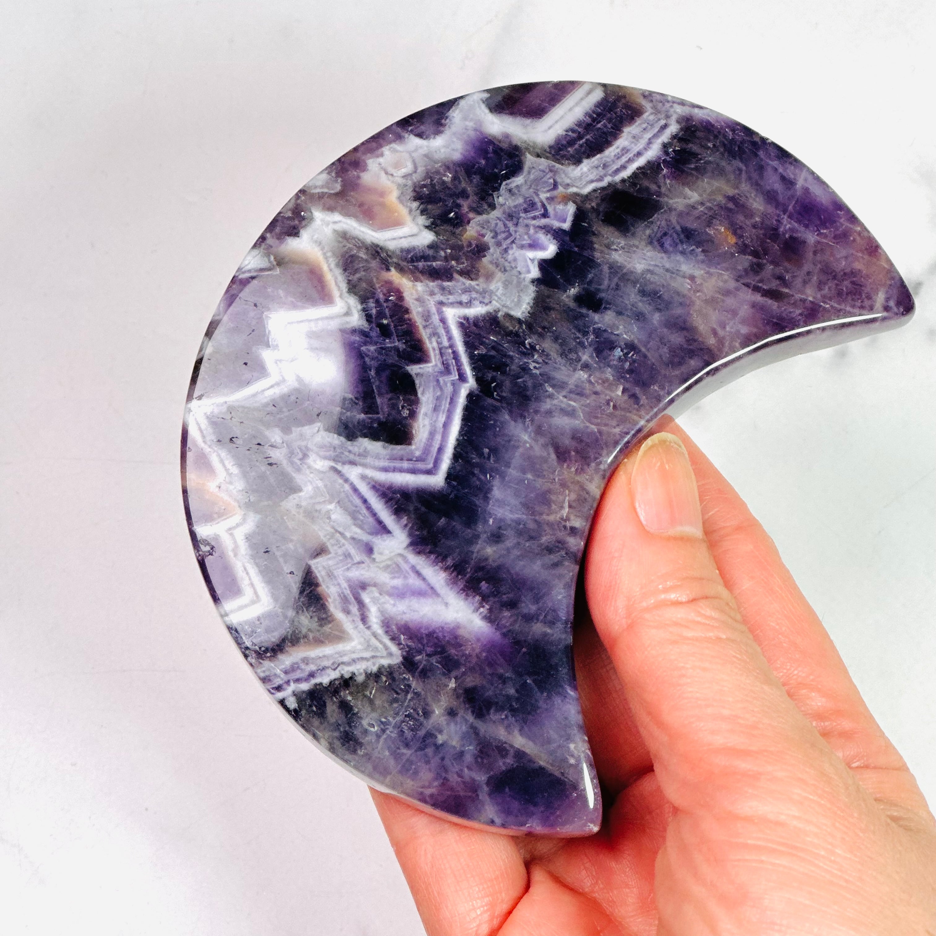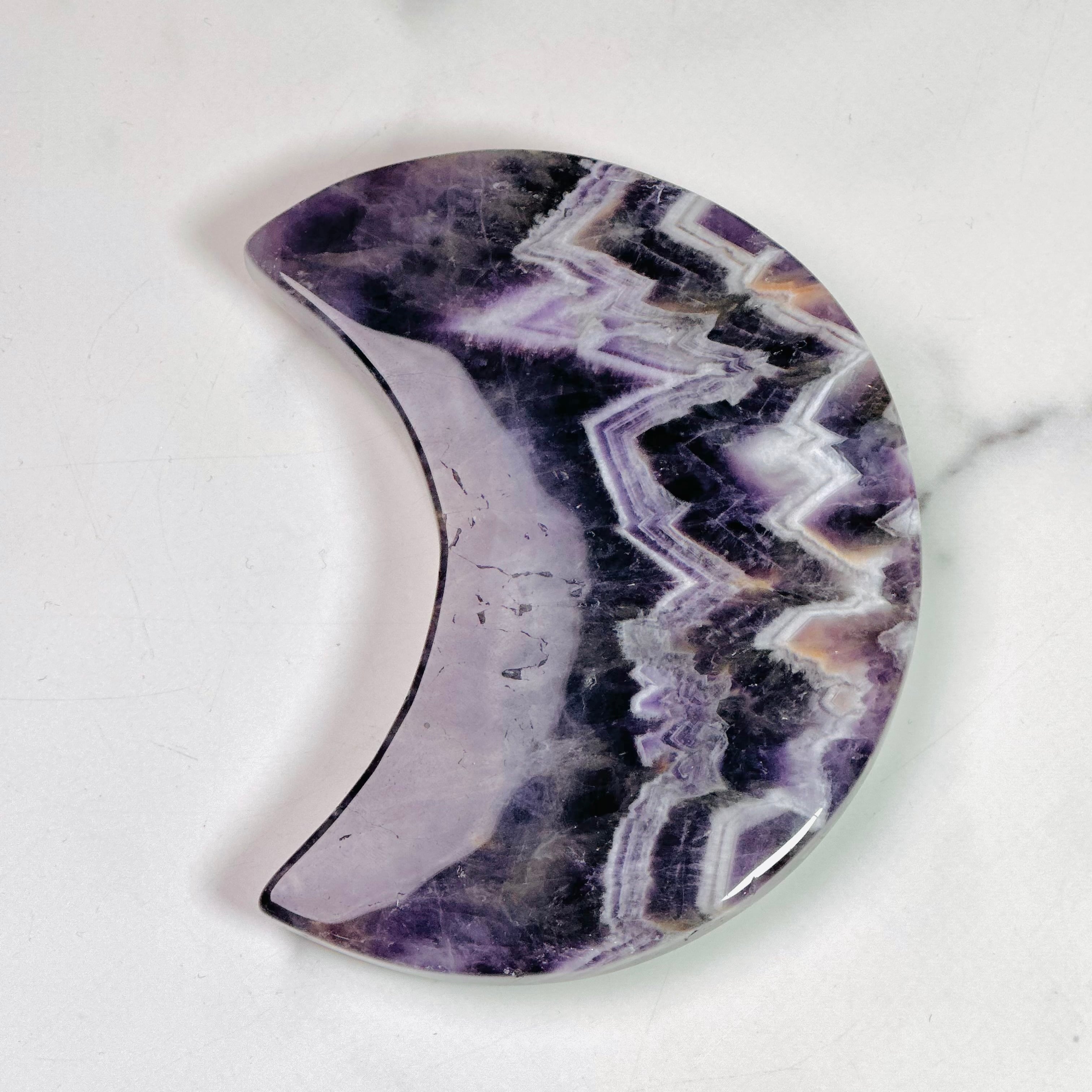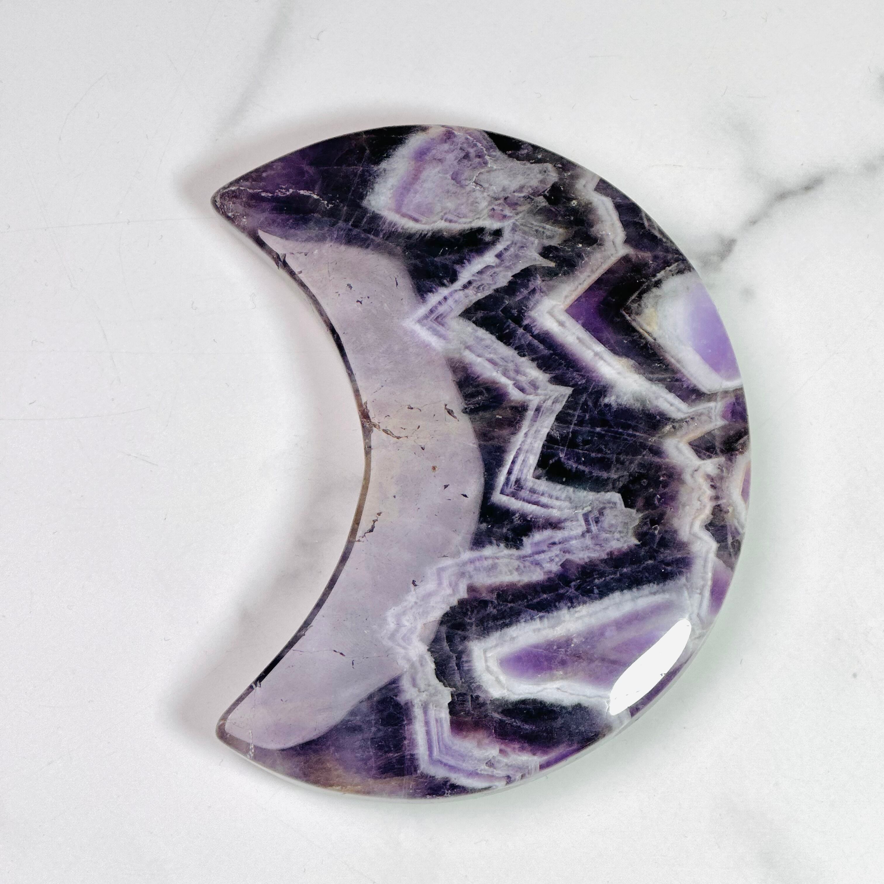 紫と白が織りなす模様が美しいシェブロンアメジストの月形ストーン。自然が描き出した幾何学的な模様は神秘的で、紫とホワイトのコントラストがおしゃれな空間を演出します。