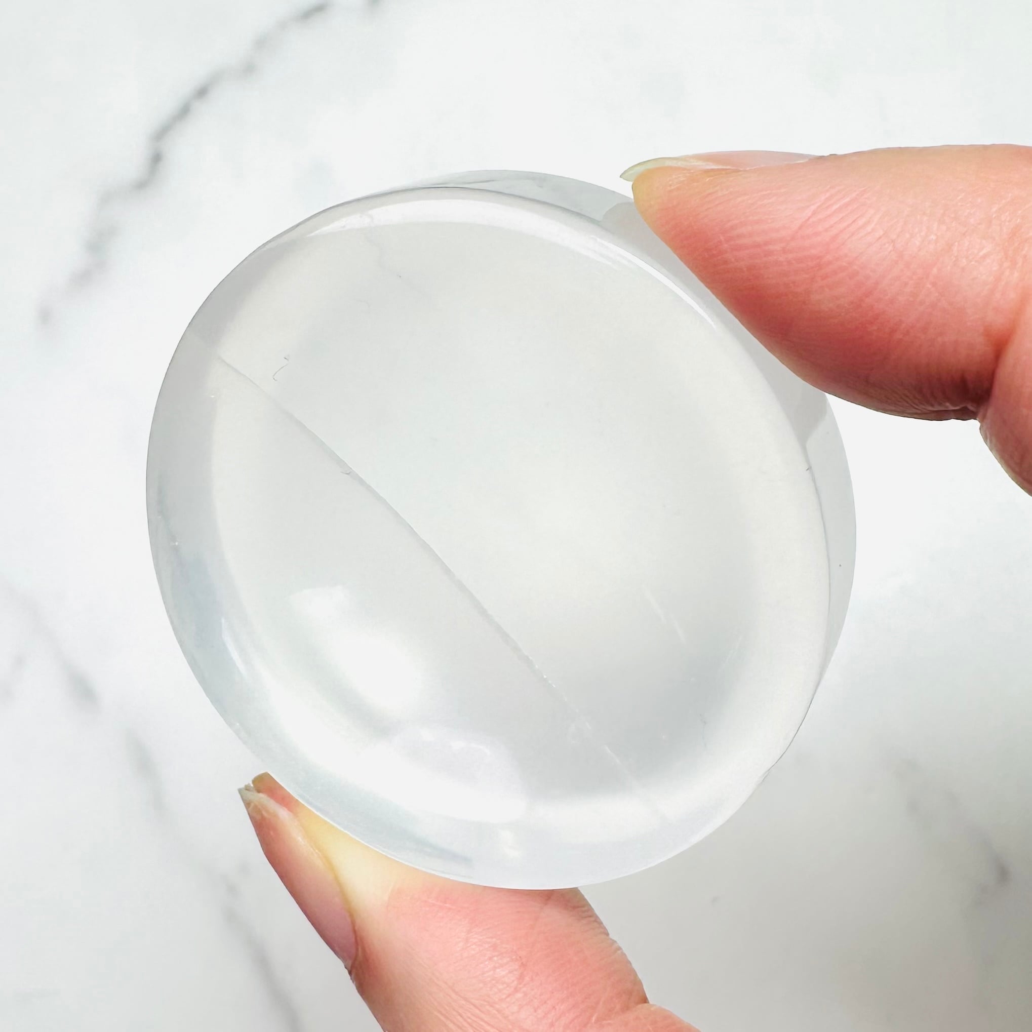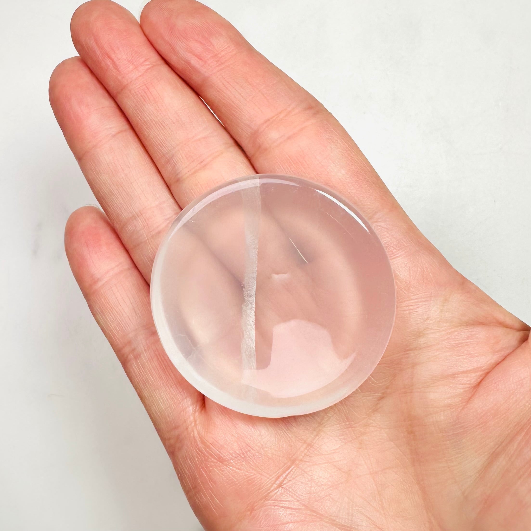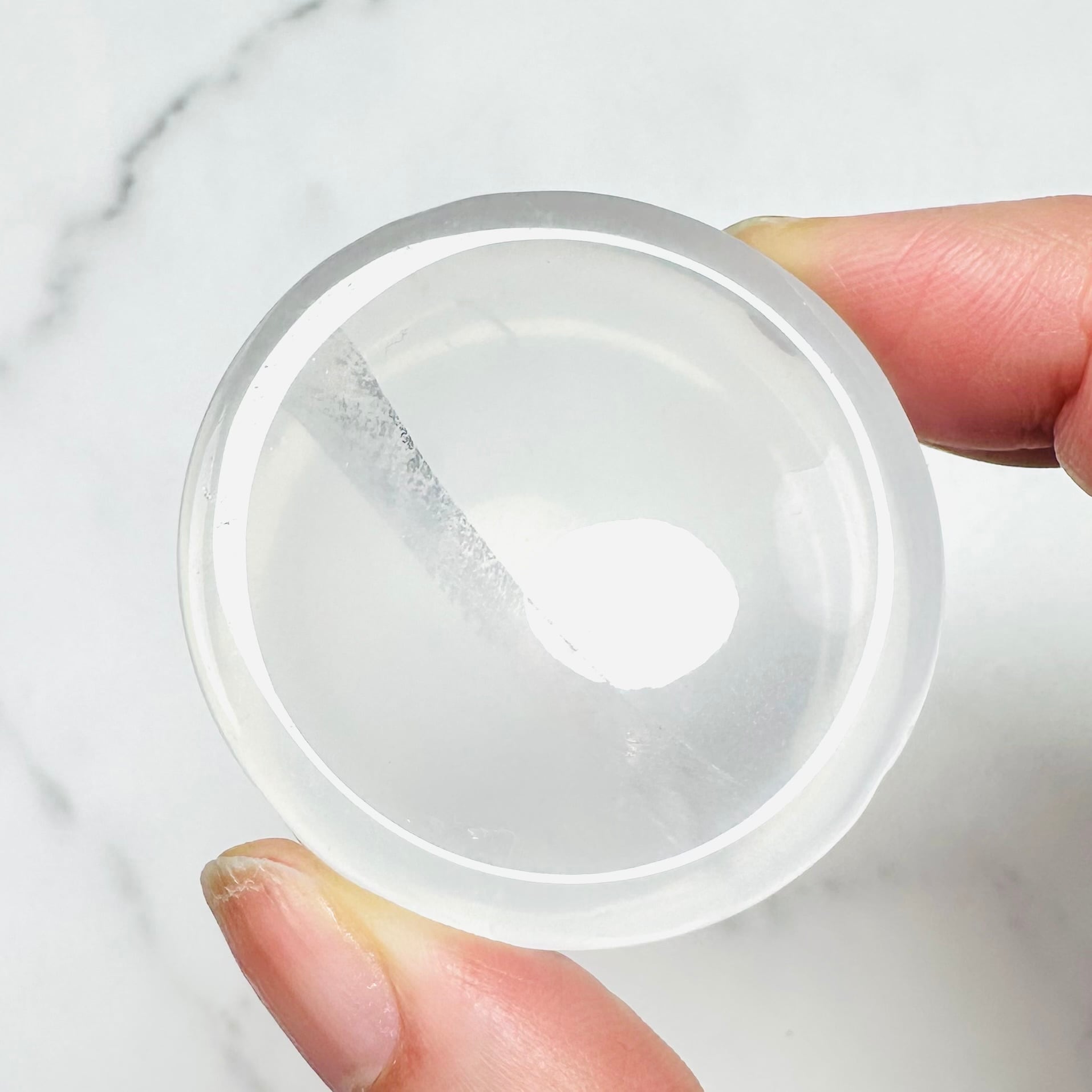 クリアクォーツのラウンド型トレイです。つるつると滑らかな水晶の表面が美しく、透き通った部分が光を通して明るく綺麗です。お気に入りのリングやタンブルなどを一晩置けば、寝ている間にマイナスのエネルギーを浄化して次の朝にはクリアな状態に戻してくれます。