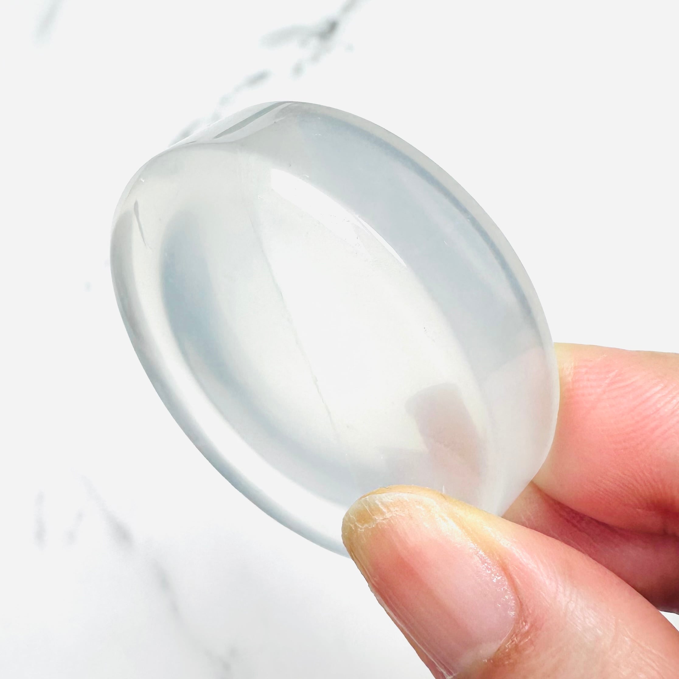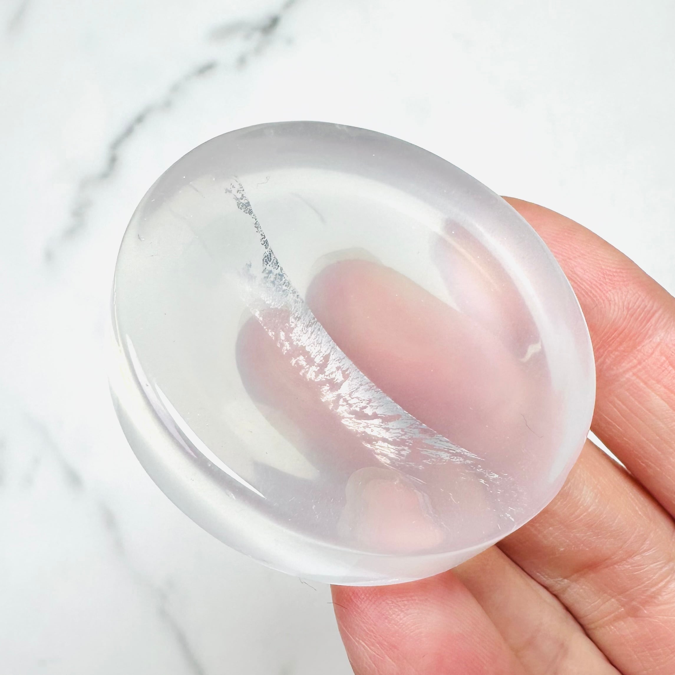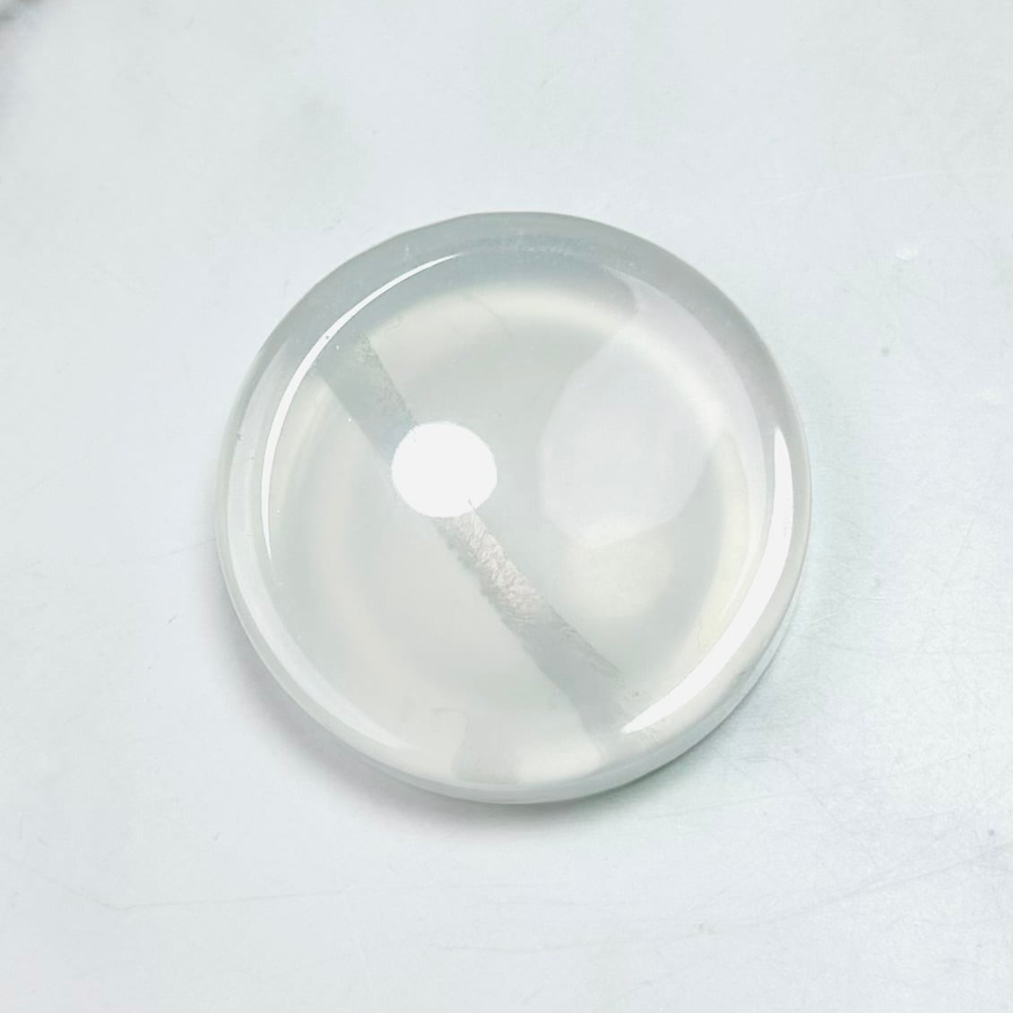 クリアクォーツのラウンド型トレイです。つるつると滑らかな水晶の表面が美しく、透き通った部分が光を通して明るく綺麗です。お気に入りのリングやタンブルなどを一晩置けば、寝ている間にマイナスのエネルギーを浄化して次の朝にはクリアな状態に戻してくれます。