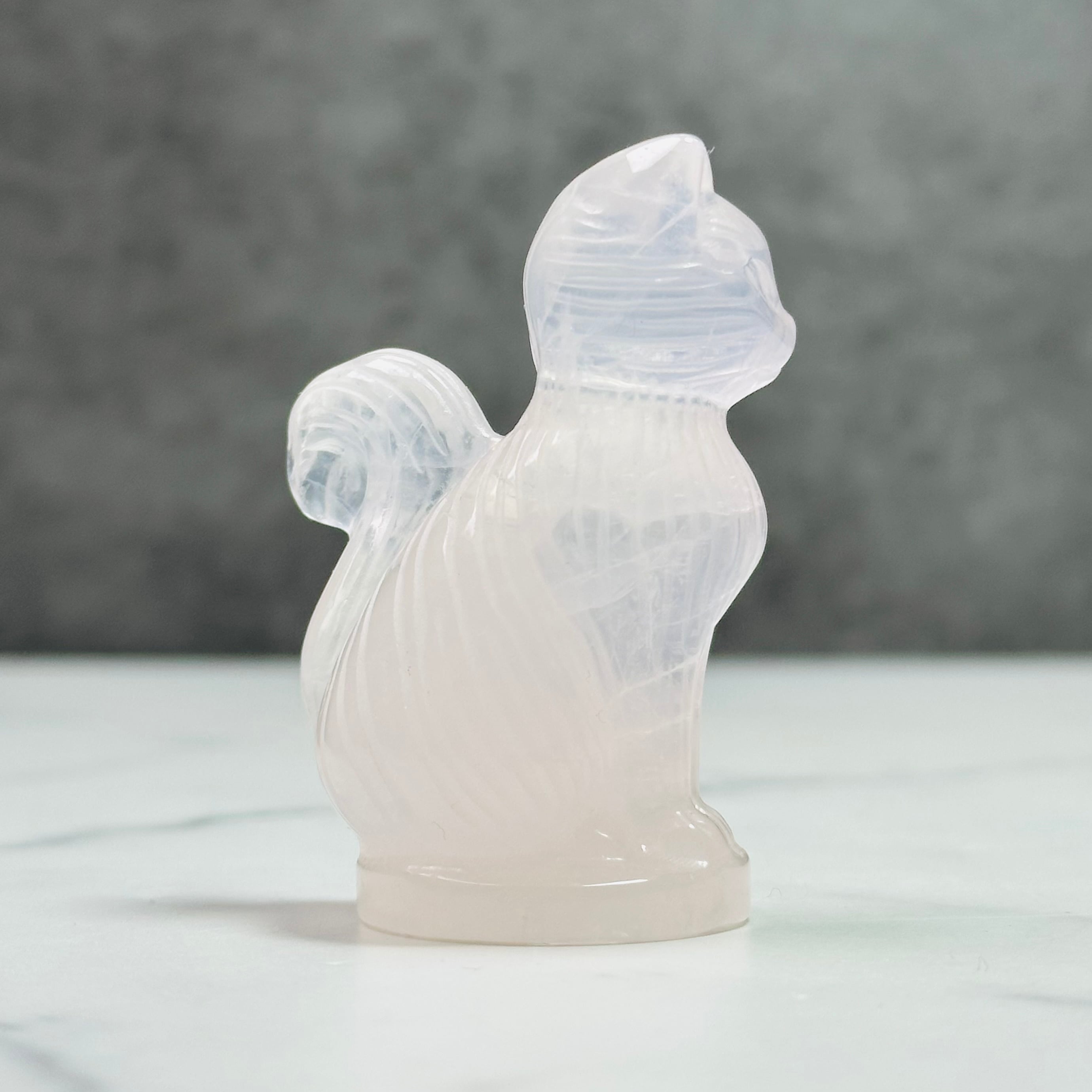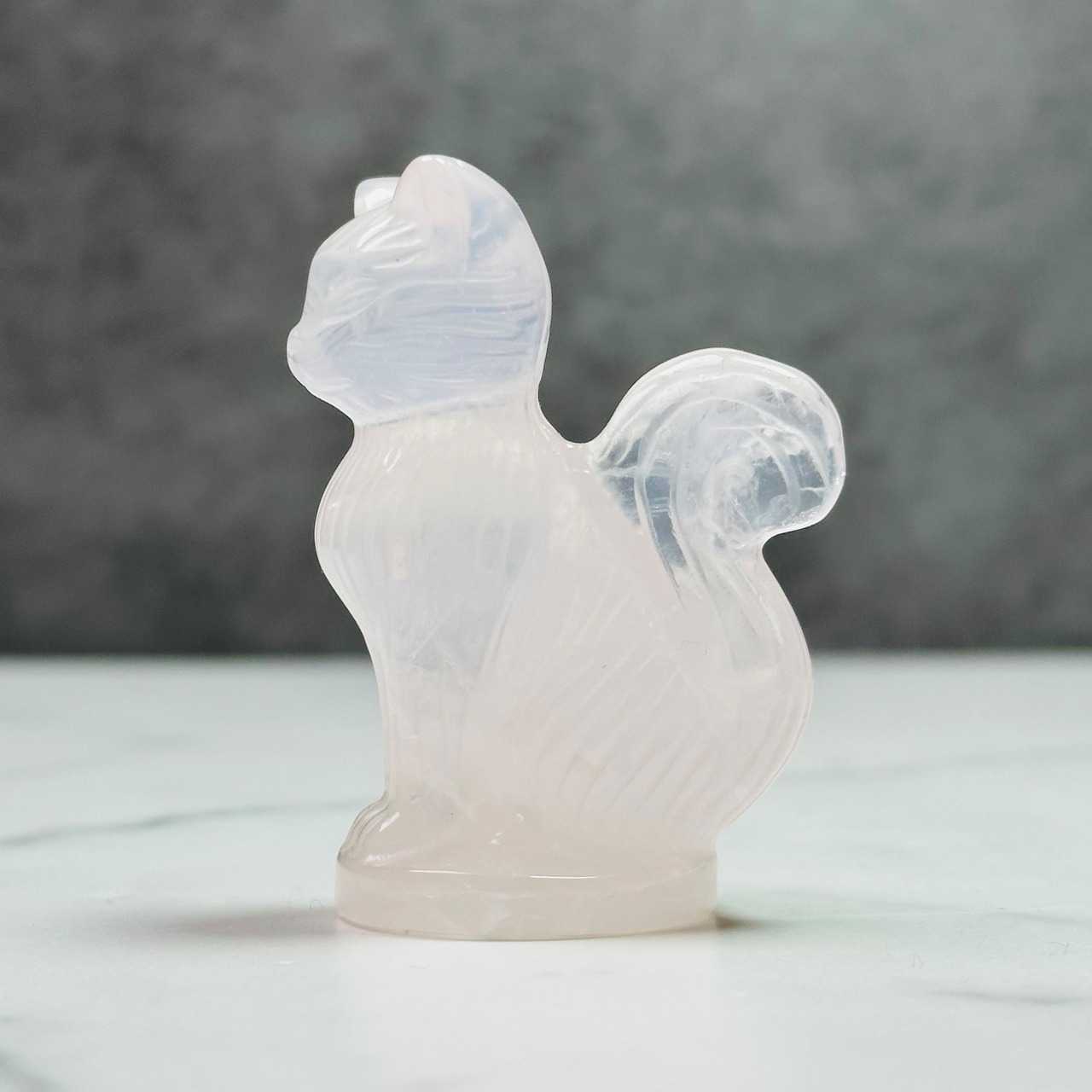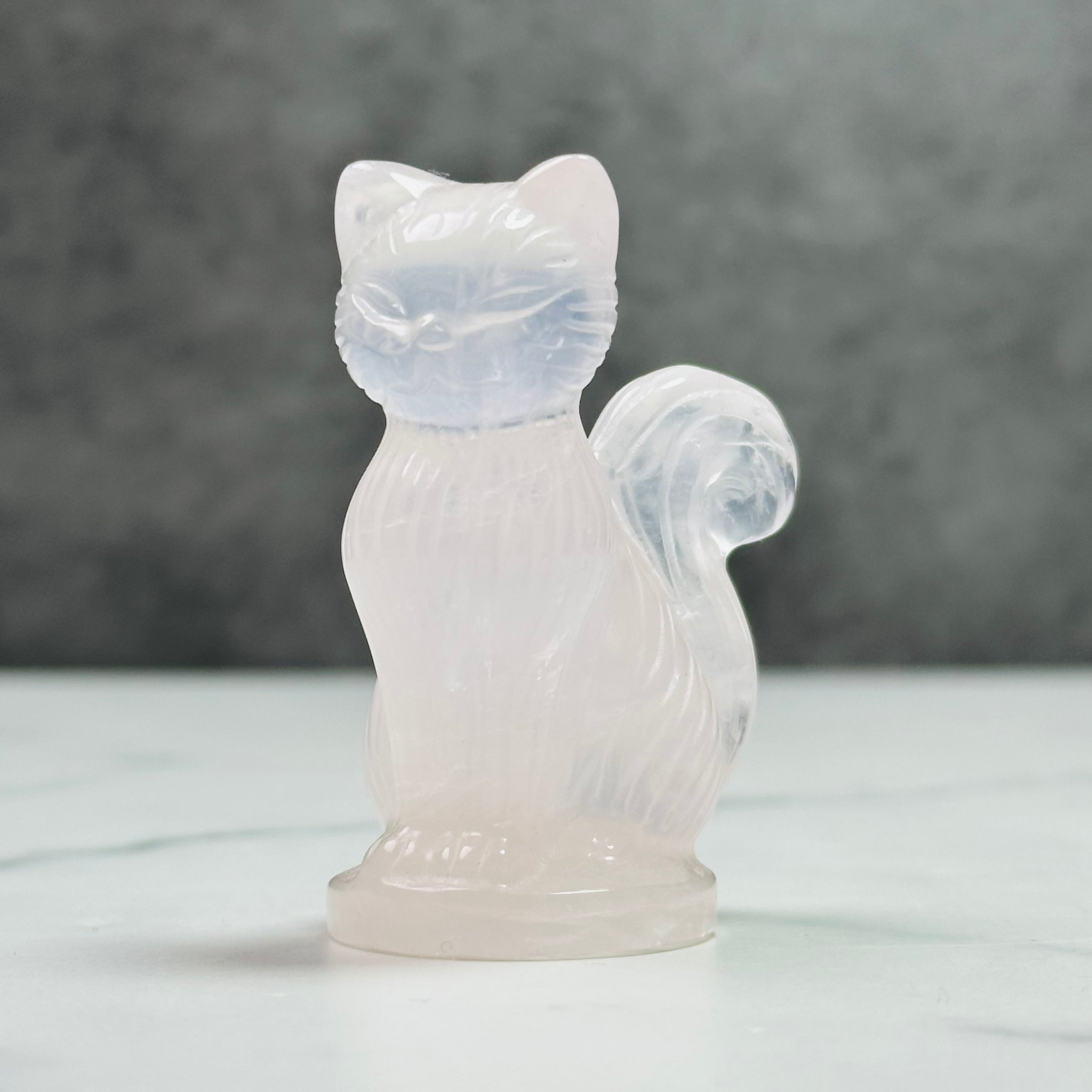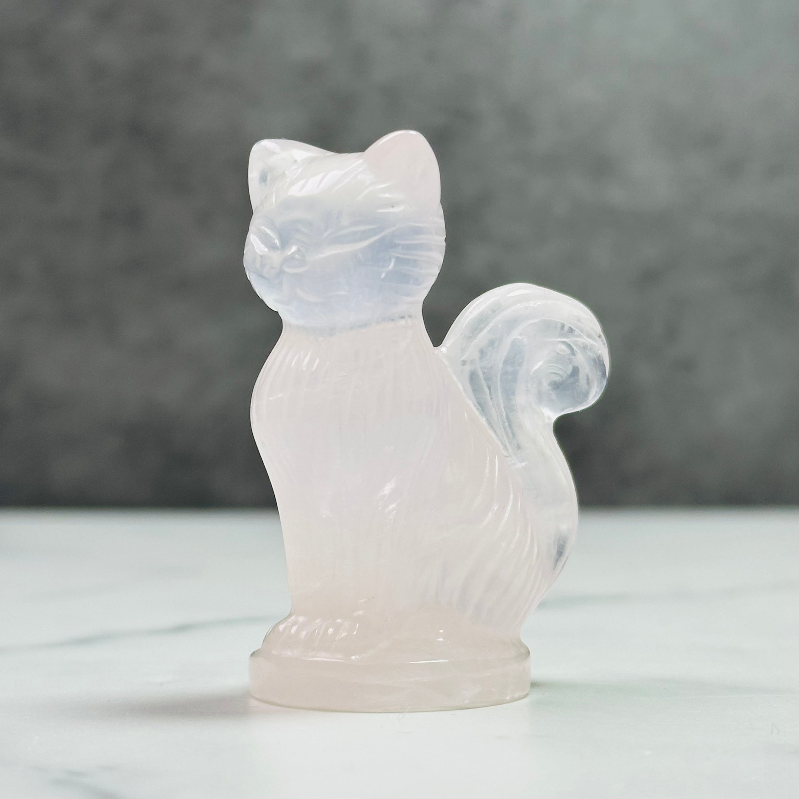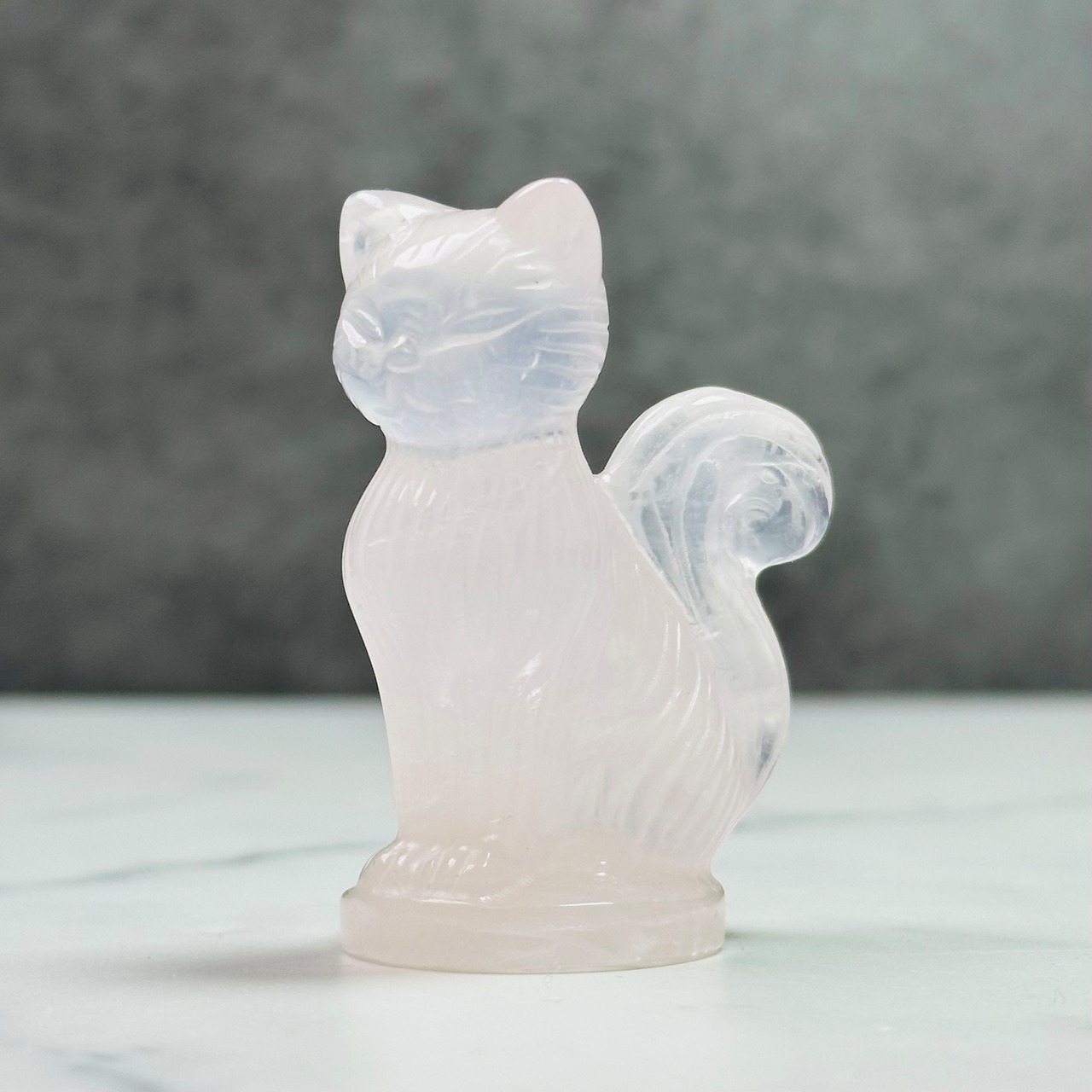 上品にお行儀よくお座りしているローズクォーツのおすまし猫さん。美しい毛並みとカールした大きな尻尾が魅力的で、飼い主さんを待っているのか、どこか遠くを見つめるような表情で佇んでいます。