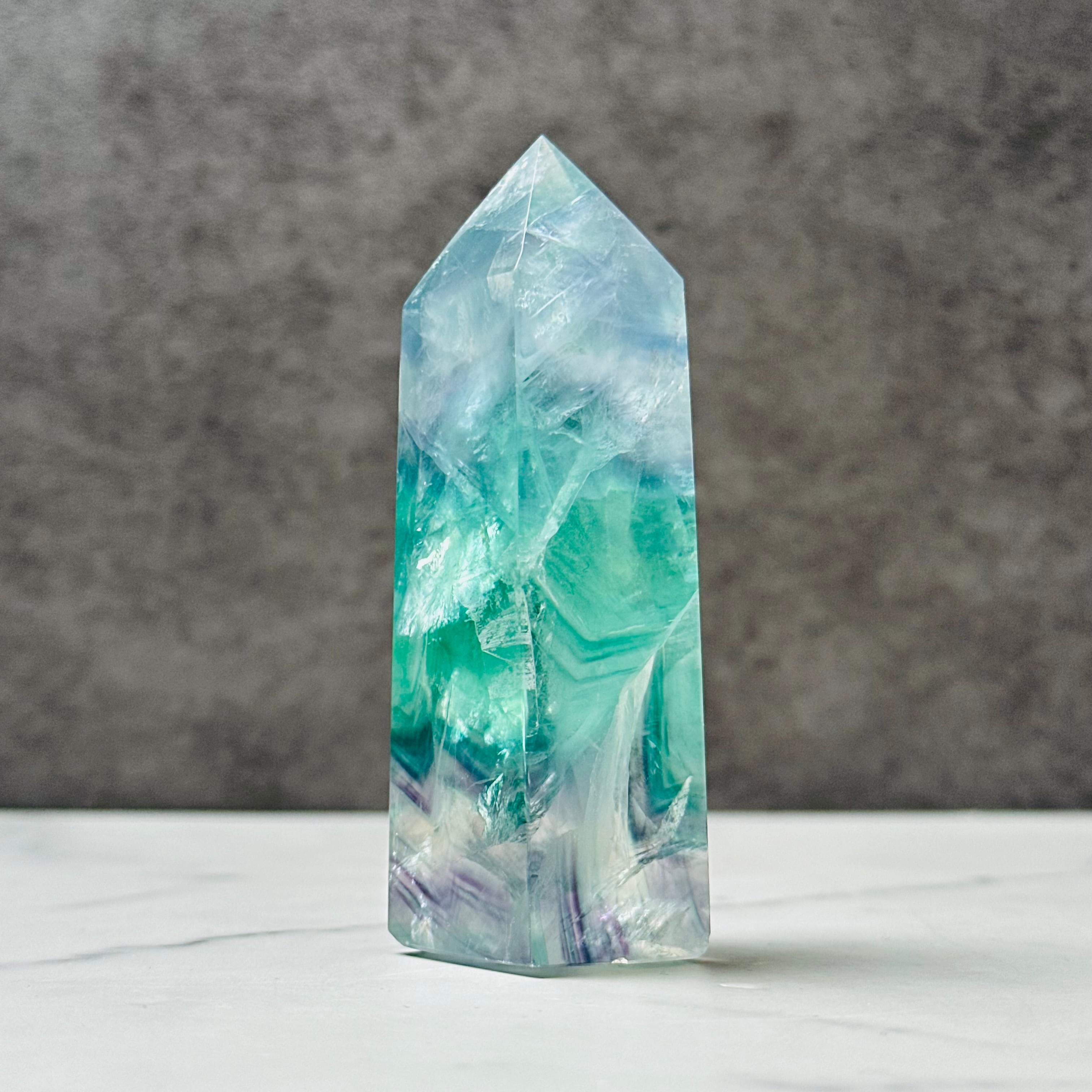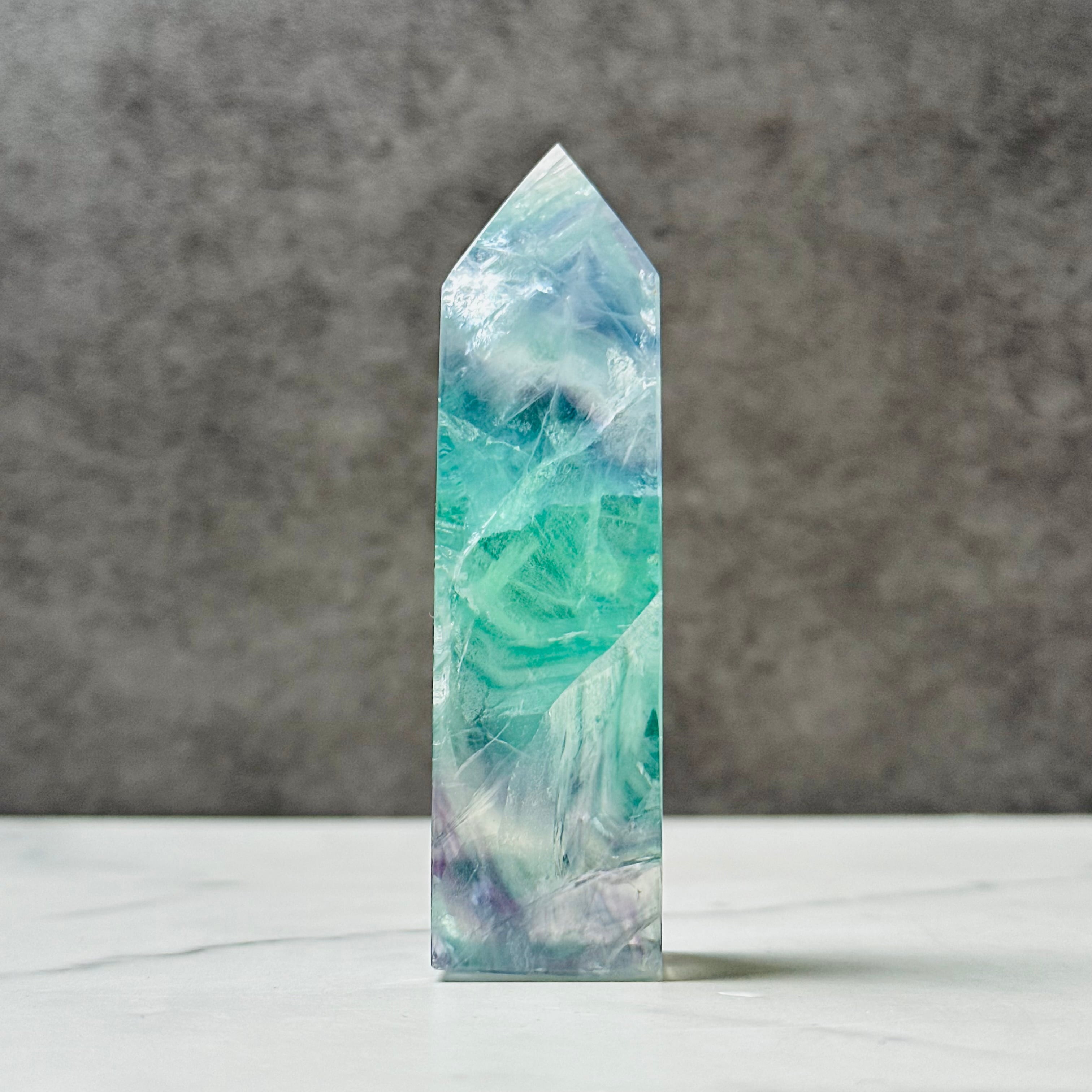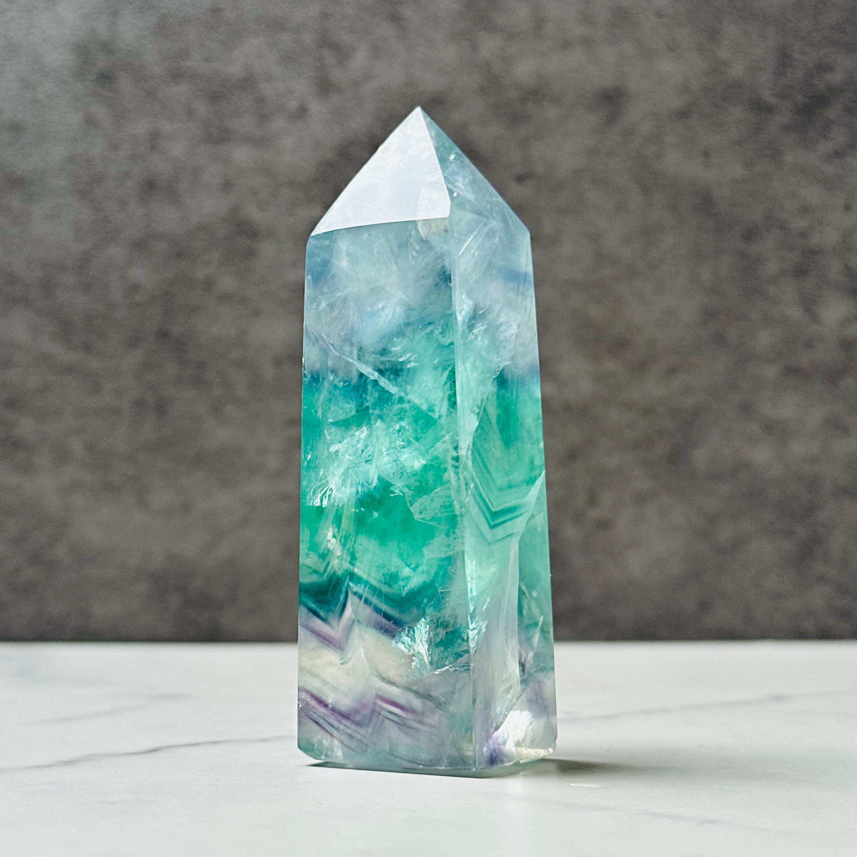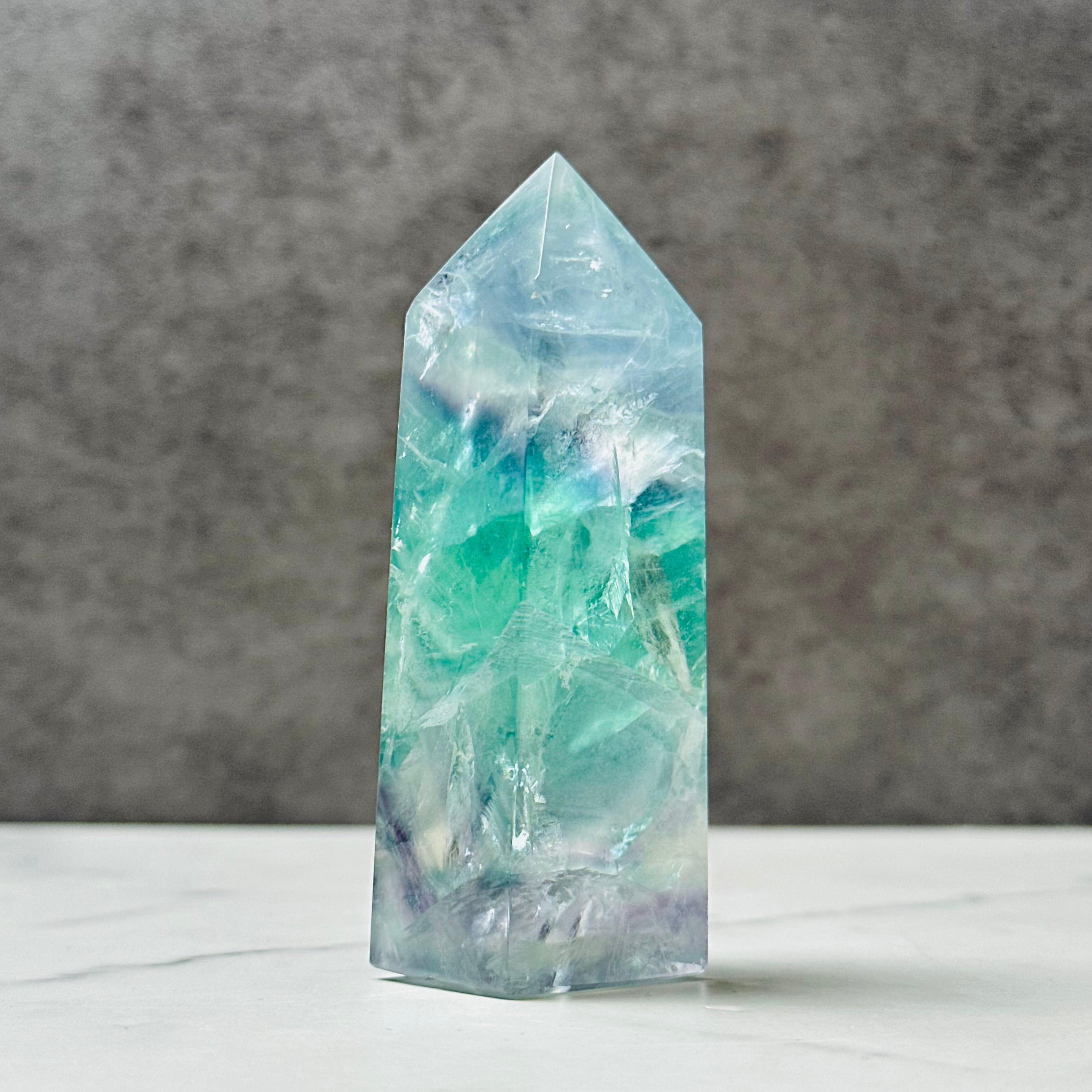 透明感ある美しい色彩が美しいフローライトタワー。お部屋に清らかな癒しの空間を演出します。鮮やかな虹があちこちに現れます。思考をクリアにしてくれる石で、特にお仕事スペース、デスク周りにおすすめです。