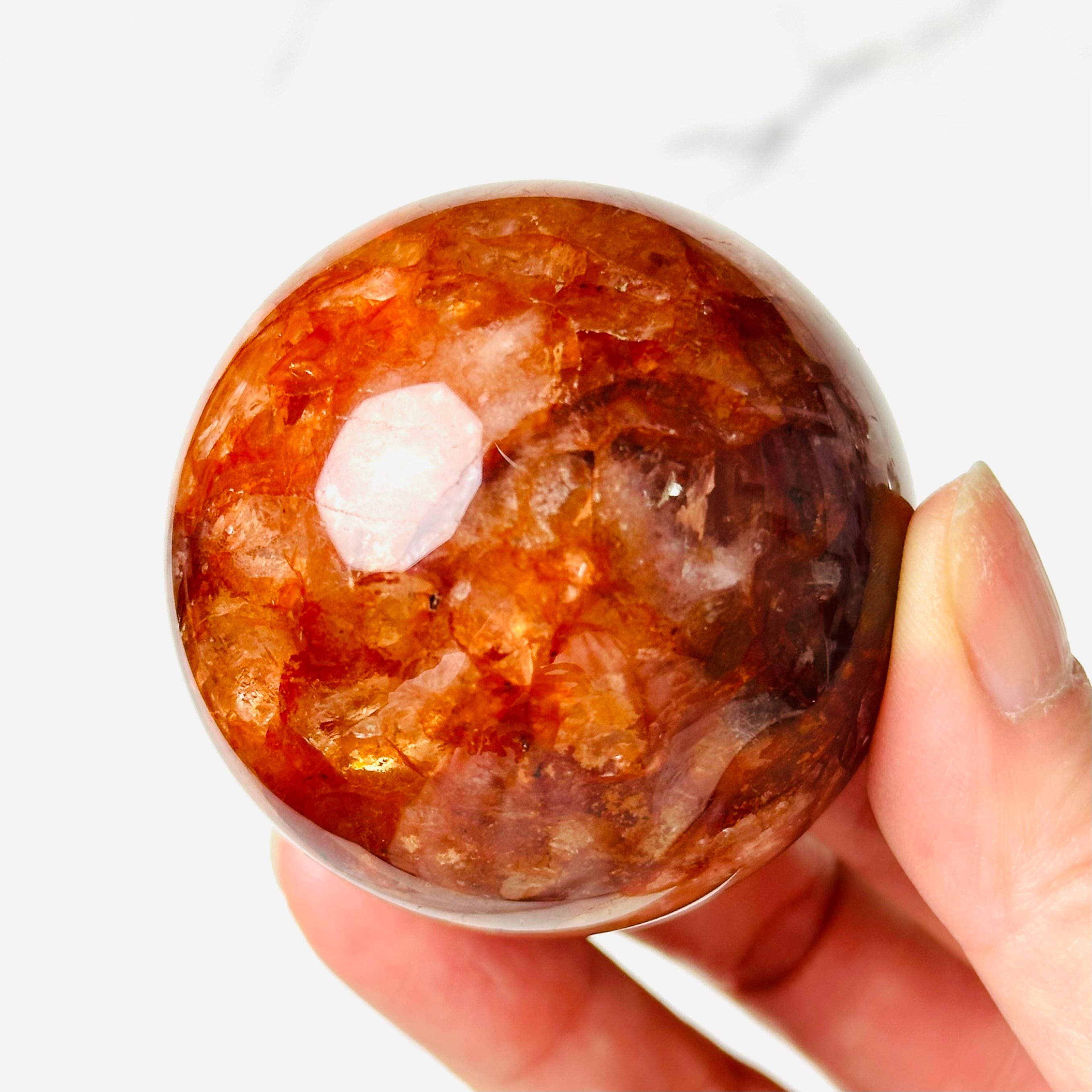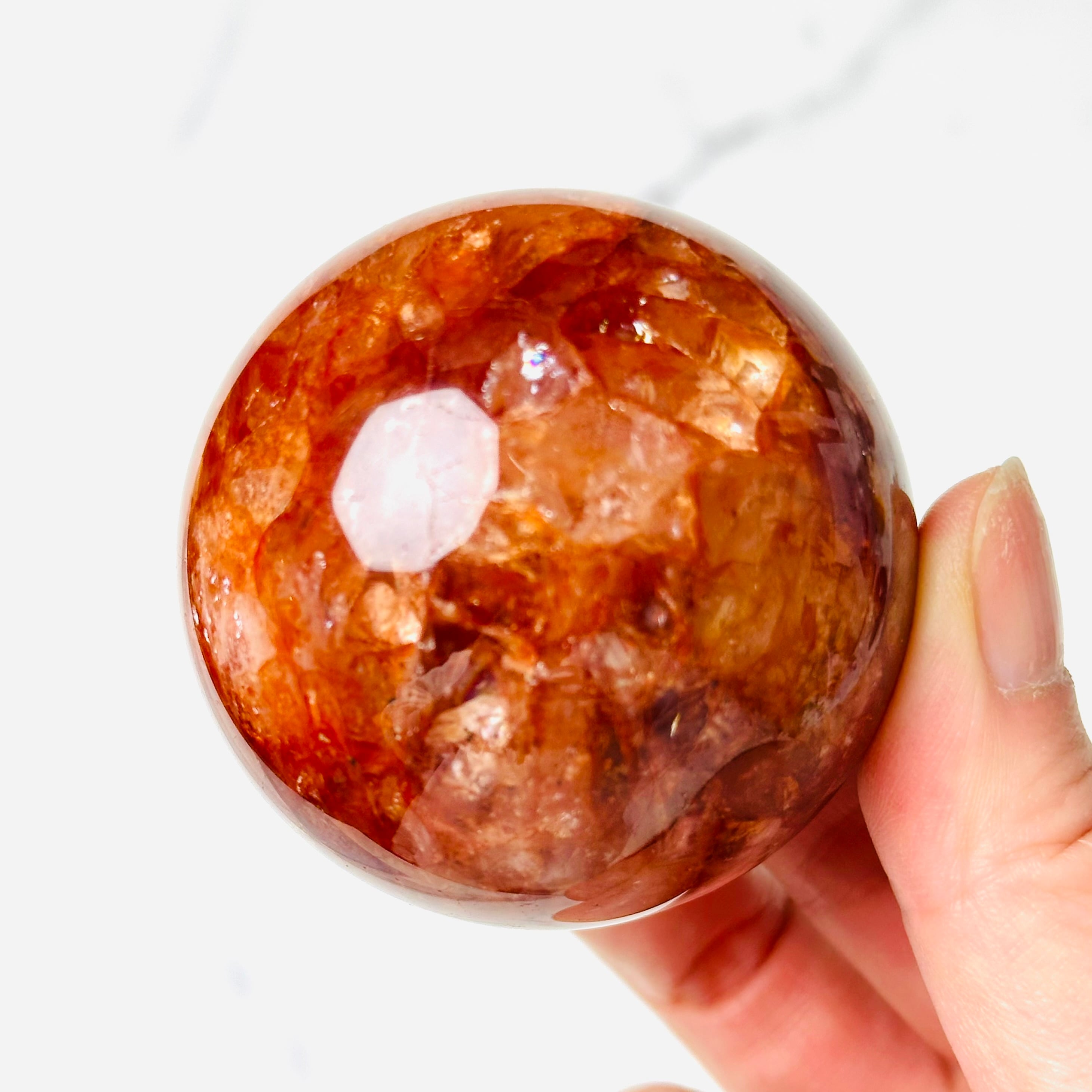 燃えるような赤やオレンジのインクルージョンが幻想的に広がるファイヤークォーツ。まるで夕焼けを閉じ込めたかのような表情がの魅力です。見るたびに元気をもらえる、存在感あるインテリアアイテムです。