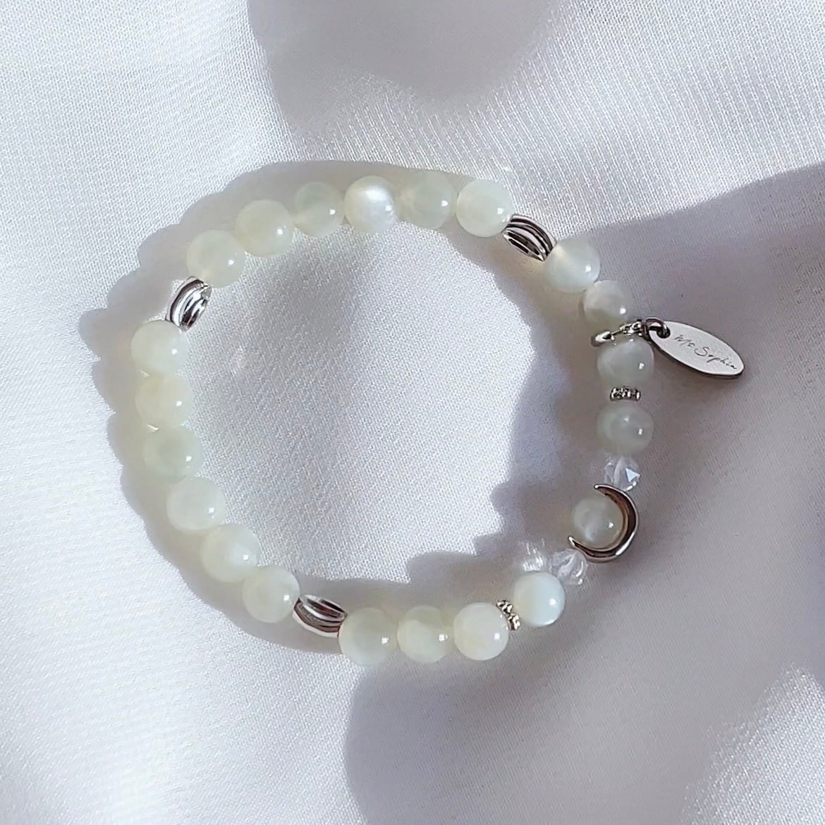 淡いパステルグリーンの色合いに、シルクのような美しい光沢をまとったグリーンムーンストーンをベースに使用しました。控えめながらも上品で綺麗な石たちと、絶妙なバランスで配置された銀色のパーツでデザインされ、女性の手元を繊細かつ美しく魅せてくれます。