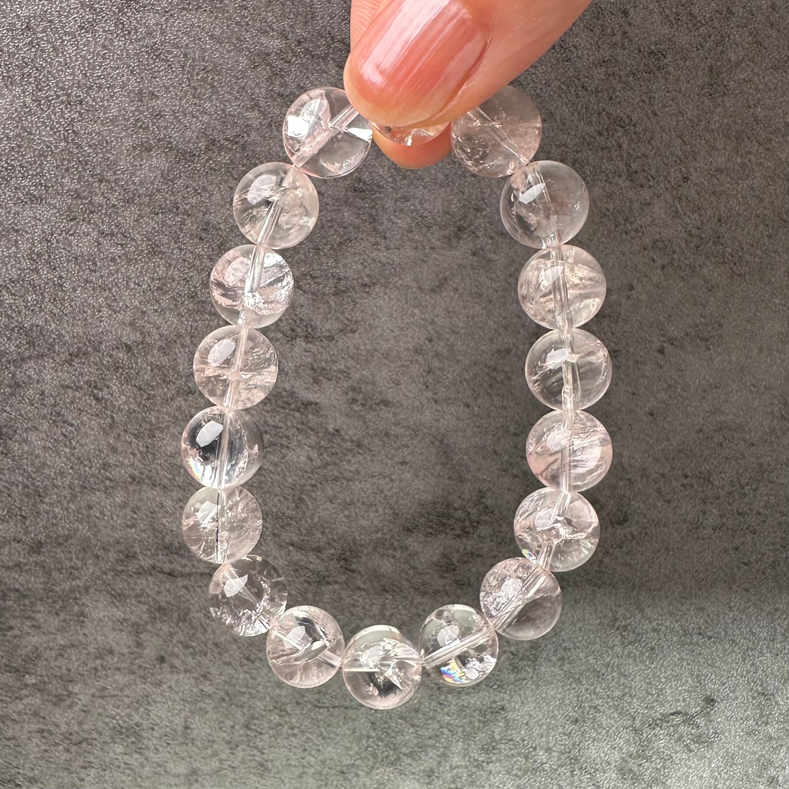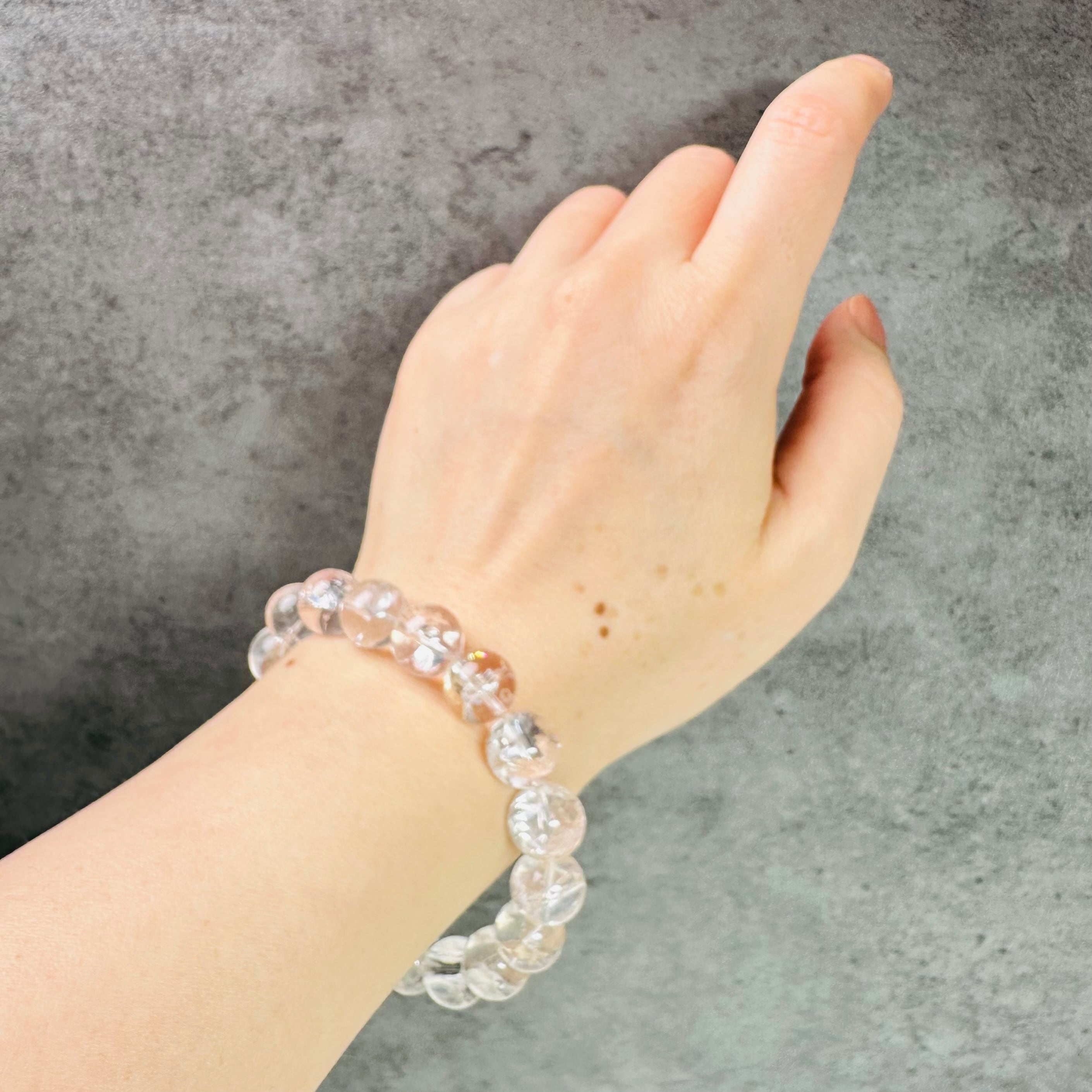 ふんわりとした白い雪の結晶を閉じ込めたような、美しいスノーフレイク模様が魅力のピンククォーツのブレスレット。透明感のあるクォーツの中に淡い白のセリサイトが広がり、手元にやさしい輝きを添えてくれます。大人可愛い雰囲気があり、普段使いやお出かけコーデにもさりげなく馴染む一本です。