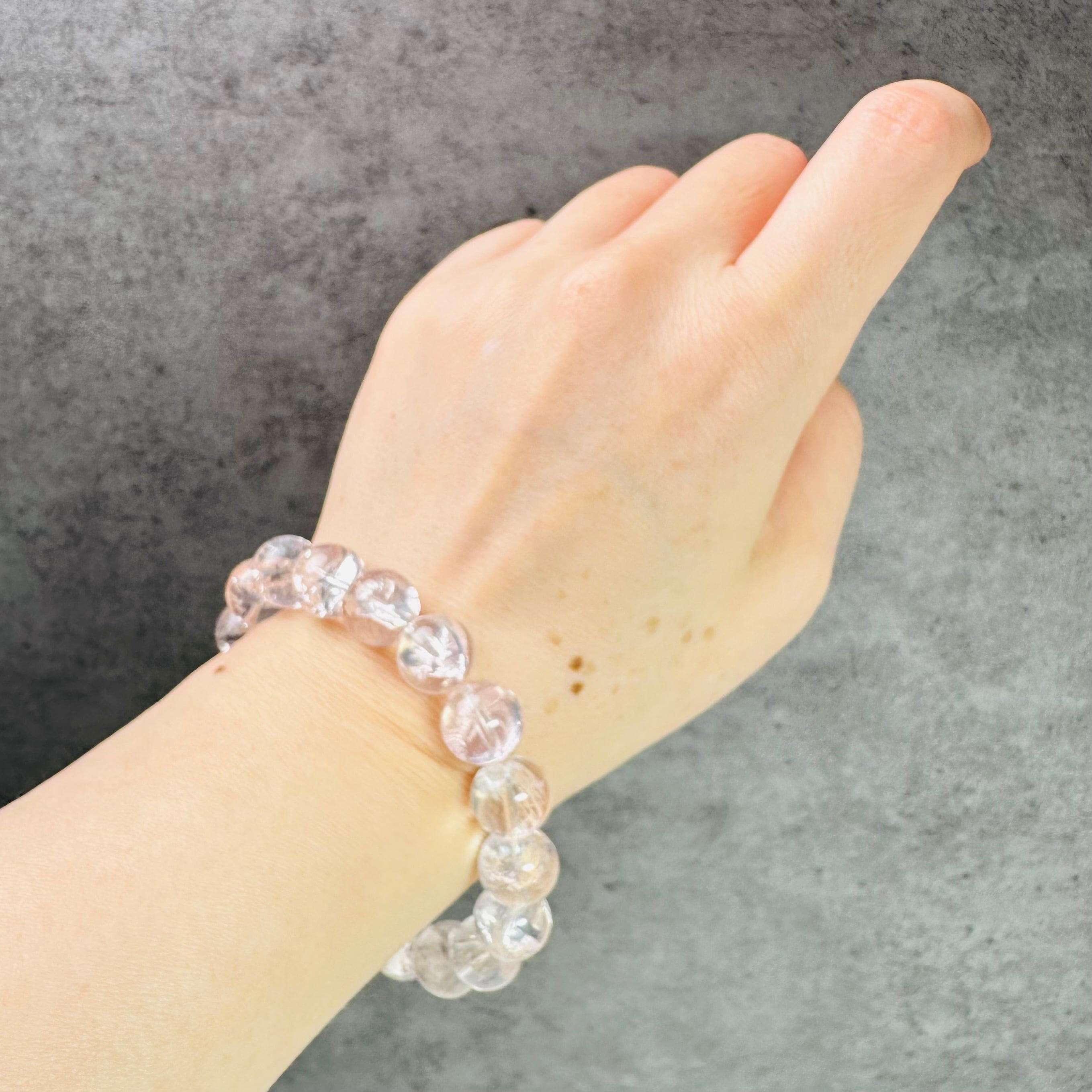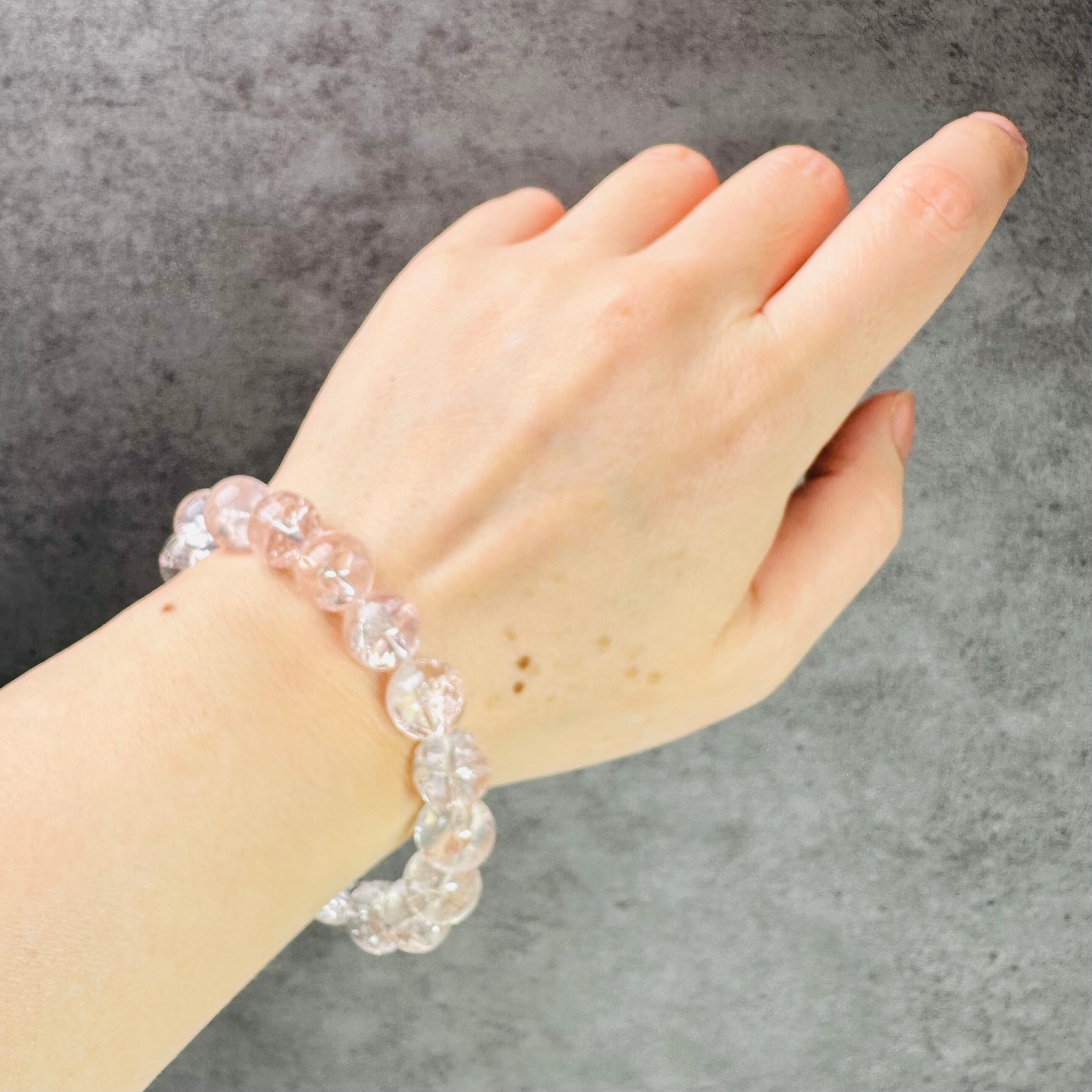 ふんわりとした白い雪の結晶を閉じ込めたような、美しいスノーフレイク模様が魅力のピンククォーツのブレスレット。透明感のあるクォーツの中に淡い白のセリサイトが広がり、手元にやさしい輝きを添えてくれます。大人可愛い雰囲気があり、普段使いやお出かけコーデにもさりげなく馴染む一本です。