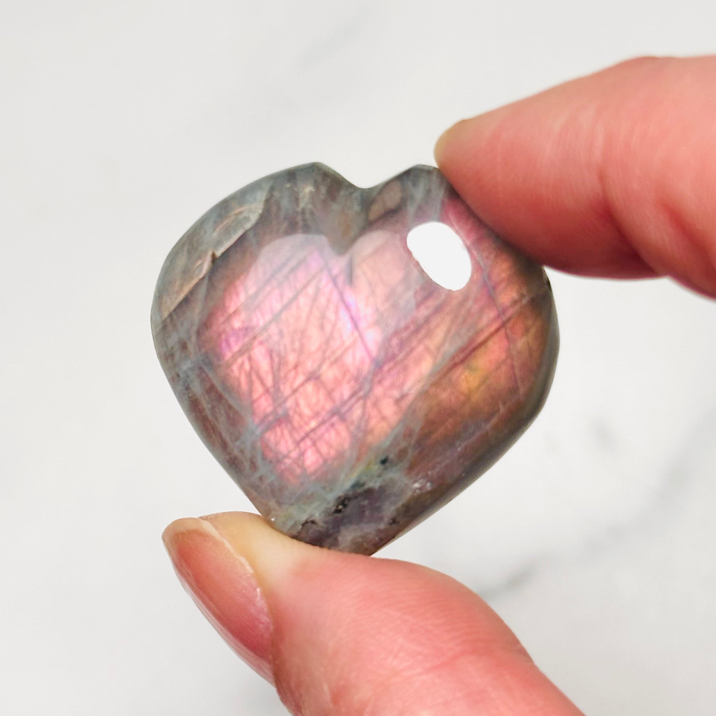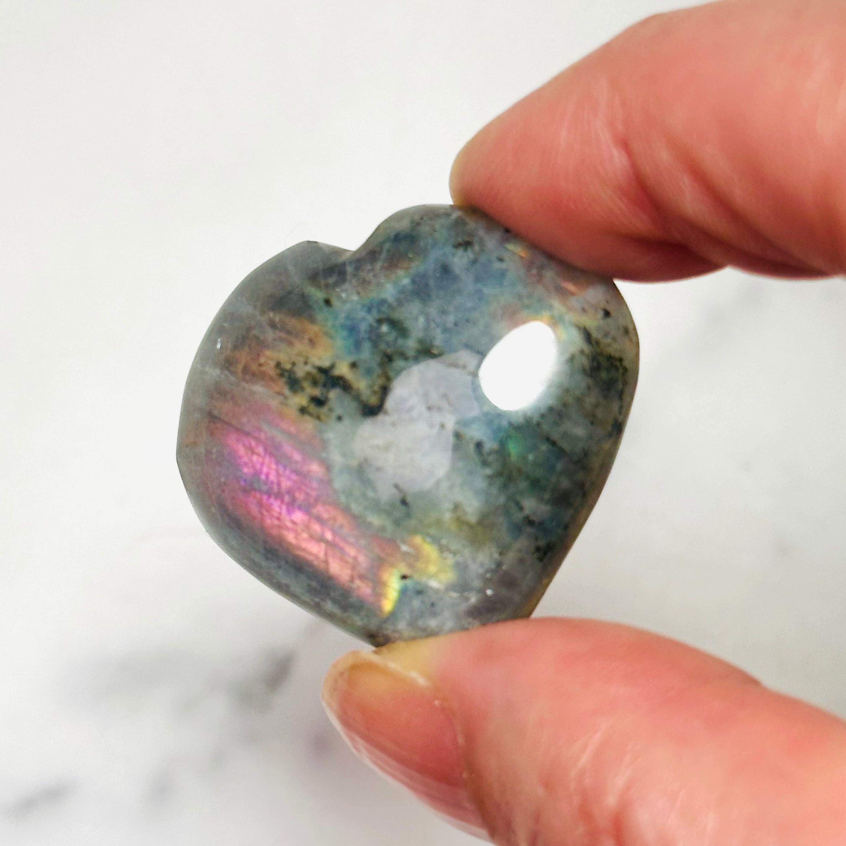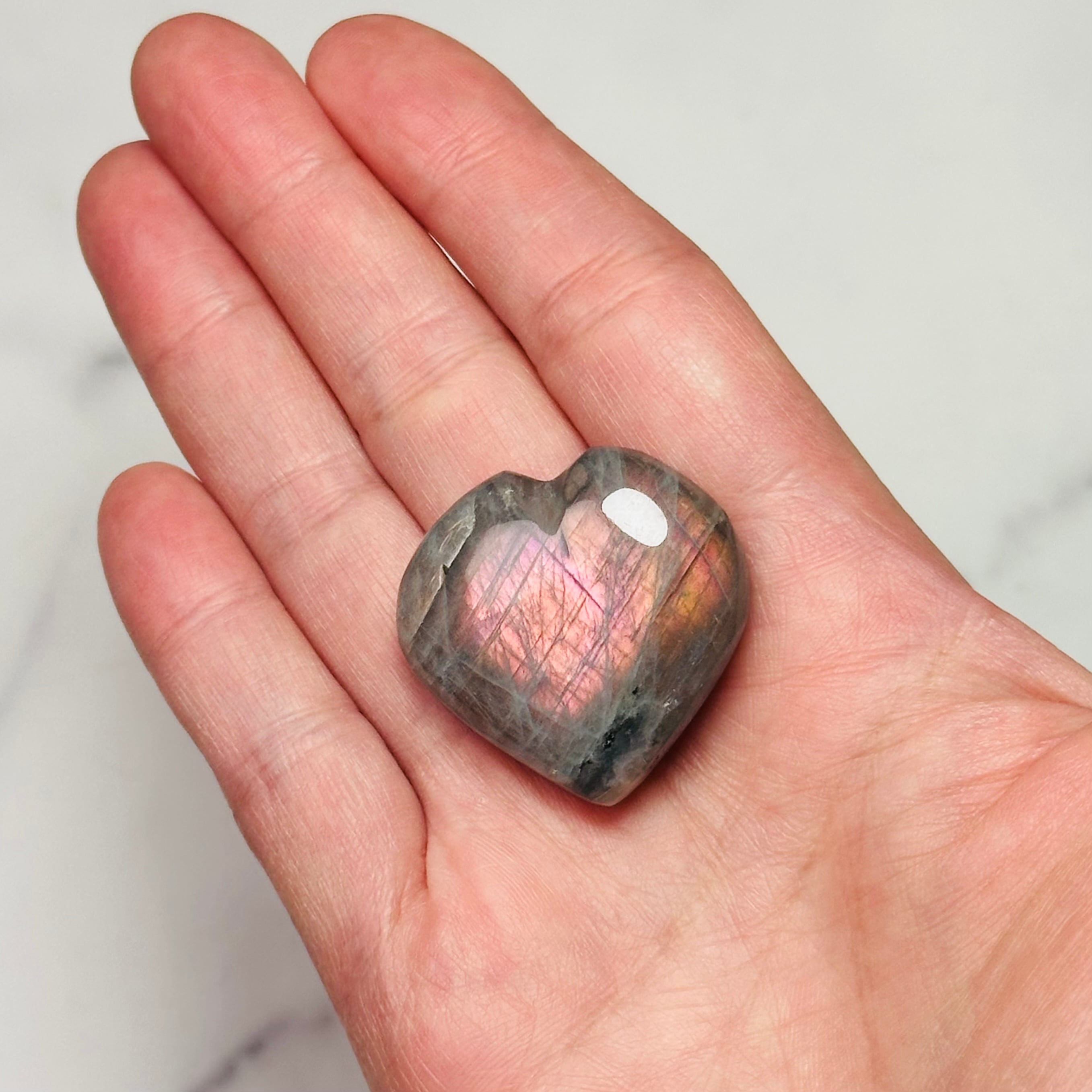 ラブラドライトハート型ストーンです。グレーの石肌に、鮮やかなピンクやオレンジのラブラドレッセンスが煌めきます。小さいながらに、美しい色彩が宇宙の神秘を思わせる魅力的なアイテムです。