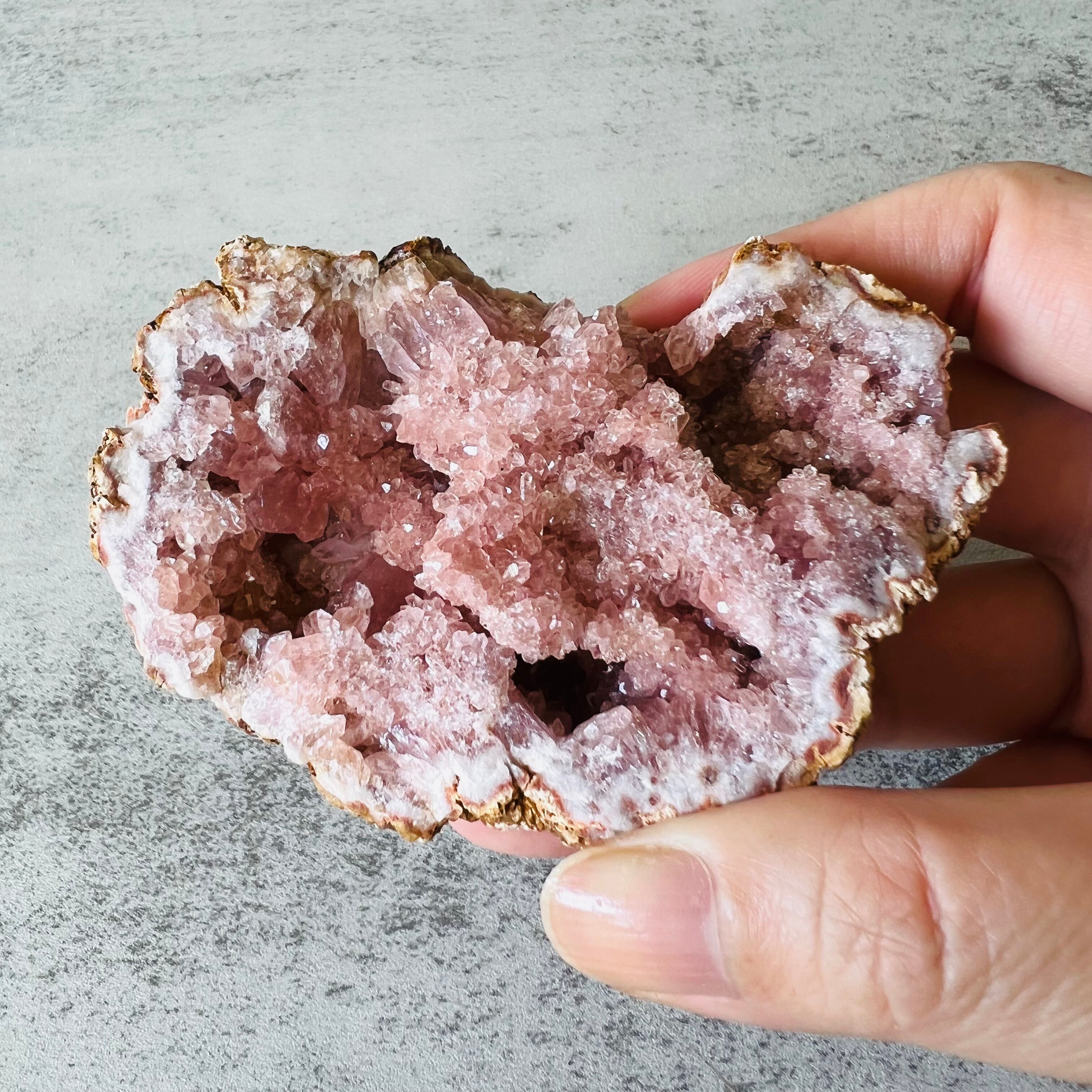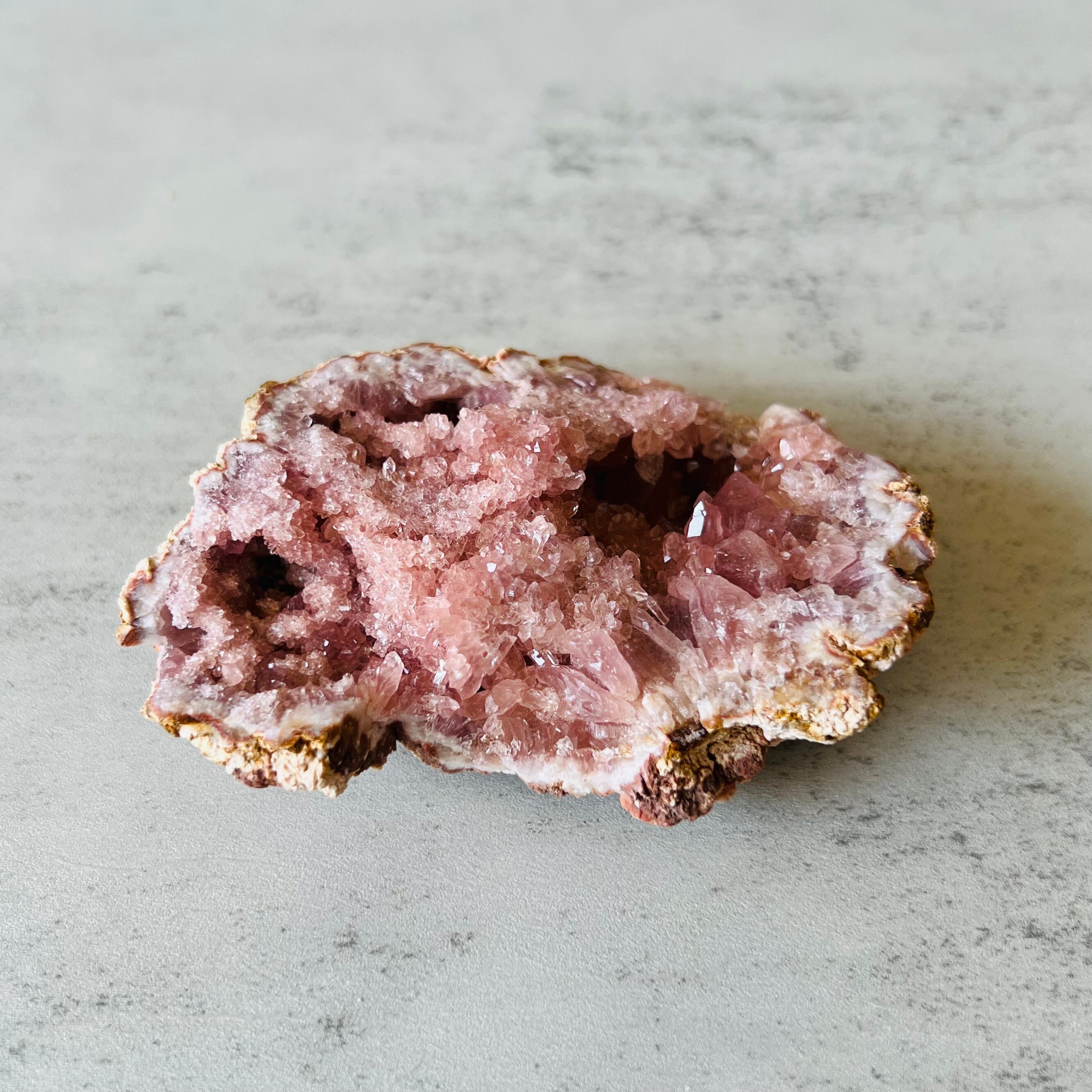 やや青みがかった天然のピンク色が美しいジオードです。落ち着いたくすみピンクがお洒落で素敵です。珊瑚のような淡く優しいピンク色は心を落ち着かせ癒してくれます。微細な結晶から少し大きめの結晶までびっしり詰まっていて稀に見る美しさです。
