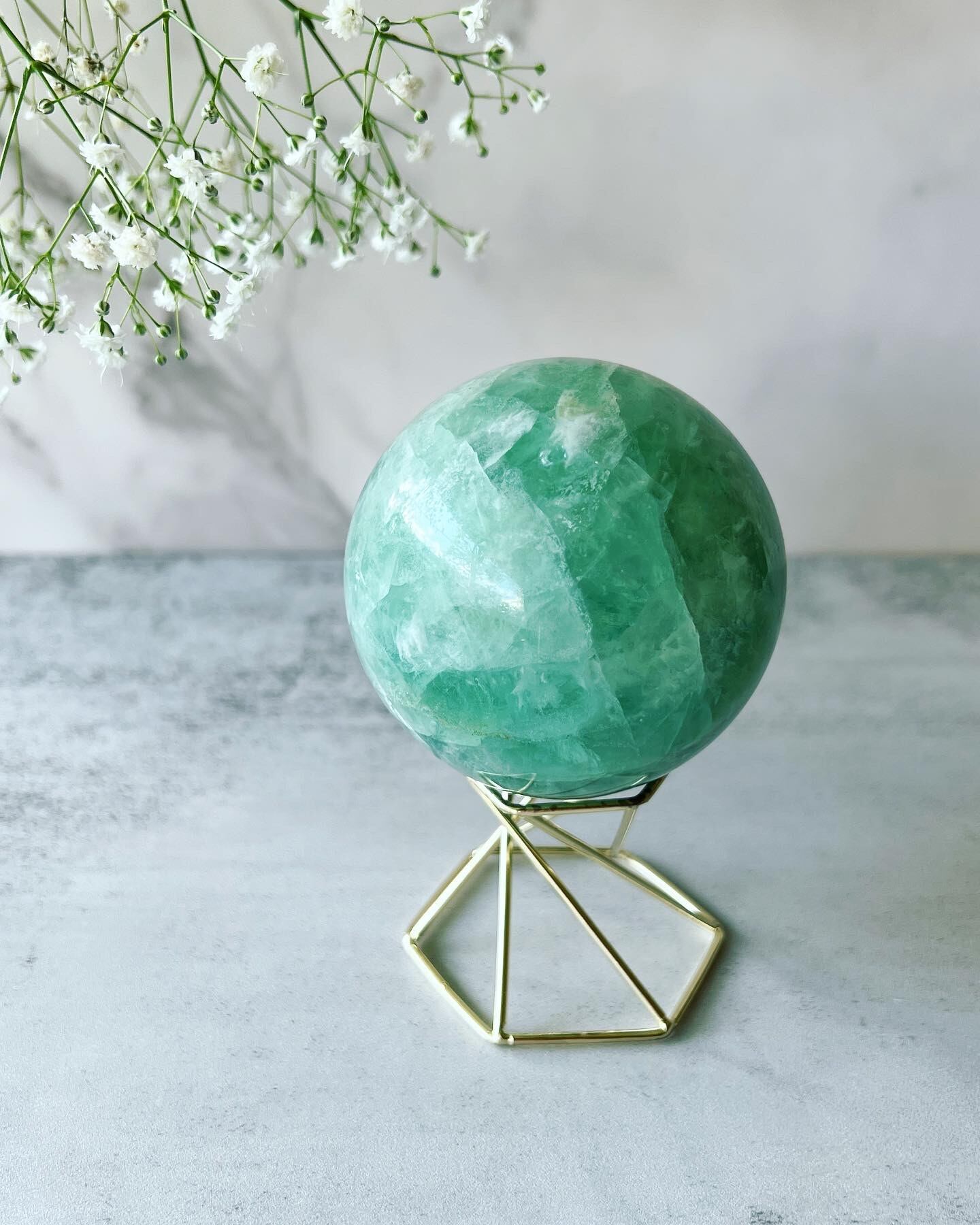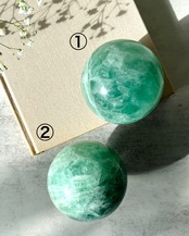 白と淡いグリーンが優しいグラデーションを織りなすグリーンフローライトのスフィアです。ミルキーな柔らかい色合いは見る人の心に寄り添い、そっと癒してくれるかのようです。①よりも色濃く、鉄を含んでいることを示すゴールドのラインがあります。