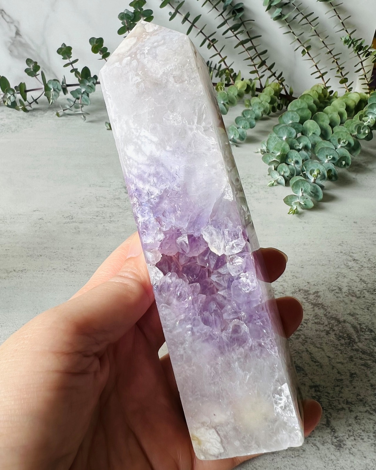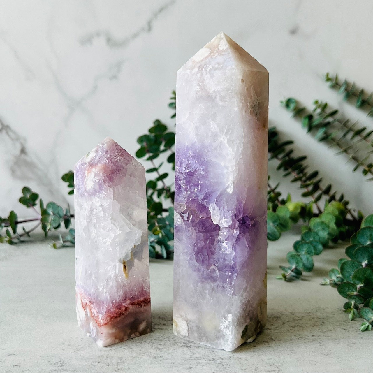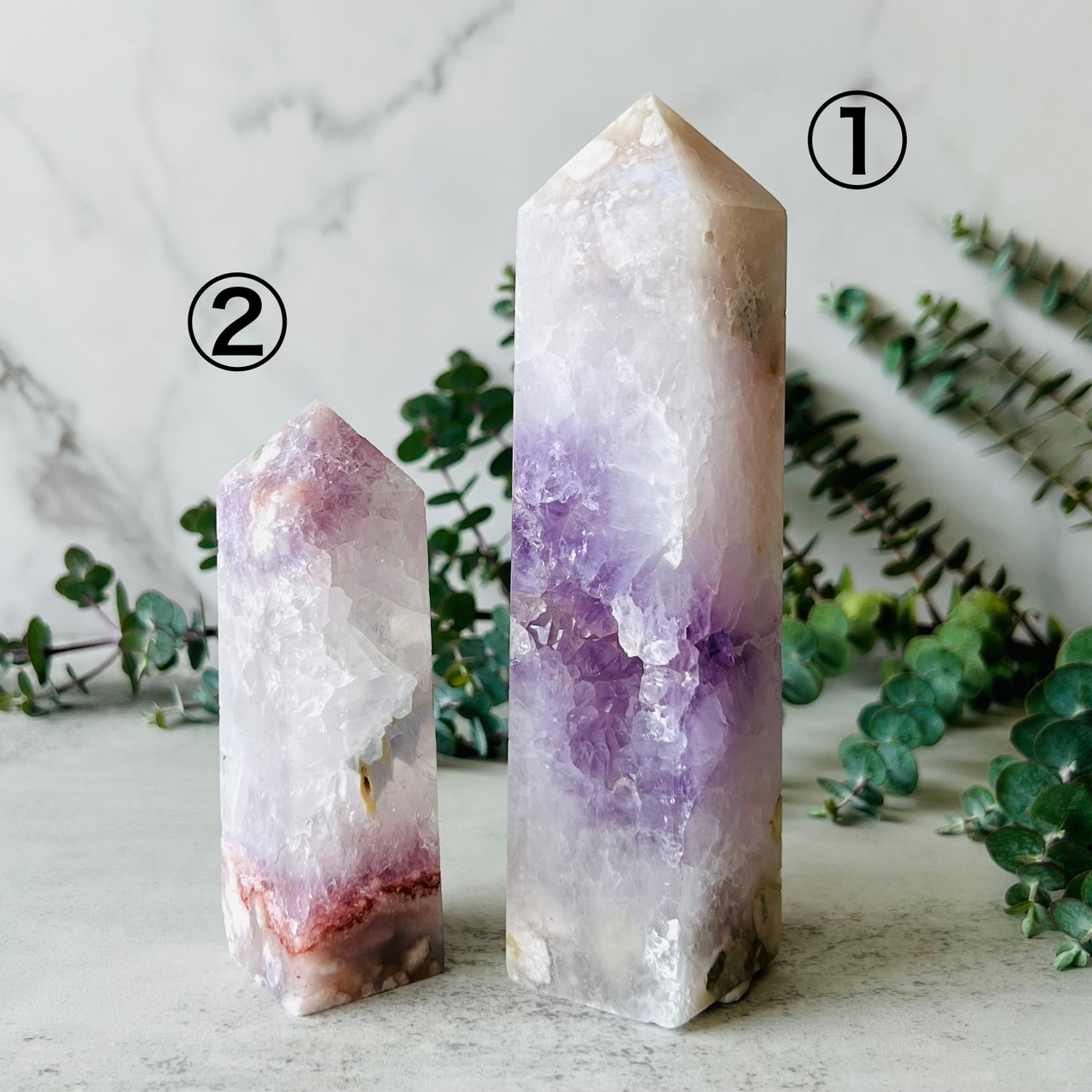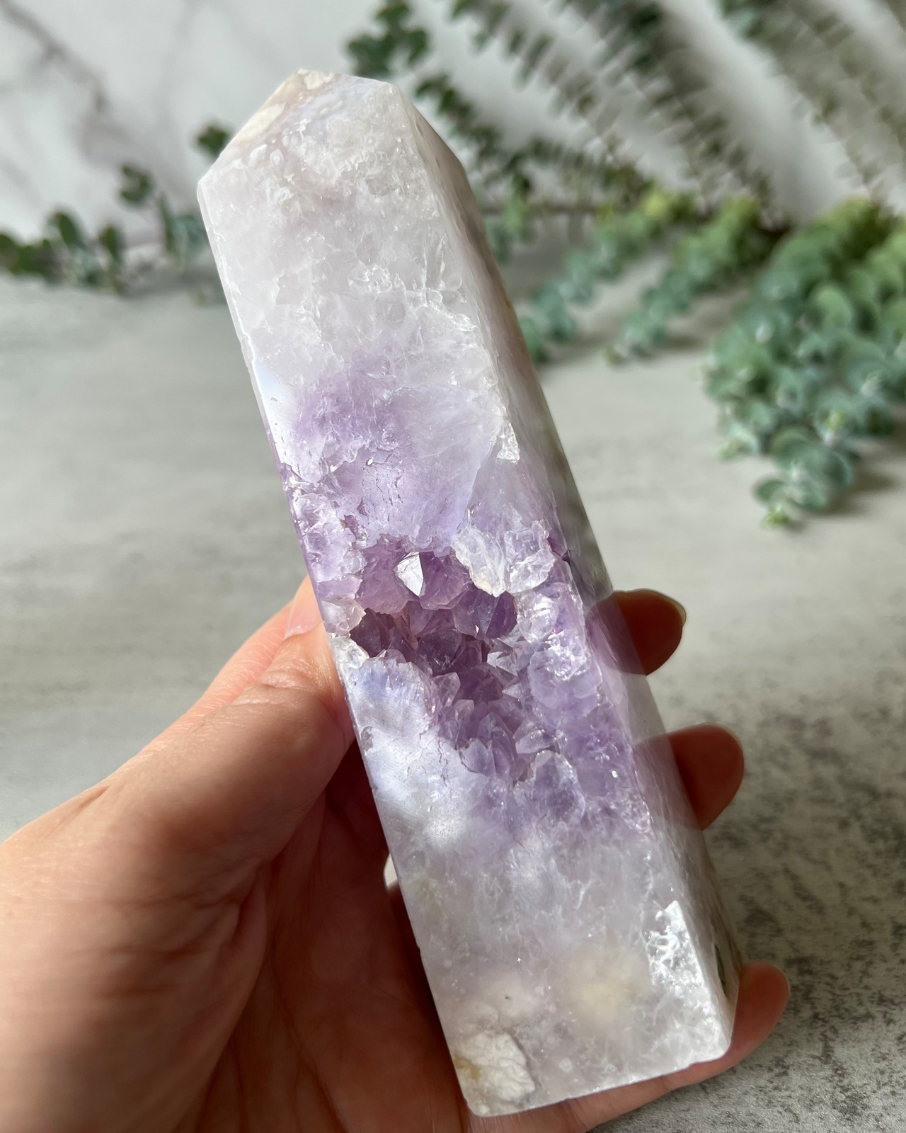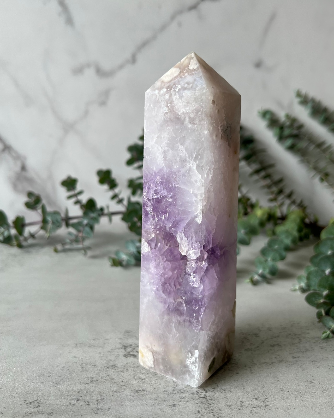 アメジストとフラワーアゲートが共生した夢のように幻想的で美しいタワーです。白く小さな花びらが薄く重なり合っているような上品で繊細な本体と、欠けた部分からは抜群の透明度に多数の虹を内包した大きめの紫色の結晶がキラキラと輝いています。
