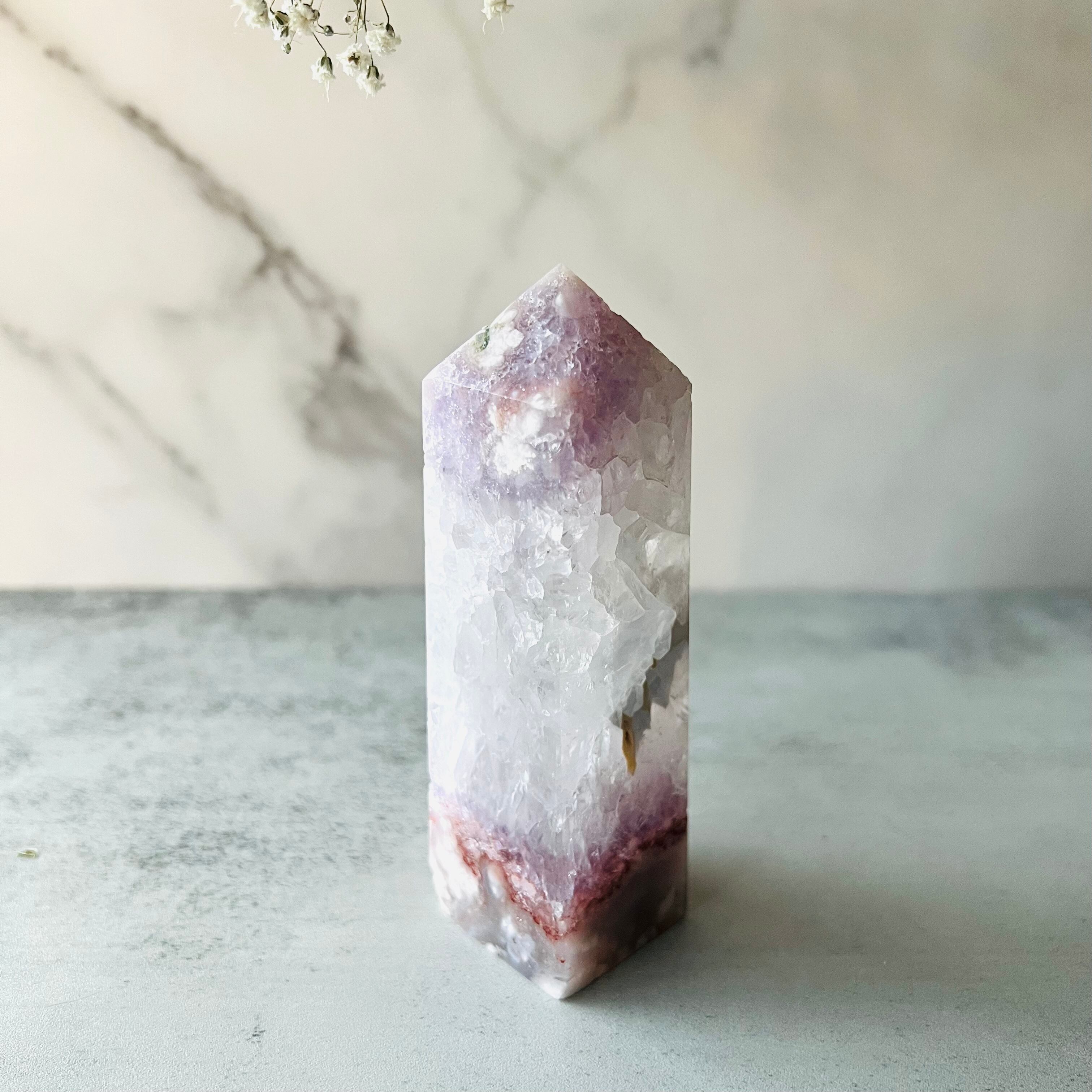 アメジストとフラワーアゲートが共生する夢のように幻想的で美しいタワー。白く小さな花びらが薄く重なり合っているような上品で繊細な本体と、上品なパープル、透き通ったホワイト、愛らしいピンクが織りなすグラデーションはため息が出るほど綺麗です。