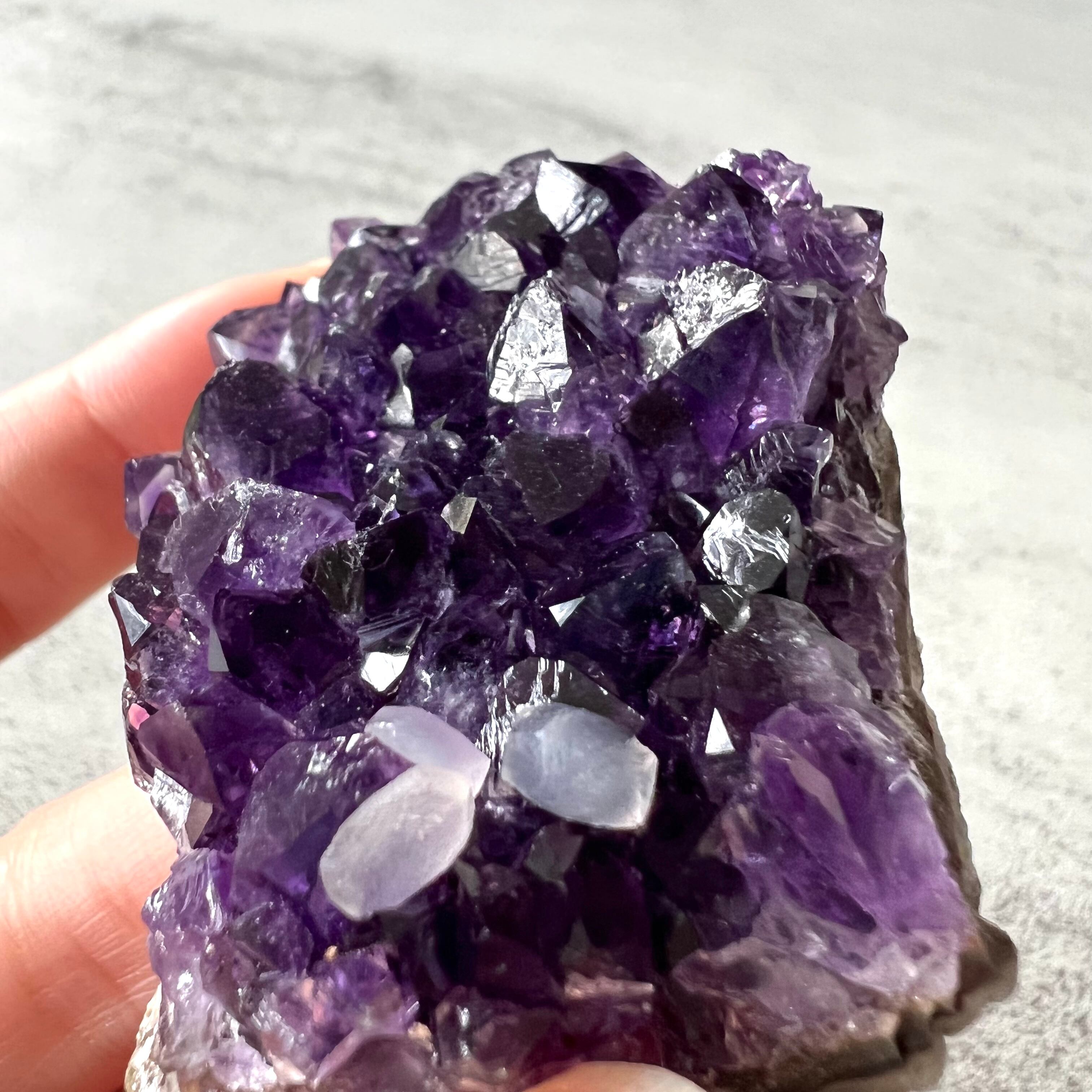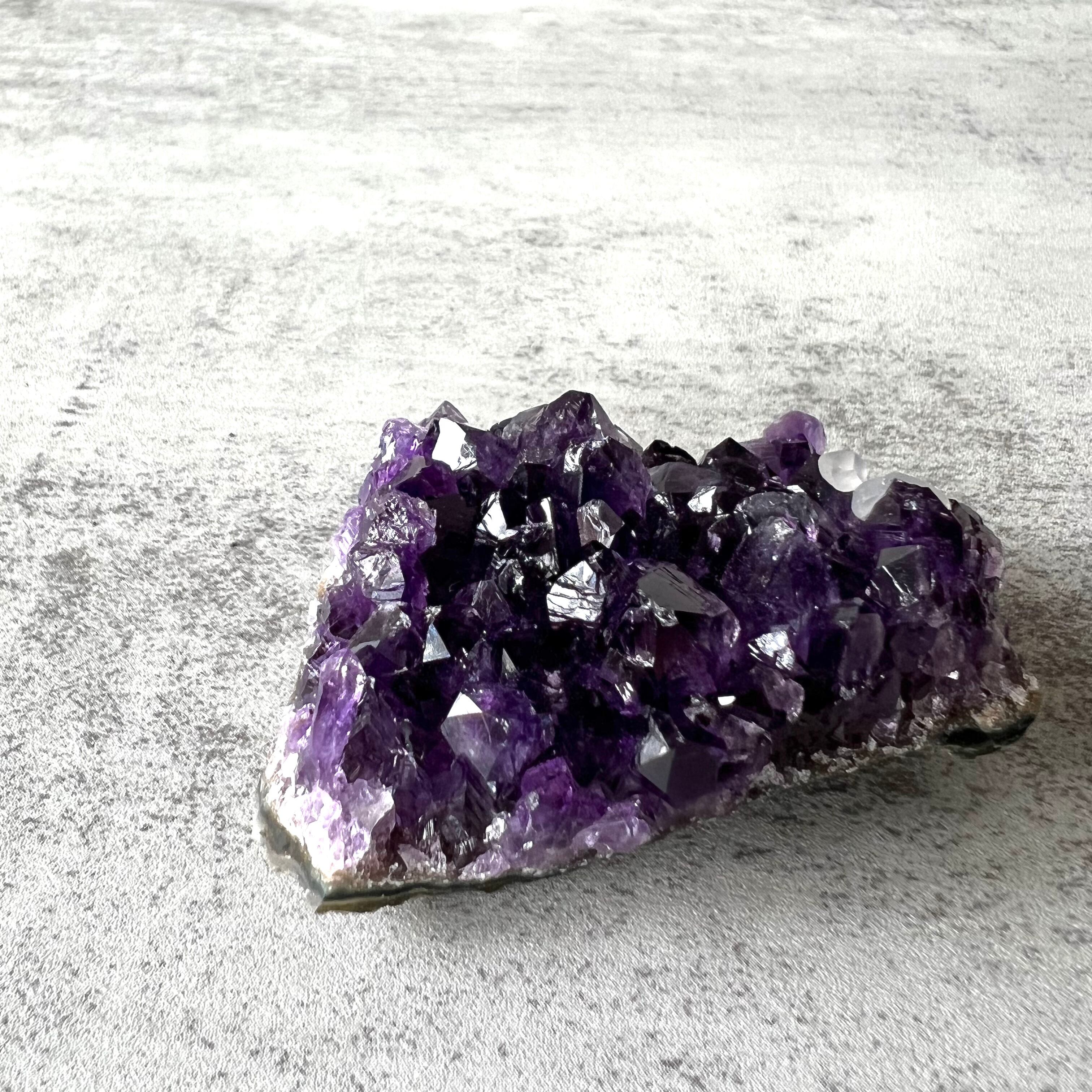 大きめの結晶と深い紫色が印象的なウルグアイ産のアメジストクラスターです。米粒大の透明な結晶が3粒載っているのがとっても可愛らしいです。
