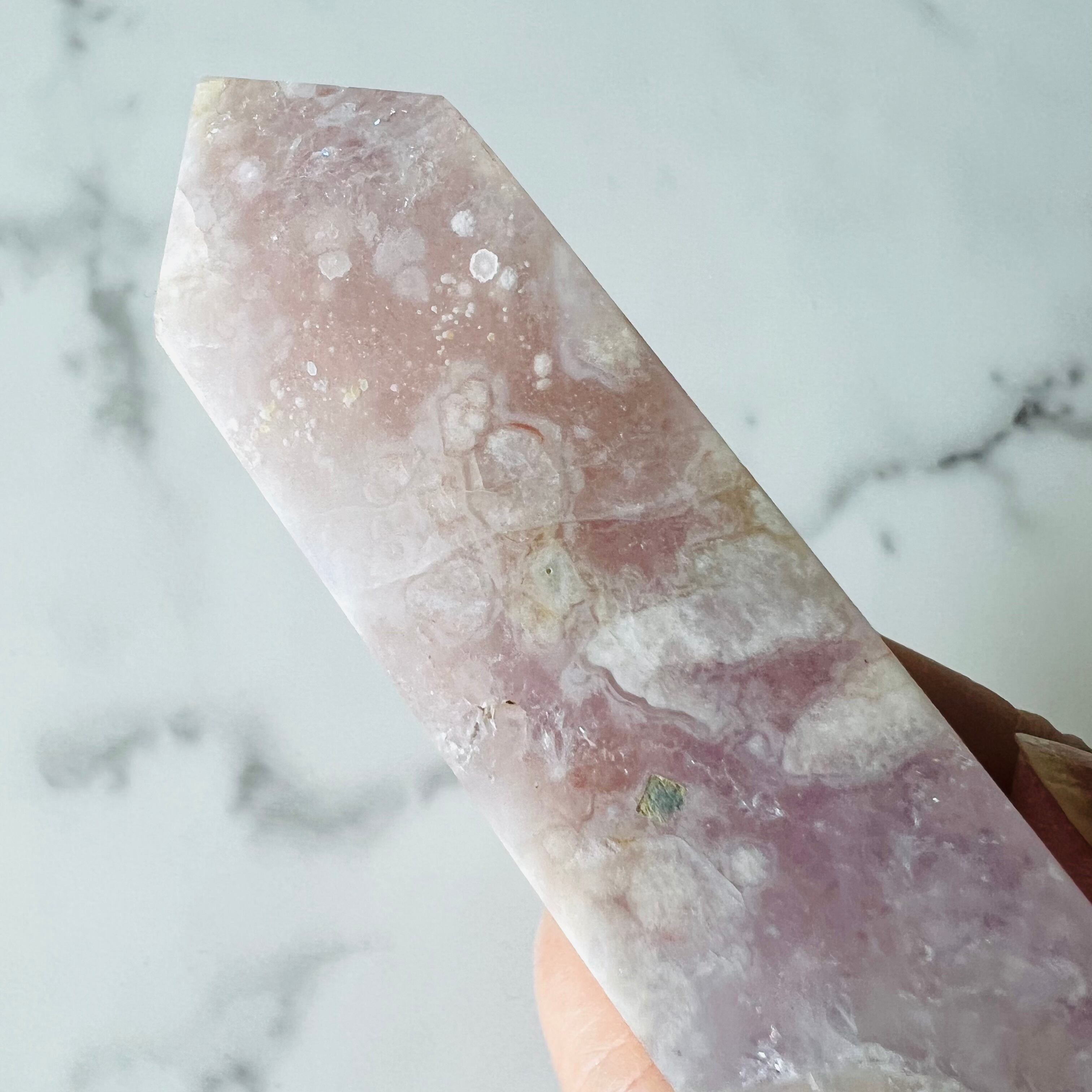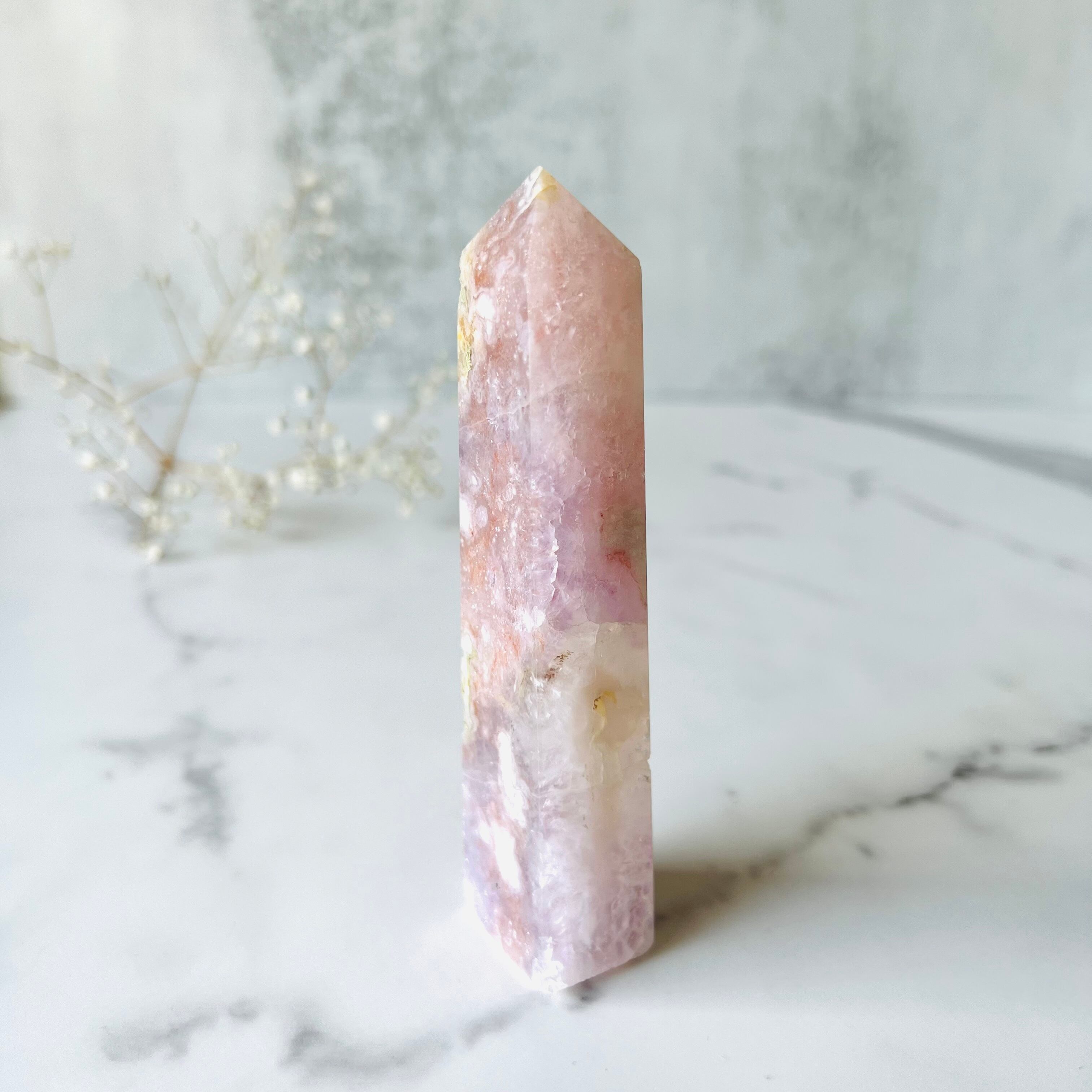 マダガスカル産のピンクアメジストとフラワーアゲートが共生したとっても優しい色合いのタワーです。ふんわり上品な雰囲気で結晶のキラキラした瞬きが可愛いです。