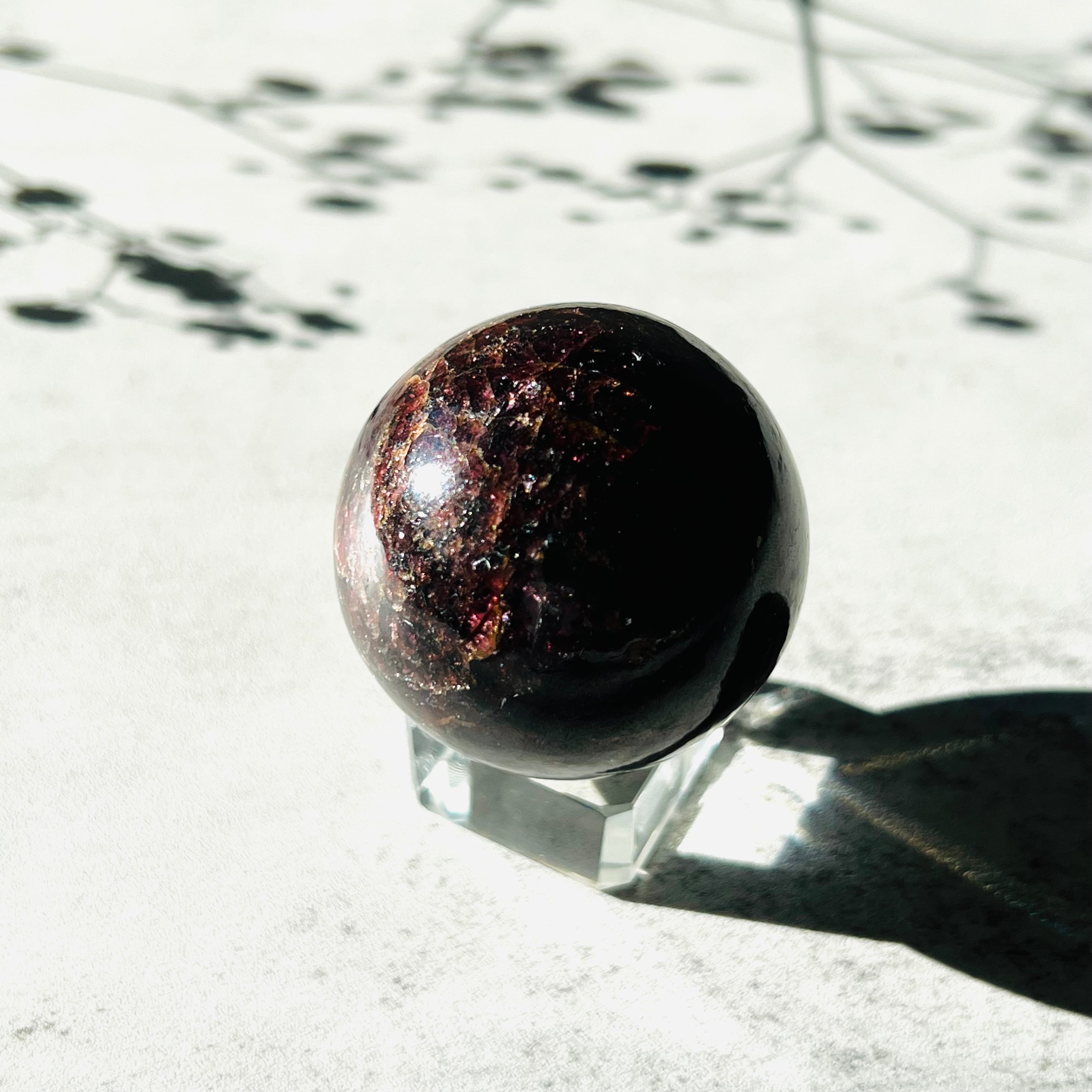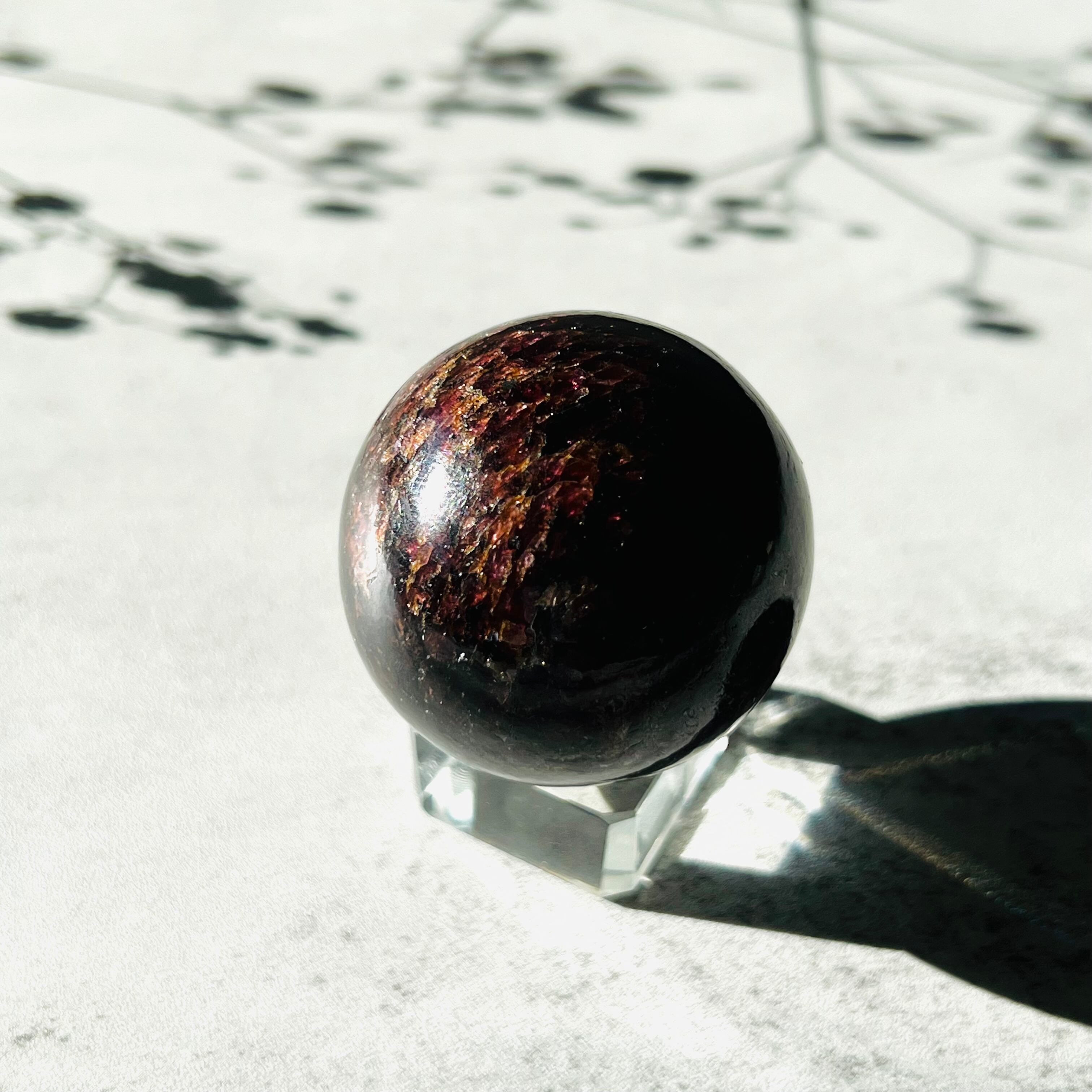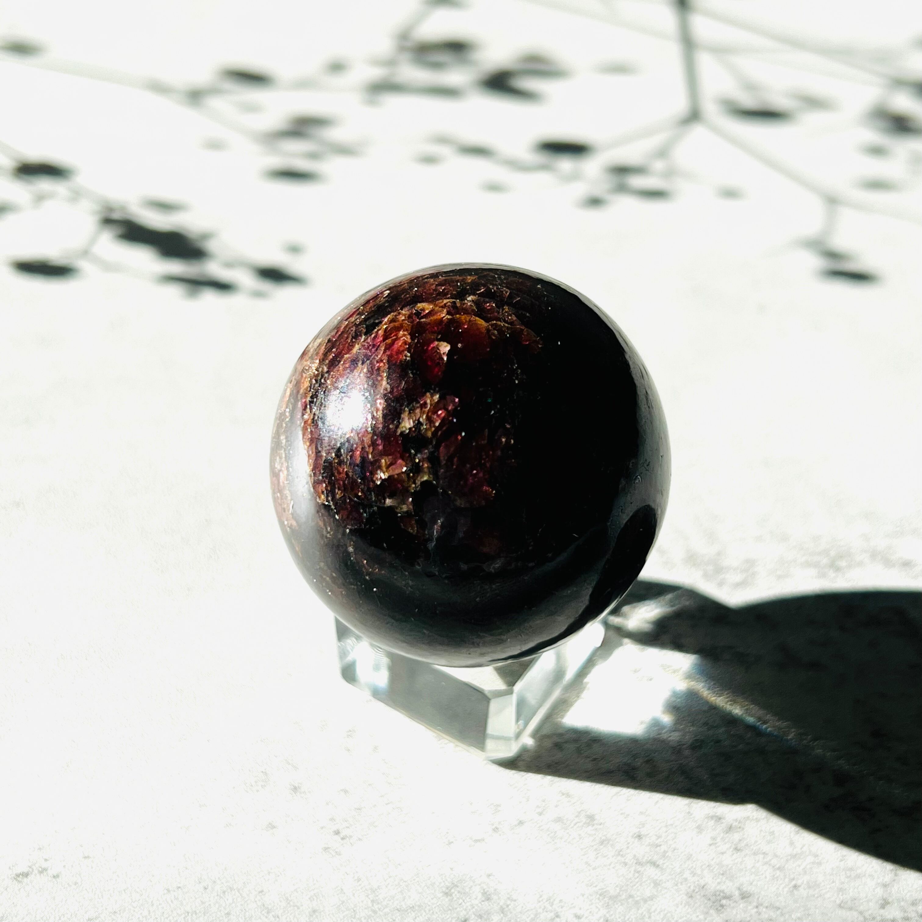 深みのある赤にマイカが数多の星のようにキラキラ輝くガーネットスフィアです。どこか惑星を思わせるような神秘的な色合いです。なかなか流通せず、今回インドから一点のみの入荷です。