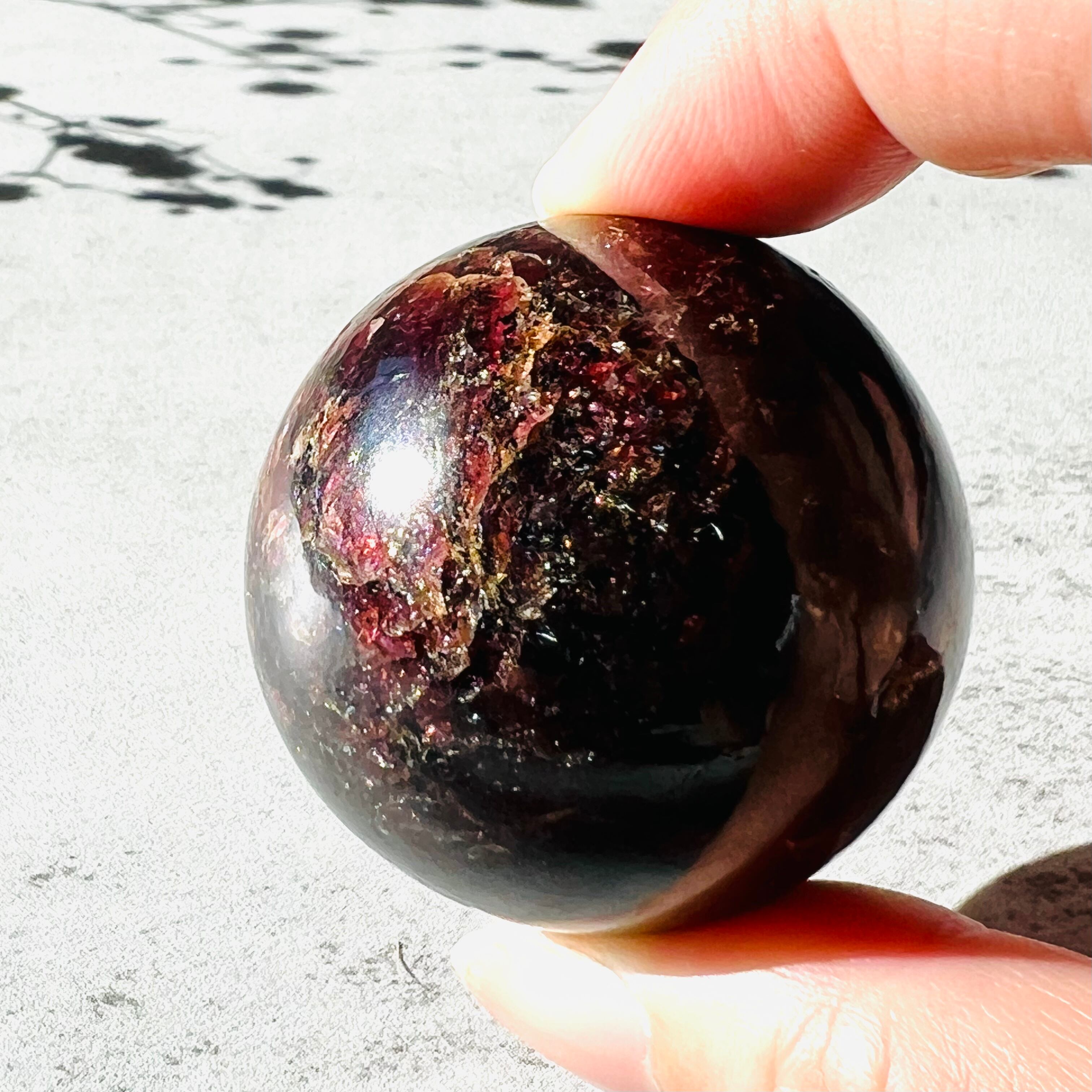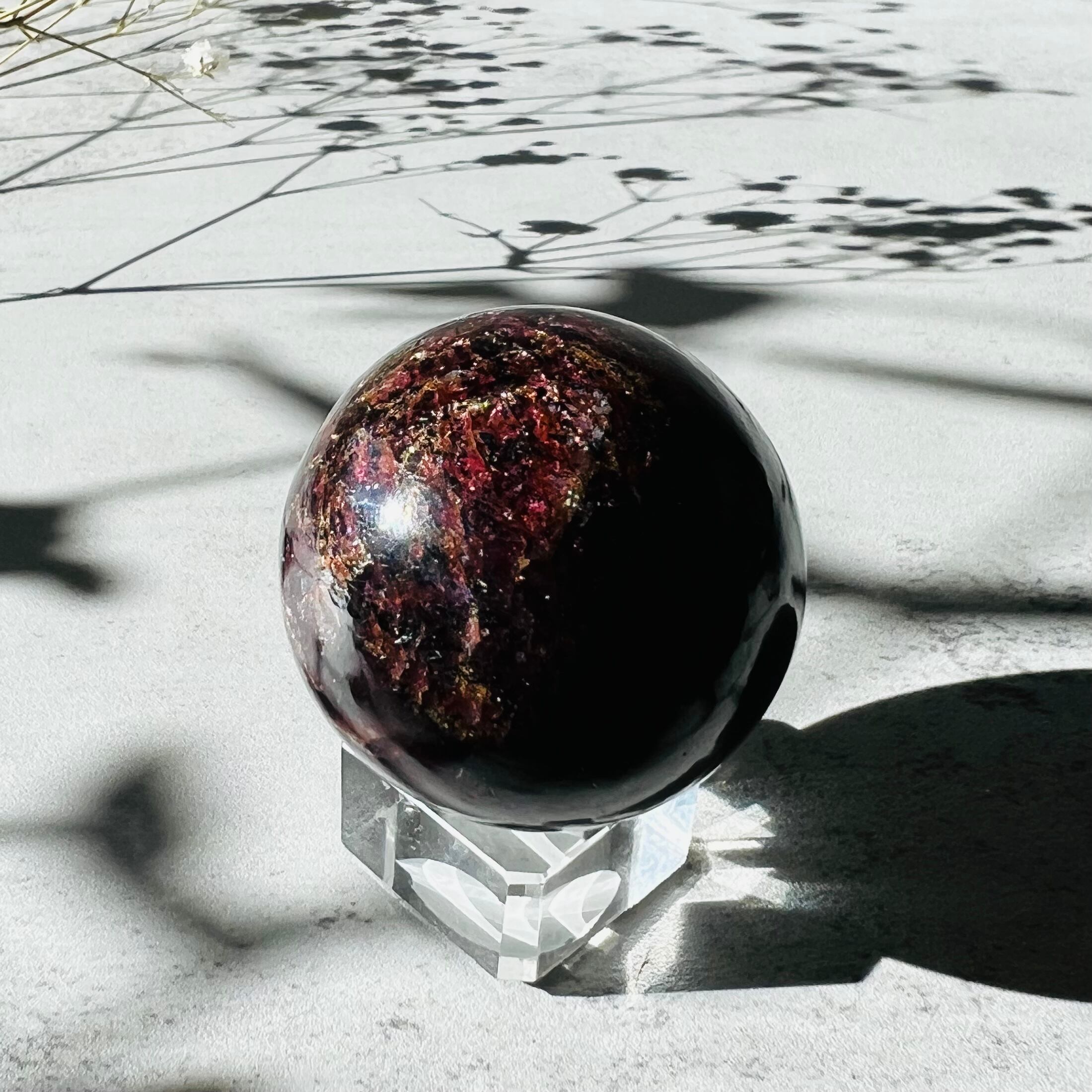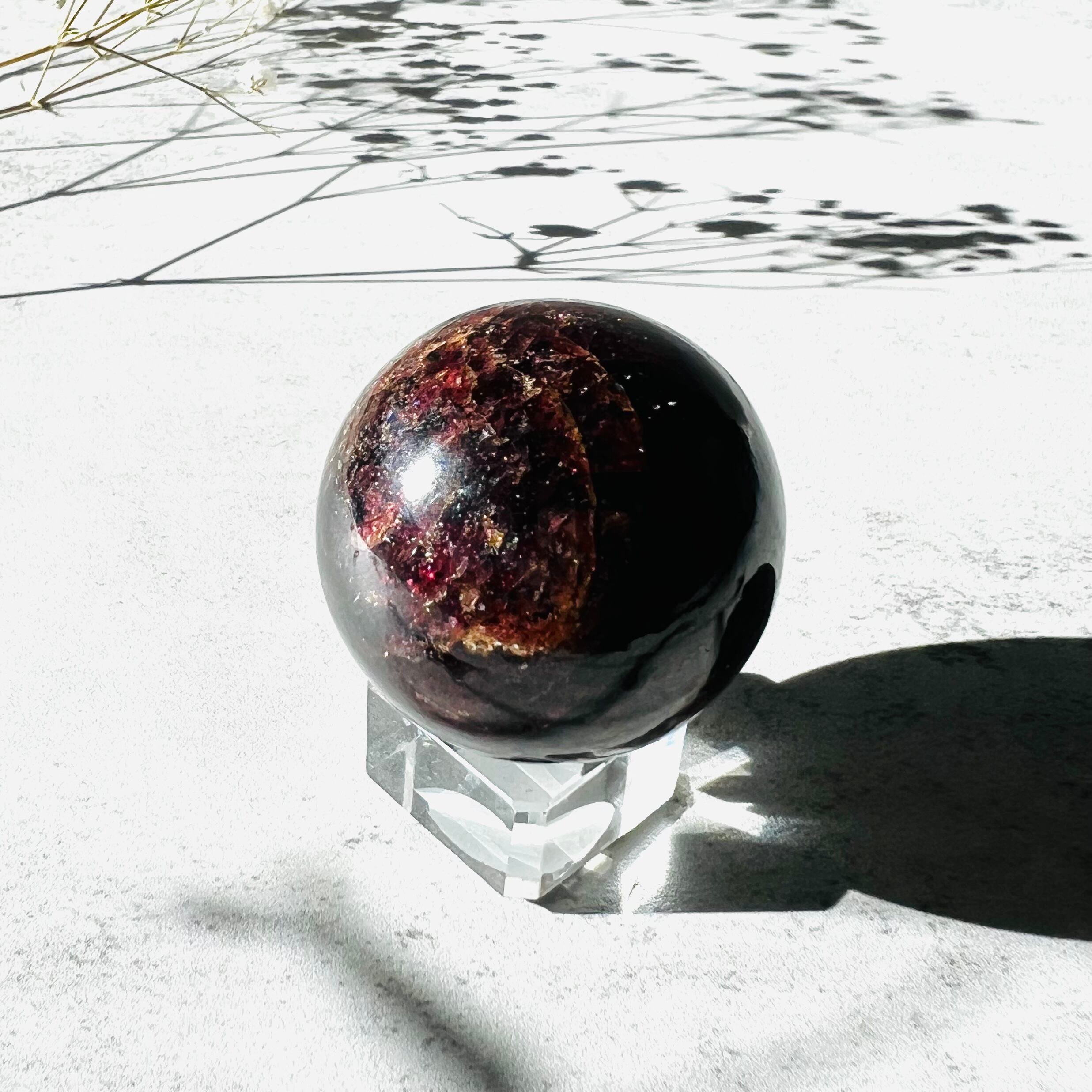 深みのある赤にマイカが数多の星のようにキラキラ輝くガーネットスフィアです。どこか惑星を思わせるような神秘的な色合いです。なかなか流通せず、今回インドから一点のみの入荷です。