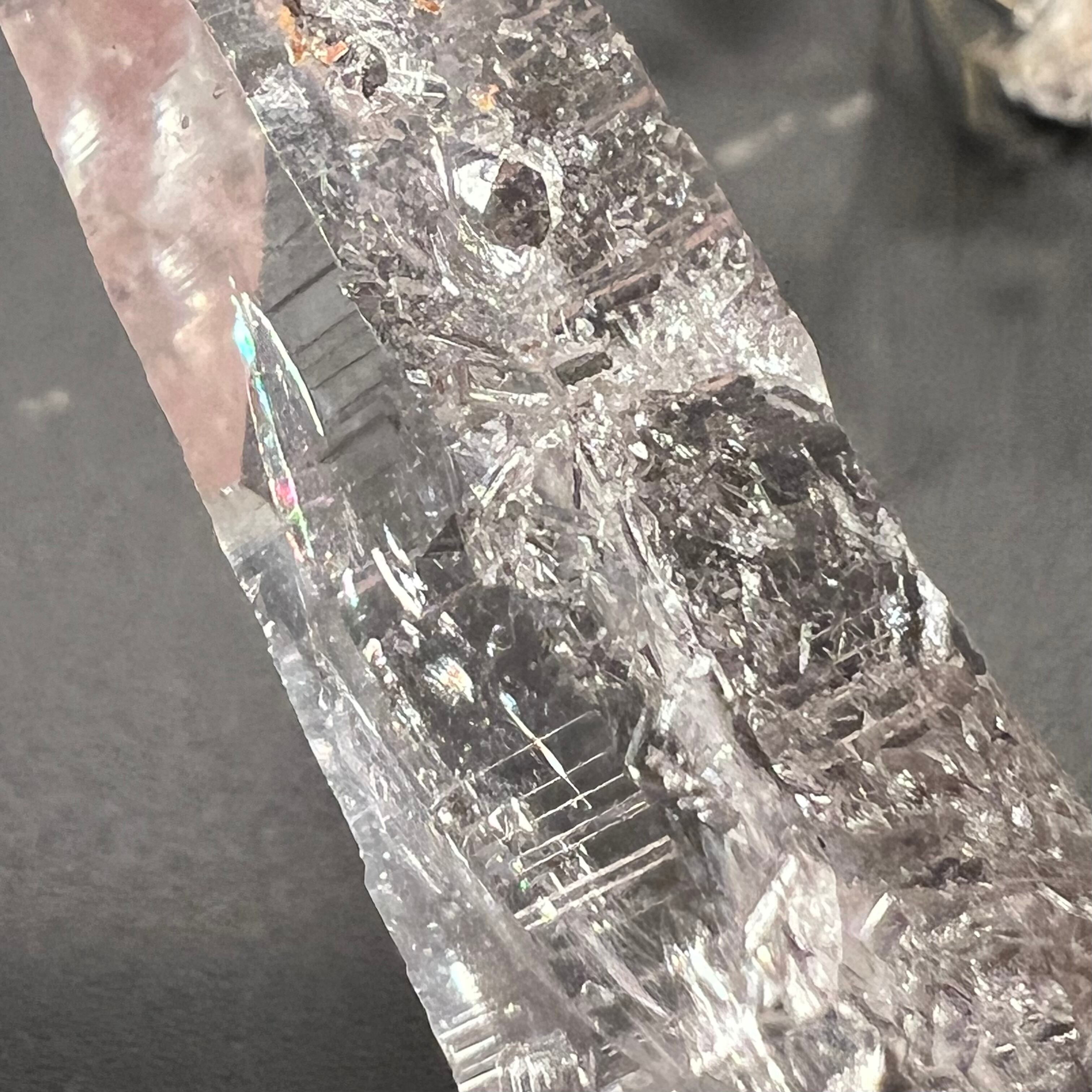 スッキリとした柱面に美しく刻まれたレムリアンリッジ、また別の柱面には自然が作り出したアート作品のような凹凸模様、先端はタビー形状です。美しい虹を内包した神秘的な魅力を持つマスタークリスタルです。
