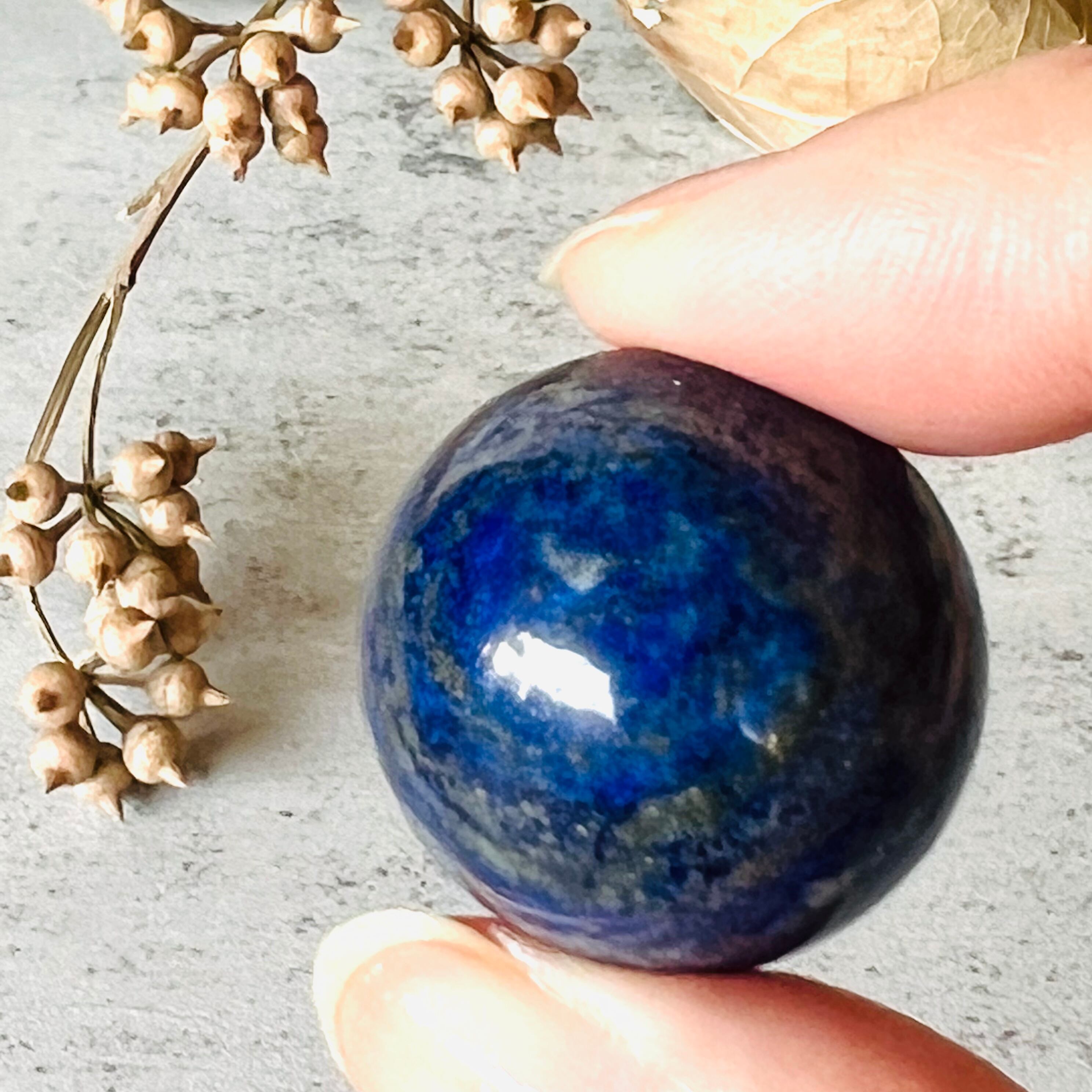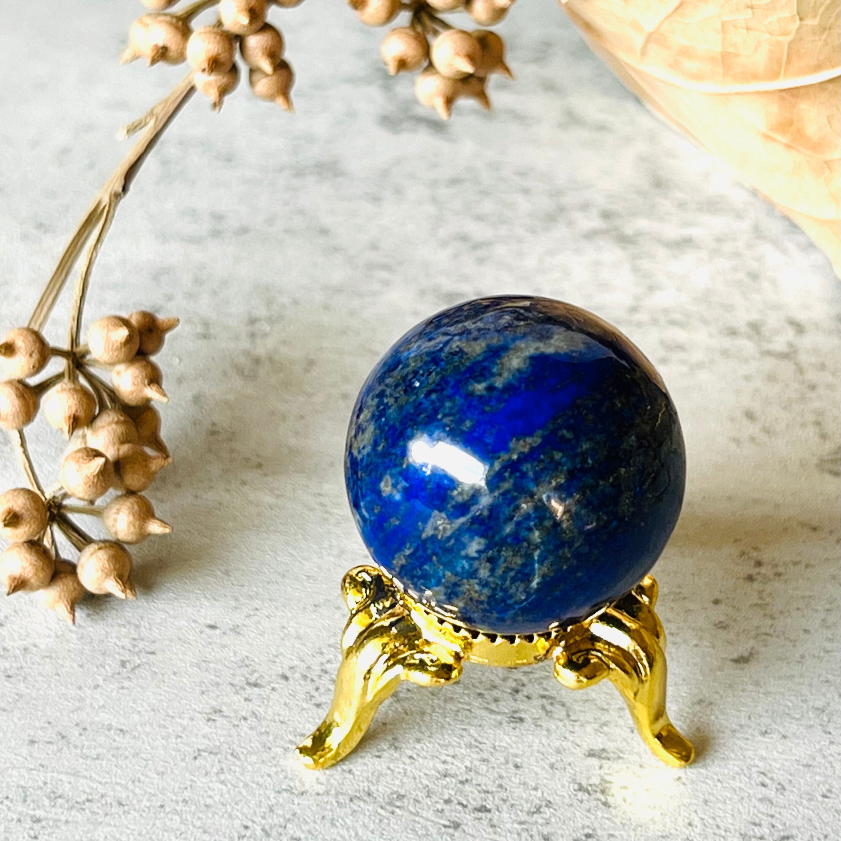 まるで夜空のような深い群青色に、幾多の金色の粒子(パイライト)が星のように輝く美しい石、ラピスラズリのミニスフィアです。